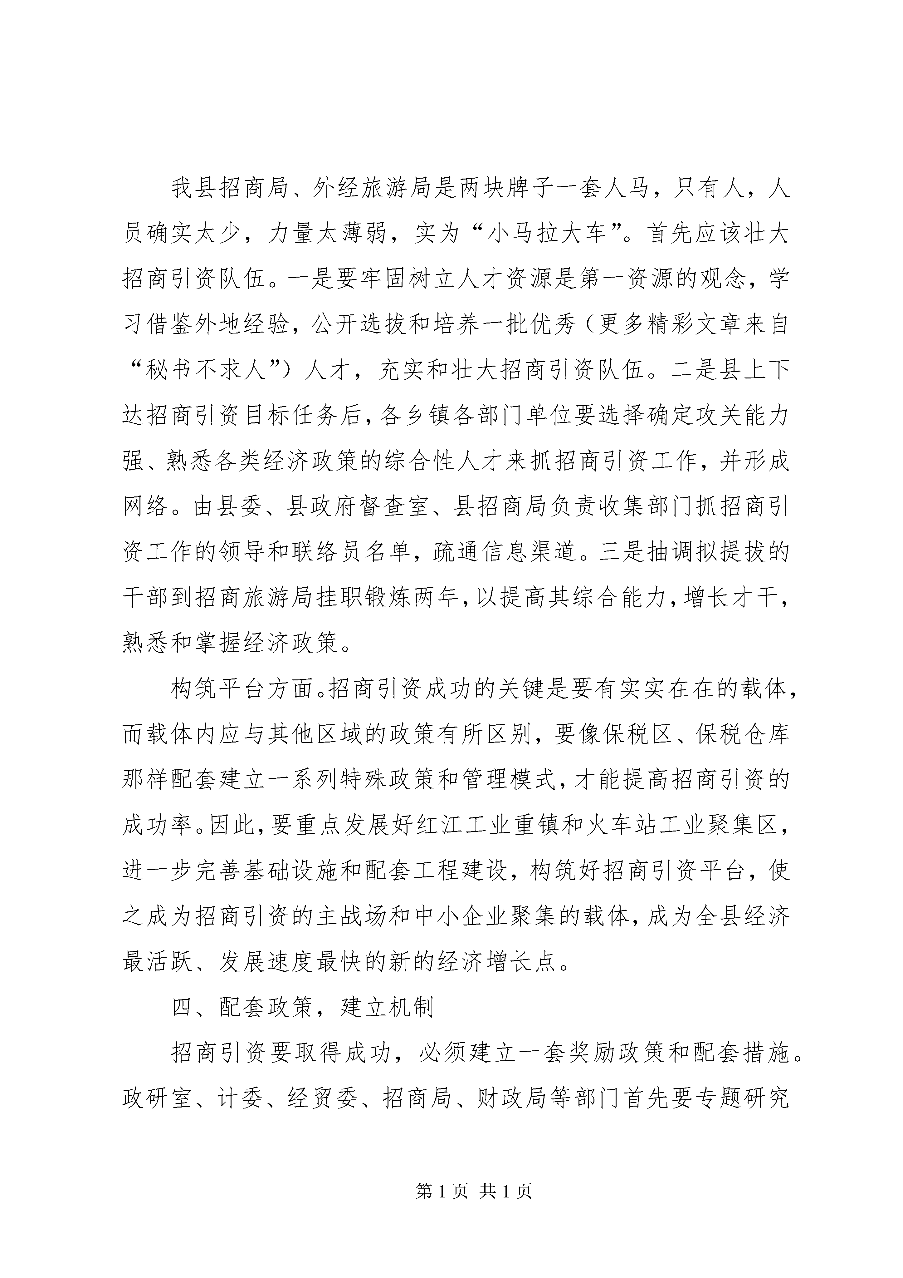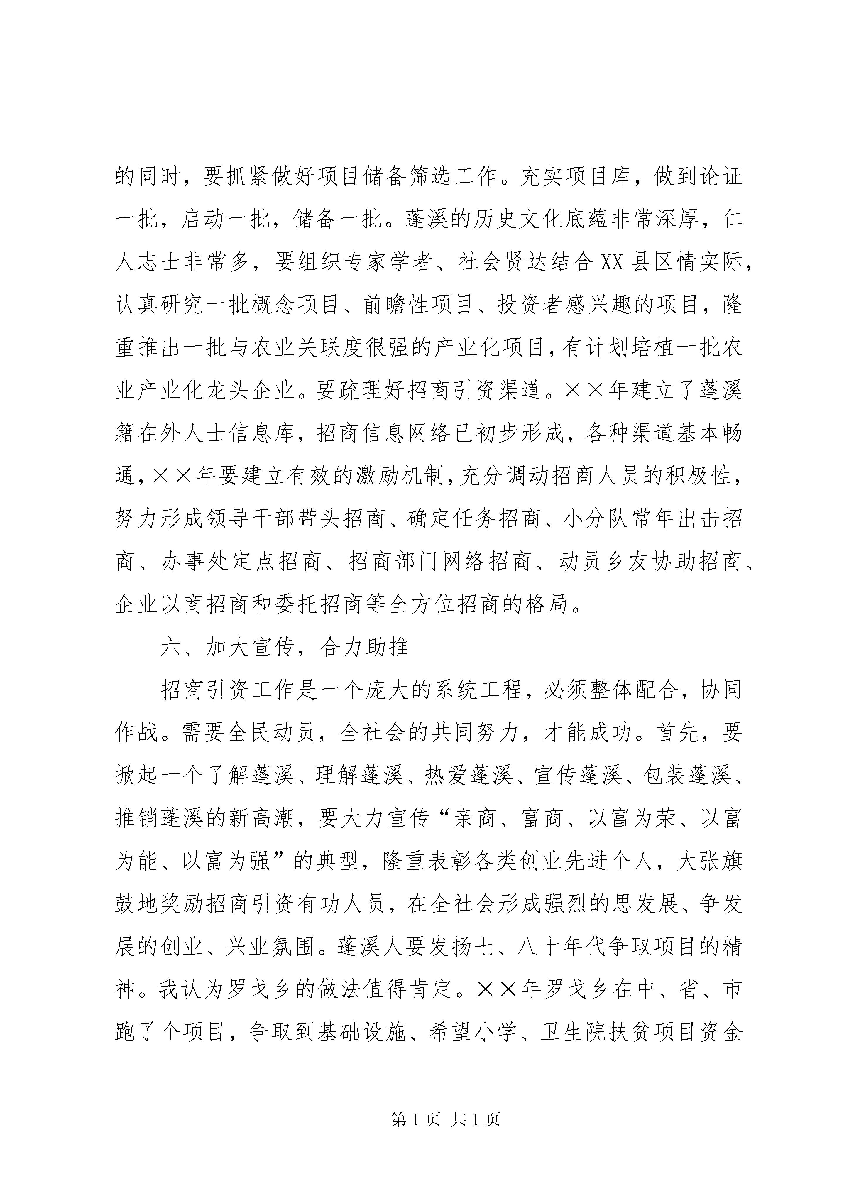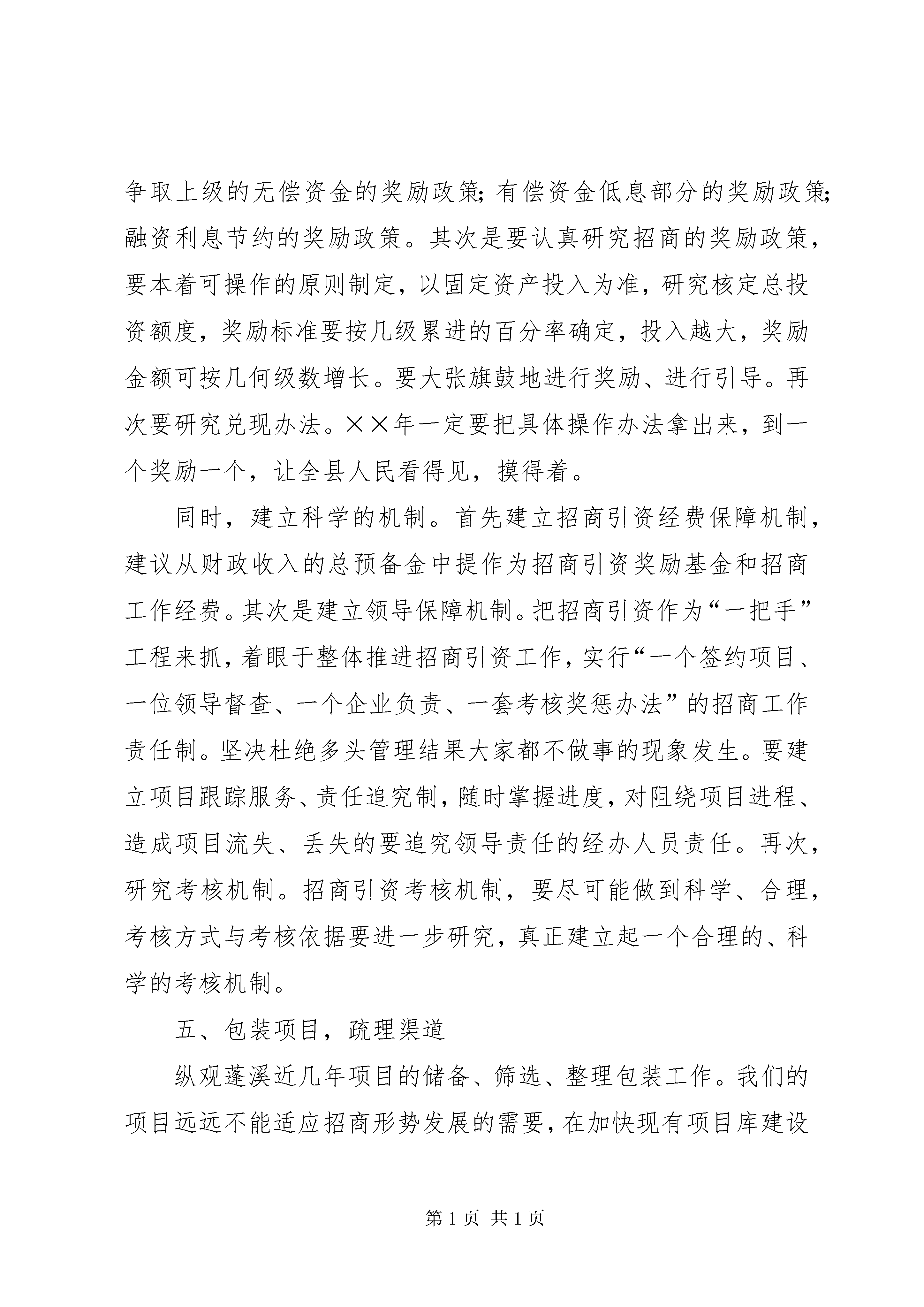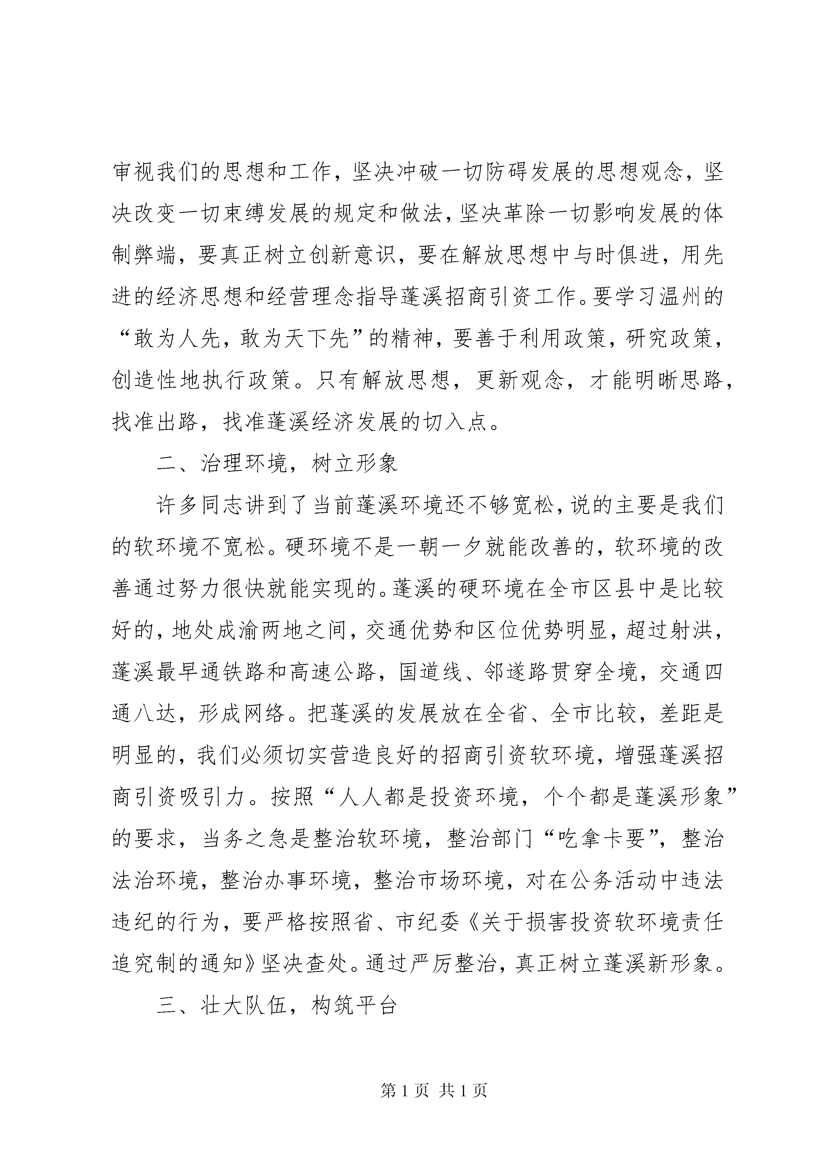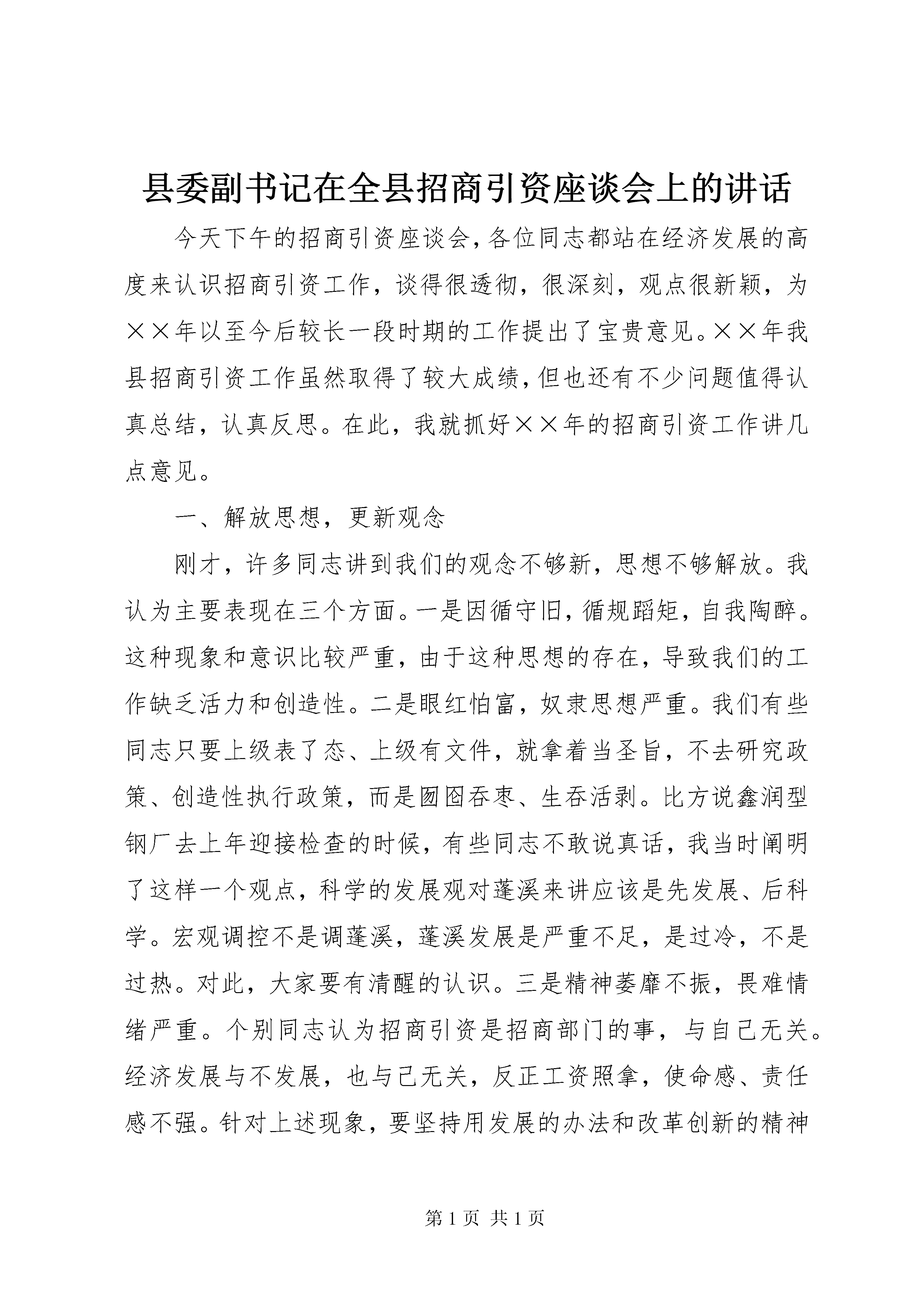 县委副书记在全县招商引资座谈会上的讲话今天下午的招商引资座谈会,各位同志都站在经济发展的高度来认识招商引资工作,谈得很透彻,很深刻,观点很新颖,为××年以至今后较长一段时期的工作提出了宝贵意见。××年我县招商引资工作虽然取得了较大成绩,但也还有不少问题值得认真总结,认真反思。在此,我就抓好××年的招商引资工作讲几点意见。一、解放思想,更新观念刚才,许多同志讲到我们的观念不够新,思想不够解放。我认为主要表现在三个方面。一是因循守旧,循规蹈矩,自我陶醉。这种现象和意识比较严重,由于这种思想的存在,导致我们的工作缺乏活力和创造性。二是眼红怕富,奴隶思想严重。我们有些同志只要上级表了态、上级有文件,就拿着当圣旨,不去研究政策、创造性执行政策,而是囫囵吞枣、生吞活剥。比方说鑫润型钢厂去上年迎接检查的时候,有些同志不敢说真话,我当时阐明了这样一个观点,科学的发展观对蓬溪来讲应该是先发展、后科学。宏观调控不是调蓬溪,蓬溪发展是严重不足,是过冷,不是过热。对此,大家要有清醒的认识。三是精神萎靡不振,畏难情绪严重。个别同志认为招商引资是招商部门的事,与自己无关。经济发展与不发展,也与己无关,反正工资照拿,使命感、责任感不强。针对上述现象,要坚持用发展的办法和改革创新的精神审视我们的思想和工作,坚决冲破一切防碍发展的思想观念,坚决改变一切束缚发展的规定和做法,坚决革除一切影响发展的体制弊端,要真正树立创新意识,要在解放思想中与时俱进,用先进的经济思想和经营理念指导蓬溪招商引资工作。要学习温州的“敢为人先,敢为天下先”的精神,要善于利用政策,研究政策,创造性地执行政策。只有解放思想,更新观念,才能明晰思路,找准出路,找准蓬溪经济发展的切入点。二、治理环境,树立形象许多同志讲到了当前蓬溪环境还不够宽松,说的主要是我们的软环境不宽松。硬环境不是一朝一夕就能改善的,软环境的改善通过努力很快就能实现的。蓬溪的硬环境在全市区县中是比较好的,地处成渝两地之间,交通优势和区位优势明显,超过射洪,蓬溪最早通铁路和高速公路,国道线、邻遂路贯穿全境,交通四通八达,形成网络。把蓬溪的发展放在全省、全市比较,差距是明显的,我们必须切实营造良好的招商引资软环境,增强蓬溪招商引资吸引力。按照“人人都是投资环境,个个都是蓬溪形象”的要求,当务之急是整治软环境,整治部门“吃拿卡要”,整治法治环境,整治办事环境,整治市场环境,对在公务活动中违法违纪的行为,要严格按照省、市纪委《关于损害投资软环境责任追究制的通知》坚决查处。通过严厉整治,真正树立蓬溪新形象。三、壮大队伍,构筑平台我县招商局、外经旅游局是两块牌子一套人马,只有人,人员确实太少,力量太薄弱,实为“小马拉大车”。首先应该壮大招商引资队伍。一是要牢固树立人才资源是第一资源的观念,学习借鉴外地经验,公开选拔和培养一批优秀(更多精彩文章来自“秘书不求人”)人才,充实和壮大招商引资队伍。二是县上下达招商引资目标任务后,各乡镇各部门单位要选择确定攻关能力强、熟悉各类经济政策的综合性人才来抓招商引资工作,并形成网络。由县委、县政府督查室、县招商局负责收集部门抓招商引资工作的领导和联络员名单,疏通信息渠道。三是抽调拟提拔的干部到招商旅游局挂职锻炼两年,以提高其综合能力,增长才干,熟悉和掌握经济政策。构筑平台方面。招商引资成功的关键是要有实实在在的载体,而载体内应与其他区域的政策有所区别,要像保税区、保税仓库那样配套建立一系列特殊政策和管理模式,才能提高招商引资的成功率。因此,要重点发展好红江工业重镇和火车站工业聚集区,进一步完善基础设施和配套工程建设,构筑好招商引资平台,使之成为招商引资的主战场和中小企业聚集的载体,成为全县经济最活跃、发展速度最快的新的经济增长点。四、配套政策,建立机制招商引资要取得成功,必须建立一套奖励政策和配套措施。政研室、计委、经贸委、招商局、财政局等部门首先要专题研究争取上级的无偿资金的奖励政策;有偿资金低息部分的奖励政策;融资利息节约的奖励政策。其次是要认真研究招商的奖励政策,要本着可操作的原则制定,以固定资产投入为准,研究核定总投资额度,奖励标准要按几级累进的百分率确定,投入越大,奖励金额可按几何级数增长。要大张旗鼓地进行奖励、进行引导。再次要研究兑现办法。××年一定要把具体操作办法拿出来,到一个奖励一个,让全县人民看得见,摸得着。同时,建立科学的机制。首先建立招商引资经费保障机制,建议从财政收入的总预备金中提作为招商引资奖励基金和招商工作经费。其次是建立领导保障机制。把招商引资作为“一把手”工程来抓,着眼于整体推进招商引资工作,实行“一个签约项目、一位领导督查、一个企业负责、一套考核奖惩办法”的招商工作责任制。坚决杜绝多头管理结果大家都不做事的现象发生。要建立项目跟踪服务、责任追