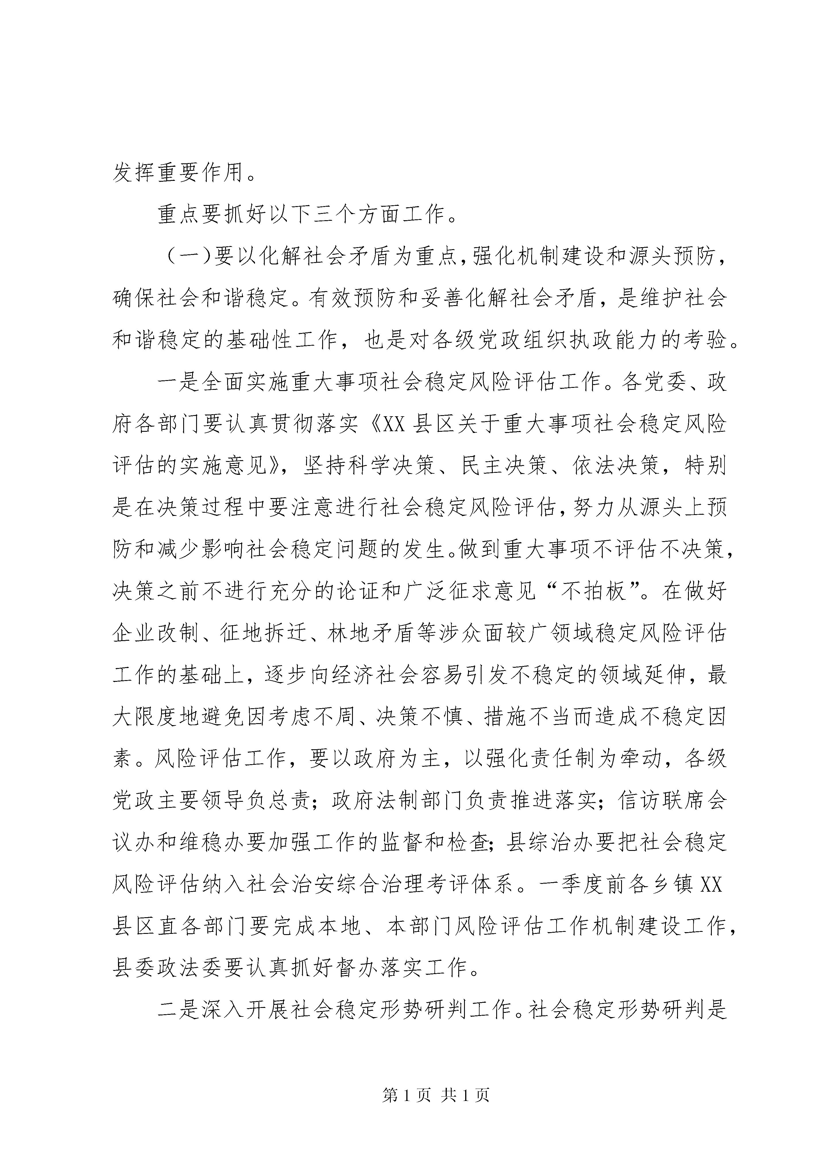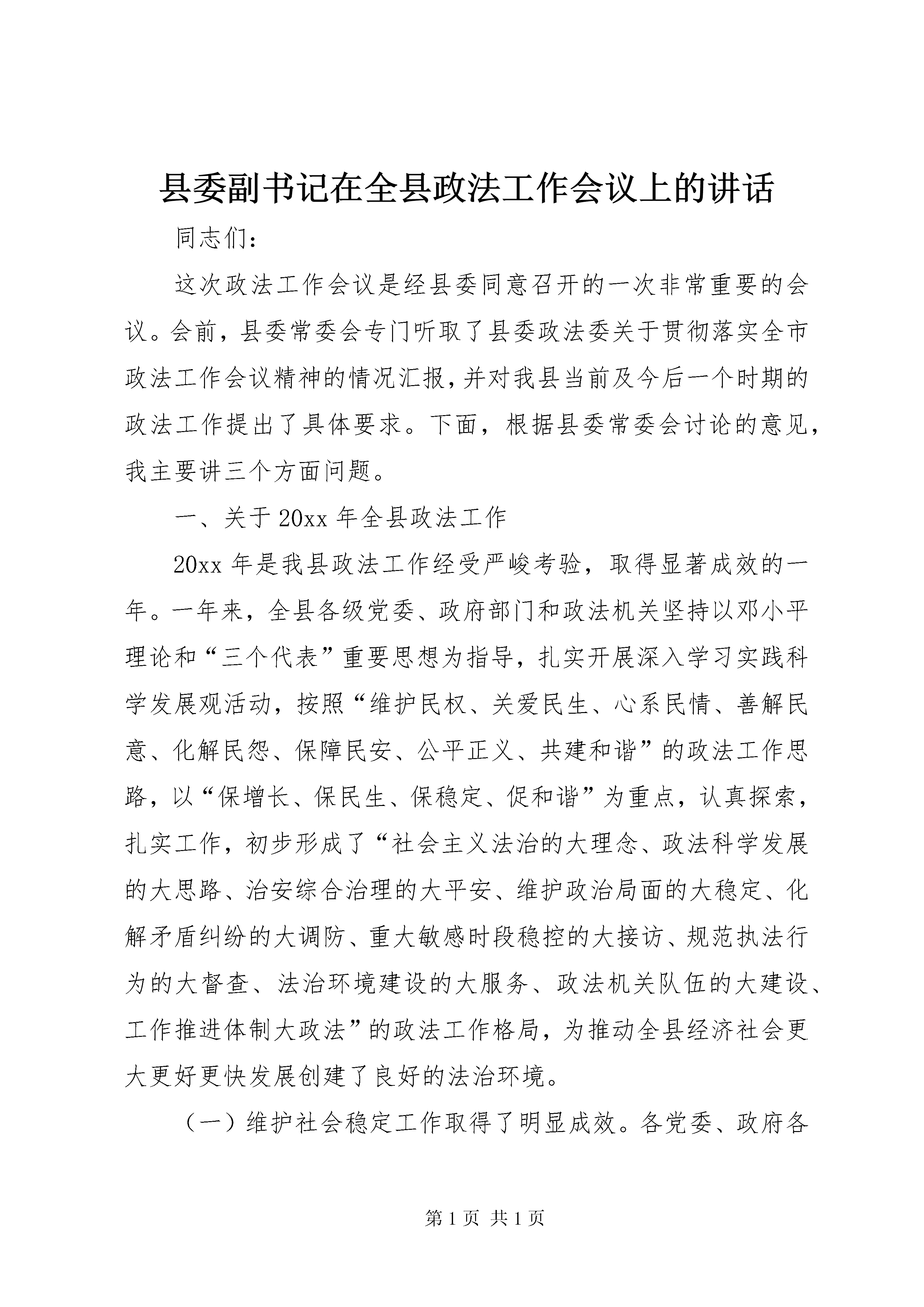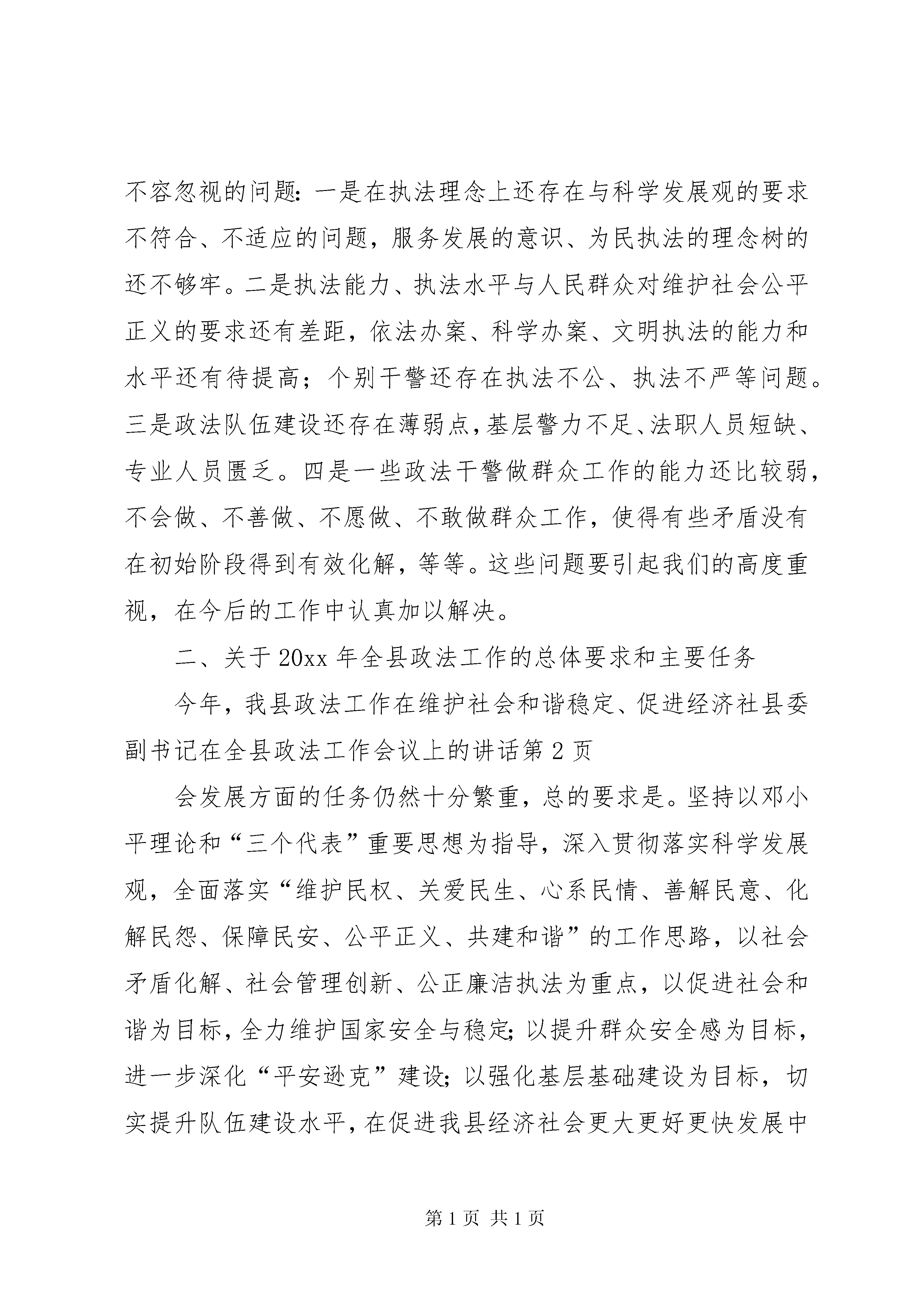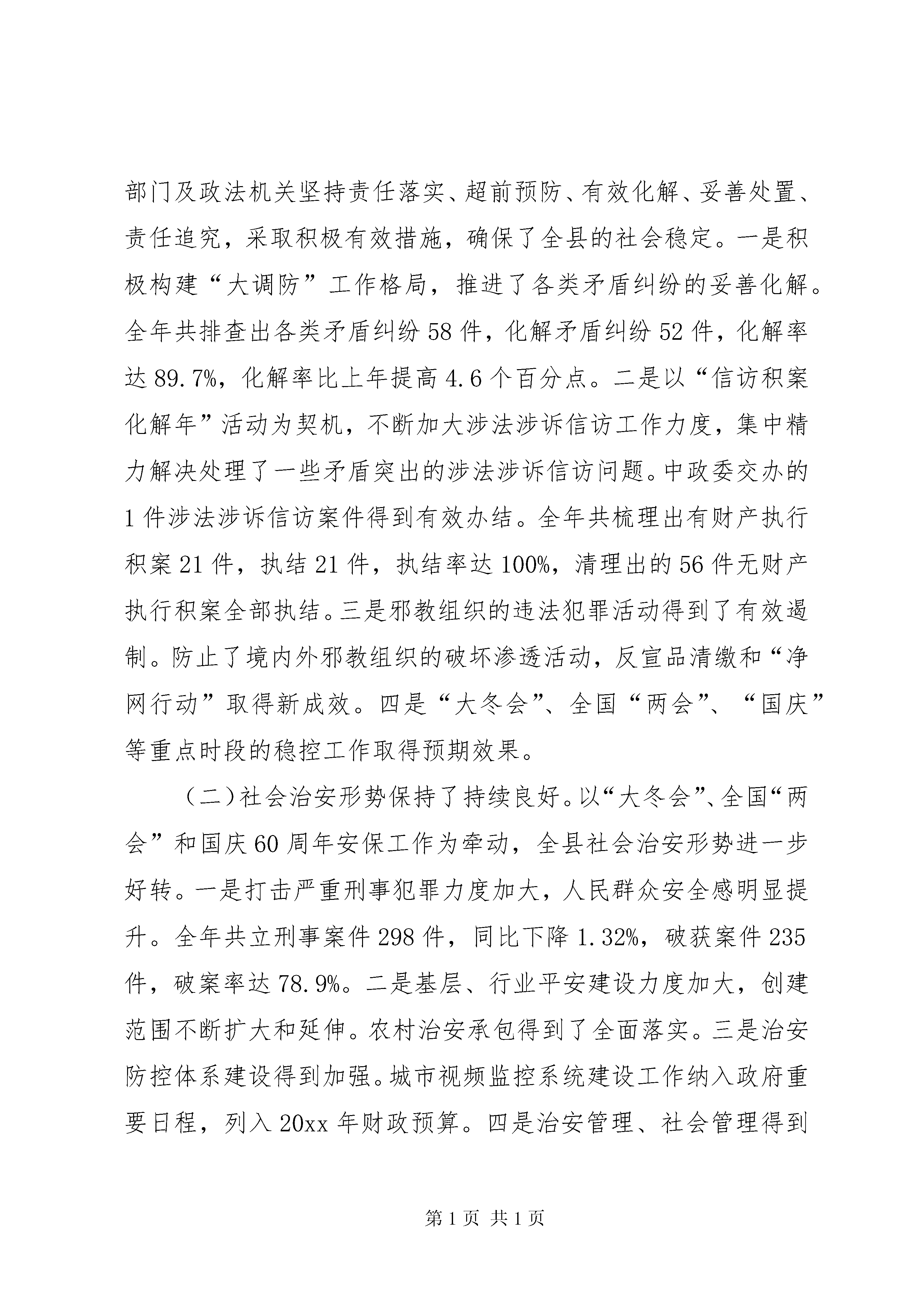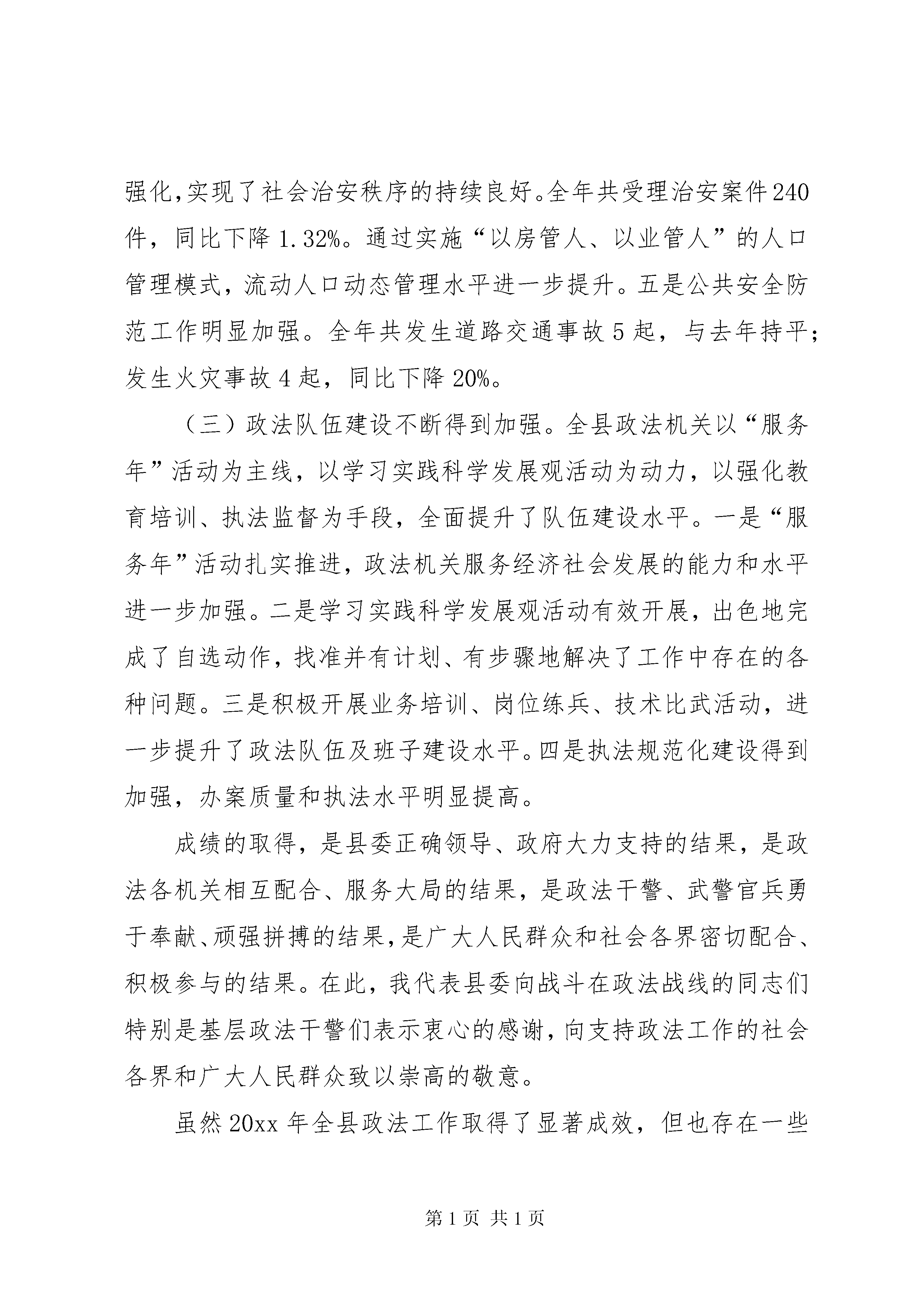 县委副书记在全县政法工作会议上的讲话同志们:这次政法工作会议是经县委同意召开的一次非常重要的会议。会前,县委常委会专门听取了县委政法委关于贯彻落实全市政法工作会议精神的情况汇报,并对我县当前及今后一个时期的政法工作提出了具体要求。下面,根据县委常委会讨论的意见,我主要讲三个方面问题。一、关于20xx年全县政法工作20xx年是我县政法工作经受严峻考验,取得显著成效的一年。一年来,全县各级党委、政府部门和政法机关坚持以邓小平理论和“三个代表”重要思想为指导,扎实开展深入学习实践科学发展观活动,按照“维护民权、关爱民生、心系民情、善解民意、化解民怨、保障民安、公平正义、共建和谐”的政法工作思路,以“保增长、保民生、保稳定、促和谐”为重点,认真探索,扎实工作,初步形成了“社会主义法治的大理念、政法科学发展的大思路、治安综合治理的大平安、维护政治局面的大稳定、化解矛盾纠纷的大调防、重大敏感时段稳控的大接访、规范执法行为的大督查、法治环境建设的大服务、政法机关队伍的大建设、工作推进体制大政法”的政法工作格局,为推动全县经济社会更大更好更快发展创建了良好的法治环境。(一)维护社会稳定工作取得了明显成效。各党委、政府各部门及政法机关坚持责任落实、超前预防、有效化解、妥善处置、责任追究,采取积极有效措施,确保了全县的社会稳定。一是积极构建“大调防”工作格局,推进了各类矛盾纠纷的妥善化解。全年共排查出各类矛盾纠纷58件,化解矛盾纠纷52件,化解率达89.7%,化解率比上年提高4.6个百分点。二是以“信访积案化解年”活动为契机,不断加大涉法涉诉信访工作力度,集中精力解决处理了一些矛盾突出的涉法涉诉信访问题。中政委交办的1件涉法涉诉信访案件得到有效办结。全年共梳理出有财产执行积案21件,执结21件,执结率达100%,清理出的56件无财产执行积案全部执结。三是邪教组织的违法犯罪活动得到了有效遏制。防止了境内外邪教组织的破坏渗透活动,反宣品清缴和“净网行动”取得新成效。四是“大冬会”、全国“两会”、“国庆”等重点时段的稳控工作取得预期效果。(二)社会治安形势保持了持续良好。以“大冬会”、全国“两会”和国庆60周年安保工作为牵动,全县社会治安形势进一步好转。一是打击严重刑事犯罪力度加大,人民群众安全感明显提升。全年共立刑事案件298件,同比下降1.32%,破获案件235件,破案率达78.9%。二是基层、行业平安建设力度加大,创建范围不断扩大和延伸。农村治安承包得到了全面落实。三是治安防控体系建设得到加强。城市视频监控系统建设工作纳入政府重要日程,列入20xx年财政预算。四是治安管理、社会管理得到强化,实现了社会治安秩序的持续良好。全年共受理治安案件240件,同比下降1.32%。通过实施“以房管人、以业管人”的人口管理模式,流动人口动态管理水平进一步提升。五是公共安全防范工作明显加强。全年共发生道路交通事故5起,与去年持平;发生火灾事故4起,同比下降20%。(三)政法队伍建设不断得到加强。全县政法机关以“服务年”活动为主线,以学习实践科学发展观活动为动力,以强化教育培训、执法监督为手段,全面提升了队伍建设水平。一是“服务年”活动扎实推进,政法机关服务经济社会发展的能力和水平进一步加强。二是学习实践科学发展观活动有效开展,出色地完成了自选动作,找准并有计划、有步骤地解决了工作中存在的各种问题。三是积极开展业务培训、岗位练兵、技术比武活动,进一步提升了政法队伍及班子建设水平。四是执法规范化建设得到加强,办案质量和执法水平明显提高。成绩的取得,是县委正确领导、政府大力支持的结果,是政法各机关相互配合、服务大局的结果,是政法干警、武警官兵勇于奉献、顽强拼搏的结果,是广大人民群众和社会各界密切配合、积极参与的结果。在此,我代表县委向战斗在政法战线的同志们特别是基层政法干警们表示衷心的感谢,向支持政法工作的社会各界和广大人民群众致以崇高的敬意。虽然20xx年全县政法工作取得了显著成效,但也存在一些不容忽视的问题:一是在执法理念上还存在与科学发展观的要求不符合、不适应的问题,服务发展的意识、为民执法的理念树的还不够牢。二是执法能力、执法水平与人民群众对维护社会公平正义的要求还有差距,依法办案、科学办案、文明执法的能力和水平还有待提高;个别干警还存在执法不公、执法不严等问题。三是政法队伍建设还存在薄弱点,基层警力不足、法职人员短缺、专业人员匮乏。四是一些政法干警做群众工作的能力还比较弱,不会做、不善做、不愿做、不敢做群众工作,使得有些矛盾没有在初始阶段得到有效化解,等等。这些问题要引起我们的高度重视,在今后的工作中认真加以解决。二、关于20xx年全县政法工作的总体要求和主要任务今年,我县政法工作在维护社会和谐稳定、促进经济社县委副书记在全县政法工作