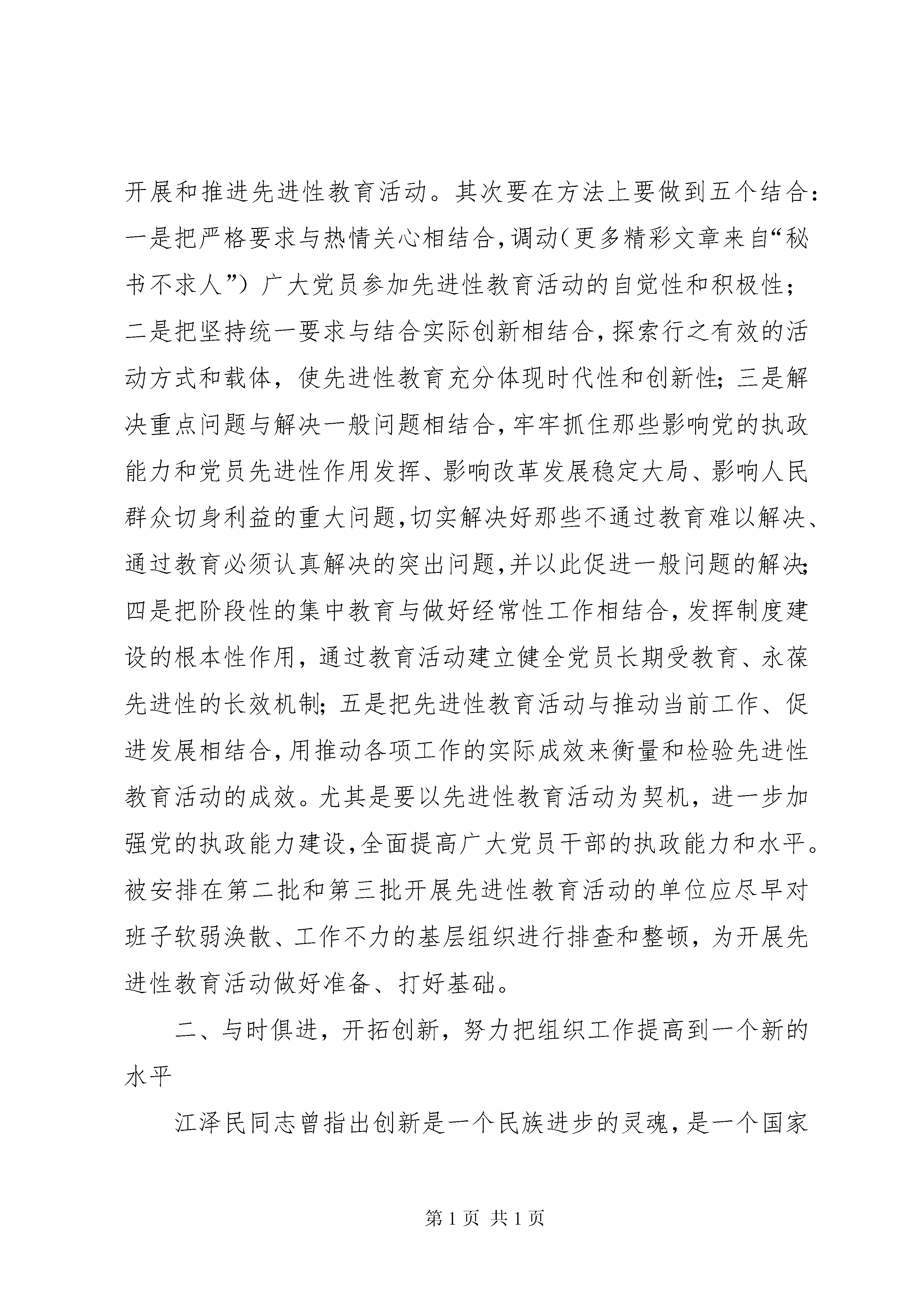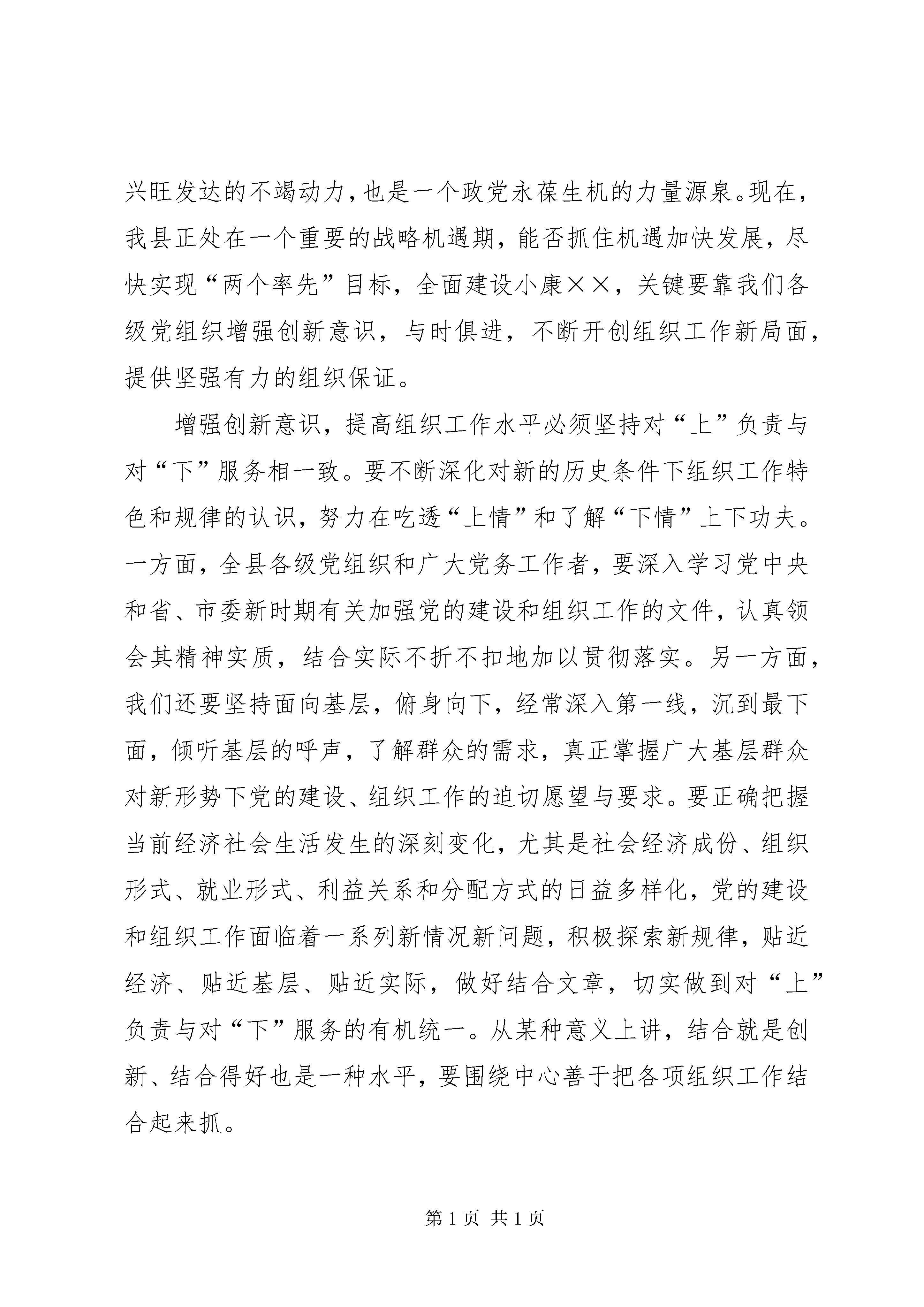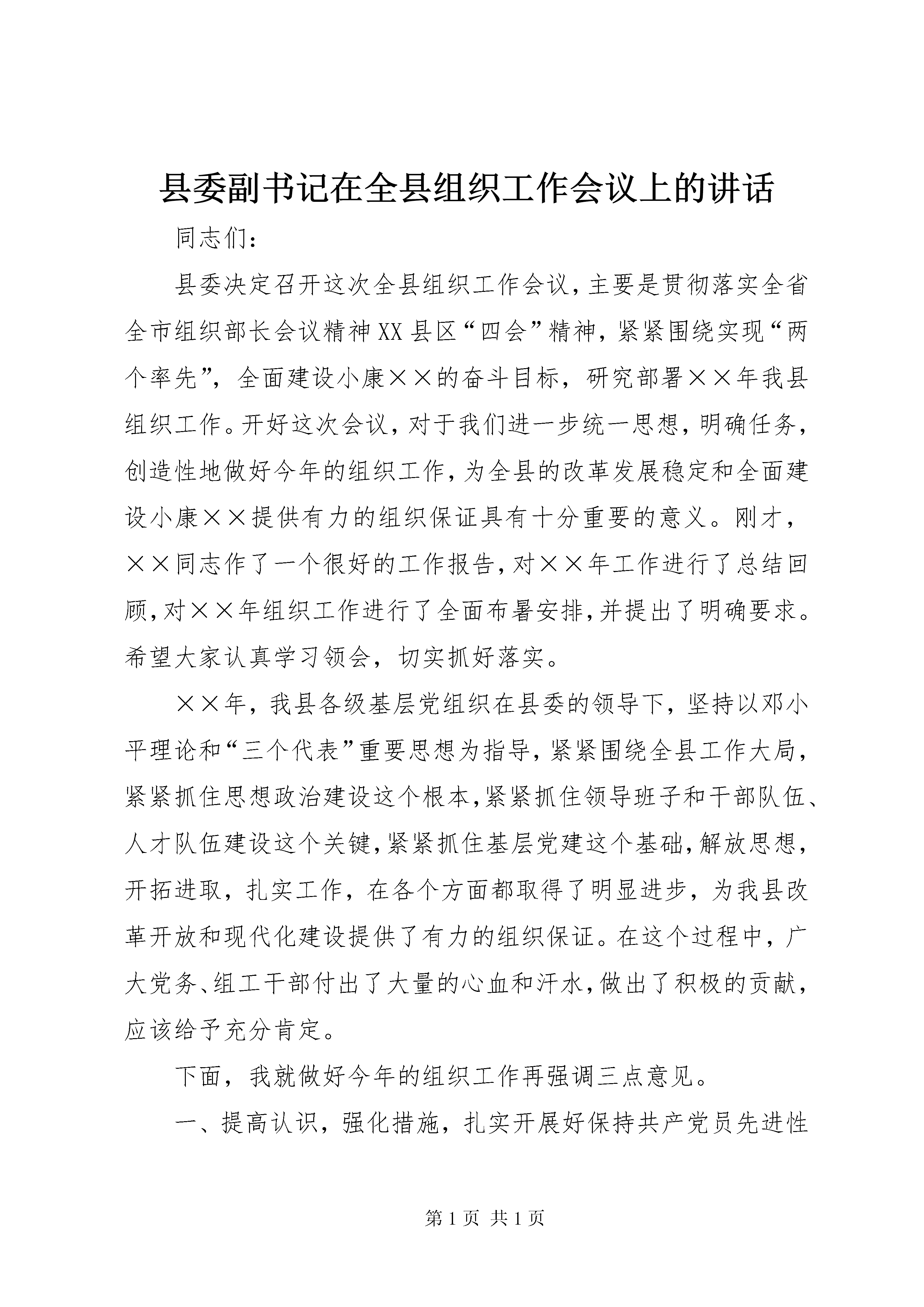 县委副书记在全县组织工作会议上的讲话同志们:县委决定召开这次全县组织工作会议,主要是贯彻落实全省全市组织部长会议精神XX县区“四会”精神,紧紧围绕实现“两个率先”,全面建设小康××的奋斗目标,研究部署××年我县组织工作。开好这次会议,对于我们进一步统一思想,明确任务,创造性地做好今年的组织工作,为全县的改革发展稳定和全面建设小康××提供有力的组织保证具有十分重要的意义。刚才,××同志作了一个很好的工作报告,对××年工作进行了总结回顾,对××年组织工作进行了全面布暑安排,并提出了明确要求。希望大家认真学习领会,切实抓好落实。××年,我县各级基层党组织在县委的领导下,坚持以邓小平理论和“三个代表”重要思想为指导,紧紧围绕全县工作大局,紧紧抓住思想政治建设这个根本,紧紧抓住领导班子和干部队伍、人才队伍建设这个关键,紧紧抓住基层党建这个基础,解放思想,开拓进取,扎实工作,在各个方面都取得了明显进步,为我县改革开放和现代化建设提供了有力的组织保证。在这个过程中,广大党务、组工干部付出了大量的心血和汗水,做出了积极的贡献,应该给予充分肯定。下面,我就做好今年的组织工作再强调三点意见。一、提高认识,强化措施,扎实开展好保持共产党员先进性教育活动当前,在全党开展的先进性教育活动,是我党在加强党员教育和干部队伍建设方面采取的一项重大战略举措,对于提高党员干部队伍的素质、始终保持党的先进性和纯洁性、巩固党的执政基础、提高党的执政能力,具有非常重大的意义。整个先进性教育活动分三批进行。第一批先进性教育活动,已进入第二阶段。无论是第一批还是第二批、第三批开展先进性教育活动都要严格按照中央和省、市、县委的要求,着力从以下几个方面把先进性教育活动抓实、抓紧、抓好、抓出成效。一要牢牢把握正确方向。胡锦涛同志在中央保持共产党员先进性专题报告会上发表的重要讲话,科学回答了加强党的先进性建设一系列重大理论和实践问题,是统领整个先进性教育活动的纲领性文件。全县各级党组织和广大党员要认真学习贯彻胡锦涛同志重要讲话精神,始终用“一个根本”、“六个坚持”、“四个带头”的精神内涵和原则要求指导各阶段的工作,始终把握正确方向,以先进性教育活动的新成效,不断把党的先进性建设推向前进。二要切实加强组织领导。各级党组织要把先进性教育活动作为当前党建工作的头等大事,认真落实领导责任制,加强监督检查和具体指导,及时总结经验,研究解决具体问题。要把先进性教育活动组织实施的着力点放在充分发挥各级领导、基层组织、全体党员和广大群众的作用上来,把先进性教育活动作为加强领导班子建设的重要“抓手”使各级领导干部在实践“三个代表”重要思想、树立落实科学发展观、提高自身素质、增强执政本领方面为广大党员做好表率;要发挥广大群众的推动力,坚持群众路线,把先进性教育的评判权交给群众,依靠群众查找问题、监督党员、评议工作,自觉用群众满意标准衡量和检验先进性教育的实效;还要发挥基层组织的创造力,使基层组织在先进性教育活动中更好地发挥组织、教育、引导功能,成为党员提高先进性的基地、发挥先进性的阵地;更要发挥党员主体的能动力,引导党员做创新实干的表率、加快发展的先锋,使党员增强党性、体现先进性的过程,成为创新实干、加快发展的过程。三要狠抓活动目标落实。要使先进性教育活动各项目标落在实处,首先必须在思想上克服“四种倾向”:一是防“松”,克服消极、应付等思想倾向,深入做好思想动员、舆论宣传和督查指导,把先进性教育的意义讲透、要求讲明,调动各基层组织、广大党员参与教育活动的热情,使教育活动高标准、高起点、高质量;二是防“散”,严防一些单位可能出现的眉毛胡子一把抓,抓不到重点、创不出特色的问题;三是防“虚”,严防教育活动空对空、走过场,努力做到理论学习联系实际、对照检查结合实际、整改提高针对实际;四是防“偏”,跳出就教育抓教育的模式,严防脱离中心、偏离大局,自觉围绕大局、紧抓中心,谋划、开展和推进先进性教育活动。其次要在方法上要做到五个结合:一是把严格要求与热情关心相结合,调动(更多精彩文章来自“秘书不求人”)广大党员参加先进性教育活动的自觉性和积极性;二是把坚持统一要求与结合实际创新相结合,探索行之有效的活动方式和载体,使先进性教育充分体现时代性和创新性;三是解决重点问题与解决一般问题相结合,牢牢抓住那些影响党的执政能力和党员先进性作用发挥、影响改革发展稳定大局、影响人民群众切身利益的重大问题,切实解决好那些不通过教育难以解决、通过教育必须认真解决的突出问题,并以此促进一般问题的解决;四是把阶段性的集中教育与做好经常性工作相结合,发挥制度建设的根本性作用,通过教育活动建立健全党员长期受教育、永葆先进性的长效机制;五是把先进性教育活动与推动当前工作、促进发展相结合,用推动各项工作的实际成效来衡量