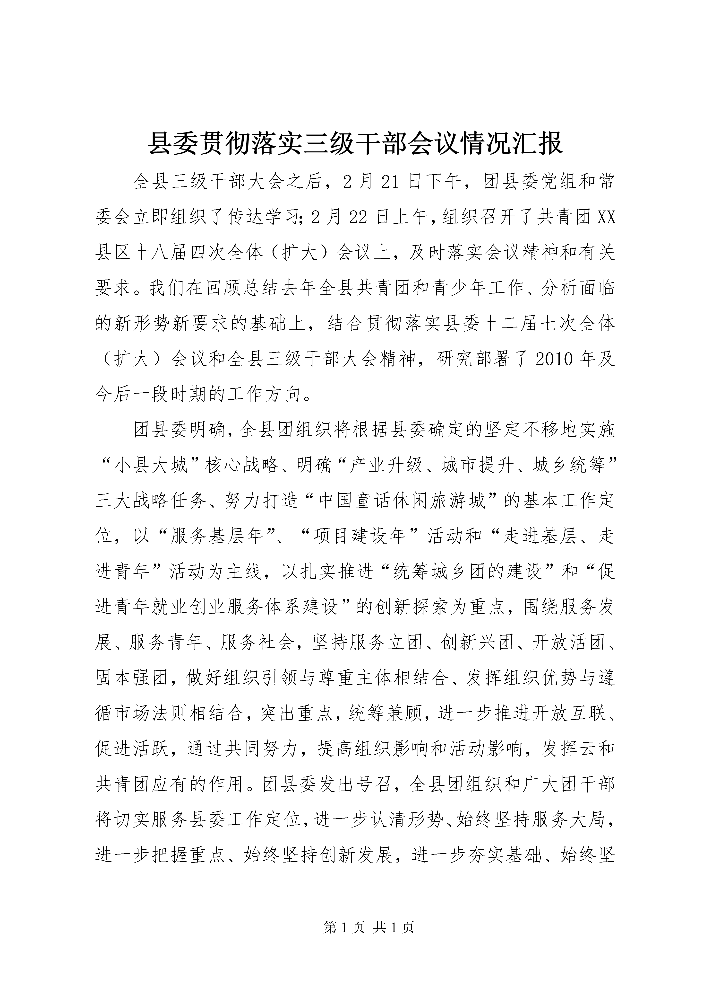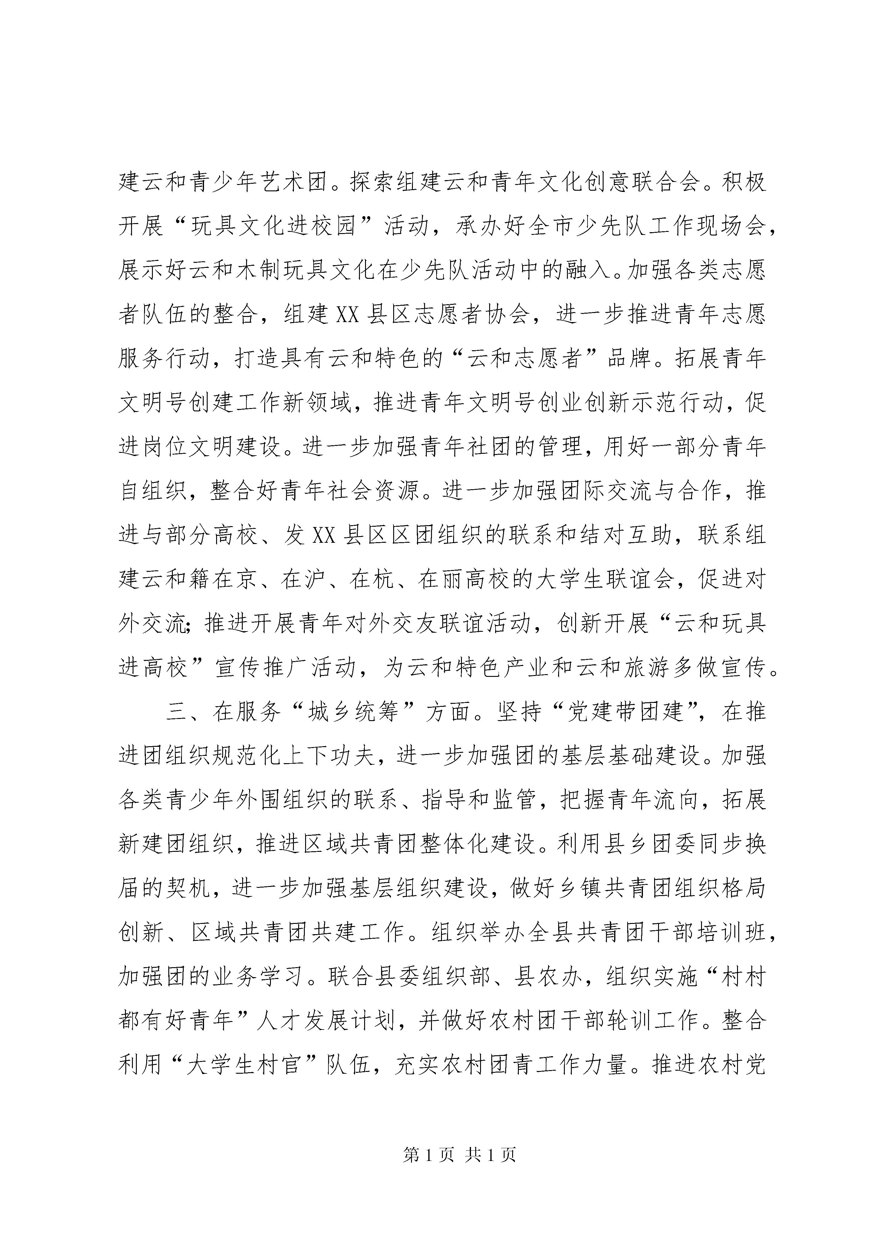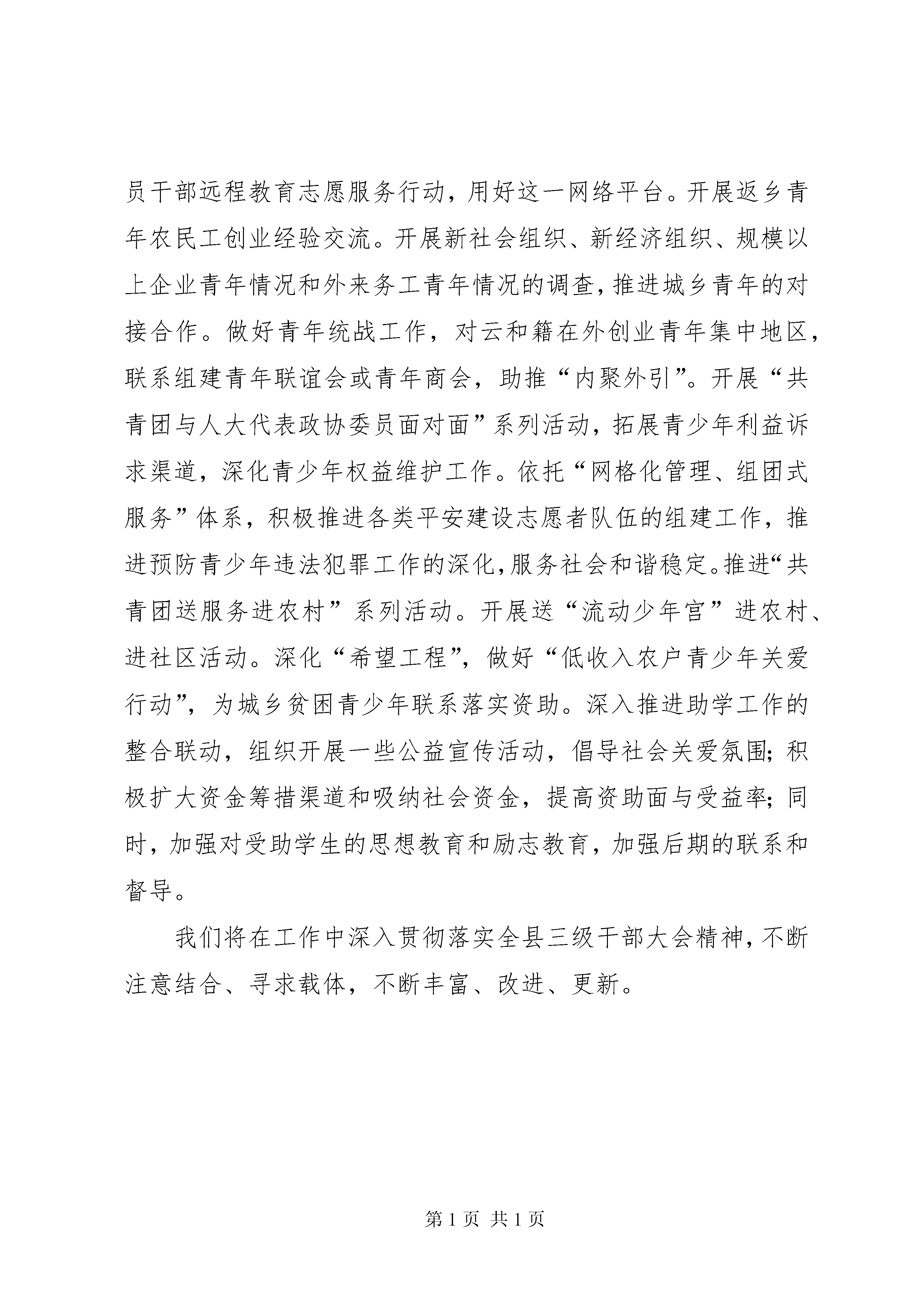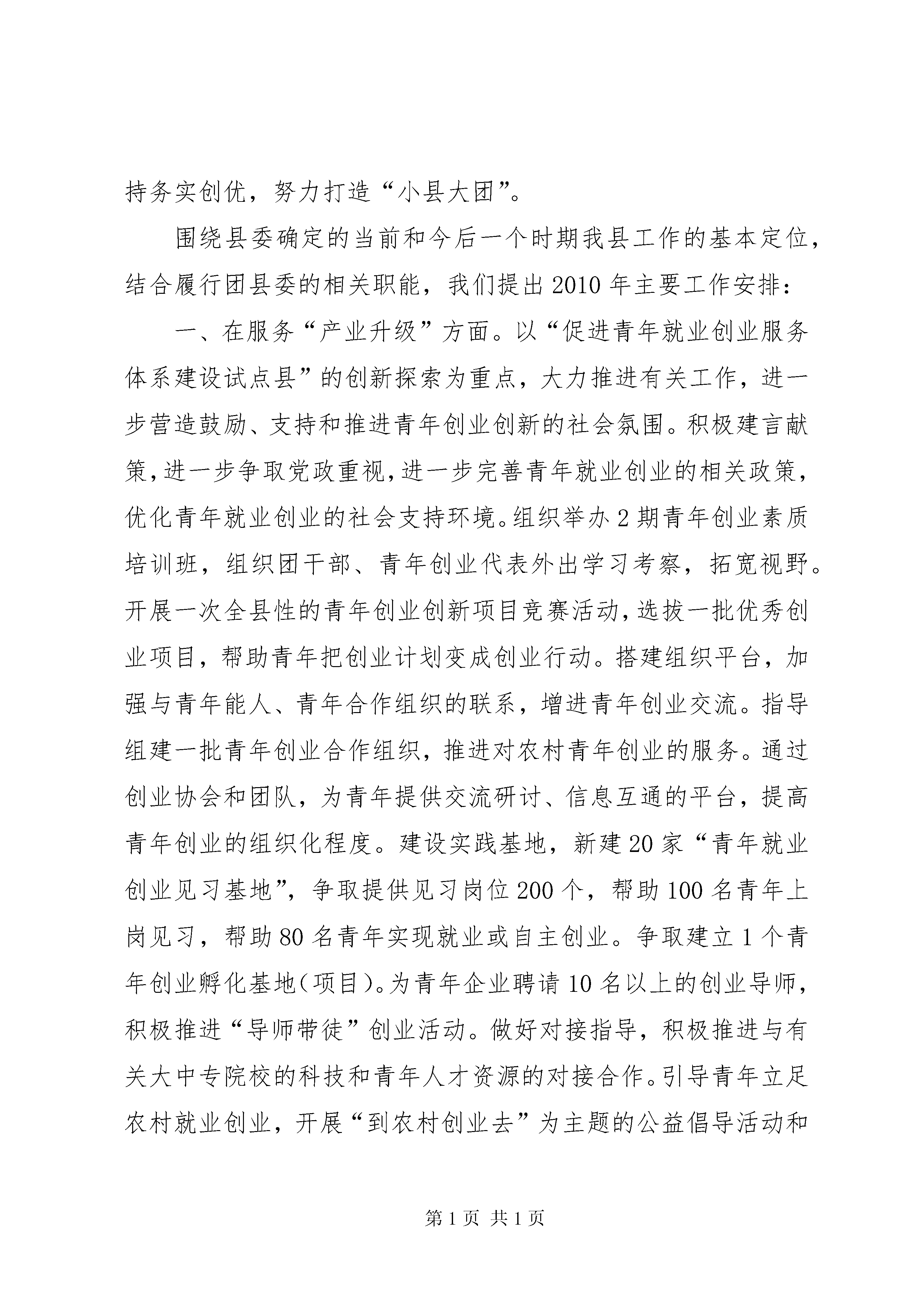 县委贯彻落实三级干部会议情况汇报全县三级干部大会之后,2月21日下午,团县委党组和常委会立即组织了传达学习;2月22日上午,组织召开了共青团XX县区十八届四次全体(扩大)会议上,及时落实会议精神和有关要求。我们在回顾总结去年全县共青团和青少年工作、分析面临的新形势新要求的基础上,结合贯彻落实县委十二届七次全体(扩大)会议和全县三级干部大会精神,研究部署了2010年及今后一段时期的工作方向。团县委明确,全县团组织将根据县委确定的坚定不移地实施“小县大城”核心战略、明确“产业升级、城市提升、城乡统筹”三大战略任务、努力打造“中国童话休闲旅游城”的基本工作定位,以“服务基层年”、“项目建设年”活动和“走进基层、走进青年”活动为主线,以扎实推进“统筹城乡团的建设”和“促进青年就业创业服务体系建设”的创新探索为重点,围绕服务发展、服务青年、服务社会,坚持服务立团、创新兴团、开放活团、固本强团,做好组织引领与尊重主体相结合、发挥组织优势与遵循市场法则相结合,突出重点,统筹兼顾,进一步推进开放互联、促进活跃,通过共同努力,提高组织影响和活动影响,发挥云和共青团应有的作用。团县委发出号召,全县团组织和广大团干部将切实服务县委工作定位,进一步认清形势、始终坚持服务大局,进一步把握重点、始终坚持创新发展,进一步夯实基础、始终坚持务实创优,努力打造“小县大团”。围绕县委确定的当前和今后一个时期我县工作的基本定位,结合履行团县委的相关职能,我们提出2010年主要工作安排:一、在服务“产业升级”方面。以“促进青年就业创业服务体系建设试点县”的创新探索为重点,大力推进有关工作,进一步营造鼓励、支持和推进青年创业创新的社会氛围。积极建言献策,进一步争取党政重视,进一步完善青年就业创业的相关政策,优化青年就业创业的社会支持环境。组织举办2期青年创业素质培训班,组织团干部、青年创业代表外出学习考察,拓宽视野。开展一次全县性的青年创业创新项目竞赛活动,选拔一批优秀创业项目,帮助青年把创业计划变成创业行动。搭建组织平台,加强与青年能人、青年合作组织的联系,增进青年创业交流。指导组建一批青年创业合作组织,推进对农村青年创业的服务。通过创业协会和团队,为青年提供交流研讨、信息互通的平台,提高青年创业的组织化程度。建设实践基地,新建20家“青年就业创业见习基地”,争取提供见习岗位200个,帮助100名青年上岗见习,帮助80名青年实现就业或自主创业。争取建立1个青年创业孵化基地(项目)。为青年企业聘请10名以上的创业导师,积极推进“导师带徒”创业活动。做好对接指导,积极推进与有关大中专院校的科技和青年人才资源的对接合作。引导青年立足农村就业创业,开展“到农村创业去”为主题的公益倡导活动和青年就业创业体验行动,助推新农村建设。开展一批青年创业示范基地、青年创业示范户的评选,树创青年典型。进一步推动完善金融支持青年创业发展的协作机制,优化青年创业的金融服务环境。推进金融业务咨询、政策信息服务,做好初创型、成长型的项目推介,努力扩大信贷扶持,实现争取有效信贷扶持达400万元以上。推进青年培训转移就业工作,组织参加不同层次和类型的青年技能培训班,实现260人以上。进一步完善青年就业信息发布体系。进一步推动职业高中青年学生职业能力和创业意识的培养工作。二、在服务“城市提升”方面。“五城联创”、“十大基地”、打造“中国童话休闲旅游城”,是县委、县政府的重大决策。全县团组织要积极参与,投入到省级文明县、国家生态县、省级旅游经济强县、省级森林城市、省级园林城市创建等有关工作,共同提升云和城市整体形象和品位。整合联动,组织开展系列青少年文体交流活动,营造朝气蓬勃、积极向上、活跃多姿的青少年文化氛围。围绕“山水家园、童话世界”的城市主题,组织一次全县青少年家乡主题艺术比赛,办好一次画展(影展)。加强“家乡文化”、“云和人文精神”宣传教育,积极推动青少年思想道德建设。坚持把社会效益放在首位,全面加强青少年宫校外教育活动,并承接好“春泥计划”主题活动的整合。推进青少年宫活动场所的改善,并积极拓展和有关活动场所的联合共建工作。筹建云和青少年艺术团。探索组建云和青年文化创意联合会。积极开展“玩具文化进校园”活动,承办好全市少先队工作现场会,展示好云和木制玩具文化在少先队活动中的融入。加强各类志愿者队伍的整合,组建XX县区志愿者协会,进一步推进青年志愿服务行动,打造具有云和特色的“云和志愿者”品牌。拓展青年文明号创建工作新领域,推进青年文明号创业创新示范行动,促进岗位文明建设。进一步加强青年社团的管理,用好一部分青年自组织,整合好青年社会资源。进一步加强团际交流与合作,推进与部分高校、发XX县区区团组织的联系和结对互助,联系组建云和籍在京、在沪、在杭、在丽高校的大学生联谊会,