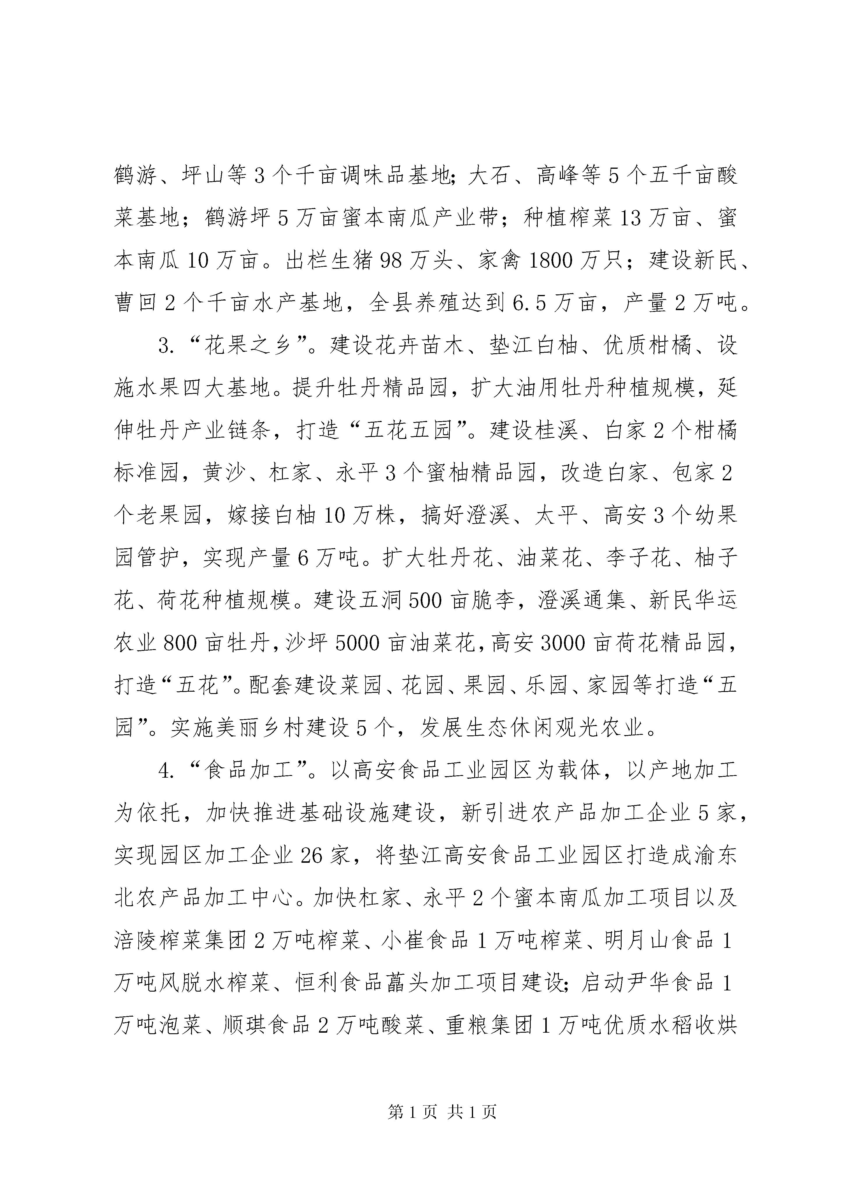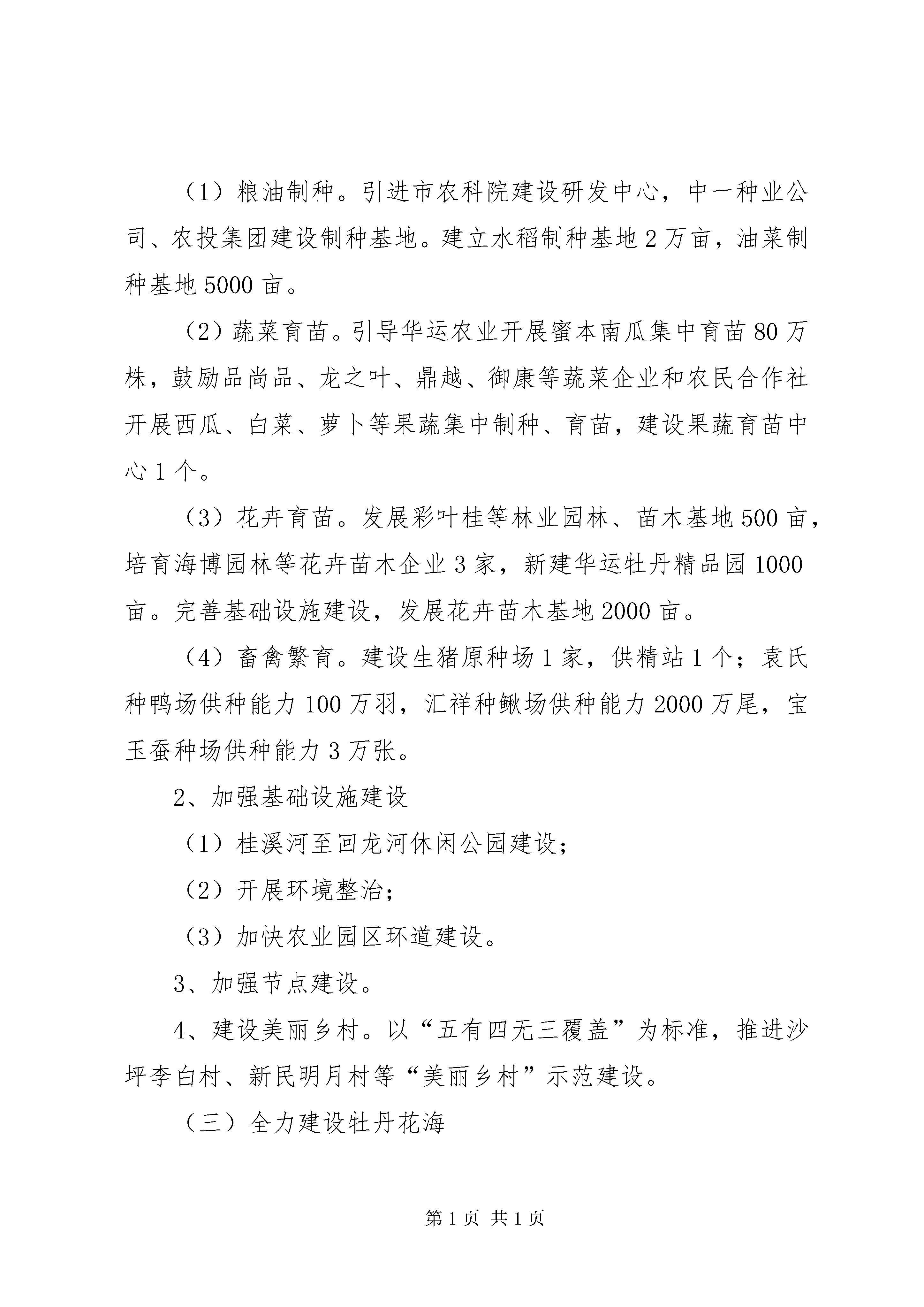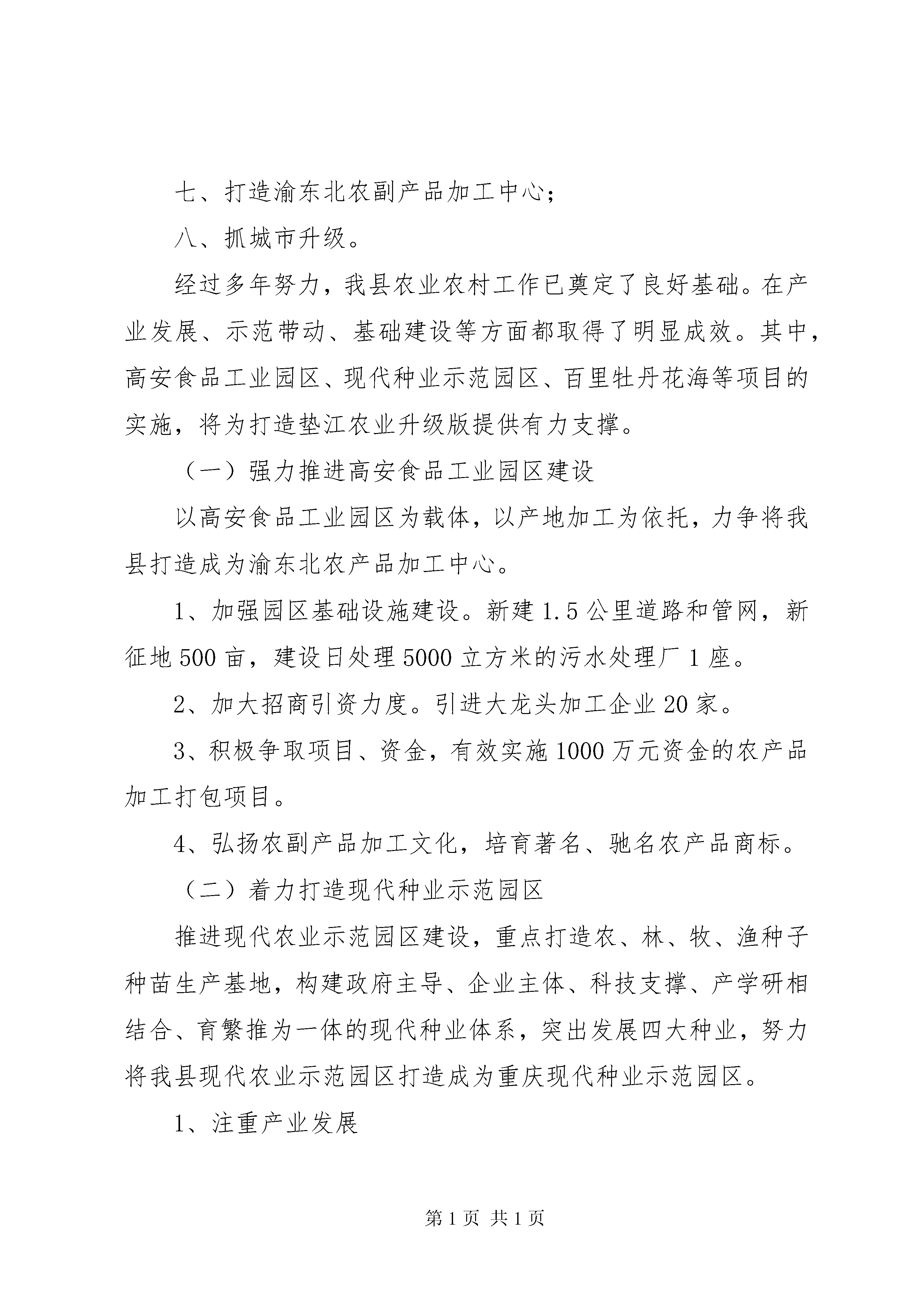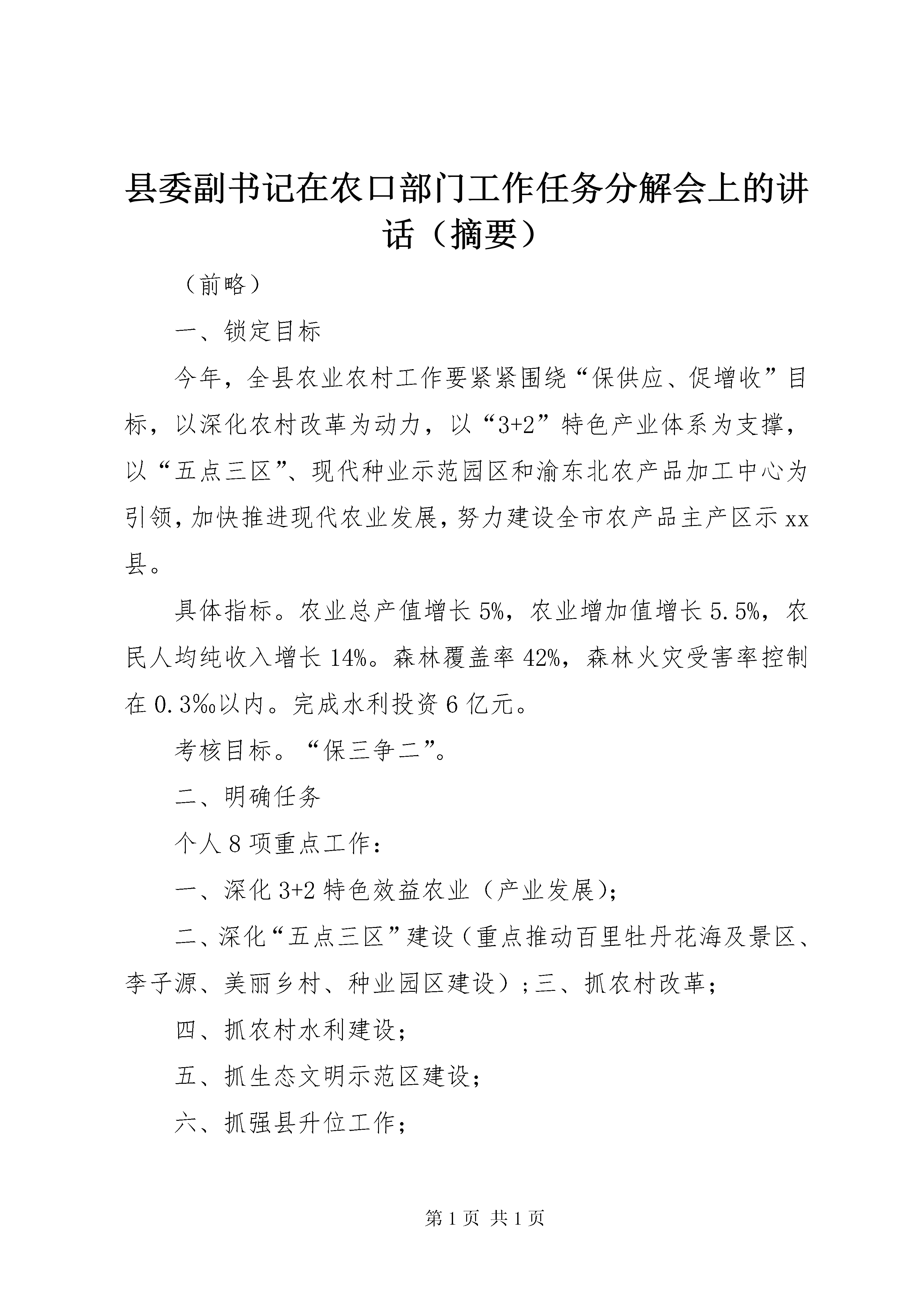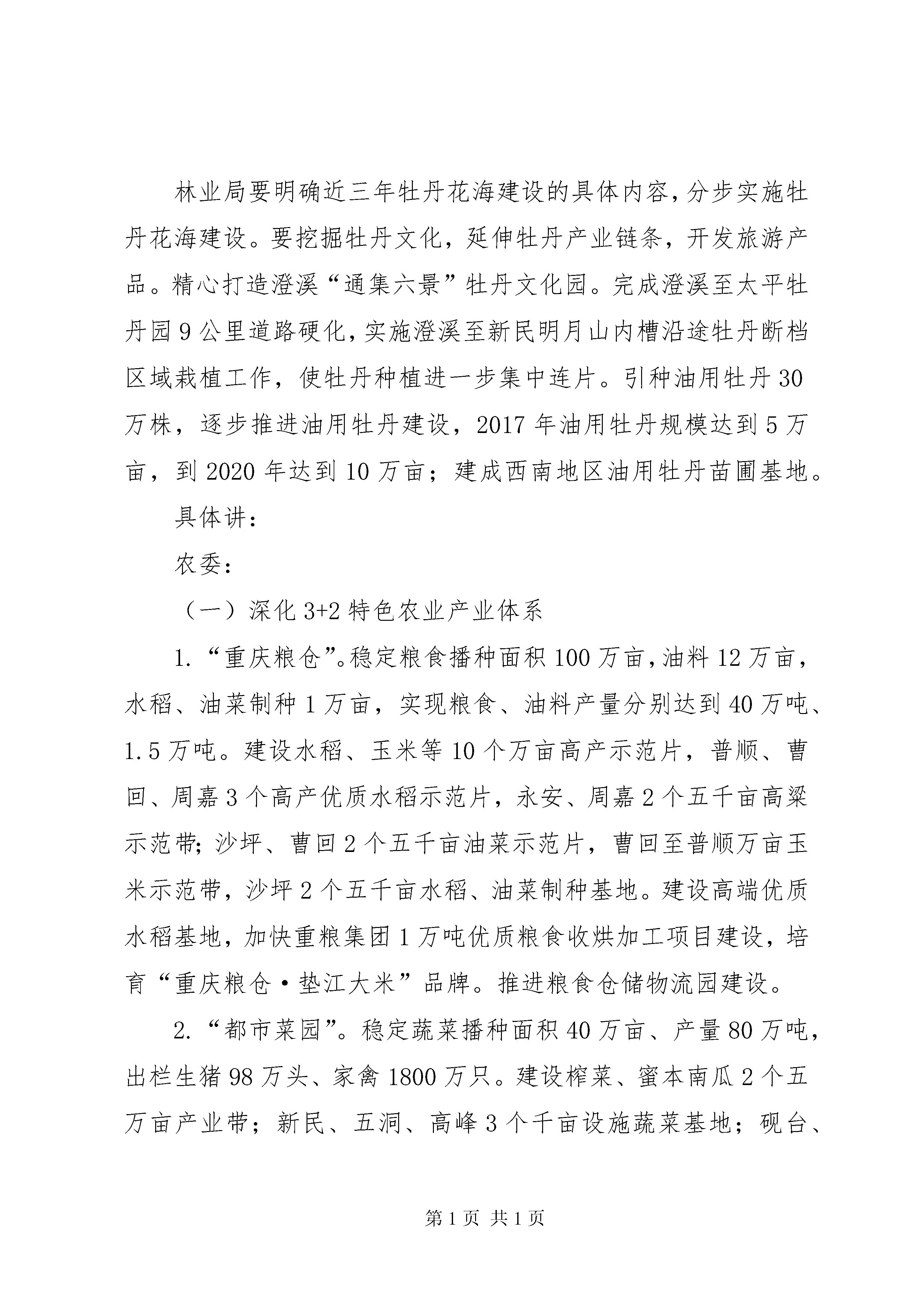 县委副书记在农口部门工作任务分解会上的讲话(摘要)(前略)一、锁定目标今年,全县农业农村工作要紧紧围绕“保供应、促增收”目标,以深化农村改革为动力,以“3+2”特色产业体系为支撑,以“五点三区”、现代种业示范园区和渝东北农产品加工中心为引领,加快推进现代农业发展,努力建设全市农产品主产区示xx县。具体指标。农业总产值增长5%,农业增加值增长5.5%,农民人均纯收入增长14%。森林覆盖率42%,森林火灾受害率控制在0.3‰以内。完成水利投资6亿元。考核目标。“保三争二”。二、明确任务个人8项重点工作:一、深化3+2特色效益农业(产业发展);二、深化“五点三区”建设(重点推动百里牡丹花海及景区、李子源、美丽乡村、种业园区建设);三、抓农村改革;四、抓农村水利建设;五、抓生态文明示范区建设;六、抓强县升位工作;七、打造渝东北农副产品加工中心;八、抓城市升级。经过多年努力,我县农业农村工作已奠定了良好基础。在产业发展、示范带动、基础建设等方面都取得了明显成效。其中,高安食品工业园区、现代种业示范园区、百里牡丹花海等项目的实施,将为打造垫江农业升级版提供有力支撑。(一)强力推进高安食品工业园区建设以高安食品工业园区为载体,以产地加工为依托,力争将我县打造成为渝东北农产品加工中心。1、加强园区基础设施建设。新建1.5公里道路和管网,新征地500亩,建设日处理5000立方米的污水处理厂1座。2、加大招商引资力度。引进大龙头加工企业20家。3、积极争取项目、资金,有效实施1000万元资金的农产品加工打包项目。4、弘扬农副产品加工文化,培育著名、驰名农产品商标。(二)着力打造现代种业示范园区推进现代农业示范园区建设,重点打造农、林、牧、渔种子种苗生产基地,构建政府主导、企业主体、科技支撑、产学研相结合、育繁推为一体的现代种业体系,突出发展四大种业,努力将我县现代农业示范园区打造成为重庆现代种业示范园区。1、注重产业发展(1)粮油制种。引进市农科院建设研发中心,中一种业公司、农投集团建设制种基地。建立水稻制种基地2万亩,油菜制种基地5000亩。(2)蔬菜育苗。引导华运农业开展蜜本南瓜集中育苗80万株,鼓励品尚品、龙之叶、鼎越、御康等蔬菜企业和农民合作社开展西瓜、白菜、萝卜等果蔬集中制种、育苗,建设果蔬育苗中心1个。(3)花卉育苗。发展彩叶桂等林业园林、苗木基地500亩,培育海博园林等花卉苗木企业3家,新建华运牡丹精品园1000亩。完善基础设施建设,发展花卉苗木基地2000亩。(4)畜禽繁育。建设生猪原种场1家,供精站1个;袁氏种鸭场供种能力100万羽,汇祥种鳅场供种能力2000万尾,宝玉蚕种场供种能力3万张。2、加强基础设施建设(1)桂溪河至回龙河休闲公园建设;(2)开展环境整治;(3)加快农业园区环道建设。3、加强节点建设。4、建设美丽乡村。以“五有四无三覆盖”为标准,推进沙坪李白村、新民明月村等“美丽乡村”示范建设。(三)全力建设牡丹花海林业局要明确近三年牡丹花海建设的具体内容,分步实施牡丹花海建设。要挖掘牡丹文化,延伸牡丹产业链条,开发旅游产品。精心打造澄溪“通集六景”牡丹文化园。完成澄溪至太平牡丹园9公里道路硬化,实施澄溪至新民明月山内槽沿途牡丹断档区域栽植工作,使牡丹种植进一步集中连片。引种油用牡丹30万株,逐步推进油用牡丹建设,2017年油用牡丹规模达到5万亩,到2020年达到10万亩;建成西南地区油用牡丹苗圃基地。具体讲:农委:(一)深化3+2特色农业产业体系1.“重庆粮仓”。稳定粮食播种面积100万亩,油料12万亩,水稻、油菜制种1万亩,实现粮食、油料产量分别达到40万吨、1.5万吨。建设水稻、玉米等10个万亩高产示范片,普顺、曹回、周嘉3个高产优质水稻示范片,永安、周嘉2个五千亩高粱示范带;沙坪、曹回2个五千亩油菜示范片,曹回至普顺万亩玉米示范带,沙坪2个五千亩水稻、油菜制种基地。建设高端优质水稻基地,加快重粮集团1万吨优质粮食收烘加工项目建设,培育“重庆粮仓·垫江大米”品牌。推进粮食仓储物流园建设。2.“都市菜园”。稳定蔬菜播种面积40万亩、产量80万吨,出栏生猪98万头、家禽1800万只。建设榨菜、蜜本南瓜2个五万亩产业带;新民、五洞、高峰3个千亩设施蔬菜基地;砚台、鹤游、坪山等3个千亩调味品基地;大石、高峰等5个五千亩酸菜基地;鹤游坪5万亩蜜本南瓜产业带;种植榨菜13万亩、蜜本南瓜10万亩。出栏生猪98万头、家禽1800万只;建设新民、曹回2个千亩水产基地,全县养殖达到6.5万亩,产量2万吨。3.“花果之乡”。建设花卉苗木、垫江白柚、优质柑橘、设施水果四大基地。提升牡丹精品园,扩大油用牡丹种植规模,延伸牡丹产业链条,打造“五花五园”。建设桂溪、白家2个柑橘标准园,黄沙、杠家、永平3个蜜柚精品园,改