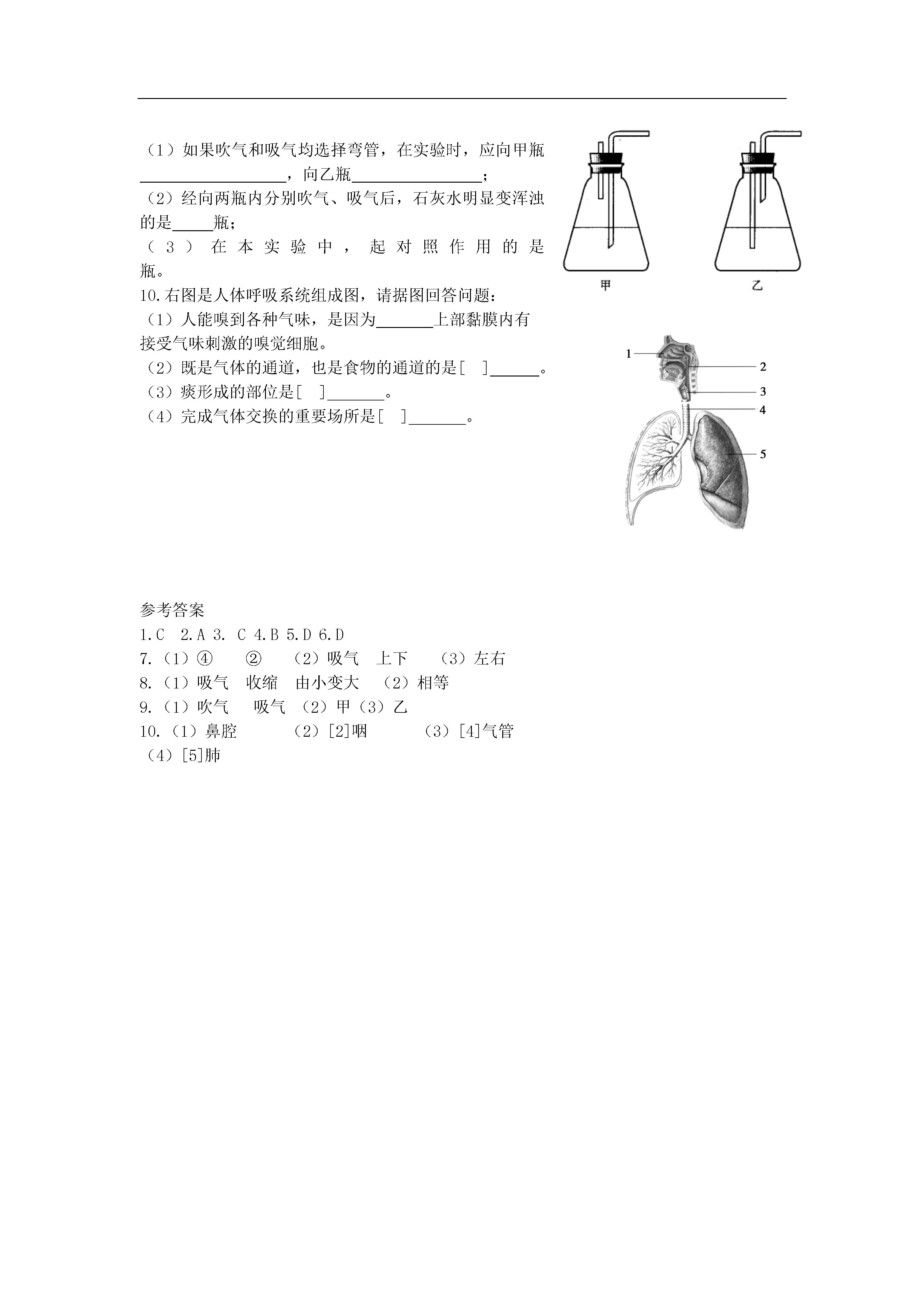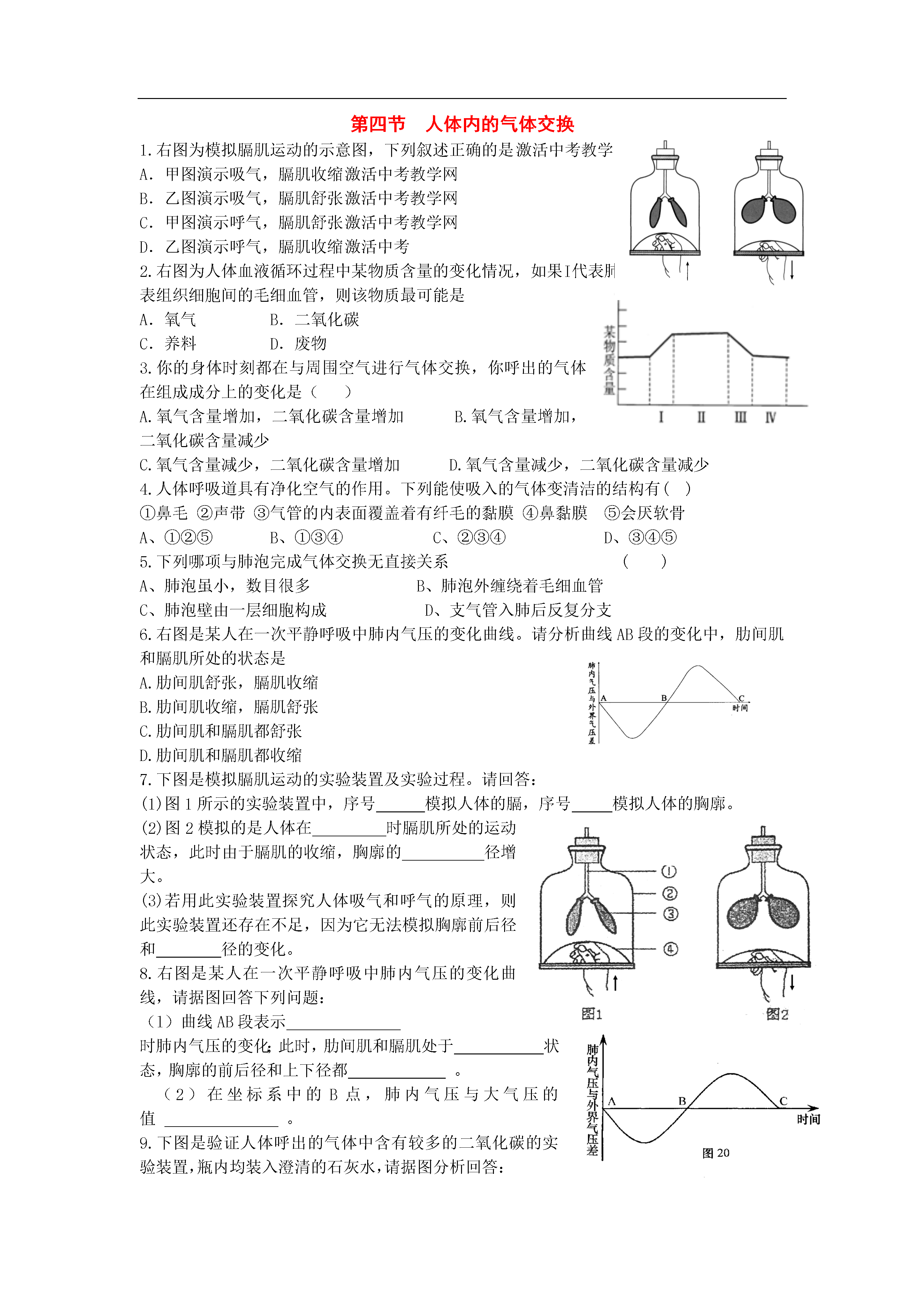 第四节人体内的气体交换甲乙模拟膈肌运动1.右图为模拟膈肌运动的示意图,下列叙述正确的是激活中考教学网A.甲图演示吸气,膈肌收缩激活中考教学网B.乙图演示吸气,膈肌舒张激活中考教学网C.甲图演示呼气,膈肌舒张激活中考教学网D.乙图演示呼气,膈肌收缩激活中考2.右图为人体血液循环过程中某物质含量的变化情况,如果I代表肺泡问的毛细血管,Ⅲ代表组织细胞间的毛细血管,则该物质最可能是A.氧气B.二氧化碳C.养料D.废物3.你的身体时刻都在与周围空气进行气体交换,你呼出的气体在组成成分上的变化是()A.氧气含量增加,二氧化碳含量增加B.氧气含量增加,二氧化碳含量减少C.氧气含量减少,二氧化碳含量增加D.氧气含量减少,二氧化碳含量减少4.人体呼吸道具有净化空气的作用。下列能使吸入的气体变清洁的结构有()①鼻毛②声带③气管的内表面覆盖着有纤毛的黏膜④鼻黏膜⑤会厌软骨A、①②⑤B、①③④C、②③④D、③④⑤5.下列哪项与肺泡完成气体交换无直接关系()A、肺泡虽小,数目很多B、肺泡外缠绕着毛细血管C、肺泡壁由一层细胞构成D、支气管入肺后反复分支6.右图是某人在一次平静呼吸中肺内气压的变化曲线。请分析曲线AB段的变化中,肋间肌和膈肌所处的状态是A.肋间肌舒张,膈肌收缩B.肋间肌收缩,膈肌舒张C.肋间肌和膈肌都舒张D.肋间肌和膈肌都收缩7.下图是模拟膈肌运动的实验装置及实验过程。请回答:(1)图1所示的实验装置中,序号模拟人体的膈,序号模拟人体的胸廓。(2)图2模拟的是人体在时膈肌所处的运动状态,此时由于膈肌的收缩,胸廓的径增大。(3)若用此实验装置探究人体吸气和呼气的原理,则此实验装置还存在不足,因为它无法模拟胸廓前后径和径的变化。8.右图是某人在一次平静呼吸中肺内气压的变化曲线,请据图回答下列问题:(l)曲线AB段表示时肺内气压的变化;此时,肋间肌和膈肌处于状态,胸廓的前后径和上下径都。(2)在坐标系中的B点,肺内气压与大气压的值。9.下图是验证人体呼出的气体中含有较多的二氧化碳的实验装置,瓶内均装入澄清的石灰水,请据图分析回答:(1)如果吹气和吸气均选择弯管,在实验时,应向甲瓶,向乙瓶;(2)经向两瓶内分别吹气、吸气后,石灰水明显变浑浊的是瓶;(3)在本实验中,起对照作用的是瓶。10.右图是人体呼吸系统组成图,请据图回答问题:(1)人能嗅到各种气味,是因为上部黏膜内有接受气味刺激的嗅觉细胞。(2)既是气体的通道,也是食物的通道的是[]。(3)痰形成的部位是[]。(4)完成气体交换的重要场所是[]。参考答案1.C2.A3.C4.B5.D6.D7.(1)④②(2)吸气上下(3)左右8.(1)吸气收缩由小变大(2)相等9.(1)吹气吸气(2)甲(3)乙10.(1)鼻腔(2)[2]咽(3)[4]气管(4)[5]肺