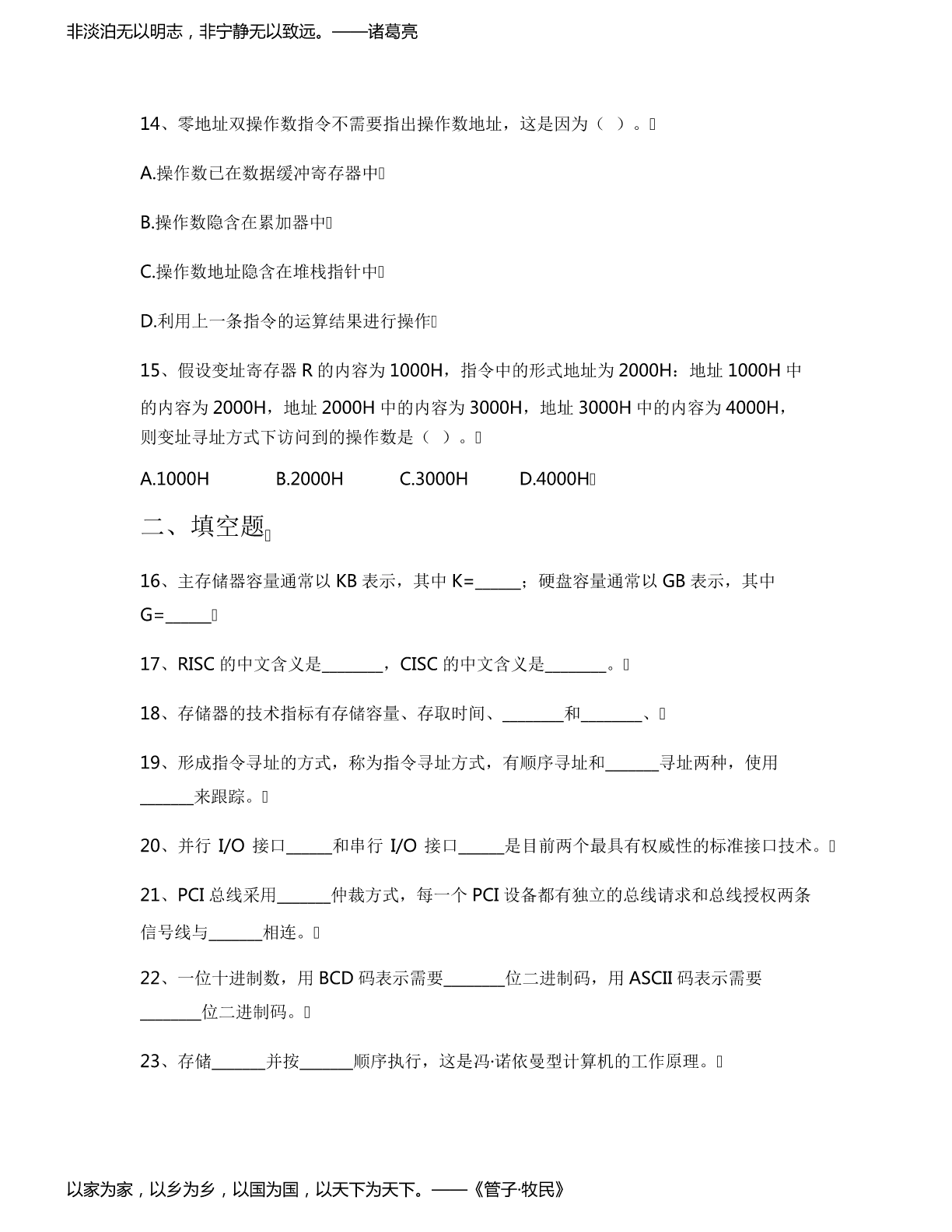 人不知而不愠,不亦君子乎?——《论语》 2022年西北工业大学计算机科学与技术专业《计算机组成原理》科目 期末试卷B(有答案) 一、选择题 1、采用指令Cache与数据Cache分离的主要目的是()。 A.降低Cache的缺失损失 B.提高Cache的命中率 C.降低CPU平均访存时间 D.减少指令流水线资源冲突 2、下述说法中正确的是()。 I.半导体RAM信息可读可写,且断电后仍能保持记忆 Ⅱ.动态RAM是易失性RAM,而静态RAM中的存储信息是不易失的 Ⅲ.半导体RAM是易失性RAM,但只要电源不断电,所存信息是不丢失的 IV.半导体RAM是非易失性的RAM A.I、ⅢB.只有ⅢC.Ⅱ、IVD.全错 3、在C语言程序中,以下程序段最终的f值为()。 Floatf=2.5+1e10;f=f-1e10; A.2.5B.250C.0D.3.5 4、float型数据通常用IEEE754标准中的单精度浮点数格式表示。如果编译器将float型 变量x分配在一个32位浮点寄存器FR1中,且x=-8.25,则FR1的内容是()。 A.C1040000HB.C2420000HC.C1840000HD.CIC20000H 5、关于浮点数在IEEE754标准中的规定,下列说法中错误的是()。 其身正,不令而行;其身不正,虽令不从。——《论语》 人之为学,不日进则日退,独学无友,则孤陋而难成;久处一方,则习染而不自觉。——《顾炎武》 I.浮点数可以表示正无穷大和负无穷大两个值 Ⅱ.如果需要,也允许使用非格式化的浮点数 Ⅲ.对任何形式的浮点数都要求使用隐藏位技术 IⅣ.对32位浮点数的阶码采用了偏移值为l27的移码表示,尾数用原码表示 6、一次总线事务中,主设备只需给出一个首地址,从设备就能从首地址开始的若干连续 单元读出或写入多个数据。这种总线事务方式称为()。 A.并行传输B.串行传输C.突发传输D.同步传输 7、按数据传送格式,总线常被划分为()。 A.并行总线与串行总线 B.同步总线与异步总线 C.系统总线与外总线 D.存储总线与I/O总线 8、指令寄存器的位数取决()。 A.存储器的容量B.指令字长C.机器字长人D.存储字长 9、某计算机主频为1.2GHz,其指令分为4类,它们在基准程序中所占比例及CPI如下表所示。该机的 MIPS数是()。 A.100B.200C.400D.600 10、下列操作中,不属于“中断隐指令”所完成的是()。 良辰美景奈何天,便赏心乐事谁家院。则为你如花美眷,似水流年。——《汤显祖》 人之为学,不日进则日退,独学无友,则孤陋而难成;久处一方,则习染而不自觉。——《顾炎武》 I.关中断 II.开中断 III.保护现场 IV.保存断点 V.将中断服务程序首地址送PC A.I,IIB.II,III,VC.II,IIID.III,V 11、隐指令指()。 A.操作数隐含在操作码中的指令 B.在一个机器周期里完成全部操作的指令 C.隐含地址码的指令 D.指令系统中没有的指令 12、微指令大体可分为两类:水平型微指令和垂直型微指令。下列几项中,不符合水平型 微指令特点的是()。 A.执行速度快 B.并行度较低 C.更多地体现了控制器的硬件细节 D.微指令长度较长 13、某指令格式如下所示。 OPMID 其中M为寻址方式,I为变址寄存器编号,D为形式地址。若采用先变址后间址的 寻址方式,则操作数的有效地址是()。 A.I+DB.(I)+DC.((I)+D)D.((I))+D 我尽一杯,与君发三愿:一愿世清平,二愿身强健,三愿临老头,数与君相见。——《白居易》 非淡泊无以明志,非宁静无以致远。——诸葛亮 14、零地址双操作数指令不需要指出操作数地址,这是因为()。 A.操作数已在数据缓冲寄存器中 B.操作数隐含在累加器中 C.操作数地址隐含在堆栈指针中 D.利用上一条指令的运算结果进行操作 15、假设变址寄存器R的内容为1000H,指令中的形式地址为2000H:地址1000H中 的内容为2000H,地址2000H中的内容为3000H,地址3000H中的内容为4000H, 则变址寻址方式下访问到的操作数是()。 A.1000HB.2000HC.3000HD.4000H 二、填空题 16、主存储器容量通常以KB表示,其中K=______;硬盘容量通常以GB表示,其中 G=______ 17、RISC的中文含义是________,CISC的中文含义是________。 18、存储器的技术指标有存储容量、存取时间、________和________、 19、形成指令