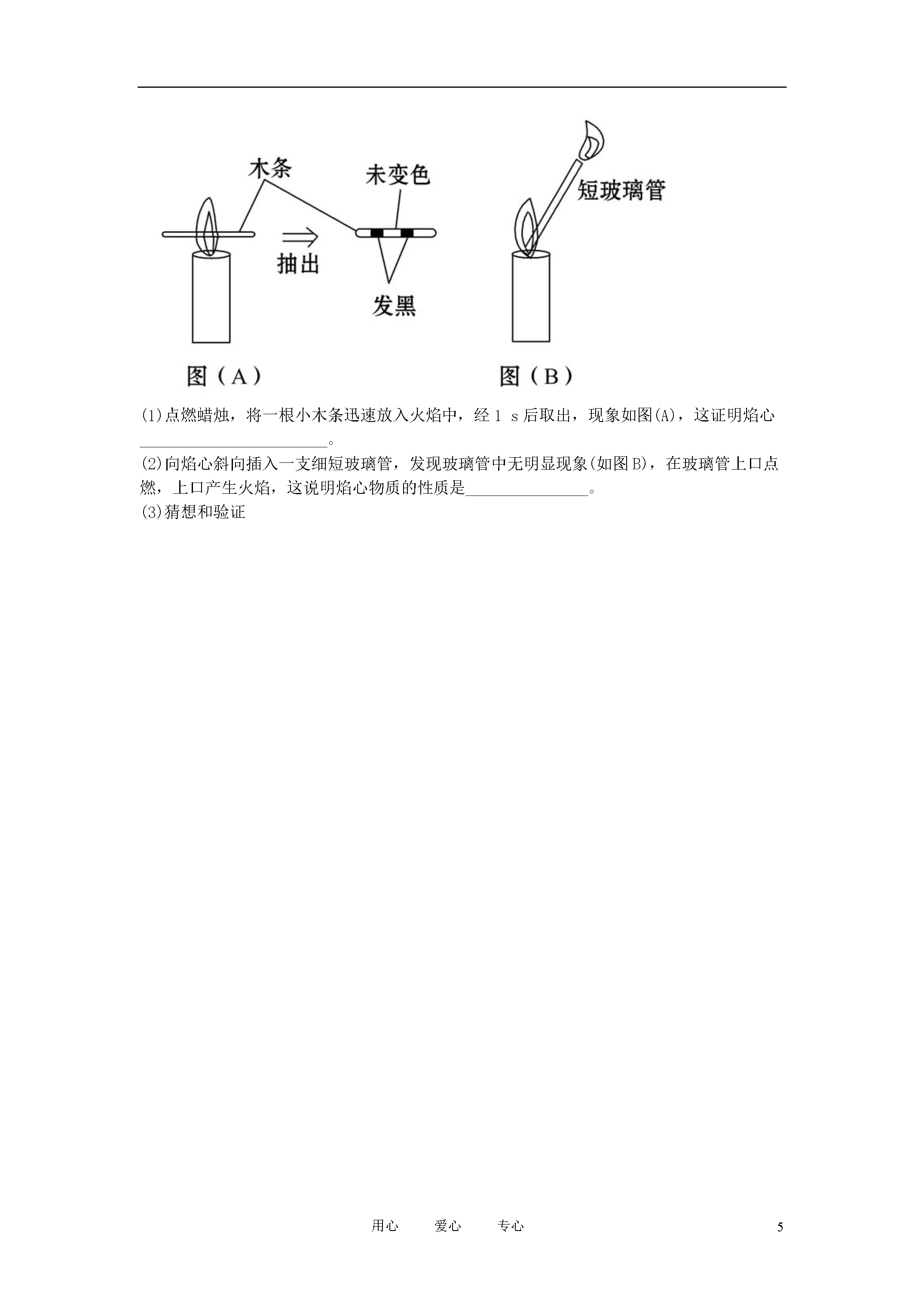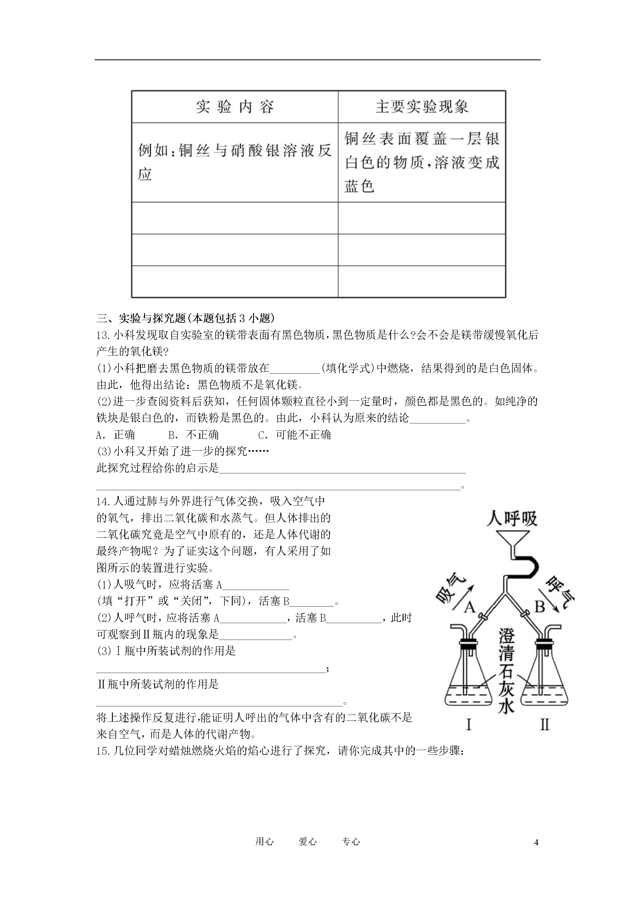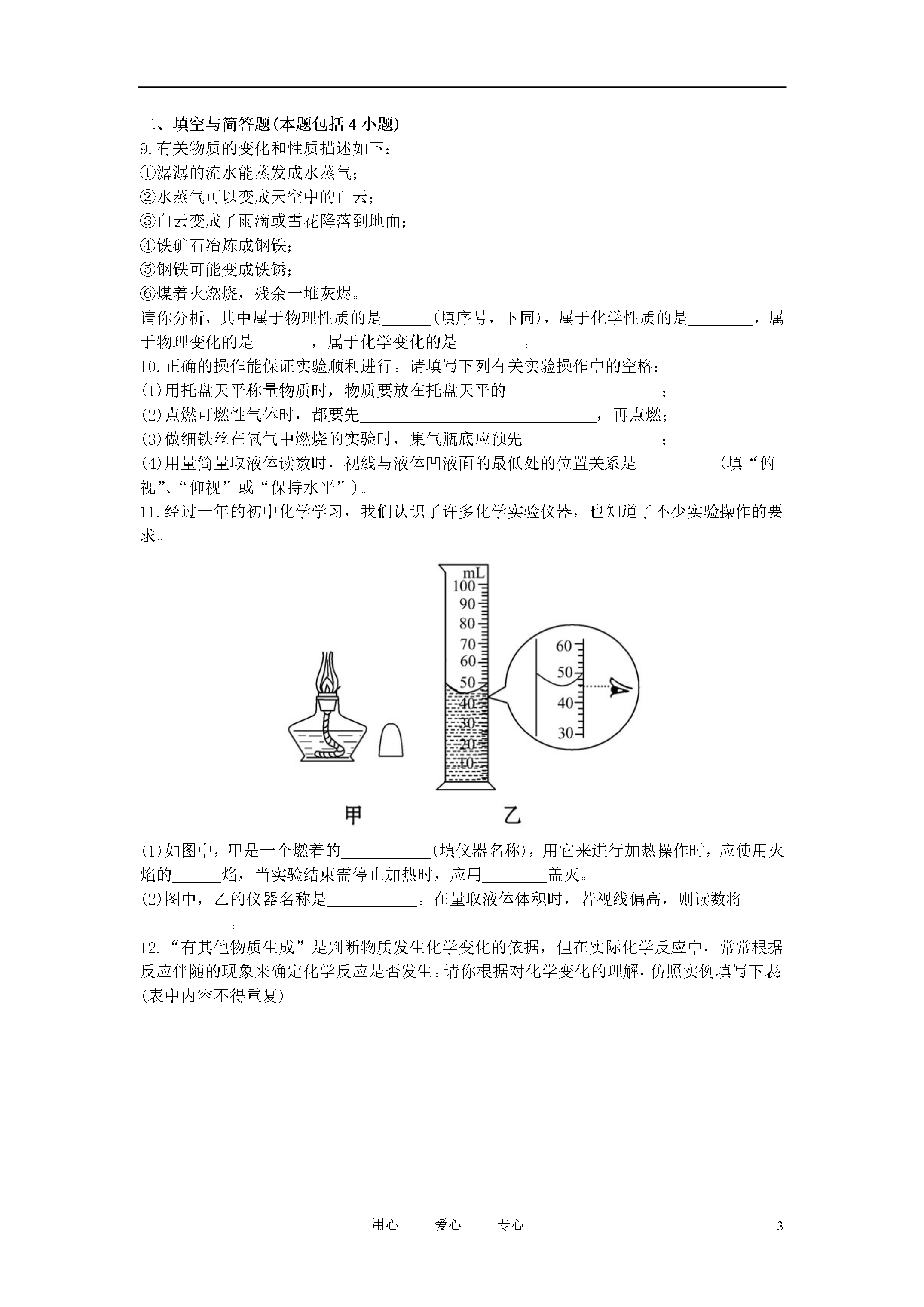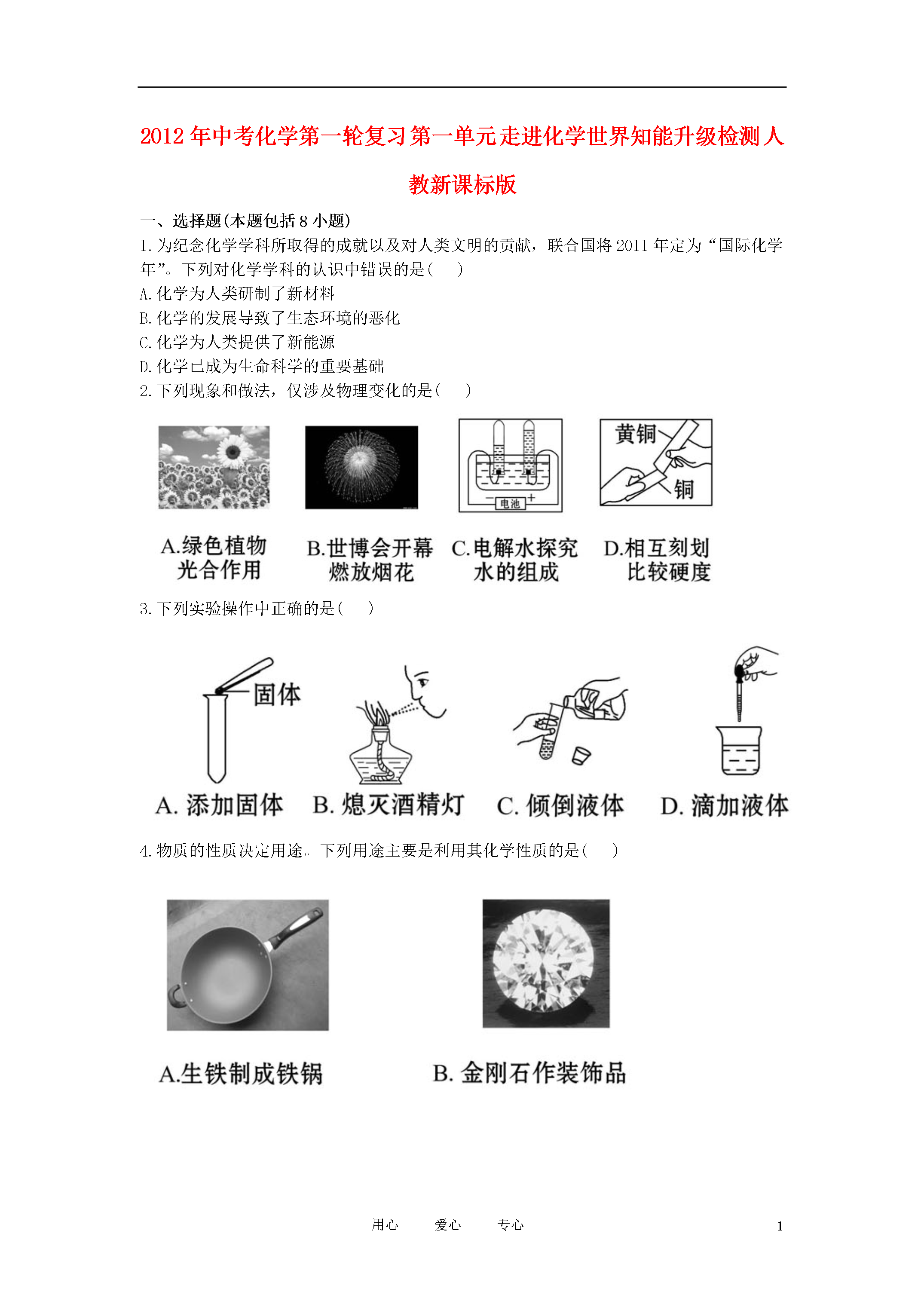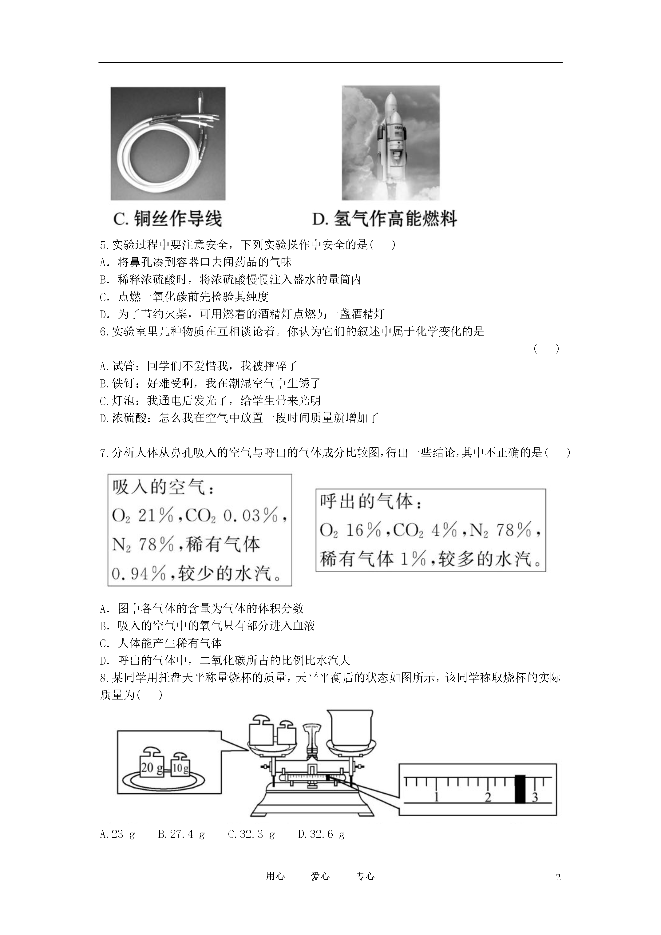 8用心爱心专心2012年中考化学第一轮复习第一单元走进化学世界知能升级检测人教新课标版一、选择题(本题包括8小题)1.为纪念化学学科所取得的成就以及对人类文明的贡献,联合国将2011年定为“国际化学年”。下列对化学学科的认识中错误的是()A.化学为人类研制了新材料B.化学的发展导致了生态环境的恶化C.化学为人类提供了新能源D.化学已成为生命科学的重要基础2.下列现象和做法,仅涉及物理变化的是()3.下列实验操作中正确的是()4.物质的性质决定用途。下列用途主要是利用其化学性质的是()5.实验过程中要注意安全,下列实验操作中安全的是()A.将鼻孔凑到容器口去闻药品的气味B.稀释浓硫酸时,将浓硫酸慢慢注入盛水的量筒内C.点燃一氧化碳前先检验其纯度D.为了节约火柴,可用燃着的酒精灯点燃另一盏酒精灯6.实验室里几种物质在互相谈论着。你认为它们的叙述中属于化学变化的是()A.试管:同学们不爱惜我,我被摔碎了B.铁钉:好难受啊,我在潮湿空气中生锈了C.灯泡:我通电后发光了,给学生带来光明D.浓硫酸:怎么我在空气中放置一段时间质量就增加了7.分析人体从鼻孔吸入的空气与呼出的气体成分比较图,得出一些结论,其中不正确的是()A.图中各气体的含量为气体的体积分数B.吸入的空气中的氧气只有部分进入血液C.人体能产生稀有气体D.呼出的气体中,二氧化碳所占的比例比水汽大8.某同学用托盘天平称量烧杯的质量,天平平衡后的状态如图所示,该同学称取烧杯的实际质量为()A.23gB.27.4gC.32.3gD.32.6g二、填空与简答题(本题包括4小题)9.有关物质的变化和性质描述如下:①潺潺的流水能蒸发成水蒸气;②水蒸气可以变成天空中的白云;③白云变成了雨滴或雪花降落到地面;④铁矿石冶炼成钢铁;⑤钢铁可能变成铁锈;⑥煤着火燃烧,残余一堆灰烬。请你分析,其中属于物理性质的是______(填序号,下同),属于化学性质的是________,属于物理变化的是_______,属于化学变化的是________。10.正确的操作能保证实验顺利进行。请填写下列有关实验操作中的空格:(1)用托盘天平称量物质时,物质要放在托盘天平的___________________;(2)点燃可燃性气体时,都要先_____________________________,再点燃;(3)做细铁丝在氧气中燃烧的实验时,集气瓶底应预先_________________;(4)用量筒量取液体读数时,视线与液体凹液面的最低处的位置关系是__________(填“俯视”、“仰视”或“保持水平”)。11.经过一年的初中化学学习,我们认识了许多化学实验仪器,也知道了不少实验操作的要求。(1)如图中,甲是一个燃着的___________(填仪器名称),用它来进行加热操作时,应使用火焰的______焰,当实验结束需停止加热时,应用________盖灭。(2)图中,乙的仪器名称是___________。在量取液体体积时,若视线偏高,则读数将___________。12.“有其他物质生成”是判断物质发生化学变化的依据,但在实际化学反应中,常常根据反应伴随的现象来确定化学反应是否发生。请你根据对化学变化的理解,仿照实例填写下表:(表中内容不得重复)三、实验与探究题(本题包括3小题)13.小科发现取自实验室的镁带表面有黑色物质,黑色物质是什么?会不会是镁带缓慢氧化后产生的氧化镁?(1)小科把磨去黑色物质的镁带放在_________(填化学式)中燃烧,结果得到的是白色固体。由此,他得出结论:黑色物质不是氧化镁。(2)进一步查阅资料后获知,任何固体颗粒直径小到一定量时,颜色都是黑色的。如纯净的铁块是银白色的,而铁粉是黑色的。由此,小科认为原来的结论__________。A.正确B.不正确C.可能不正确(3)小科又开始了进一步的探究……此探究过程给你的启示是_____________________________________________________________________________________________________________。14.人通过肺与外界进行气体交换,吸入空气中的氧气,排出二氧化碳和水蒸气。但人体排出的二氧化碳究竟是空气中原有的,还是人体代谢的最终产物呢?为了证实这个问题,有人采用了如图所示的装置进行实验。(1)人吸气时,应将活塞A____________(填“打开”或“关闭”,下同),活塞B________。(2)人呼气时,应将活塞A____________,活塞B__________,此时可观察到Ⅱ瓶内的现象是_____________。(3)Ⅰ瓶中所装试剂的作用是_________________________________________;Ⅱ瓶中所装试剂的作