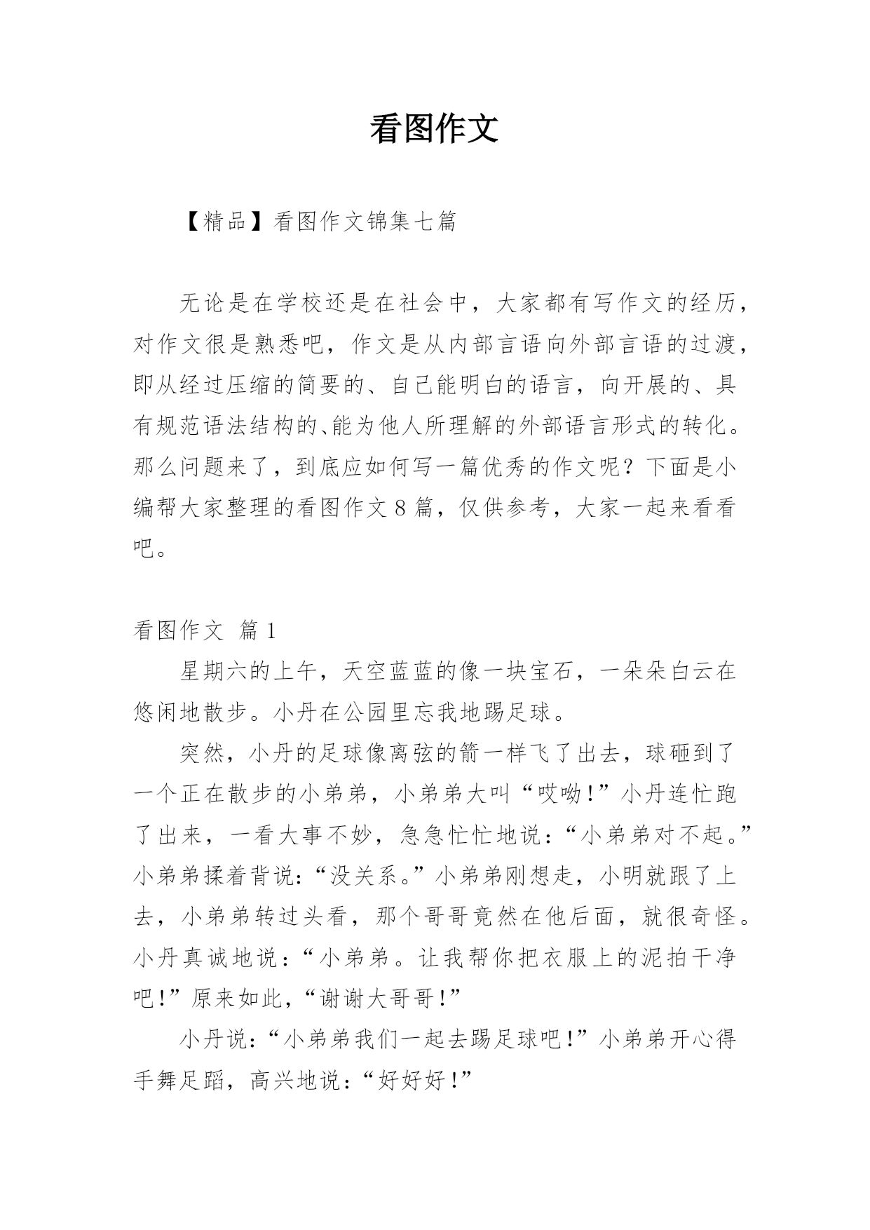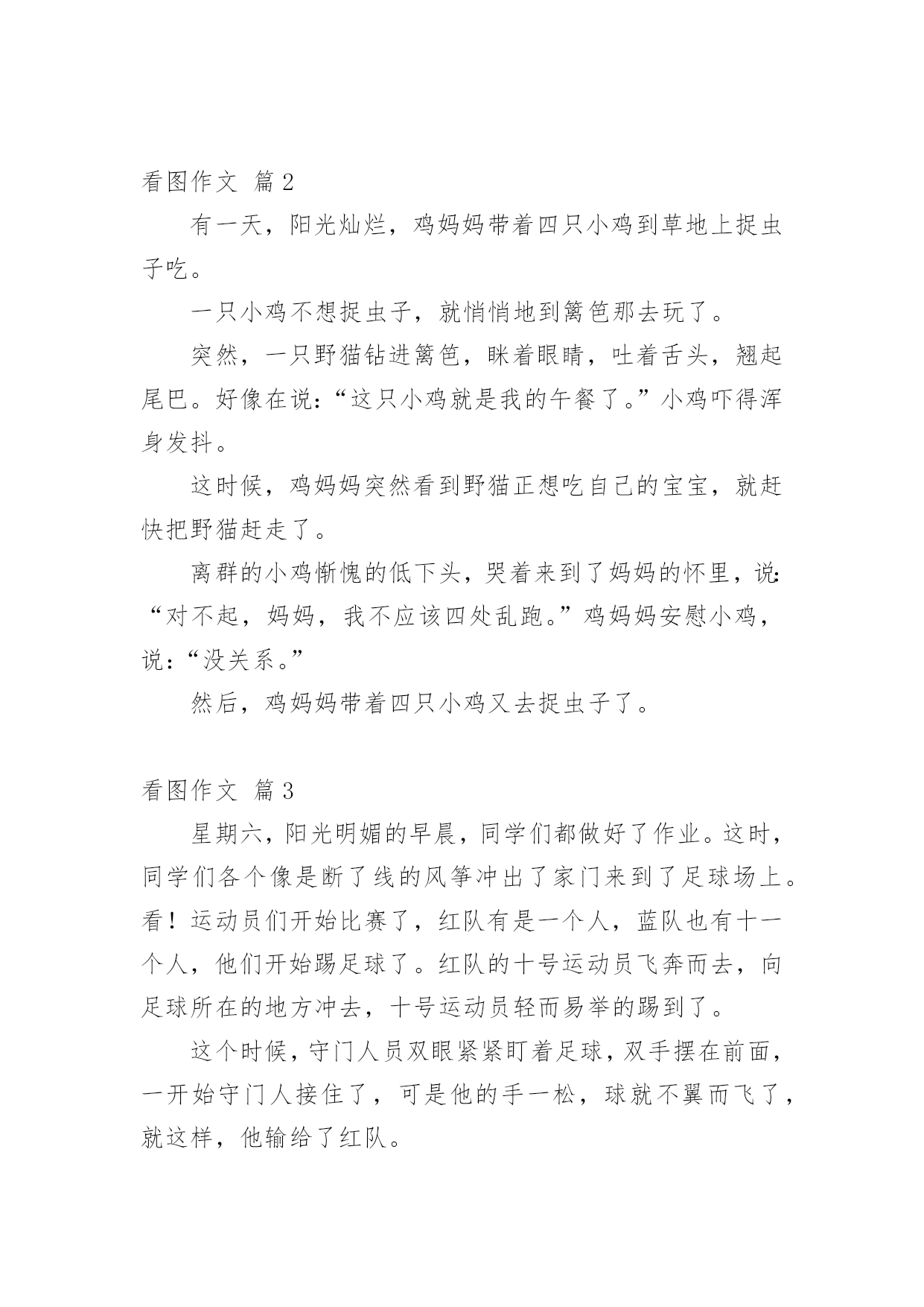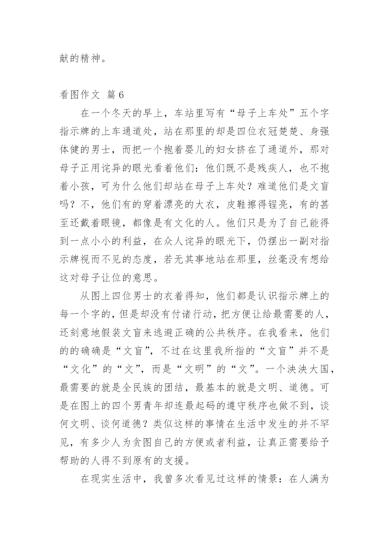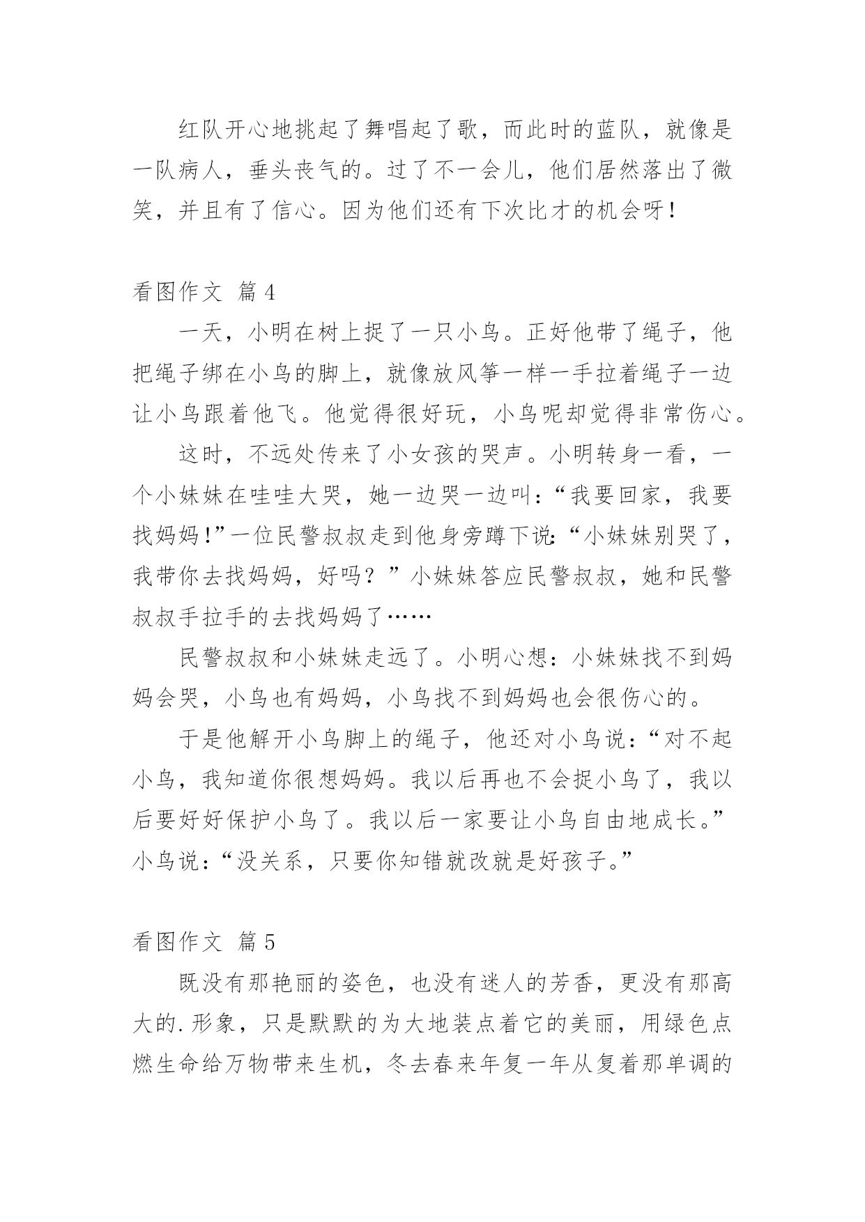 看图作文 【精品】看图作文锦集七篇无论是在学校还是在社会中,大家都有写作文的经历,对作文很是熟悉吧,作文是从内部言语向外部言语的过渡,即从经过压缩的简要的、自己能明白的语言,向开展的、具有规范语法结构的、能为他人所理解的外部语言形式的转化。那么问题来了,到底应如何写一篇优秀的作文呢?下面是小编帮大家整理的看图作文8篇,仅供参考,大家一起来看看吧。看图作文篇1星期六的上午,天空蓝蓝的像一块宝石,一朵朵白云在悠闲地散步。小丹在公园里忘我地踢足球。突然,小丹的足球像离弦的箭一样飞了出去,球砸到了一个正在散步的小弟弟,小弟弟大叫“哎呦!”小丹连忙跑了出来,一看大事不妙,急急忙忙地说:“小弟弟对不起。”小弟弟揉着背说:“没关系。”小弟弟刚想走,小明就跟了上去,小弟弟转过头看,那个哥哥竟然在他后面,就很奇怪。小丹真诚地说:“小弟弟。让我帮你把衣服上的泥拍干净吧!”原来如此,“谢谢大哥哥!”小丹说:“小弟弟我们一起去踢足球吧!”小弟弟开心得手舞足蹈,高兴地说:“好好好!”看图作文篇2有一天,阳光灿烂,鸡妈妈带着四只小鸡到草地上捉虫子吃。一只小鸡不想捉虫子,就悄悄地到篱笆那去玩了。突然,一只野猫钻进篱笆,眯着眼睛,吐着舌头,翘起尾巴。好像在说:“这只小鸡就是我的午餐了。”小鸡吓得浑身发抖。这时候,鸡妈妈突然看到野猫正想吃自己的宝宝,就赶快把野猫赶走了。离群的小鸡惭愧的低下头,哭着来到了妈妈的怀里,说:“对不起,妈妈,我不应该四处乱跑。”鸡妈妈安慰小鸡,说:“没关系。”然后,鸡妈妈带着四只小鸡又去捉虫子了。看图作文篇3星期六,阳光明媚的早晨,同学们都做好了作业。这时,同学们各个像是断了线的风筝冲出了家门来到了足球场上。看!运动员们开始比赛了,红队有是一个人,蓝队也有十一个人,他们开始踢足球了。红队的十号运动员飞奔而去,向足球所在的地方冲去,十号运动员轻而易举的踢到了。这个时候,守门人员双眼紧紧盯着足球,双手摆在前面,一开始守门人接住了,可是他的手一松,球就不翼而飞了,就这样,他输给了红队。红队开心地挑起了舞唱起了歌,而此时的蓝队,就像是一队病人,垂头丧气的。过了不一会儿,他们居然落出了微笑,并且有了信心。因为他们还有下次比才的机会呀!看图作文篇4一天,小明在树上捉了一只小鸟。正好他带了绳子,他把绳子绑在小鸟的脚上,就像放风筝一样一手拉着绳子一边让小鸟跟着他飞。他觉得很好玩,小鸟呢却觉得非常伤心。这时,不远处传来了小女孩的哭声。小明转身一看,一个小妹妹在哇哇大哭,她一边哭一边叫:“我要回家,我要找妈妈!”一位民警叔叔走到他身旁蹲下说:“小妹妹别哭了,我带你去找妈妈,好吗?”小妹妹答应民警叔叔,她和民警叔叔手拉手的去找妈妈了……民警叔叔和小妹妹走远了。小明心想:小妹妹找不到妈妈会哭,小鸟也有妈妈,小鸟找不到妈妈也会很伤心的。于是他解开小鸟脚上的绳子,他还对小鸟说:“对不起小鸟,我知道你很想妈妈。我以后再也不会捉小鸟了,我以后要好好保护小鸟了。我以后一家要让小鸟自由地成长。”小鸟说:“没关系,只要你知错就改就是好孩子。”看图作文篇5既没有那艳丽的姿色,也没有迷人的芳香,更没有那高大的.形象,只是默默的为大地装点着它的美丽,用绿色点燃生命给万物带来生机,冬去春来年复一年从复着那单调的生命,那就是默默无闻的小草。仰慕回首,曾经在童年的时代,总喜欢在草地上玩耍,那小草成为了那童年的伙伴,那草地成为童年的乐园,是小草编织了一个又一个美丽童年的梦。造就了一个个飘渺的遐想。在茫茫的草地,在崎岖的田间地头,小草是那牛羊口中的美食,小草没有逃避,却在阵阵微风下,悠悠荡荡微笑点头,全任凭牛羊那口中之刀层层宰割,脚下的铁蹄步步践踏,你却无怨无悔,以他人的满足成为自己的快乐。在狂风暴雨的摧残下,不怕倒下,以坚强毅力顶过了风雨,风雨阻当不了造就了你那不屈不饶的性格,改变不了热爱生命的勇气。在寒冷的季节,你那生命之根深深的扎在那生命的沃土里,在寒霜的侵蚀,冰雪的无情,虽然毁去了你那绿色容颜,美丽的青春。却毁不了你那渴望生命的毅力篱篱原上草,一岁一枯容,野火烧不尽,春风吹又生。小草具有那顽强的生命力。无论在阳光的明媚的旷野,还是在冰凉的阴暗的角落,都离不开你的成在,在美丽花从中你不去张扬,在明媚旷野里你不去展示,在阴暗的角落你不会抱怨,在默默的编织着他人美丽的梦。无时为刻不在我们身边的小草,而却没有人理会,也没有人来爱护他,更没有人珍惜他,更多的是被他人的践踏与摧残。小草却无怨无悔的面对所有的一切。小草我赞美你,你那高尚宽容的情操。热爱生命的毅力,无私奉献的精神。看图作文篇6在一个冬天的早上,车站里写有“母子上车处”五个字指示牌的上车通道处,站在那里的却是四位衣冠楚楚、身强体健的男士,而把一个抱着婴儿的妇女挤在了通道外,那对母子正用诧异的眼光看着他们:他们既不是残疾人,也不抱