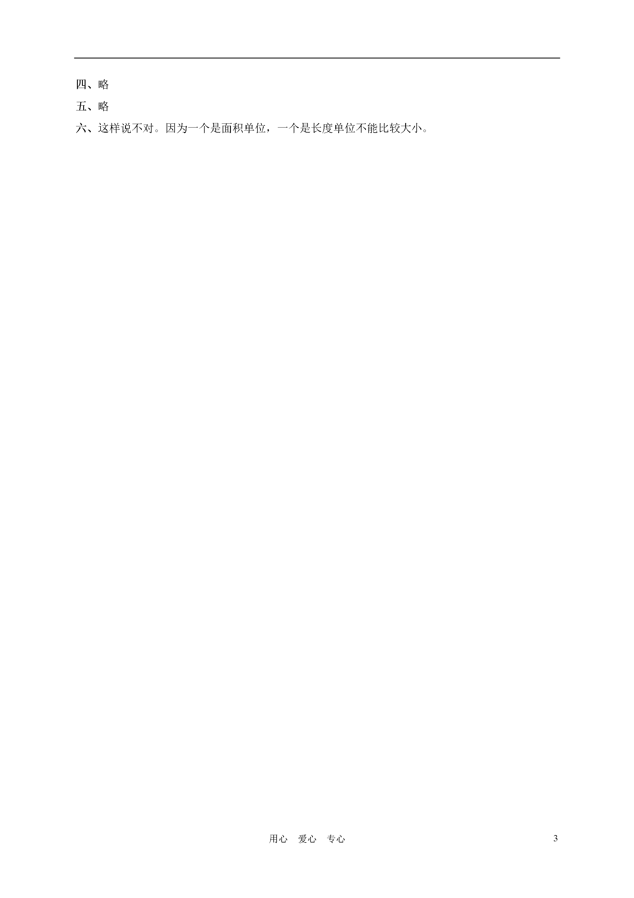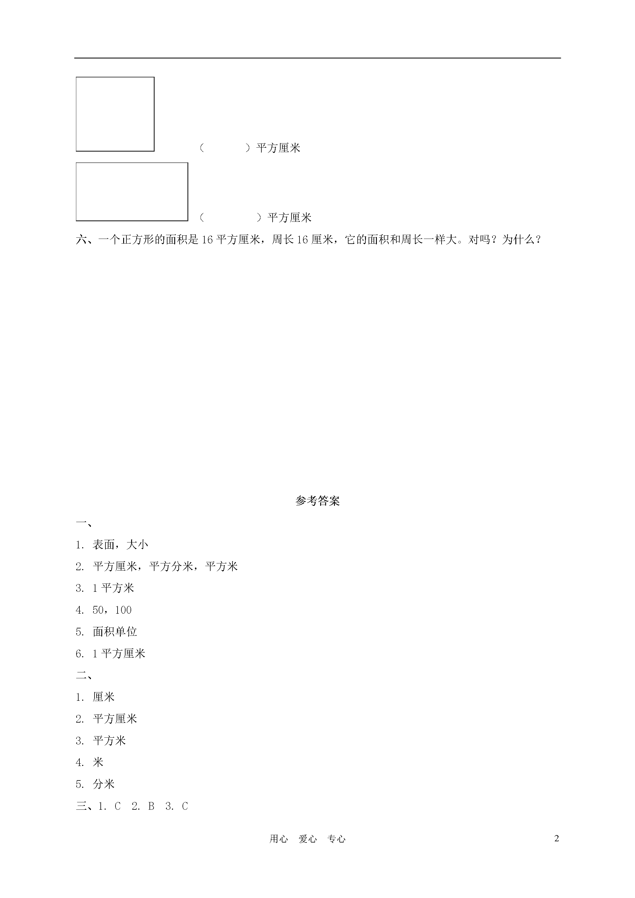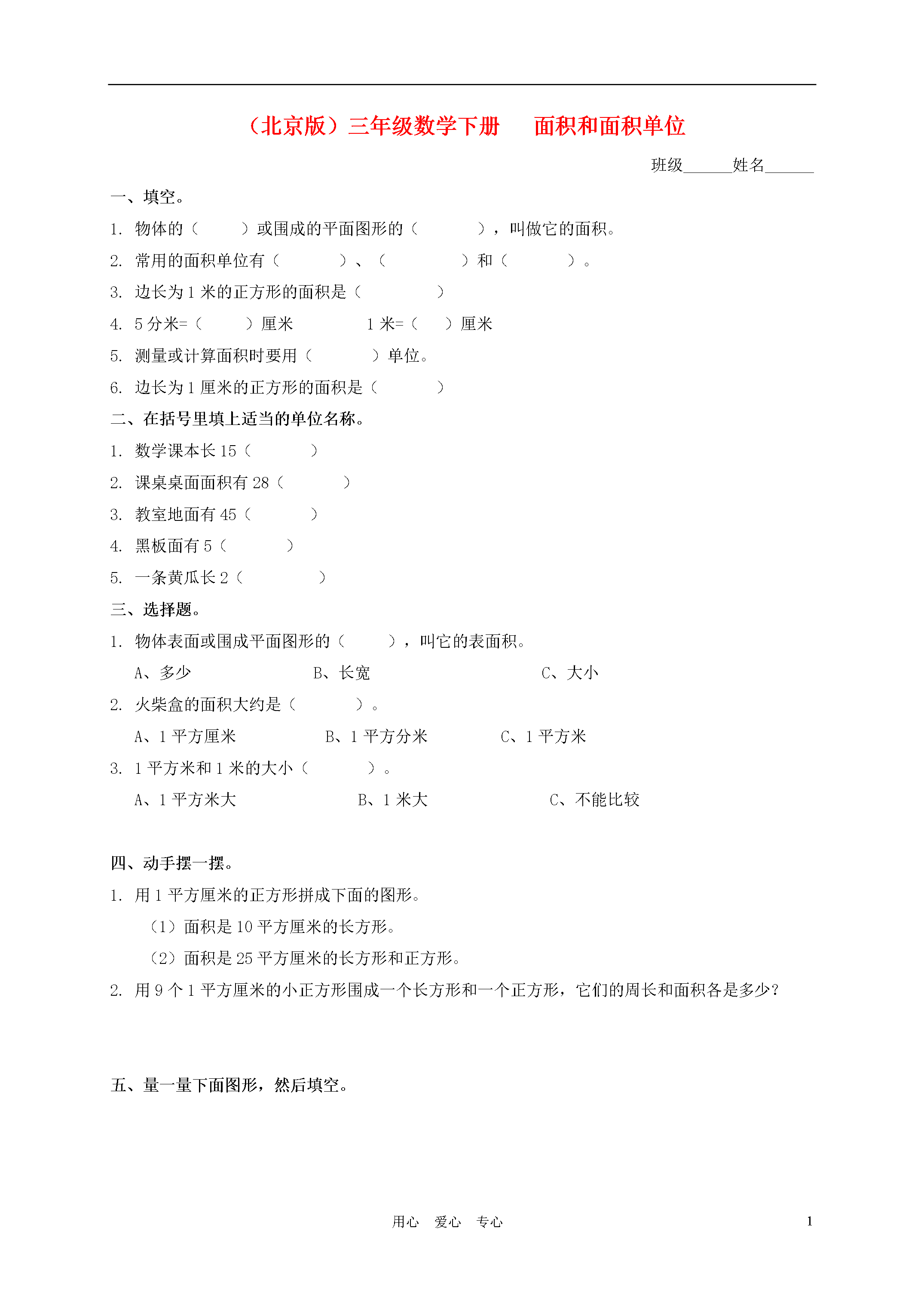3用心爱心专心(北京版)三年级数学下册面积和面积单位班级______姓名______一、填空。1.物体的()或围成的平面图形的(),叫做它的面积。2.常用的面积单位有()、()和()。3.边长为1米的正方形的面积是()4.5分米=()厘米1米=()厘米5.测量或计算面积时要用()单位。6.边长为1厘米的正方形的面积是()二、在括号里填上适当的单位名称。1.数学课本长15()2.课桌桌面面积有28()3.教室地面有45()4.黑板面有5()5.一条黄瓜长2()三、选择题。1.物体表面或围成平面图形的(),叫它的表面积。A、多少B、长宽C、大小2.火柴盒的面积大约是()。A、1平方厘米B、1平方分米C、1平方米3.1平方米和1米的大小()。A、1平方米大B、1米大C、不能比较四、动手摆一摆。1.用1平方厘米的正方形拼成下面的图形。(1)面积是10平方厘米的长方形。(2)面积是25平方厘米的长方形和正方形。2.用9个1平方厘米的小正方形围成一个长方形和一个正方形,它们的周长和面积各是多少?五、量一量下面图形,然后填空。()平方厘米()平方厘米六、一个正方形的面积是16平方厘米,周长16厘米,它的面积和周长一样大。对吗?为什么?参考答案一、1.表面,大小2.平方厘米,平方分米,平方米3.1平方米4.50,1005.面积单位6.1平方厘米二、1.厘米2.平方厘米3.平方米4.米5.分米三、1.C2.B3.C四、略五、略六、这样说不对。因为一个是面积单位,一个是长度单位不能比较大小。