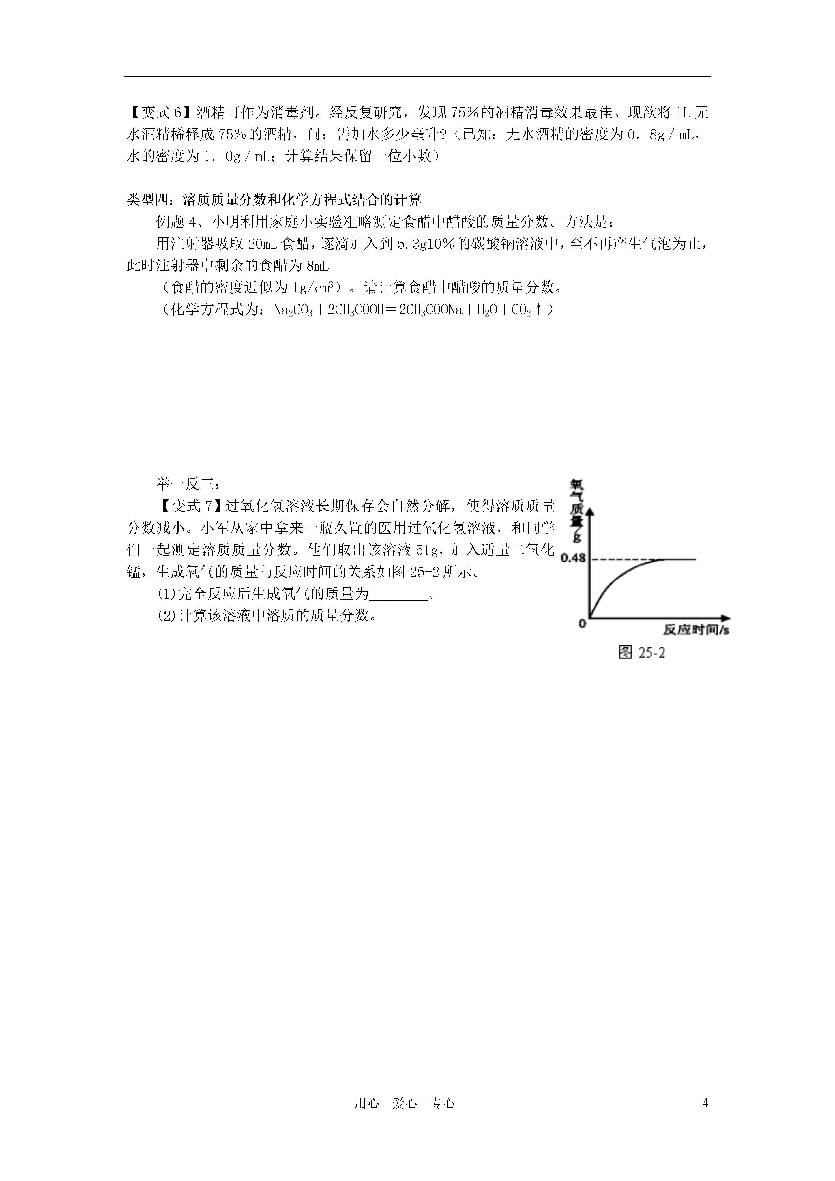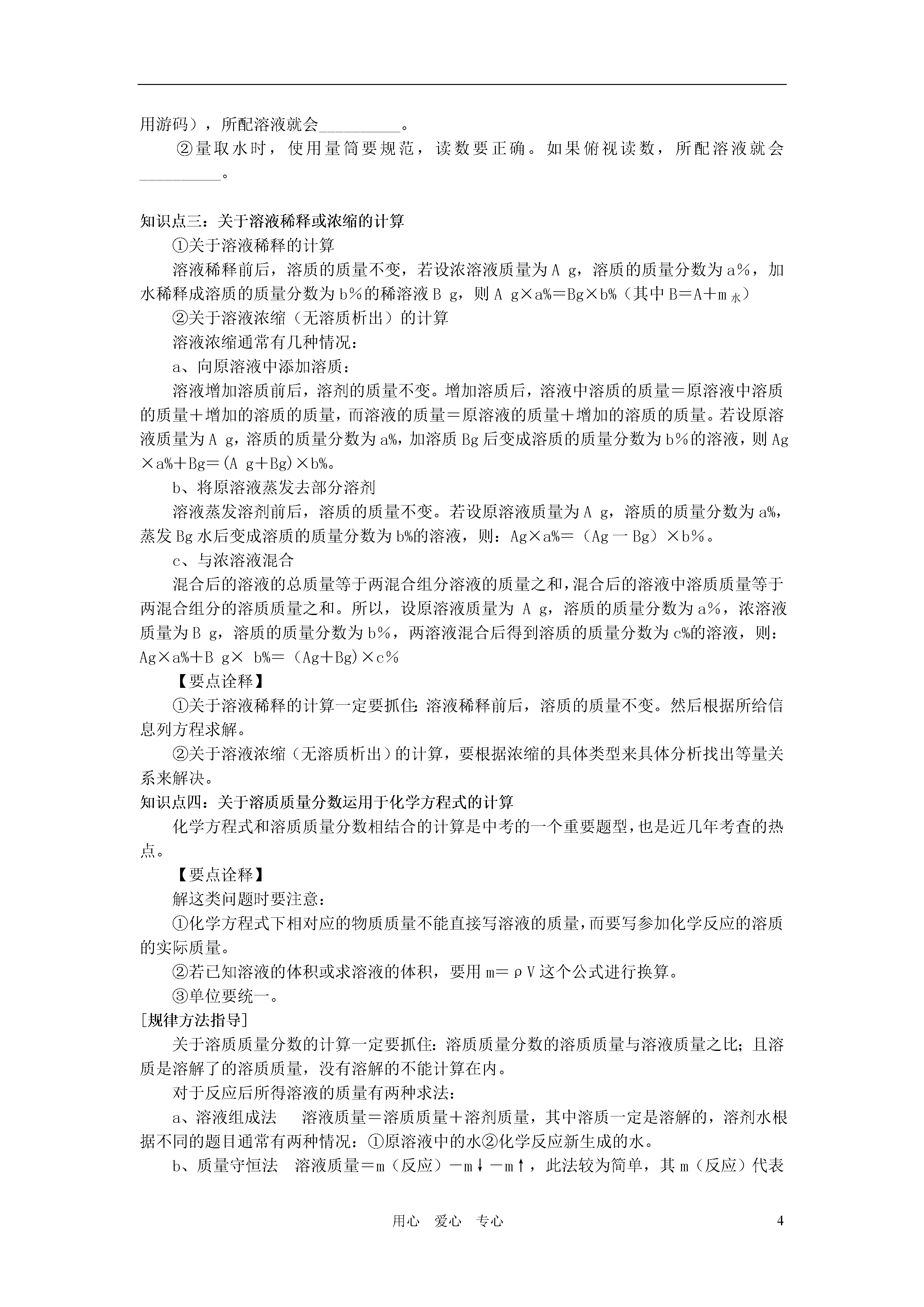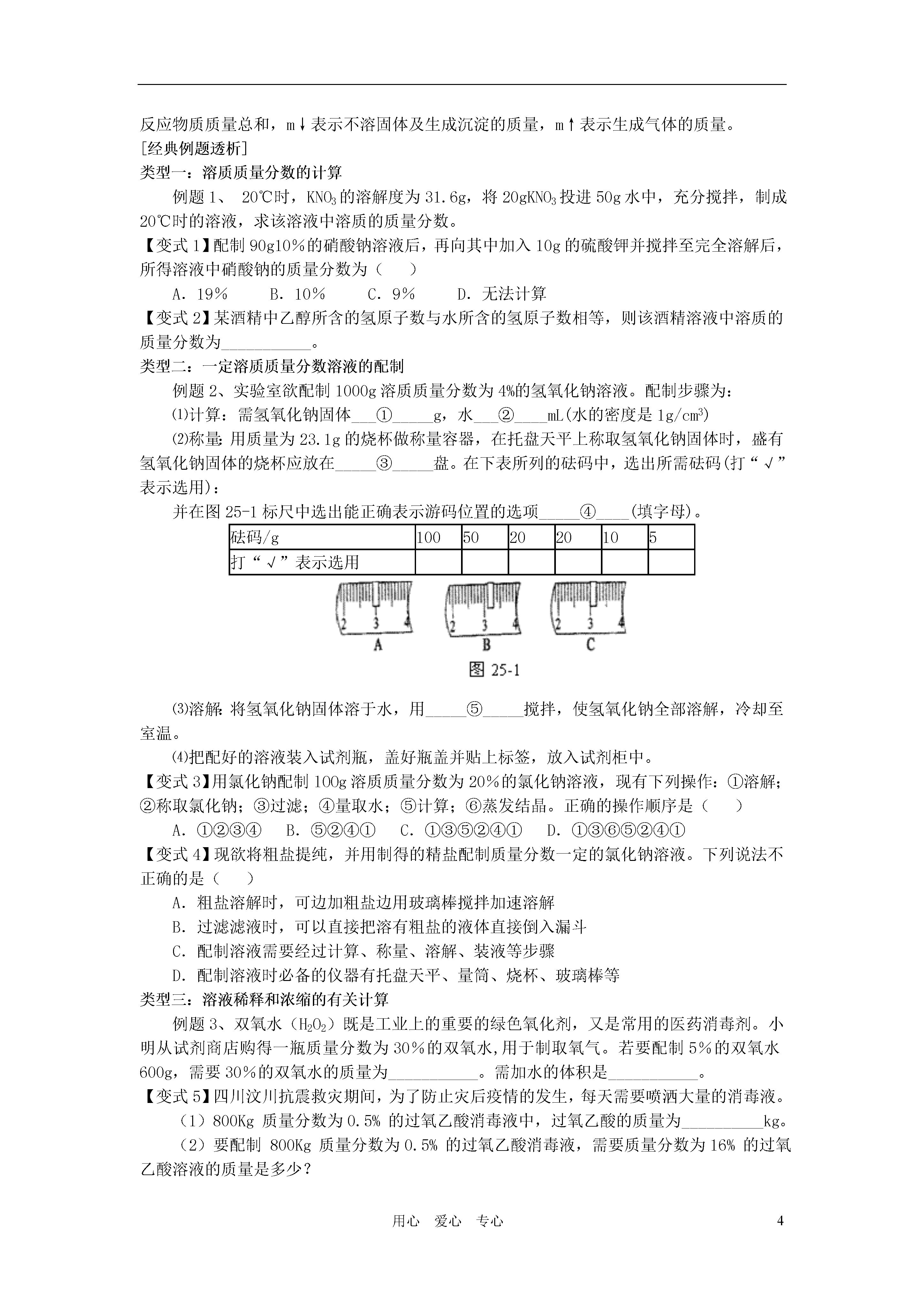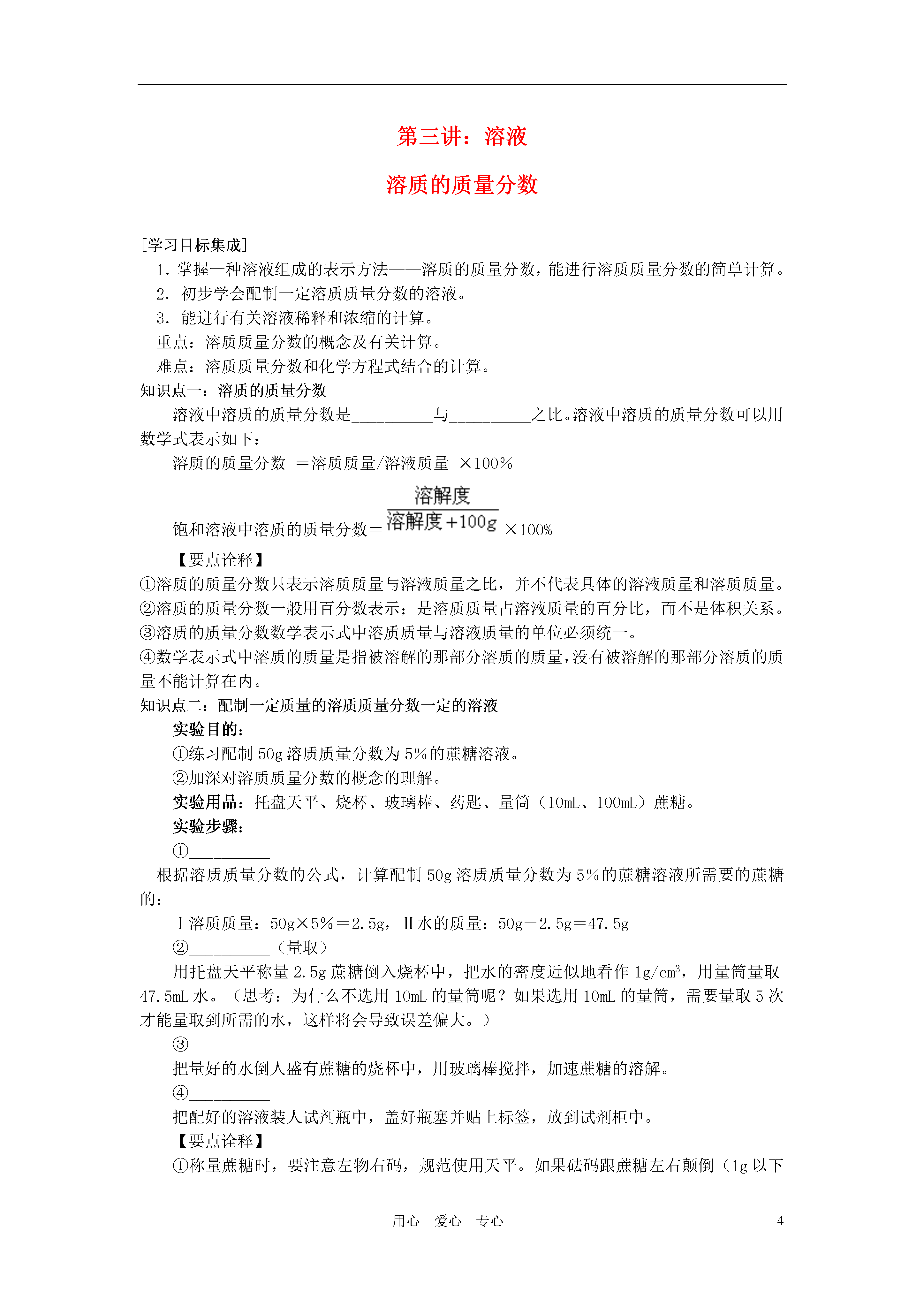 4用心爱心专心第三讲:溶液溶质的质量分数[学习目标集成]1.掌握一种溶液组成的表示方法——溶质的质量分数,能进行溶质质量分数的简单计算。2.初步学会配制一定溶质质量分数的溶液。3.能进行有关溶液稀释和浓缩的计算。重点:溶质质量分数的概念及有关计算。难点:溶质质量分数和化学方程式结合的计算。知识点一:溶质的质量分数溶液中溶质的质量分数是__________与__________之比。溶液中溶质的质量分数可以用数学式表示如下:溶质的质量分数=溶质质量/溶液质量×100%饱和溶液中溶质的质量分数=×100%【要点诠释】①溶质的质量分数只表示溶质质量与溶液质量之比,并不代表具体的溶液质量和溶质质量。②溶质的质量分数一般用百分数表示;是溶质质量占溶液质量的百分比,而不是体积关系。③溶质的质量分数数学表示式中溶质质量与溶液质量的单位必须统一。④数学表示式中溶质的质量是指被溶解的那部分溶质的质量,没有被溶解的那部分溶质的质量不能计算在内。知识点二:配制一定质量的溶质质量分数一定的溶液实验目的:①练习配制50g溶质质量分数为5%的蔗糖溶液。②加深对溶质质量分数的概念的理解。实验用品:托盘天平、烧杯、玻璃棒、药匙、量筒(10mL、100mL)蔗糖。实验步骤:①__________根据溶质质量分数的公式,计算配制50g溶质质量分数为5%的蔗糖溶液所需要的蔗糖的:Ⅰ溶质质量:50g×5%=2.5g,Ⅱ水的质量:50g-2.5g=47.5g②__________(量取)用托盘天平称量2.5g蔗糖倒入烧杯中,把水的密度近似地看作1g/cm3,用量筒量取47.5mL水。(思考:为什么不选用10mL的量筒呢?如果选用10mL的量筒,需要量取5次才能量取到所需的水,这样将会导致误差偏大。)③__________把量好的水倒人盛有蔗糖的烧杯中,用玻璃棒搅拌,加速蔗糖的溶解。④__________把配好的溶液装人试剂瓶中,盖好瓶塞并贴上标签,放到试剂柜中。【要点诠释】①称量蔗糖时,要注意左物右码,规范使用天平。如果砝码跟蔗糖左右颠倒(1g以下用游码),所配溶液就会__________。②量取水时,使用量筒要规范,读数要正确。如果俯视读数,所配溶液就会__________。知识点三:关于溶液稀释或浓缩的计算①关于溶液稀释的计算溶液稀释前后,溶质的质量不变,若设浓溶液质量为Ag,溶质的质量分数为a%,加水稀释成溶质的质量分数为b%的稀溶液Bg,则Ag×a%=Bg×b%(其中B=A+m水)②关于溶液浓缩(无溶质析出)的计算溶液浓缩通常有几种情况:a、向原溶液中添加溶质:溶液增加溶质前后,溶剂的质量不变。增加溶质后,溶液中溶质的质量=原溶液中溶质的质量+增加的溶质的质量,而溶液的质量=原溶液的质量+增加的溶质的质量。若设原溶液质量为Ag,溶质的质量分数为a%,加溶质Bg后变成溶质的质量分数为b%的溶液,则Ag×a%+Bg=(Ag+Bg)×b%。b、将原溶液蒸发去部分溶剂溶液蒸发溶剂前后,溶质的质量不变。若设原溶液质量为Ag,溶质的质量分数为a%,蒸发Bg水后变成溶质的质量分数为b%的溶液,则:Ag×a%=(Ag一Bg)×b%。c、与浓溶液混合混合后的溶液的总质量等于两混合组分溶液的质量之和,混合后的溶液中溶质质量等于两混合组分的溶质质量之和。所以,设原溶液质量为Ag,溶质的质量分数为a%,浓溶液质量为Bg,溶质的质量分数为b%,两溶液混合后得到溶质的质量分数为c%的溶液,则:Ag×a%+Bg×b%=(Ag+Bg)×c%【要点诠释】①关于溶液稀释的计算一定要抓住:溶液稀释前后,溶质的质量不变。然后根据所给信息列方程求解。②关于溶液浓缩(无溶质析出)的计算,要根据浓缩的具体类型来具体分析找出等量关系来解决。知识点四:关于溶质质量分数运用于化学方程式的计算化学方程式和溶质质量分数相结合的计算是中考的一个重要题型,也是近几年考查的热点。【要点诠释】解这类问题时要注意:①化学方程式下相对应的物质质量不能直接写溶液的质量,而要写参加化学反应的溶质的实际质量。②若已知溶液的体积或求溶液的体积,要用m=ρV这个公式进行换算。③单位要统一。[规律方法指导]关于溶质质量分数的计算一定要抓住:溶质质量分数的溶质质量与溶液质量之比;且溶质是溶解了的溶质质量,没有溶解的不能计算在内。对于反应后所得溶液的质量有两种求法:a、溶液组成法溶液质量=溶质质量+溶剂质量,其中溶质一定是溶解的,溶剂水根据不同的题目通常有两种情况:①原溶液中的水②化学反应新生成的水。b、质量守恒法溶液质量=m(反应)-m↓-m↑,此法较为简单,其m(反应)代表反应物质质量总和,m↓表示不溶固体及生成沉淀的质量,m↑表示生成气体的质量。[经典例题透析]类型一:溶质质量分数的计算例题1、20℃时,KNO3的溶