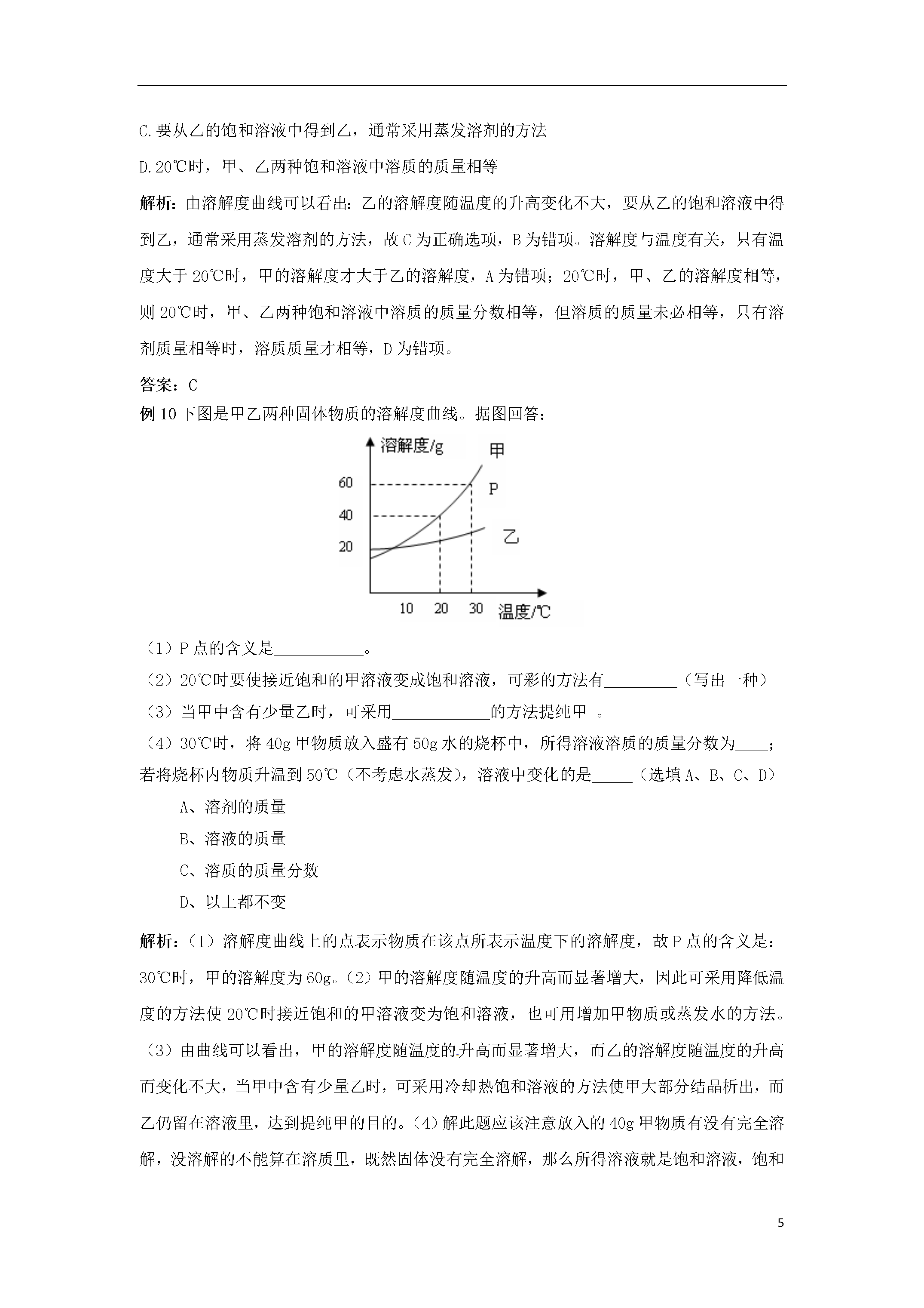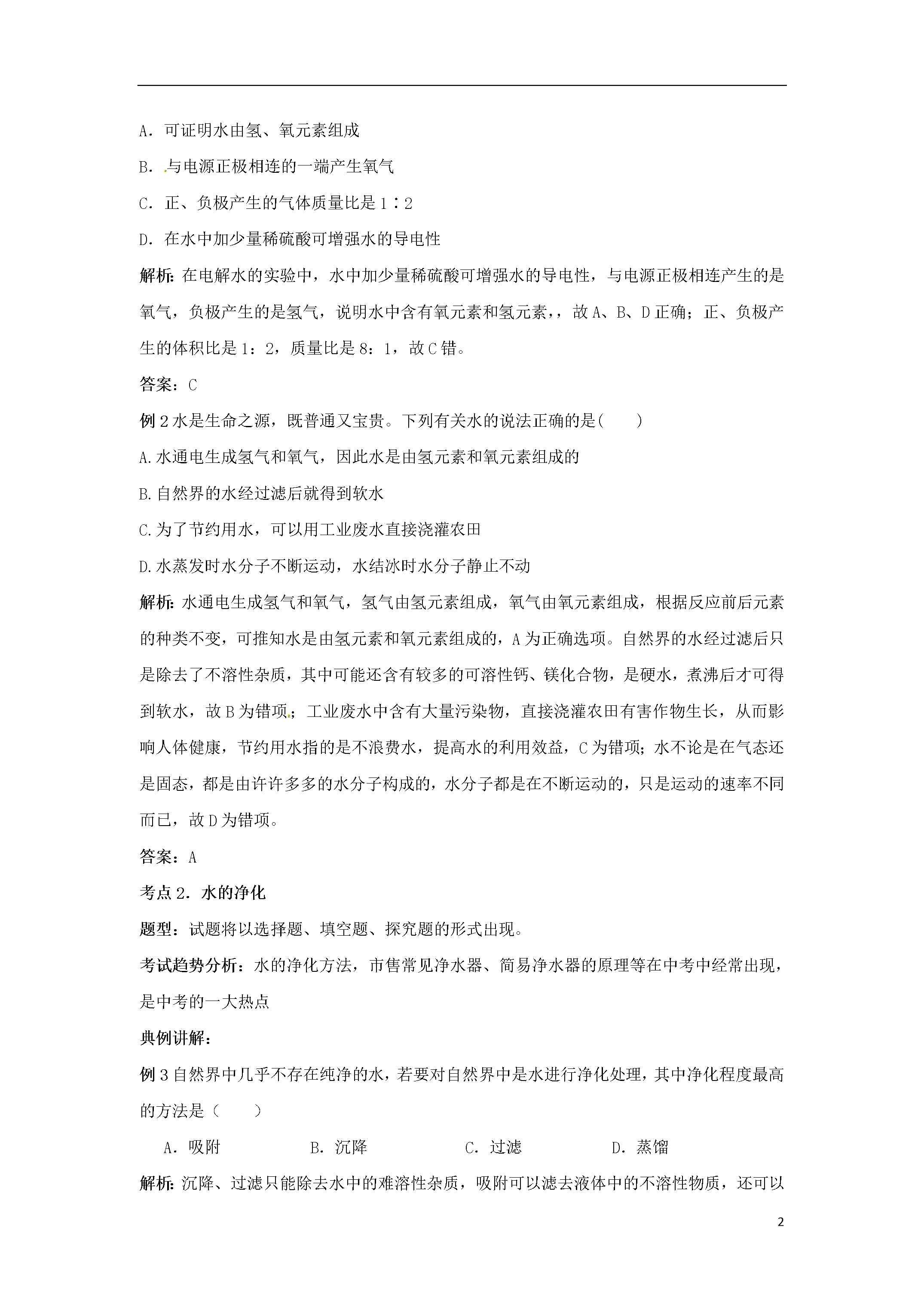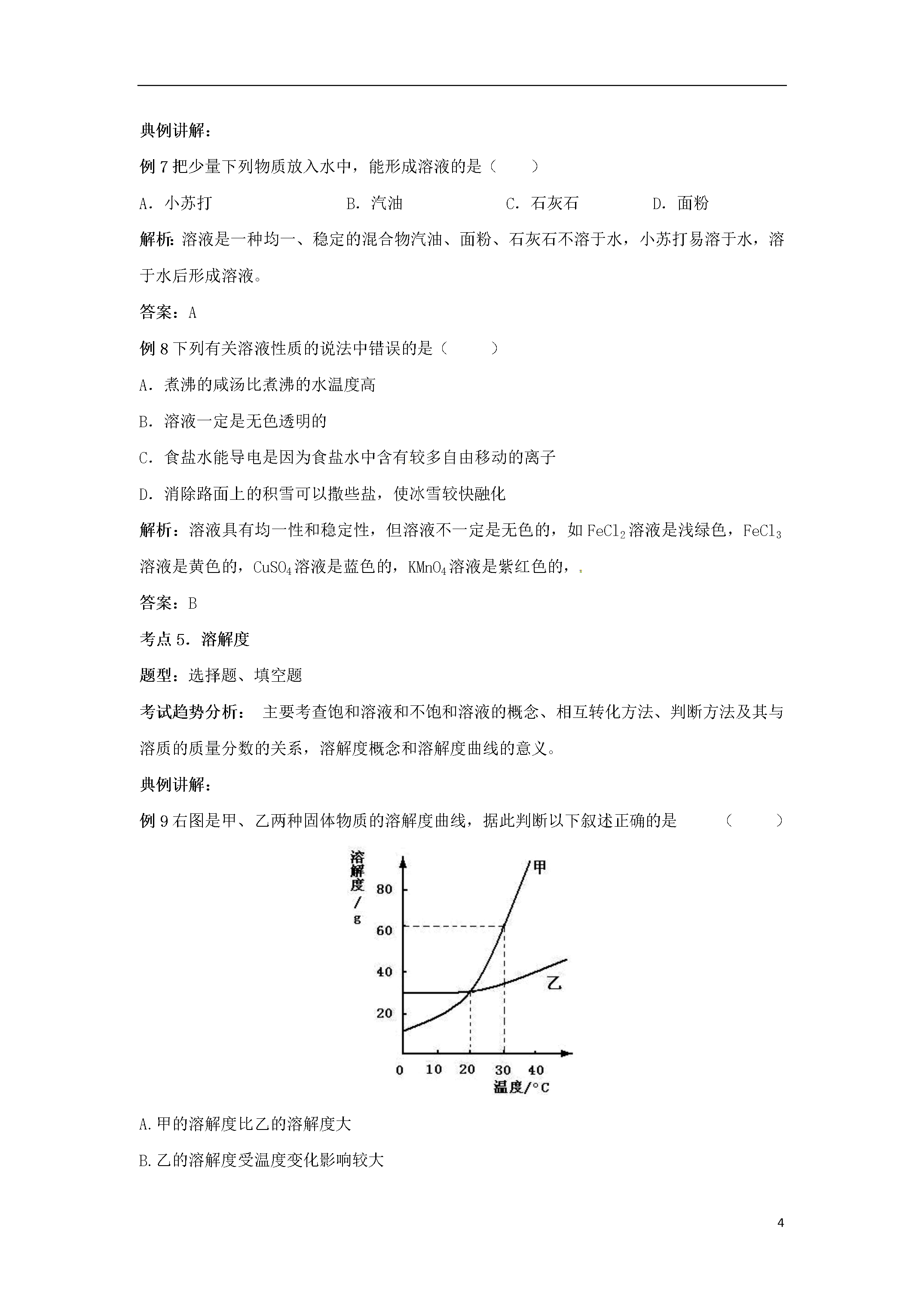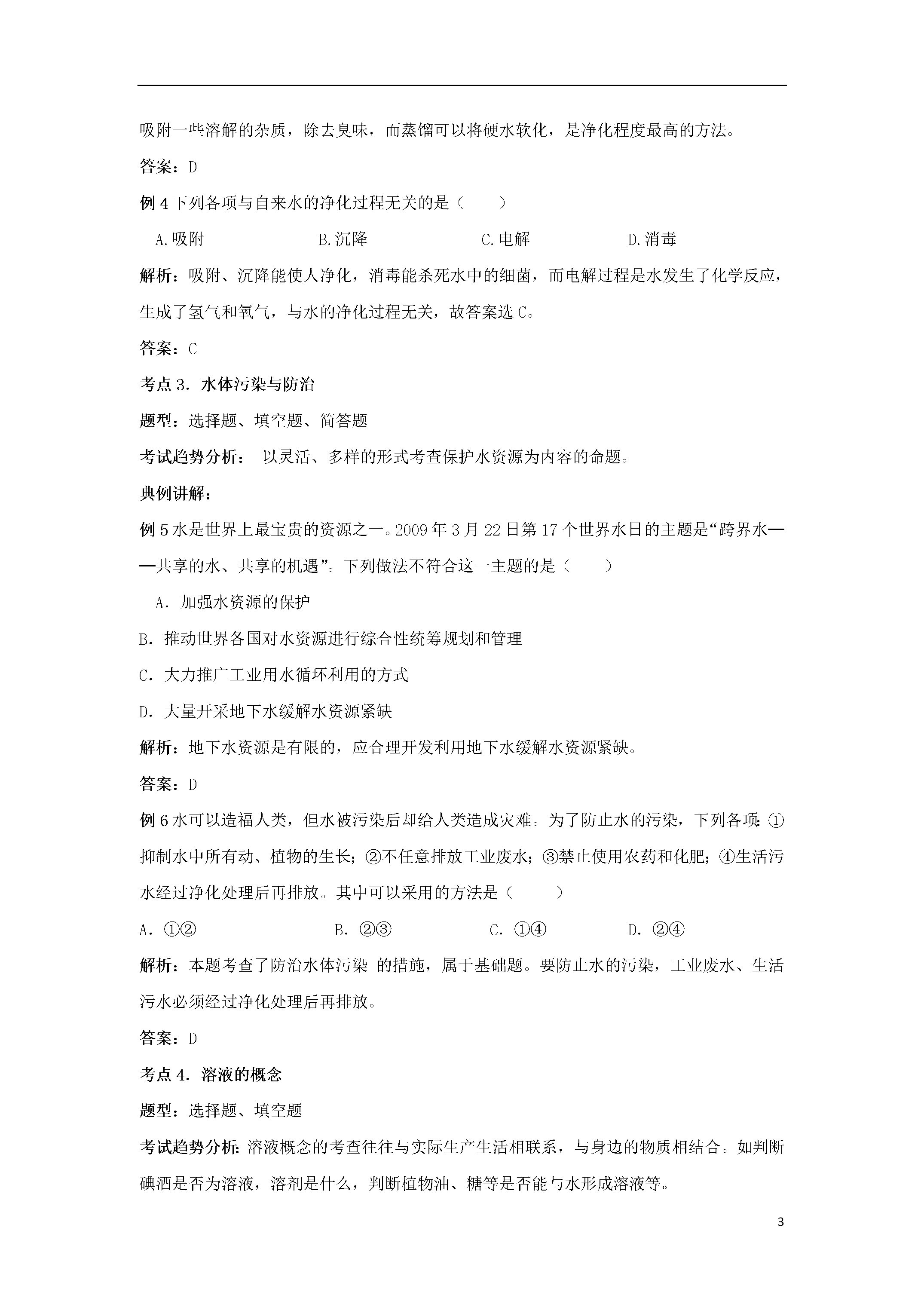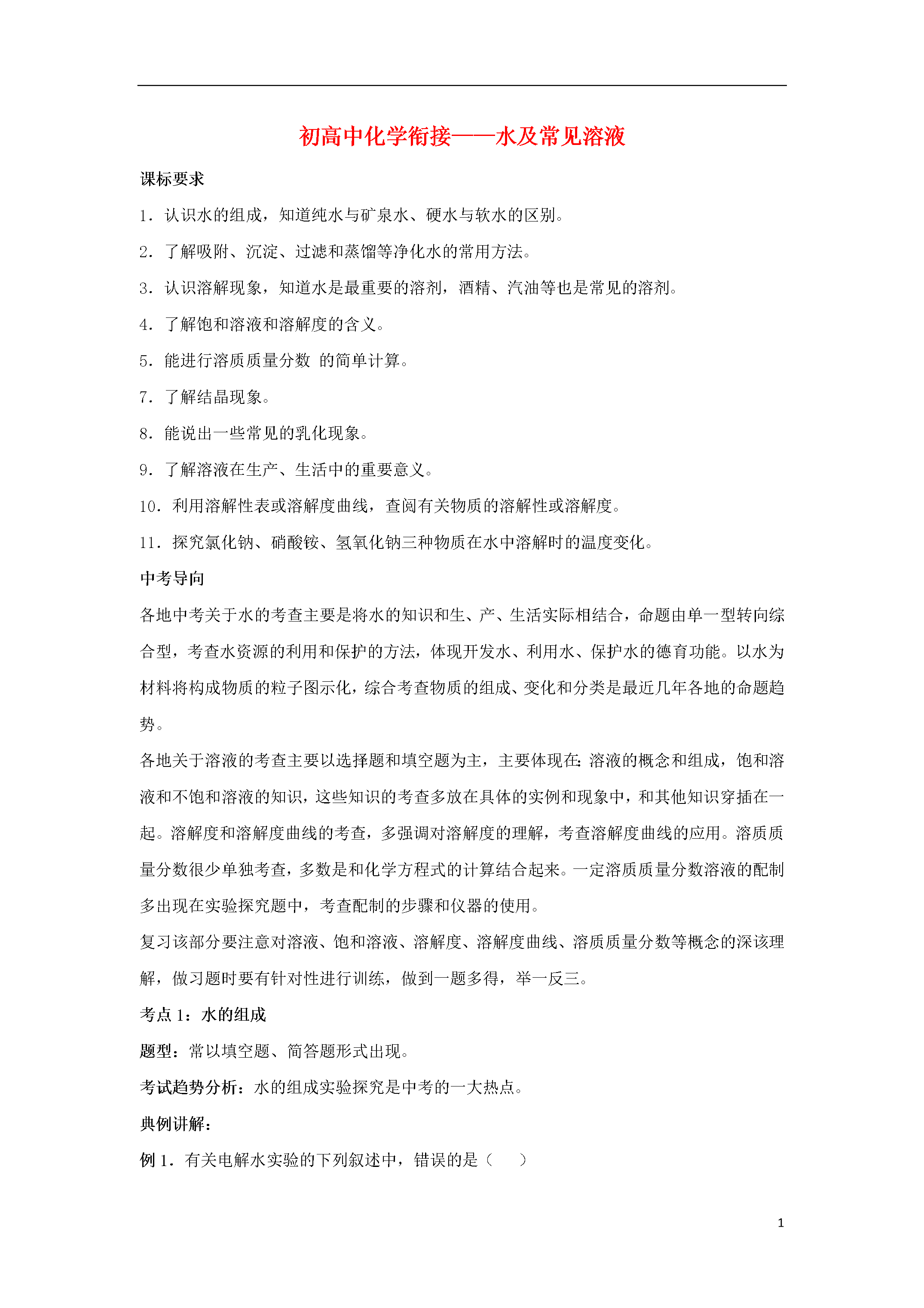 15初高中化学衔接——水及常见溶液课标要求1.认识水的组成,知道纯水与矿泉水、硬水与软水的区别。2.了解吸附、沉淀、过滤和蒸馏等净化水的常用方法。3.认识溶解现象,知道水是最重要的溶剂,酒精、汽油等也是常见的溶剂。4.了解饱和溶液和溶解度的含义。5.能进行溶质质量分数的简单计算。7.了解结晶现象。8.能说出一些常见的乳化现象。9.了解溶液在生产、生活中的重要意义。10.利用溶解性表或溶解度曲线,查阅有关物质的溶解性或溶解度。11.探究氯化钠、硝酸铵、氢氧化钠三种物质在水中溶解时的温度变化。中考导向各地中考关于水的考查主要是将水的知识和生、产、生活实际相结合,命题由单一型转向综合型,考查水资源的利用和保护的方法,体现开发水、利用水、保护水的德育功能。以水为材料将构成物质的粒子图示化,综合考查物质的组成、变化和分类是最近几年各地的命题趋势。各地关于溶液的考查主要以选择题和填空题为主,主要体现在:溶液的概念和组成,饱和溶液和不饱和溶液的知识,这些知识的考查多放在具体的实例和现象中,和其他知识穿插在一起。溶解度和溶解度曲线的考查,多强调对溶解度的理解,考查溶解度曲线的应用。溶质质量分数很少单独考查,多数是和化学方程式的计算结合起来。一定溶质质量分数溶液的配制多出现在实验探究题中,考查配制的步骤和仪器的使用。复习该部分要注意对溶液、饱和溶液、溶解度、溶解度曲线、溶质质量分数等概念的深该理解,做习题时要有针对性进行训练,做到一题多得,举一反三。考点1:水的组成题型:常以填空题、简答题形式出现。考试趋势分析:水的组成实验探究是中考的一大热点。典例讲解:例1.有关电解水实验的下列叙述中,错误的是()A.可证明水由氢、氧元素组成B.与电源正极相连的一端产生氧气C.正、负极产生的气体质量比是1∶2D.在水中加少量稀硫酸可增强水的导电性解析:在电解水的实验中,水中加少量稀硫酸可增强水的导电性,与电源正极相连产生的是氧气,负极产生的是氢气,说明水中含有氧元素和氢元素,,故A、B、D正确;正、负极产生的体积比是1:2,质量比是8:1,故C错。答案:C例2水是生命之源,既普通又宝贵。下列有关水的说法正确的是()A.水通电生成氢气和氧气,因此水是由氢元素和氧元素组成的B.自然界的水经过滤后就得到软水C.为了节约用水,可以用工业废水直接浇灌农田D.水蒸发时水分子不断运动,水结冰时水分子静止不动解析:水通电生成氢气和氧气,氢气由氢元素组成,氧气由氧元素组成,根据反应前后元素的种类不变,可推知水是由氢元素和氧元素组成的,A为正确选项。自然界的水经过滤后只是除去了不溶性杂质,其中可能还含有较多的可溶性钙、镁化合物,是硬水,煮沸后才可得到软水,故B为错项;工业废水中含有大量污染物,直接浇灌农田有害作物生长,从而影响人体健康,节约用水指的是不浪费水,提高水的利用效益,C为错项;水不论是在气态还是固态,都是由许许多多的水分子构成的,水分子都是在不断运动的,只是运动的速率不同而已,故D为错项。答案:A考点2.水的净化题型:试题将以选择题、填空题、探究题的形式出现。考试趋势分析:水的净化方法,市售常见净水器、简易净水器的原理等在中考中经常出现,是中考的一大热点典例讲解:例3自然界中几乎不存在纯净的水,若要对自然界中是水进行净化处理,其中净化程度最高的方法是()A.吸附B.沉降C.过滤D.蒸馏解析:沉降、过滤只能除去水中的难溶性杂质,吸附可以滤去液体中的不溶性物质,还可以吸附一些溶解的杂质,除去臭味,而蒸馏可以将硬水软化,是净化程度最高的方法。答案:D例4下列各项与自来水的净化过程无关的是()A.吸附B.沉降C.电解D.消毒解析:吸附、沉降能使人净化,消毒能杀死水中的细菌,而电解过程是水发生了化学反应,生成了氢气和氧气,与水的净化过程无关,故答案选C。答案:C考点3.水体污染与防治题型:选择题、填空题、简答题考试趋势分析:以灵活、多样的形式考查保护水资源为内容的命题。典例讲解:例5水是世界上最宝贵的资源之一。2009年3月22日第17个世界水日的主题是“跨界水──共享的水、共享的机遇”。下列做法不符合这一主题的是()A.加强水资源的保护B.推动世界各国对水资源进行综合性统筹规划和管理C.大力推广工业用水循环利用的方式D.大量开采地下水缓解水资源紧缺解析:地下水资源是有限的,应合理开发利用地下水缓解水资源紧缺。答案:D例6水可以造福人类,但水被污染后却给人类造成灾难。为了防止水的污染,下列各项:①抑制水中所有动、植物的生长;②不任意排放工业废水;③禁止使用农药和化肥;④生活污水经过净化处理后再排放。其中可以采用的方法是()A.①②B.②③C.①④D.②④解析:本题考查了防治水体污染的措施,属于基础题。要防止水的污染,工业废水、生活污水必须经过净化处理后再排放。答案:D考点4.溶