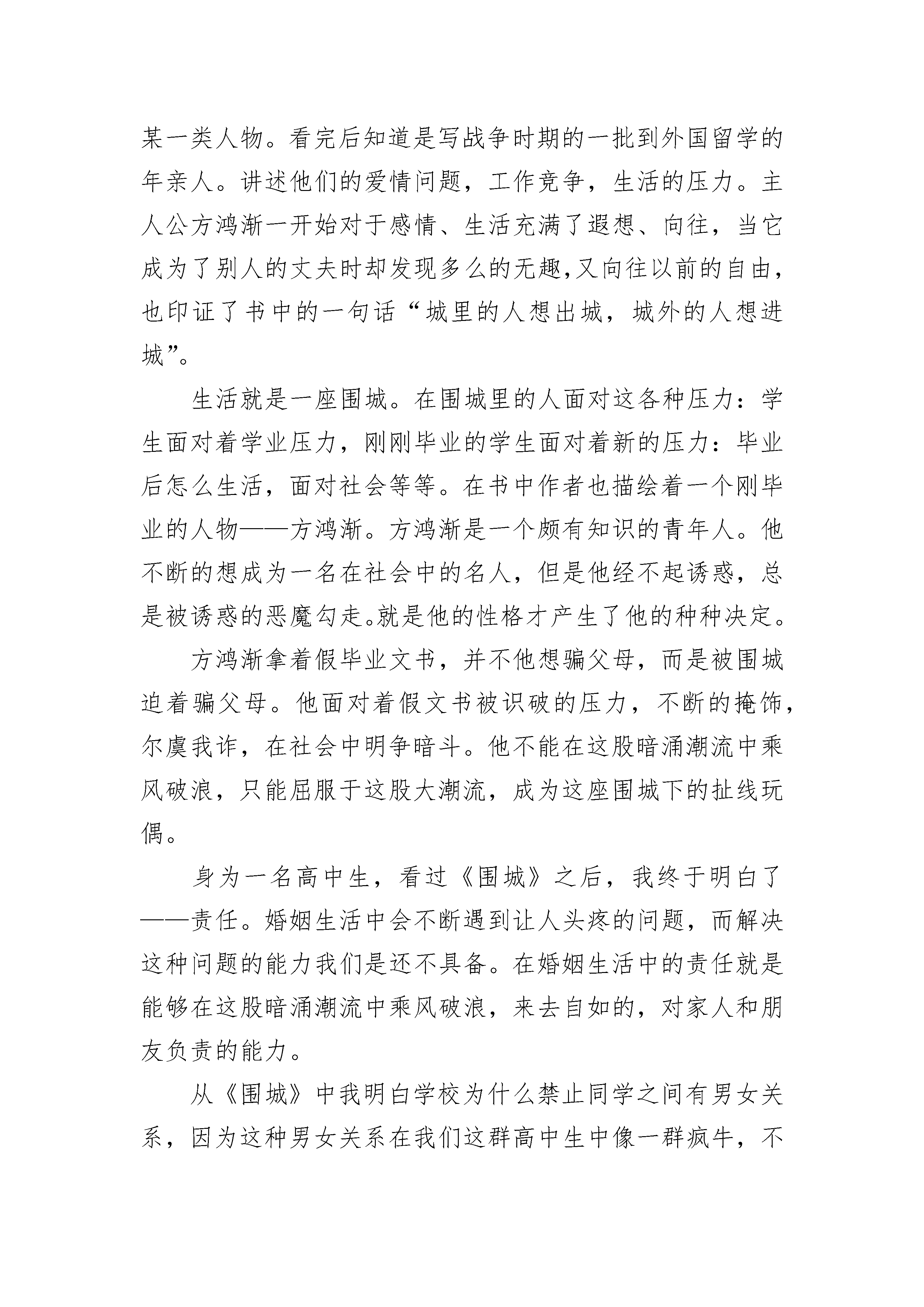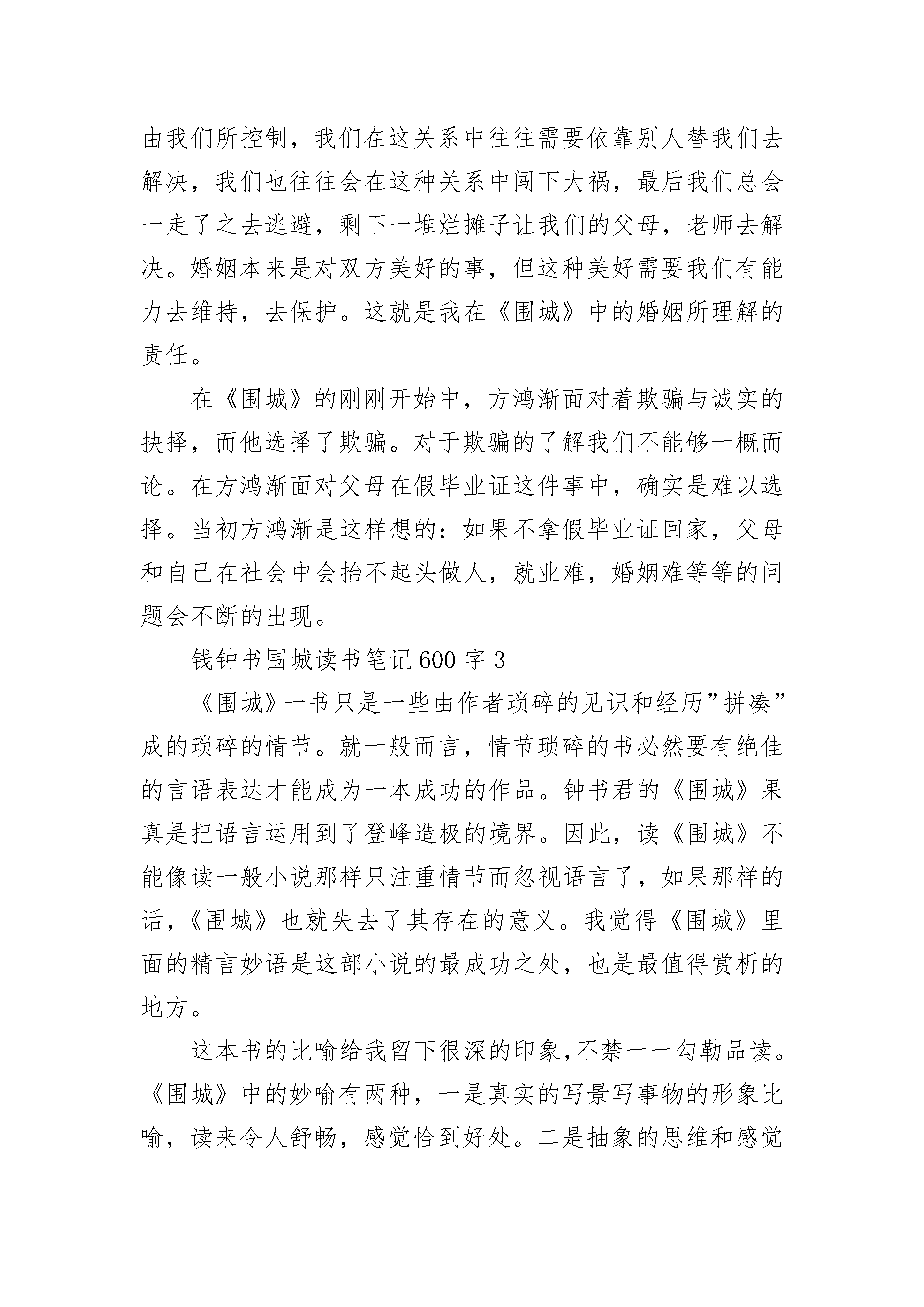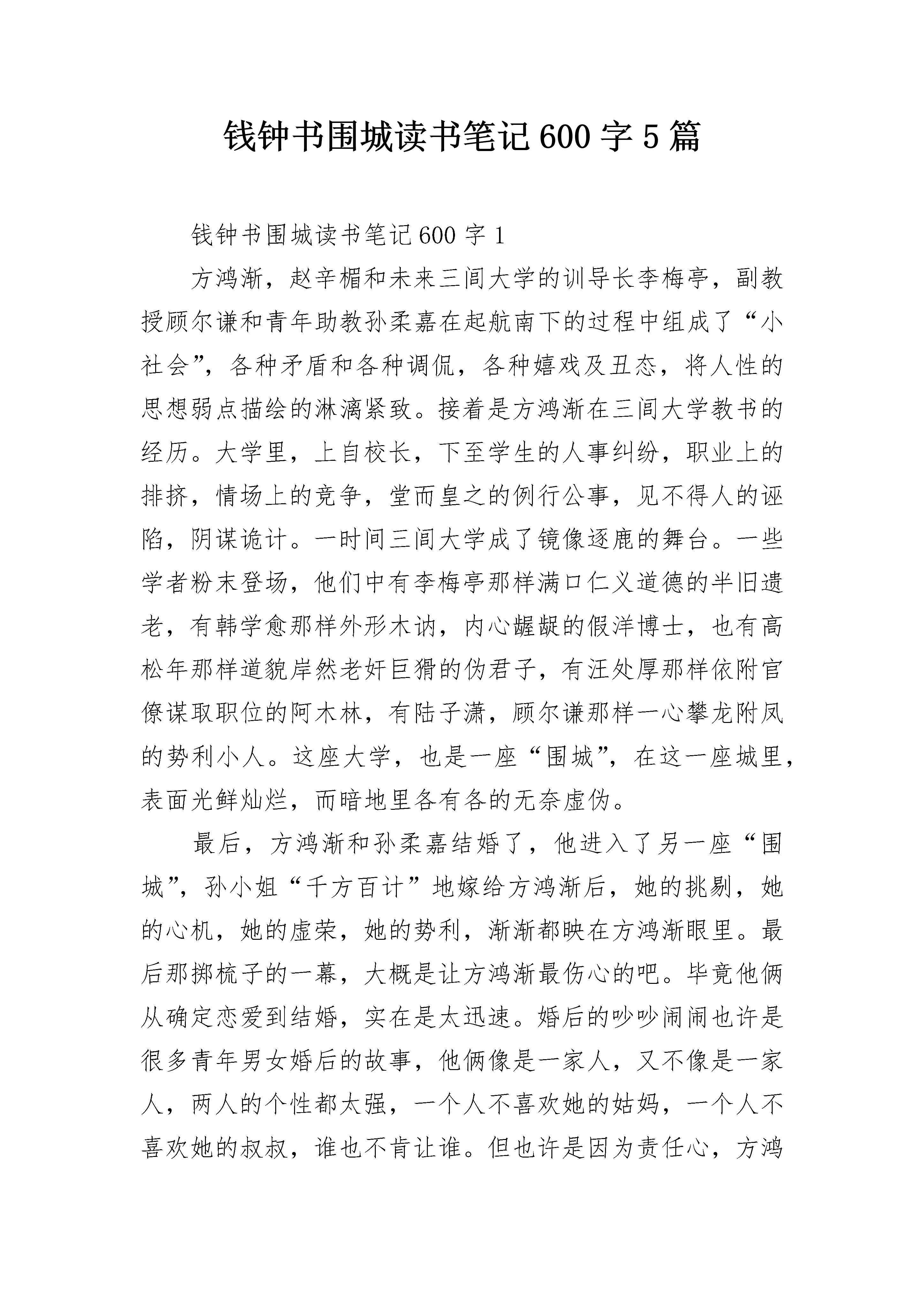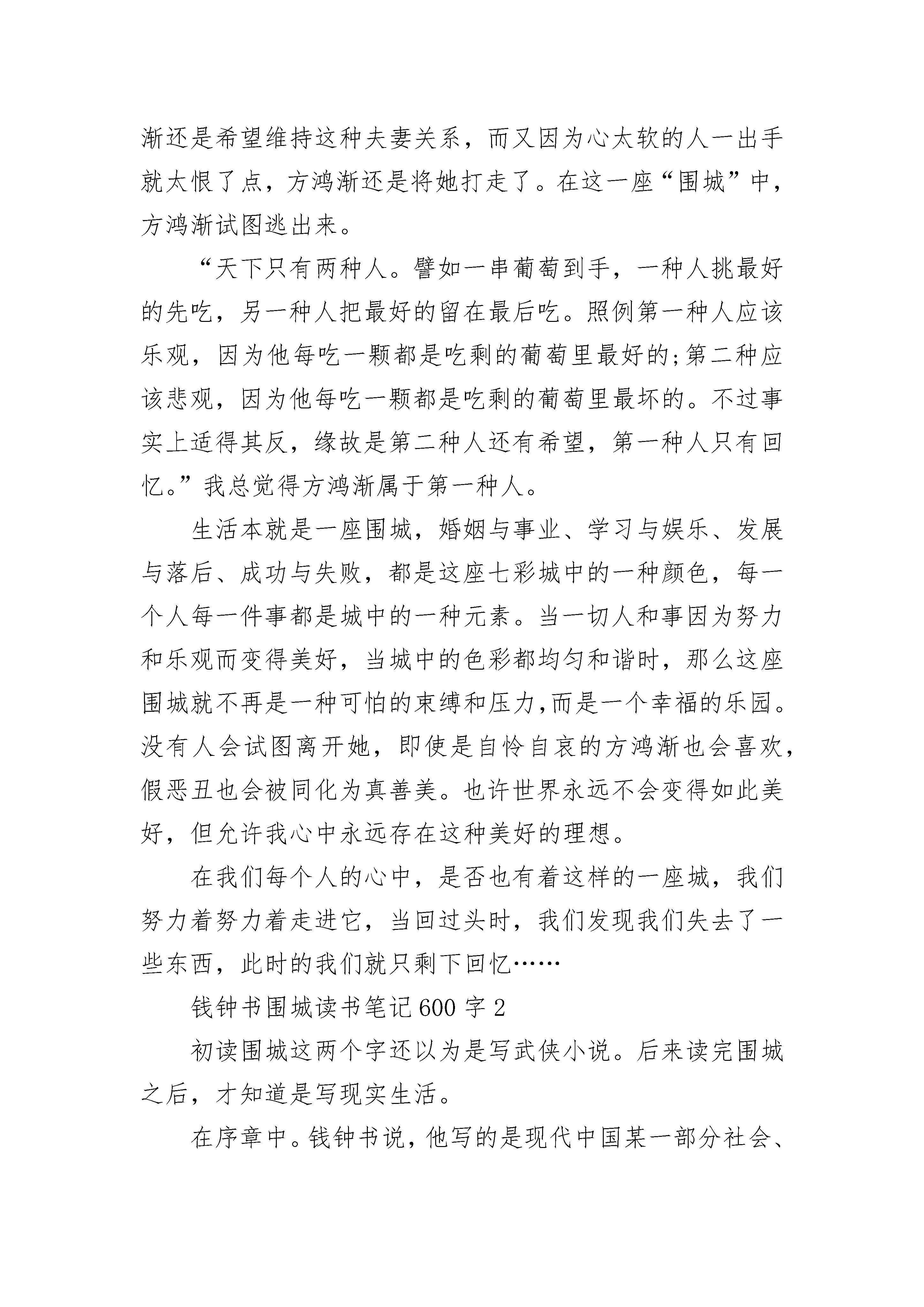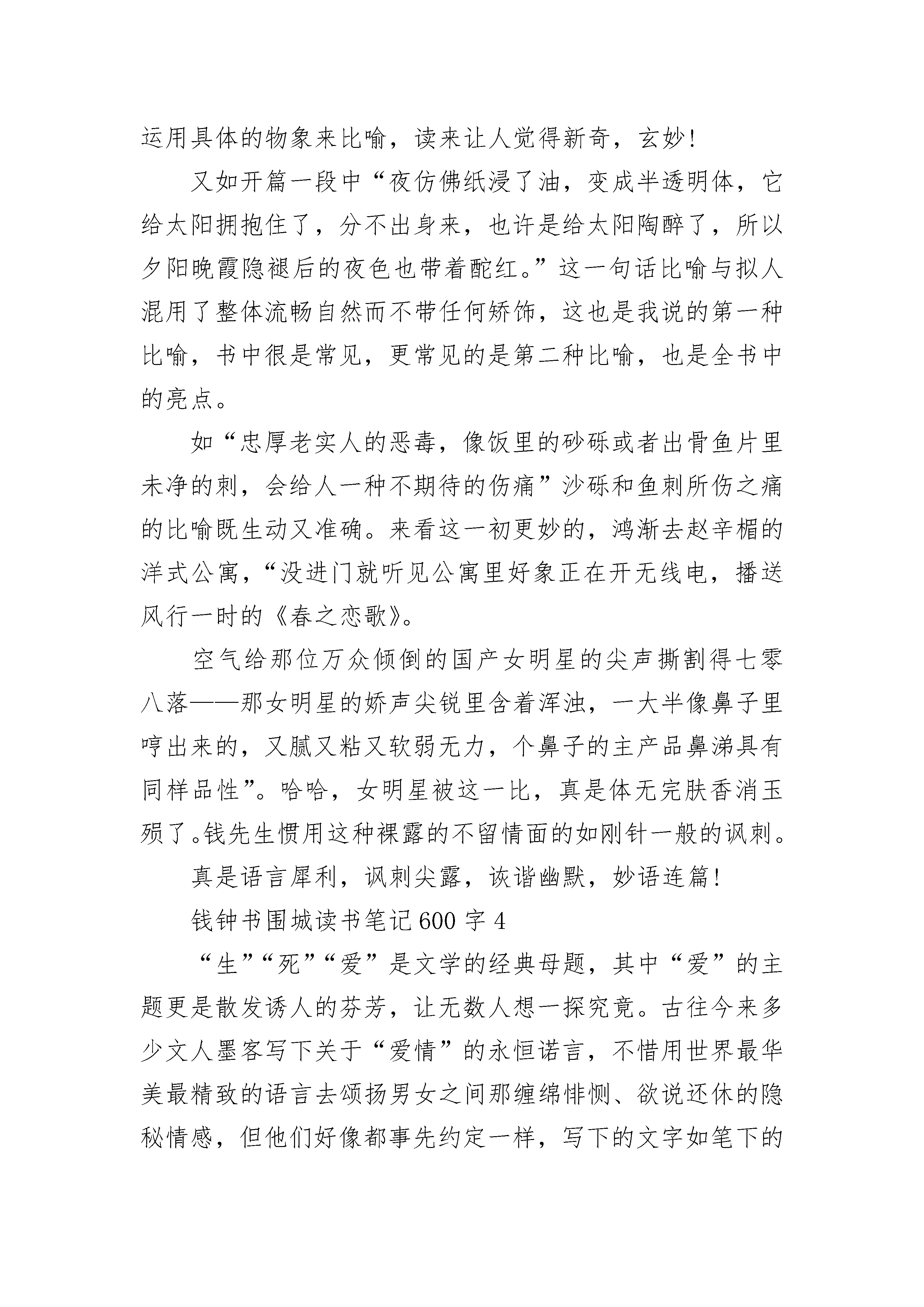 钱钟书围城读书笔记600字5篇钱钟书围城读书笔记600字1方鸿渐,赵辛楣和未来三闾大学的训导长李梅亭,副教授顾尔谦和青年助教孙柔嘉在起航南下的过程中组成了“小社会”,各种矛盾和各种调侃,各种嬉戏及丑态,将人性的思想弱点描绘的淋漓紧致。接着是方鸿渐在三闾大学教书的经历。大学里,上自校长,下至学生的人事纠纷,职业上的排挤,情场上的竞争,堂而皇之的例行公事,见不得人的诬陷,阴谋诡计。一时间三闾大学成了镜像逐鹿的舞台。一些学者粉末登场,他们中有李梅亭那样满口仁义道德的半旧遗老,有韩学愈那样外形木讷,内心龌龊的假洋博士,也有高松年那样道貌岸然老奸巨猾的伪君子,有汪处厚那样依附官僚谋取职位的阿木林,有陆子潇,顾尔谦那样一心攀龙附凤的势利小人。这座大学,也是一座“围城”,在这一座城里,表面光鲜灿烂,而暗地里各有各的无奈虚伪。最后,方鸿渐和孙柔嘉结婚了,他进入了另一座“围城”,孙小姐“千方百计”地嫁给方鸿渐后,她的挑剔,她的心机,她的虚荣,她的势利,渐渐都映在方鸿渐眼里。最后那掷梳子的一幕,大概是让方鸿渐最伤心的吧。毕竟他俩从确定恋爱到结婚,实在是太迅速。婚后的吵吵闹闹也许是很多青年男女婚后的故事,他俩像是一家人,又不像是一家人,两人的个性都太强,一个人不喜欢她的姑妈,一个人不喜欢她的叔叔,谁也不肯让谁。但也许是因为责任心,方鸿渐还是希望维持这种夫妻关系,而又因为心太软的人一出手就太恨了点,方鸿渐还是将她打走了。在这一座“围城”中,方鸿渐试图逃出来。“天下只有两种人。譬如一串葡萄到手,一种人挑最好的先吃,另一种人把最好的留在最后吃。照例第一种人应该乐观,因为他每吃一颗都是吃剩的葡萄里最好的;第二种应该悲观,因为他每吃一颗都是吃剩的葡萄里最坏的。不过事实上适得其反,缘故是第二种人还有希望,第一种人只有回忆。”我总觉得方鸿渐属于第一种人。生活本就是一座围城,婚姻与事业、学习与娱乐、发展与落后、成功与失败,都是这座七彩城中的一种颜色,每一个人每一件事都是城中的一种元素。当一切人和事因为努力和乐观而变得美好,当城中的色彩都均匀和谐时,那么这座围城就不再是一种可怕的束缚和压力,而是一个幸福的乐园。没有人会试图离开她,即使是自怜自哀的方鸿渐也会喜欢,假恶丑也会被同化为真善美。也许世界永远不会变得如此美好,但允许我心中永远存在这种美好的理想。在我们每个人的心中,是否也有着这样的一座城,我们努力着努力着走进它,当回过头时,我们发现我们失去了一些东西,此时的我们就只剩下回忆……钱钟书围城读书笔记600字2初读围城这两个字还以为是写武侠小说。后来读完围城之后,才知道是写现实生活。在序章中。钱钟书说,他写的是现代中国某一部分社会、某一类人物。看完后知道是写战争时期的一批到外国留学的年亲人。讲述他们的爱情问题,工作竞争,生活的压力。主人公方鸿渐一开始对于感情、生活充满了遐想、向往,当它成为了别人的丈夫时却发现多么的无趣,又向往以前的自由,也印证了书中的一句话“城里的人想出城,城外的人想进城”。生活就是一座围城。在围城里的人面对这各种压力:学生面对着学业压力,刚刚毕业的学生面对着新的压力:毕业后怎么生活,面对社会等等。在书中作者也描绘着一个刚毕业的人物——方鸿渐。方鸿渐是一个颇有知识的青年人。他不断的想成为一名在社会中的名人,但是他经不起诱惑,总是被诱惑的恶魔勾走。就是他的性格才产生了他的种种决定。方鸿渐拿着假毕业文书,并不他想骗父母,而是被围城迫着骗父母。他面对着假文书被识破的压力,不断的掩饰,尔虞我诈,在社会中明争暗斗。他不能在这股暗涌潮流中乘风破浪,只能屈服于这股大潮流,成为这座围城下的扯线玩偶。身为一名高中生,看过《围城》之后,我终于明白了——责任。婚姻生活中会不断遇到让人头疼的问题,而解决这种问题的能力我们是还不具备。在婚姻生活中的责任就是能够在这股暗涌潮流中乘风破浪,来去自如的,对家人和朋友负责的能力。从《围城》中我明白学校为什么禁止同学之间有男女关系,因为这种男女关系在我们这群高中生中像一群疯牛,不由我们所控制,我们在这关系中往往需要依靠别人替我们去解决,我们也往往会在这种关系中闯下大祸,最后我们总会一走了之去逃避,剩下一堆烂摊子让我们的父母,老师去解决。婚姻本来是对双方美好的事,但这种美好需要我们有能力去维持,去保护。这就是我在《围城》中的婚姻所理解的责任。在《围城》的刚刚开始中,方鸿渐面对着欺骗与诚实的抉择,而他选择了欺骗。对于欺骗的了解我们不能够一概而论。在方鸿渐面对父母在假毕业证这件事中,确实是难以选择。当初方鸿渐是这样想的:如果不拿假毕业证回家,父母和自己在社会中会抬不起头做人,就业难,婚姻难等等的问题会不断的出现。钱钟书围城读书笔记600字3《围城》一书只是一些由作者琐碎的见识和经历”拼凑”成的琐碎的情节。就一般而言,情节琐碎的书必然要有
