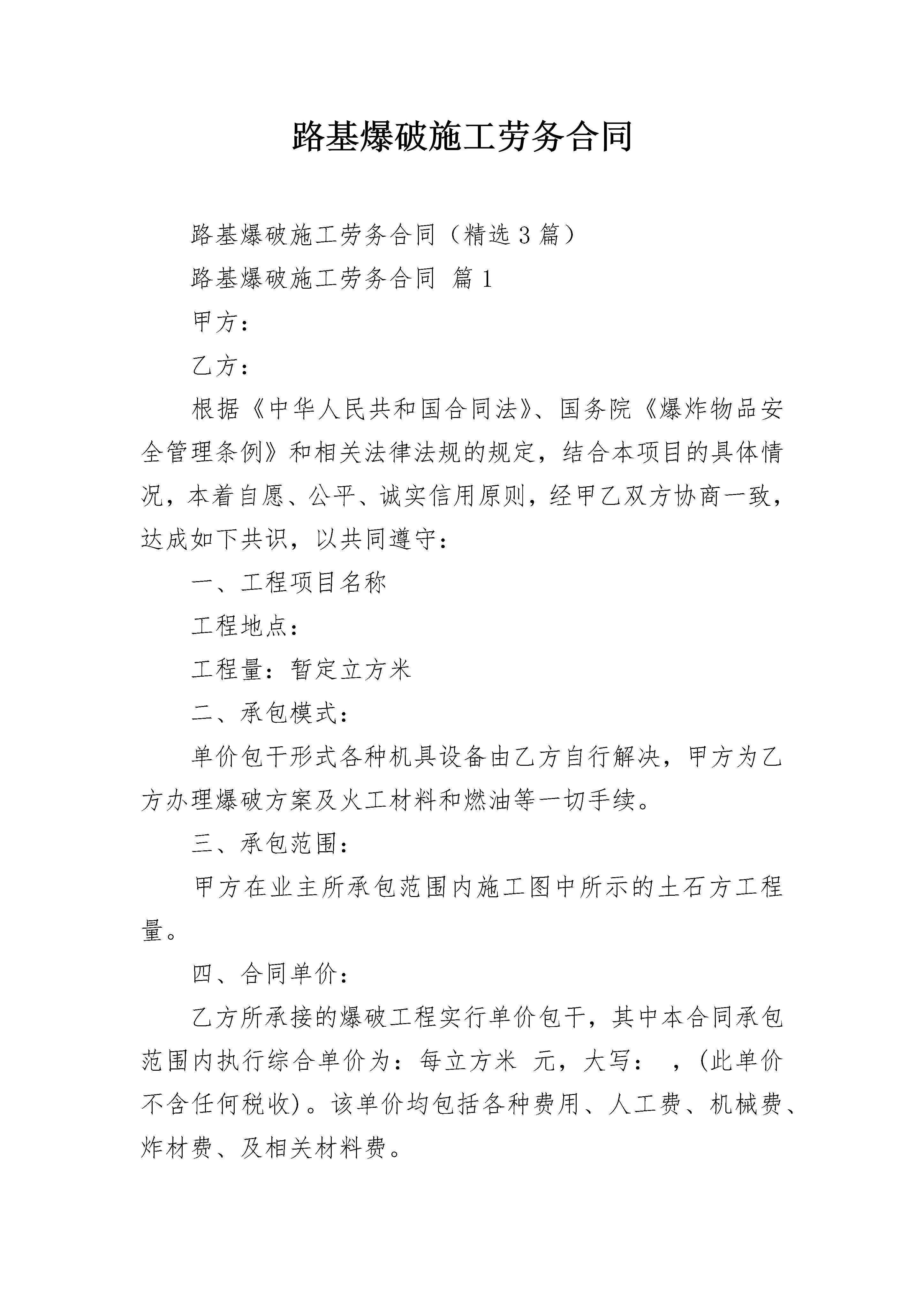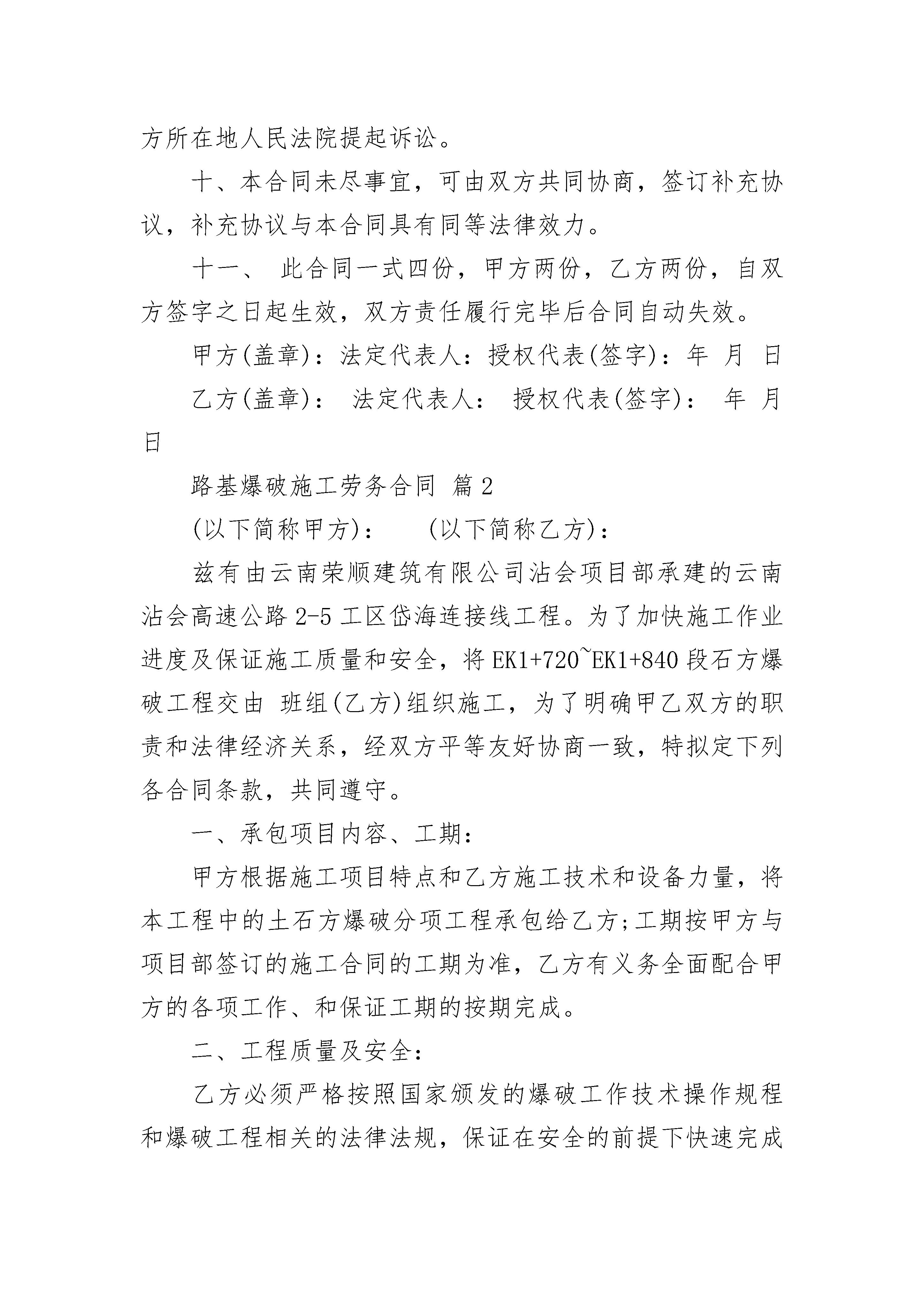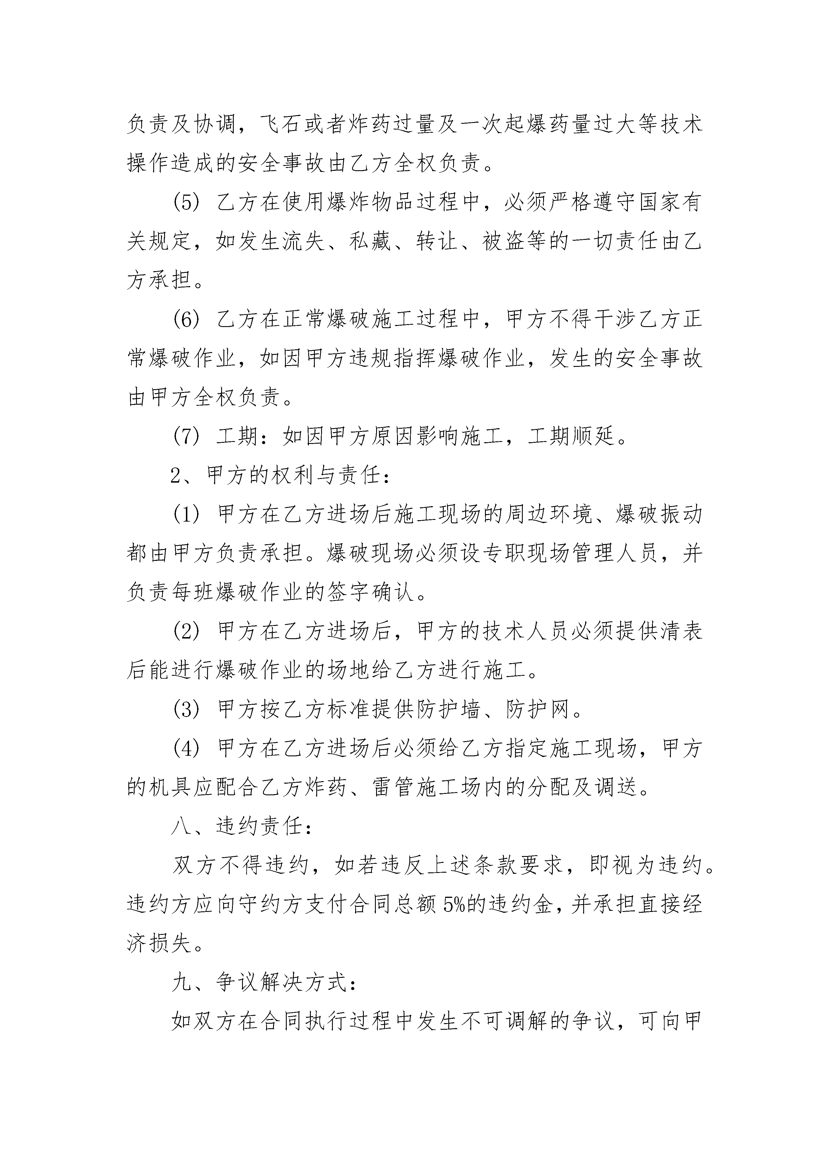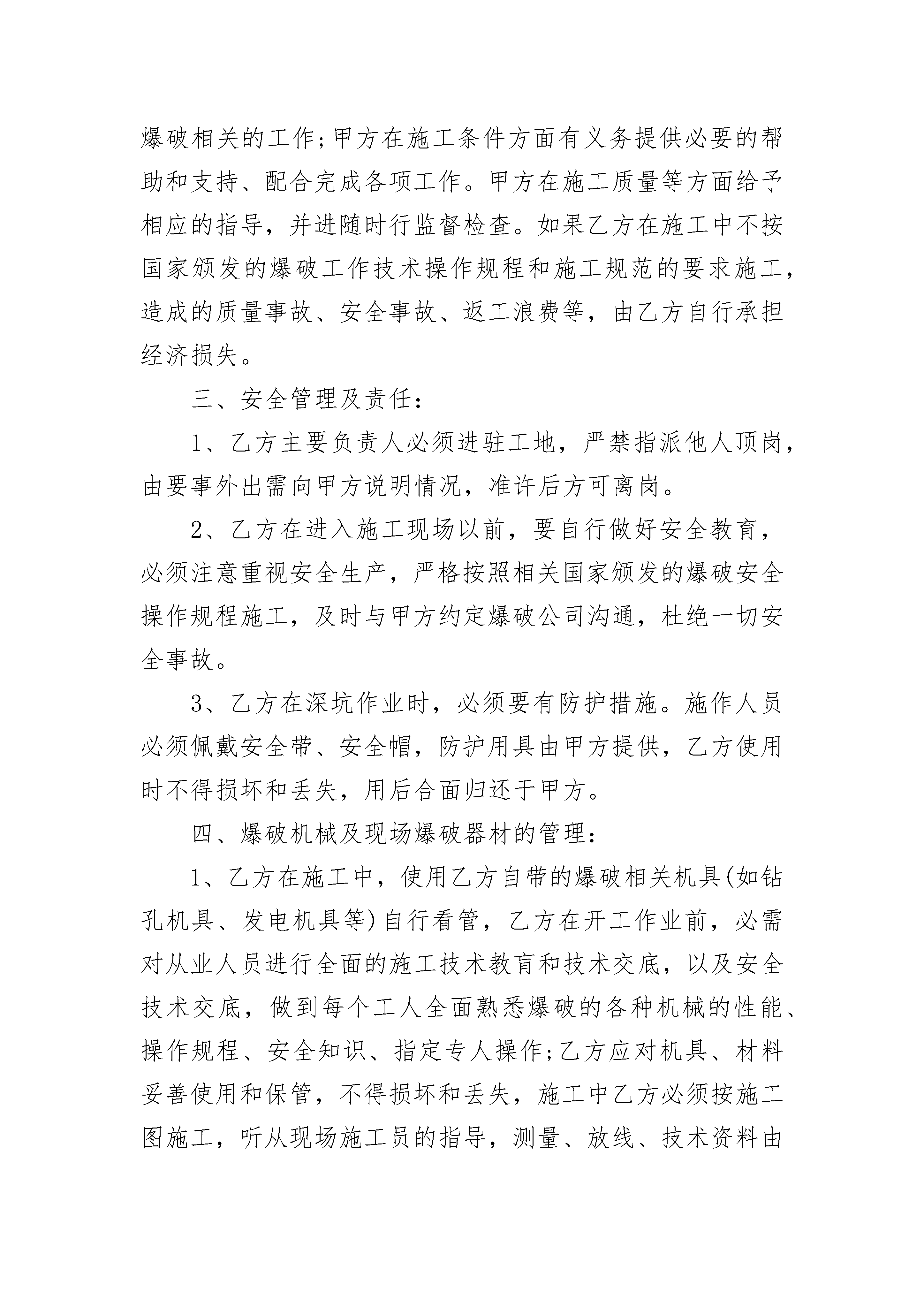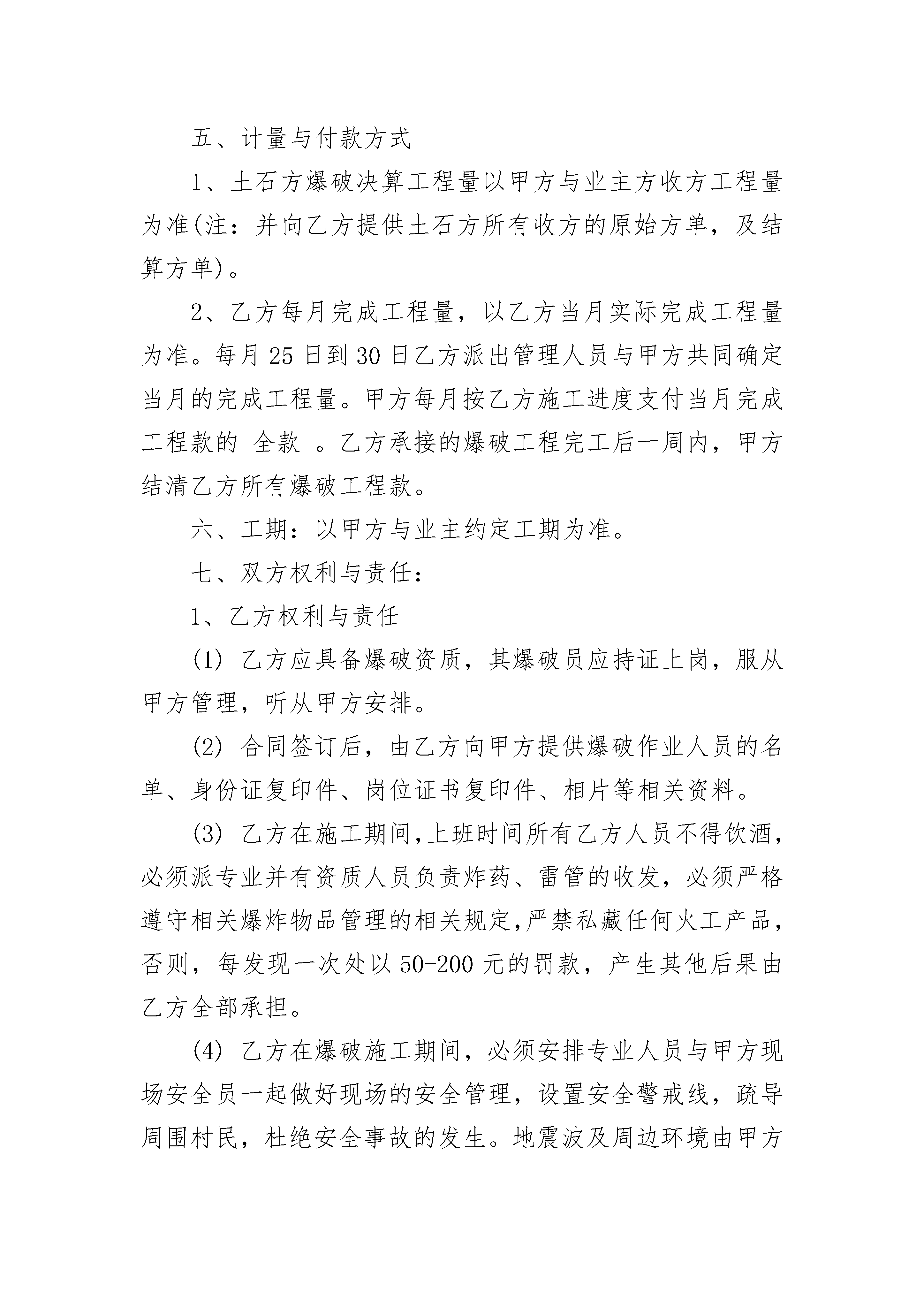 路基爆破施工劳务合同路基爆破施工劳务合同(精选3篇)路基爆破施工劳务合同篇1甲方:乙方:根据《中华人民共和国合同法》、国务院《爆炸物品安全管理条例》和相关法律法规的规定,结合本项目的具体情况,本着自愿、公平、诚实信用原则,经甲乙双方协商一致,达成如下共识,以共同遵守:一、工程项目名称工程地点:工程量:暂定立方米二、承包模式:单价包干形式各种机具设备由乙方自行解决,甲方为乙方办理爆破方案及火工材料和燃油等一切手续。三、承包范围:甲方在业主所承包范围内施工图中所示的土石方工程量。四、合同单价:乙方所承接的爆破工程实行单价包干,其中本合同承包范围内执行综合单价为:每立方米元,大写:,(此单价不含任何税收)。该单价均包括各种费用、人工费、机械费、炸材费、及相关材料费。五、计量与付款方式1、土石方爆破决算工程量以甲方与业主方收方工程量为准(注:并向乙方提供土石方所有收方的原始方单,及结算方单)。2、乙方每月完成工程量,以乙方当月实际完成工程量为准。每月25日到30日乙方派出管理人员与甲方共同确定当月的完成工程量。甲方每月按乙方施工进度支付当月完成工程款的全款。乙方承接的爆破工程完工后一周内,甲方结清乙方所有爆破工程款。六、工期:以甲方与业主约定工期为准。七、双方权利与责任:1、乙方权利与责任(1)乙方应具备爆破资质,其爆破员应持证上岗,服从甲方管理,听从甲方安排。(2)合同签订后,由乙方向甲方提供爆破作业人员的名单、身份证复印件、岗位证书复印件、相片等相关资料。(3)乙方在施工期间,上班时间所有乙方人员不得饮酒,必须派专业并有资质人员负责炸药、雷管的收发,必须严格遵守相关爆炸物品管理的相关规定,严禁私藏任何火工产品,否则,每发现一次处以50-200元的罚款,产生其他后果由乙方全部承担。(4)乙方在爆破施工期间,必须安排专业人员与甲方现场安全员一起做好现场的安全管理,设置安全警戒线,疏导周围村民,杜绝安全事故的发生。地震波及周边环境由甲方负责及协调,飞石或者炸药过量及一次起爆药量过大等技术操作造成的安全事故由乙方全权负责。(5)乙方在使用爆炸物品过程中,必须严格遵守国家有关规定,如发生流失、私藏、转让、被盗等的一切责任由乙方承担。(6)乙方在正常爆破施工过程中,甲方不得干涉乙方正常爆破作业,如因甲方违规指挥爆破作业,发生的安全事故由甲方全权负责。(7)工期:如因甲方原因影响施工,工期顺延。2、甲方的权利与责任:(1)甲方在乙方进场后施工现场的周边环境、爆破振动都由甲方负责承担。爆破现场必须设专职现场管理人员,并负责每班爆破作业的签字确认。(2)甲方在乙方进场后,甲方的技术人员必须提供清表后能进行爆破作业的场地给乙方进行施工。(3)甲方按乙方标准提供防护墙、防护网。(4)甲方在乙方进场后必须给乙方指定施工现场,甲方的机具应配合乙方炸药、雷管施工场内的分配及调送。八、违约责任:双方不得违约,如若违反上述条款要求,即视为违约。违约方应向守约方支付合同总额5%的违约金,并承担直接经济损失。九、争议解决方式:如双方在合同执行过程中发生不可调解的争议,可向甲方所在地人民法院提起诉讼。十、本合同未尽事宜,可由双方共同协商,签订补充协议,补充协议与本合同具有同等法律效力。十一、此合同一式四份,甲方两份,乙方两份,自双方签字之日起生效,双方责任履行完毕后合同自动失效。甲方(盖章):法定代表人:授权代表(签字):年月日乙方(盖章):法定代表人:授权代表(签字):年月日路基爆破施工劳务合同篇2(以下简称甲方):(以下简称乙方):兹有由云南荣顺建筑有限公司沾会项目部承建的云南沾会高速公路2-5工区岱海连接线工程。为了加快施工作业进度及保证施工质量和安全,将EK1+720~EK1+840段石方爆破工程交由班组(乙方)组织施工,为了明确甲乙双方的职责和法律经济关系,经双方平等友好协商一致,特拟定下列各合同条款,共同遵守。一、承包项目内容、工期:甲方根据施工项目特点和乙方施工技术和设备力量,将本工程中的土石方爆破分项工程承包给乙方;工期按甲方与项目部签订的施工合同的工期为准,乙方有义务全面配合甲方的各项工作、和保证工期的按期完成。二、工程质量及安全:乙方必须严格按照国家颁发的爆破工作技术操作规程和爆破工程相关的法律法规,保证在安全的前提下快速完成爆破相关的工作;甲方在施工条件方面有义务提供必要的帮助和支持、配合完成各项工作。甲方在施工质量等方面给予相应的指导,并进随时行监督检查。如果乙方在施工中不按国家颁发的爆破工作技术操作规程和施工规范的要求施工,造成的质量事故、安全事故、返工浪费等,由乙方自行承担经济损失。三、安全管理及责任:1、乙方主要负责人必须进驻工地,严禁指派他人顶岗,由要事外出需向甲方说明情况,准许后方可离岗。2、乙方在进入施工现场以前,要自行做好安