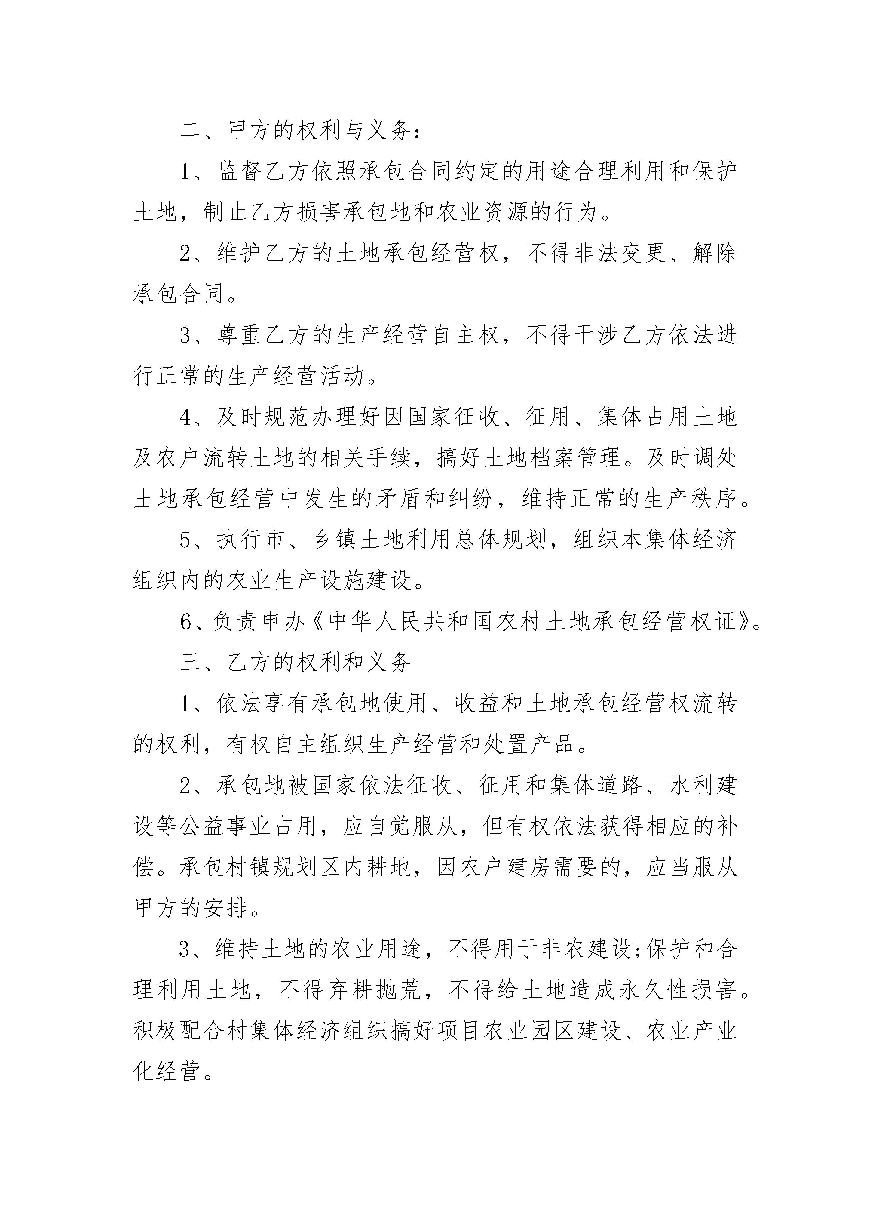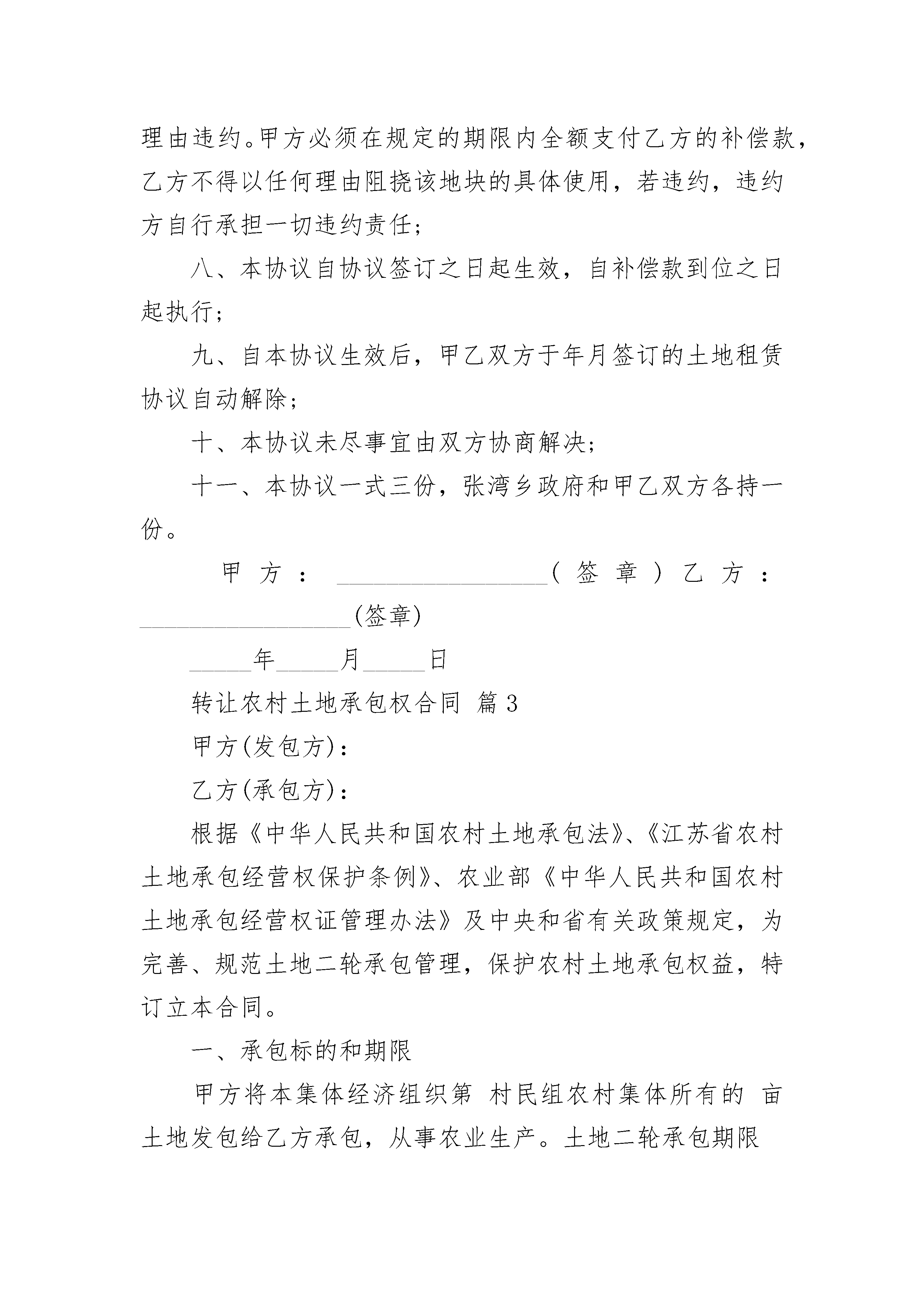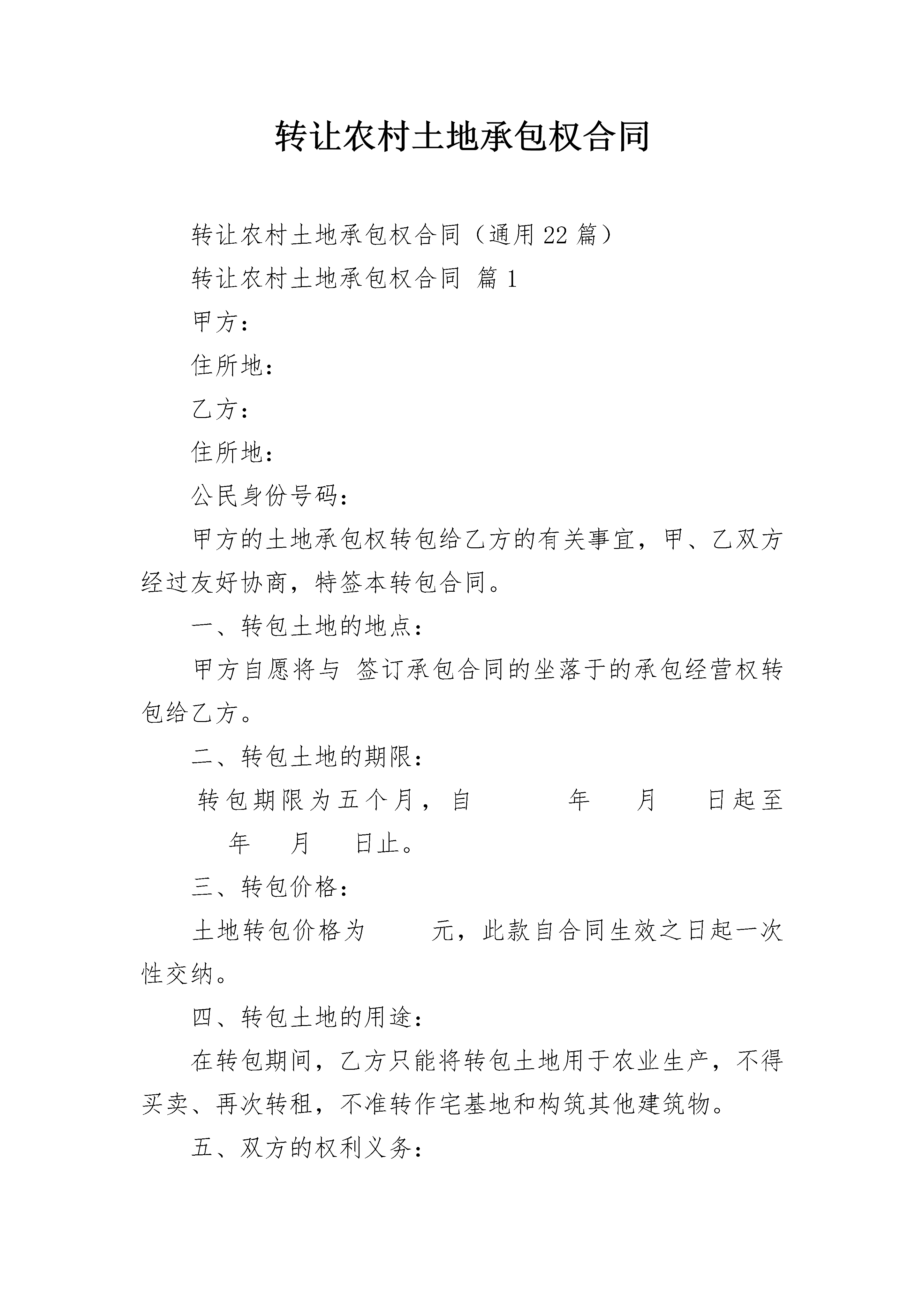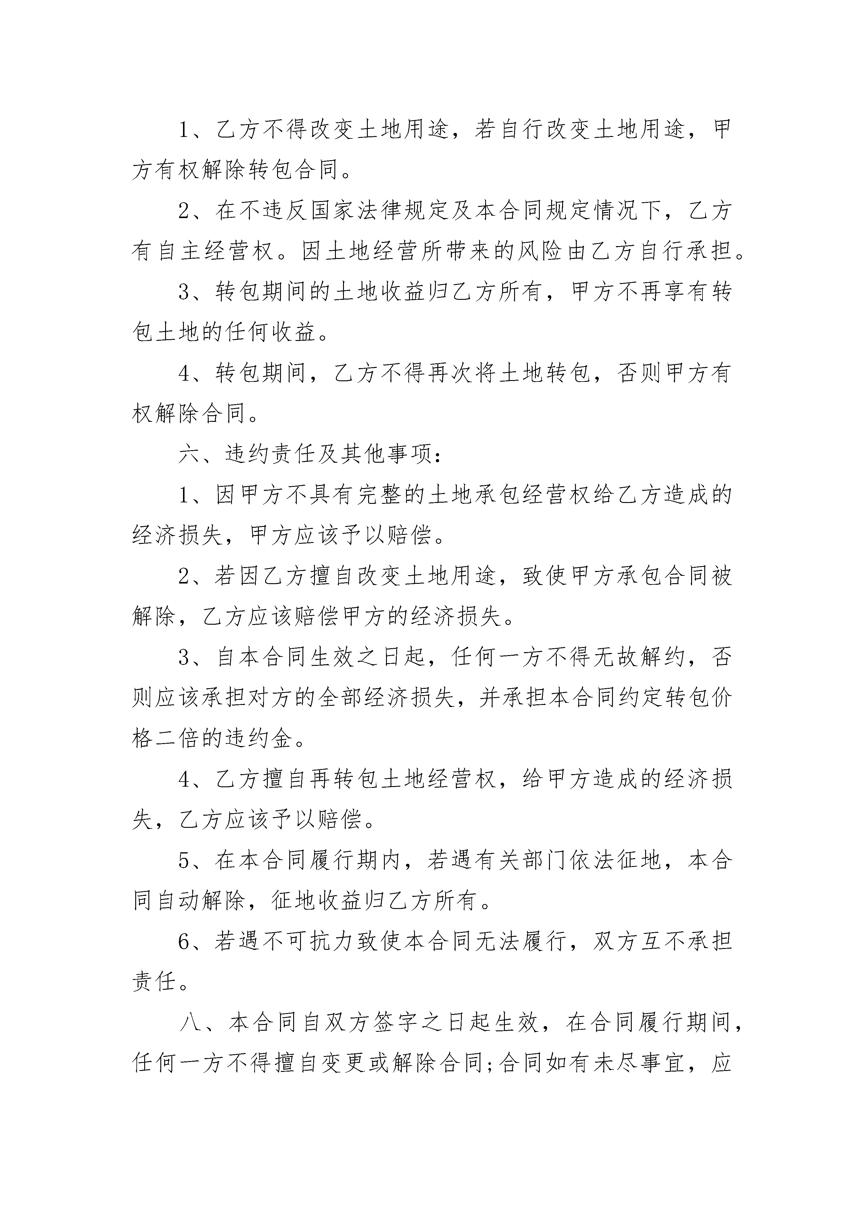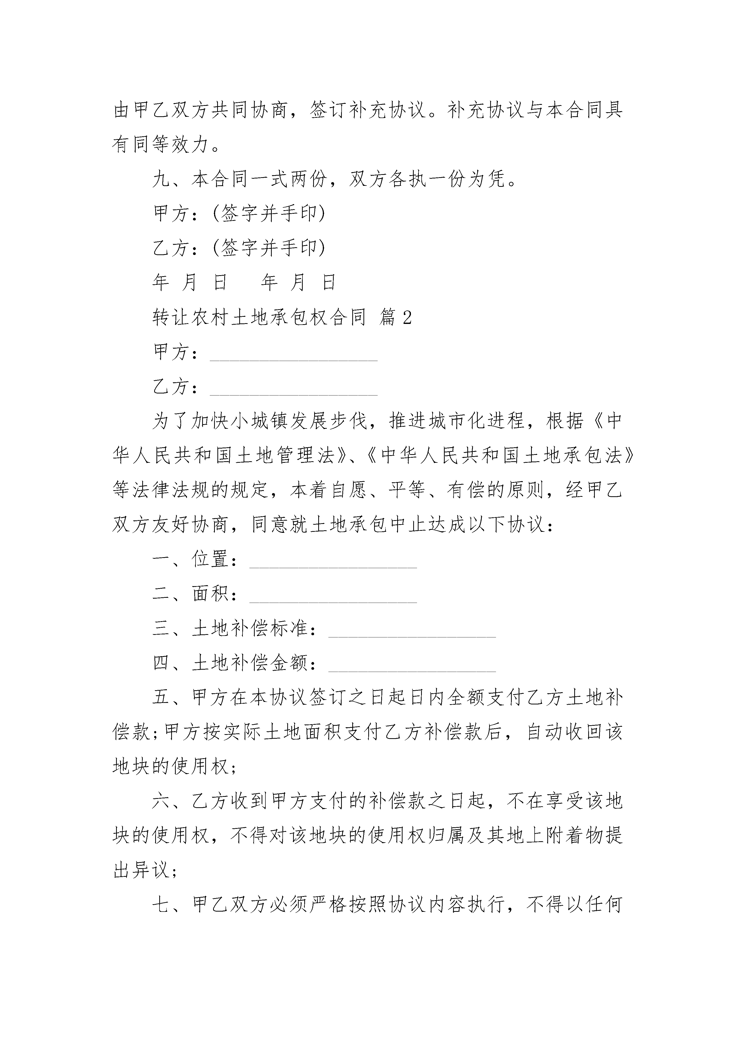 转让农村土地承包权合同转让农村土地承包权合同(通用22篇)转让农村土地承包权合同篇1甲方:住所地:乙方:住所地:公民身份号码:甲方的土地承包权转包给乙方的有关事宜,甲、乙双方经过友好协商,特签本转包合同。一、转包土地的地点:甲方自愿将与签订承包合同的坐落于的承包经营权转包给乙方。二、转包土地的期限:转包期限为五个月,自年月日起至年月日止。三、转包价格:土地转包价格为元,此款自合同生效之日起一次性交纳。四、转包土地的用途:在转包期间,乙方只能将转包土地用于农业生产,不得买卖、再次转租,不准转作宅基地和构筑其他建筑物。五、双方的权利义务:1、乙方不得改变土地用途,若自行改变土地用途,甲方有权解除转包合同。2、在不违反国家法律规定及本合同规定情况下,乙方有自主经营权。因土地经营所带来的风险由乙方自行承担。3、转包期间的土地收益归乙方所有,甲方不再享有转包土地的任何收益。4、转包期间,乙方不得再次将土地转包,否则甲方有权解除合同。六、违约责任及其他事项:1、因甲方不具有完整的土地承包经营权给乙方造成的经济损失,甲方应该予以赔偿。2、若因乙方擅自改变土地用途,致使甲方承包合同被解除,乙方应该赔偿甲方的经济损失。3、自本合同生效之日起,任何一方不得无故解约,否则应该承担对方的全部经济损失,并承担本合同约定转包价格二倍的违约金。4、乙方擅自再转包土地经营权,给甲方造成的经济损失,乙方应该予以赔偿。5、在本合同履行期内,若遇有关部门依法征地,本合同自动解除,征地收益归乙方所有。6、若遇不可抗力致使本合同无法履行,双方互不承担责任。八、本合同自双方签字之日起生效,在合同履行期间,任何一方不得擅自变更或解除合同;合同如有未尽事宜,应由甲乙双方共同协商,签订补充协议。补充协议与本合同具有同等效力。九、本合同一式两份,双方各执一份为凭。甲方:(签字并手印)乙方:(签字并手印)年月日年月日转让农村土地承包权合同篇2甲方:_________________乙方:_________________为了加快小城镇发展步伐,推进城市化进程,根据《中华人民共和国土地管理法》、《中华人民共和国土地承包法》等法律法规的规定,本着自愿、平等、有偿的原则,经甲乙双方友好协商,同意就土地承包中止达成以下协议:一、位置:_________________二、面积:_________________三、土地补偿标准:_________________四、土地补偿金额:_________________五、甲方在本协议签订之日起日内全额支付乙方土地补偿款;甲方按实际土地面积支付乙方补偿款后,自动收回该地块的使用权;六、乙方收到甲方支付的补偿款之日起,不在享受该地块的使用权,不得对该地块的使用权归属及其地上附着物提出异议;七、甲乙双方必须严格按照协议内容执行,不得以任何理由违约。甲方必须在规定的期限内全额支付乙方的补偿款,乙方不得以任何理由阻挠该地块的具体使用,若违约,违约方自行承担一切违约责任;八、本协议自协议签订之日起生效,自补偿款到位之日起执行;九、自本协议生效后,甲乙双方于年月签订的土地租赁协议自动解除;十、本协议未尽事宜由双方协商解决;十一、本协议一式三份,张湾乡政府和甲乙双方各持一份。甲方:_________________(签章)乙方:_________________(签章)_____年_____月_____日转让农村土地承包权合同篇3甲方(发包方):乙方(承包方):根据《中华人民共和国农村土地承包法》、《江苏省农村土地承包经营权保护条例》、农业部《中华人民共和国农村土地承包经营权证管理办法》及中央和省有关政策规定,为完善、规范土地二轮承包管理,保护农村土地承包权益,特订立本合同。一、承包标的和期限甲方将本集体经济组织第村民组农村集体所有的亩土地发包给乙方承包,从事农业生产。土地二轮承包期限二、甲方的权利与义务:1、监督乙方依照承包合同约定的用途合理利用和保护土地,制止乙方损害承包地和农业资源的行为。2、维护乙方的土地承包经营权,不得非法变更、解除承包合同。3、尊重乙方的生产经营自主权,不得干涉乙方依法进行正常的生产经营活动。4、及时规范办理好因国家征收、征用、集体占用土地及农户流转土地的相关手续,搞好土地档案管理。及时调处土地承包经营中发生的矛盾和纠纷,维持正常的生产秩序。5、执行市、乡镇土地利用总体规划,组织本集体经济组织内的农业生产设施建设。6、负责申办《中华人民共和国农村土地承包经营权证》。三、乙方的权利和义务1、依法享有承包地使用、收益和土地承包经营权流转的权利,有权自主组织生产经营和处置产品。2、承包地被国家依法征收、征用和集体道路、水利建设等公益事业占用,应自觉服从,但有权依法获得相应的补偿。承包村镇规划区内耕地,因农户