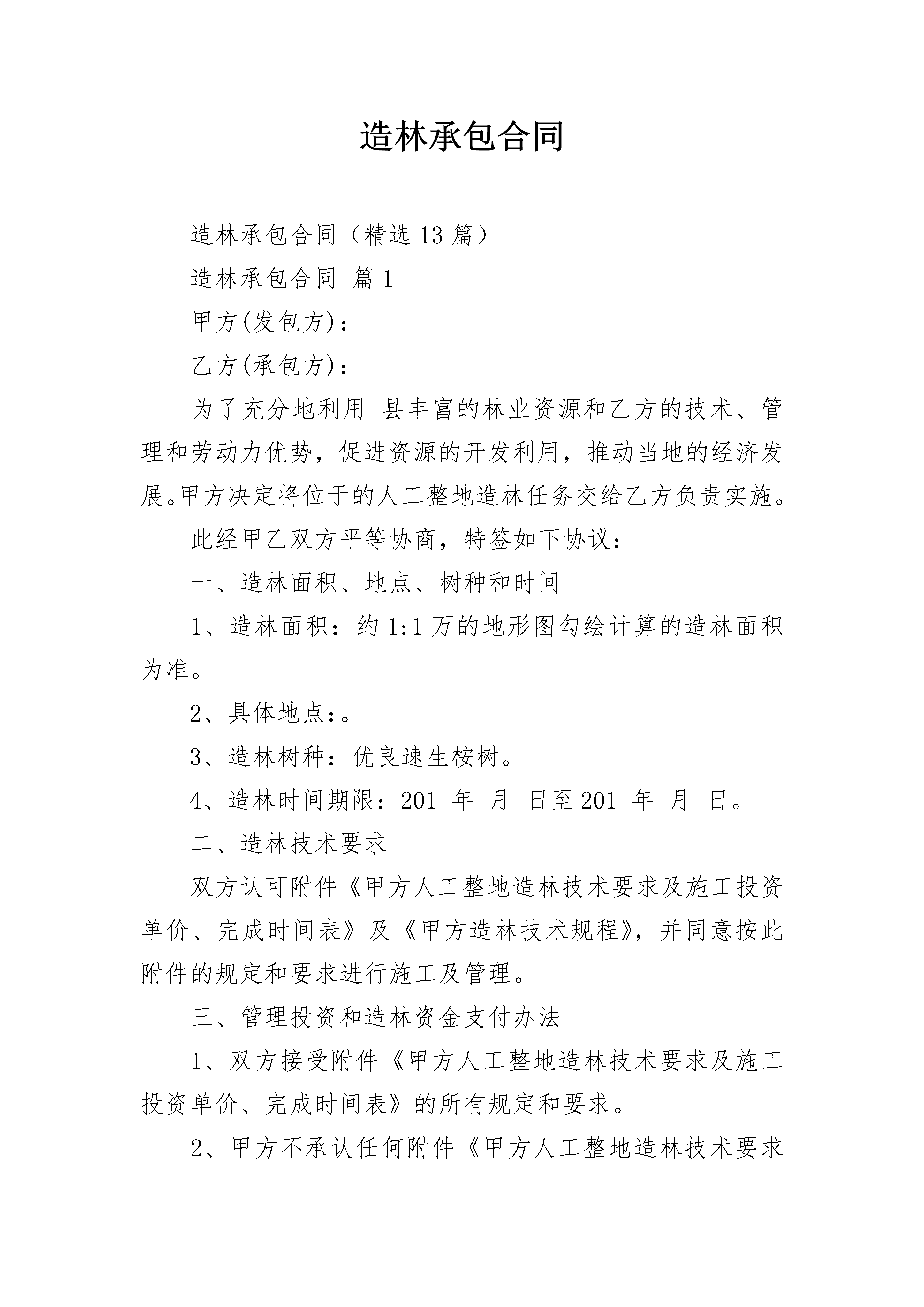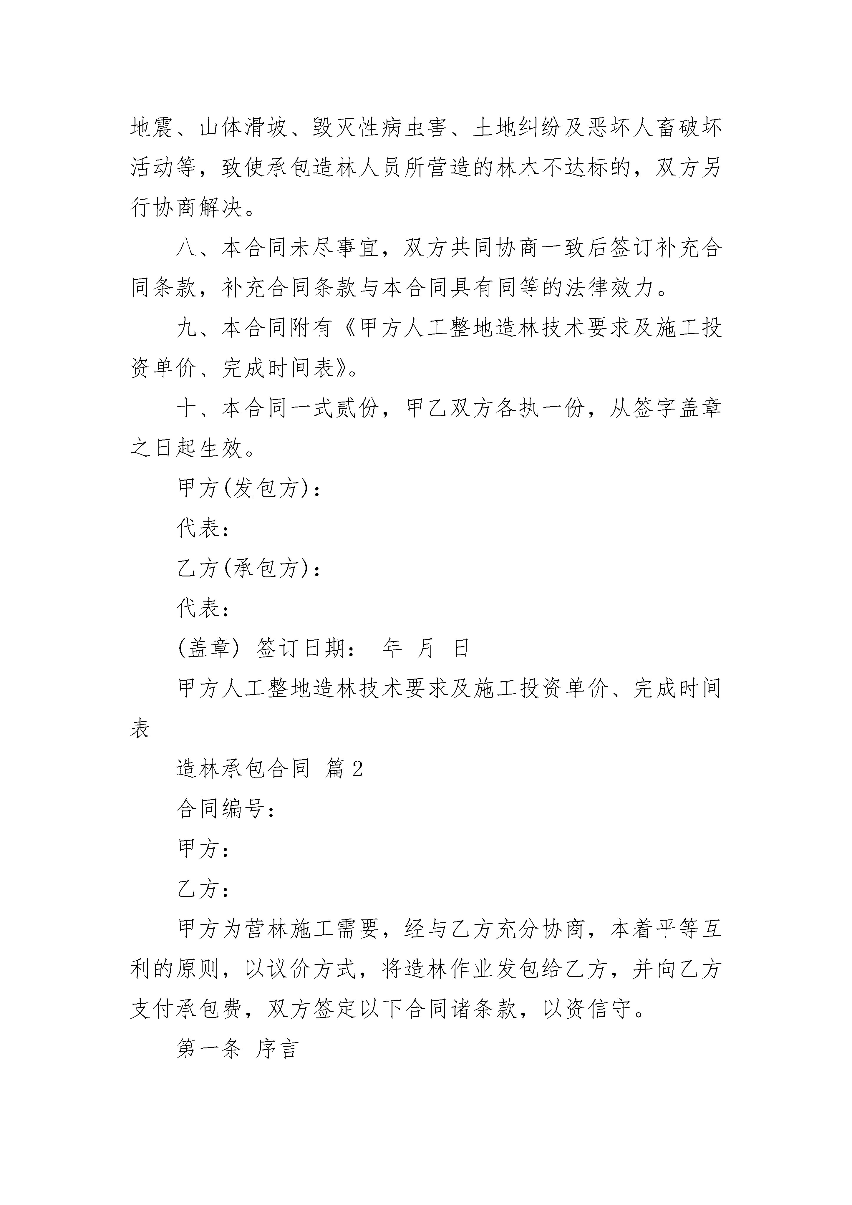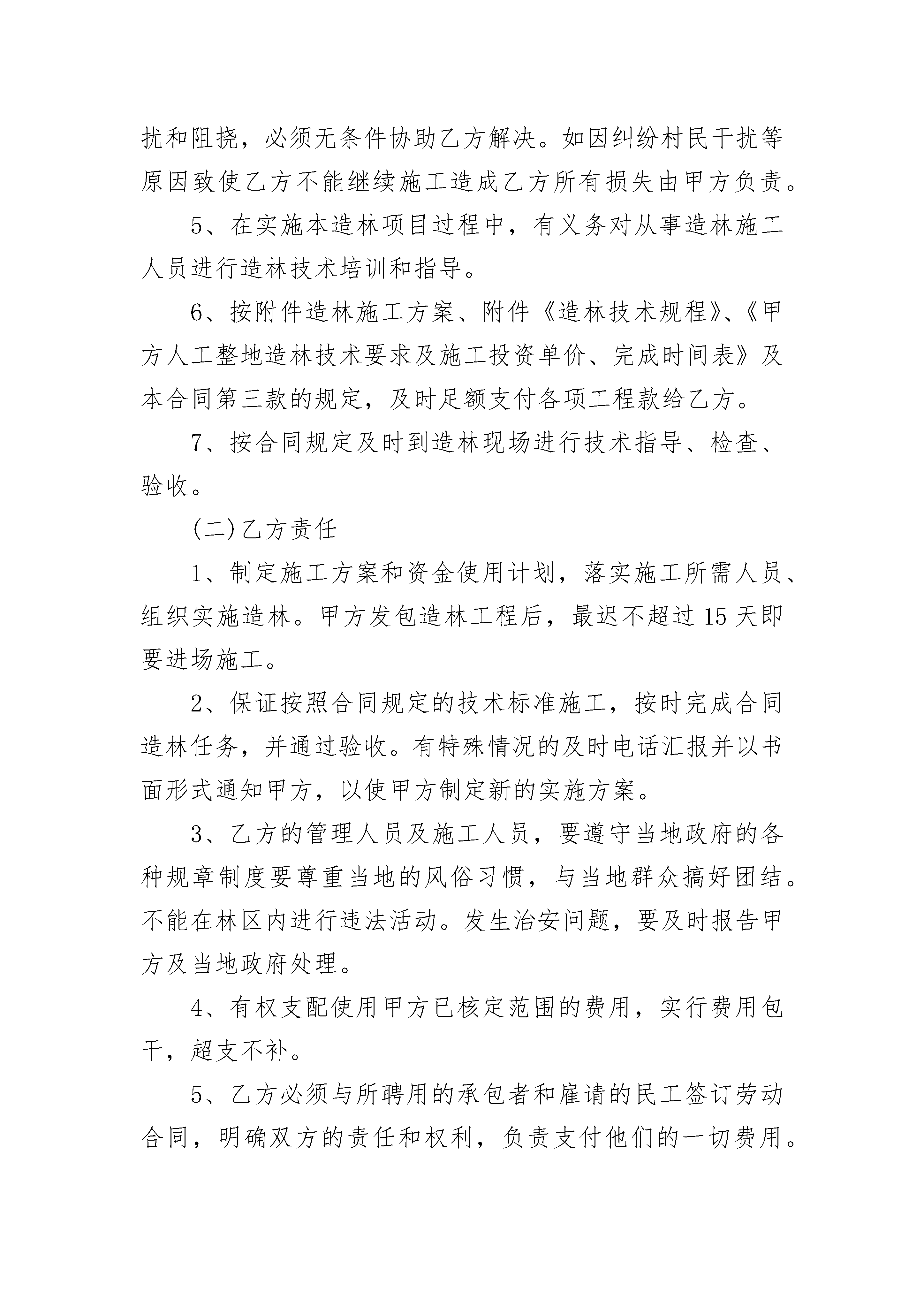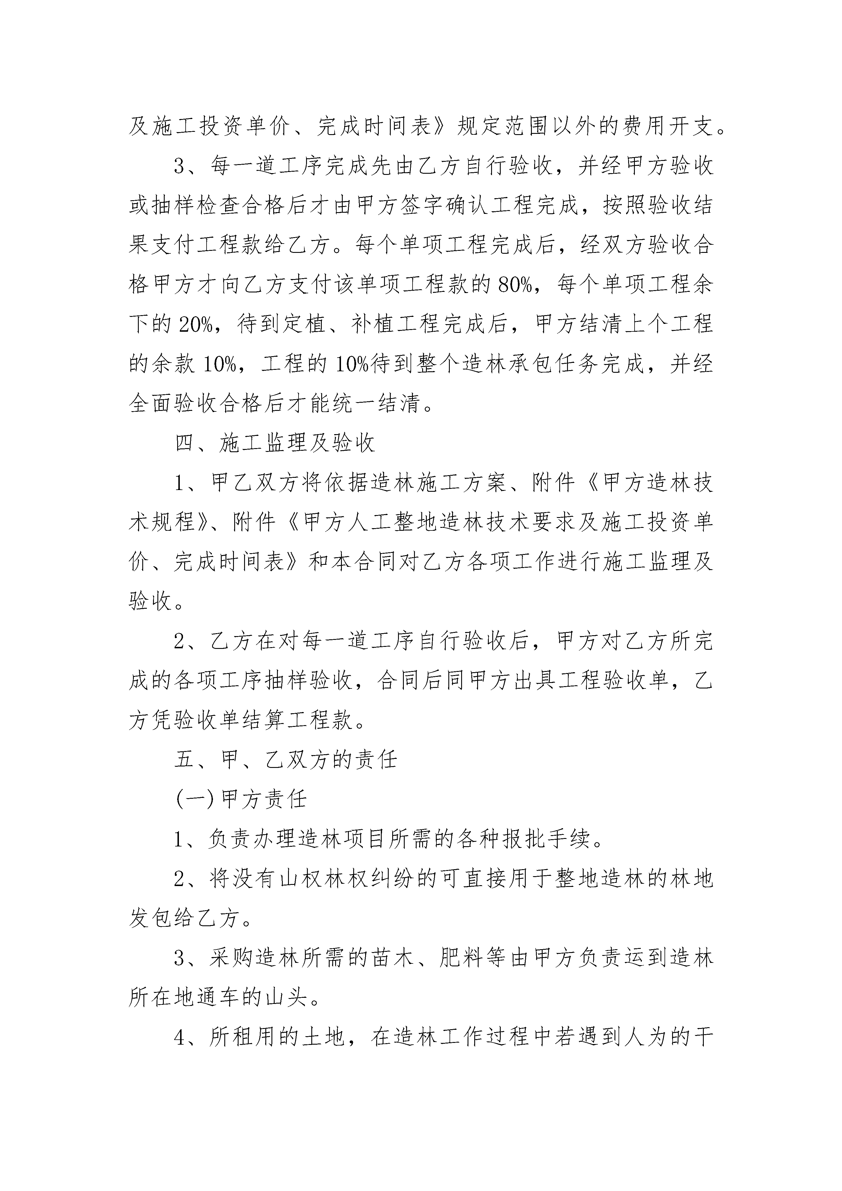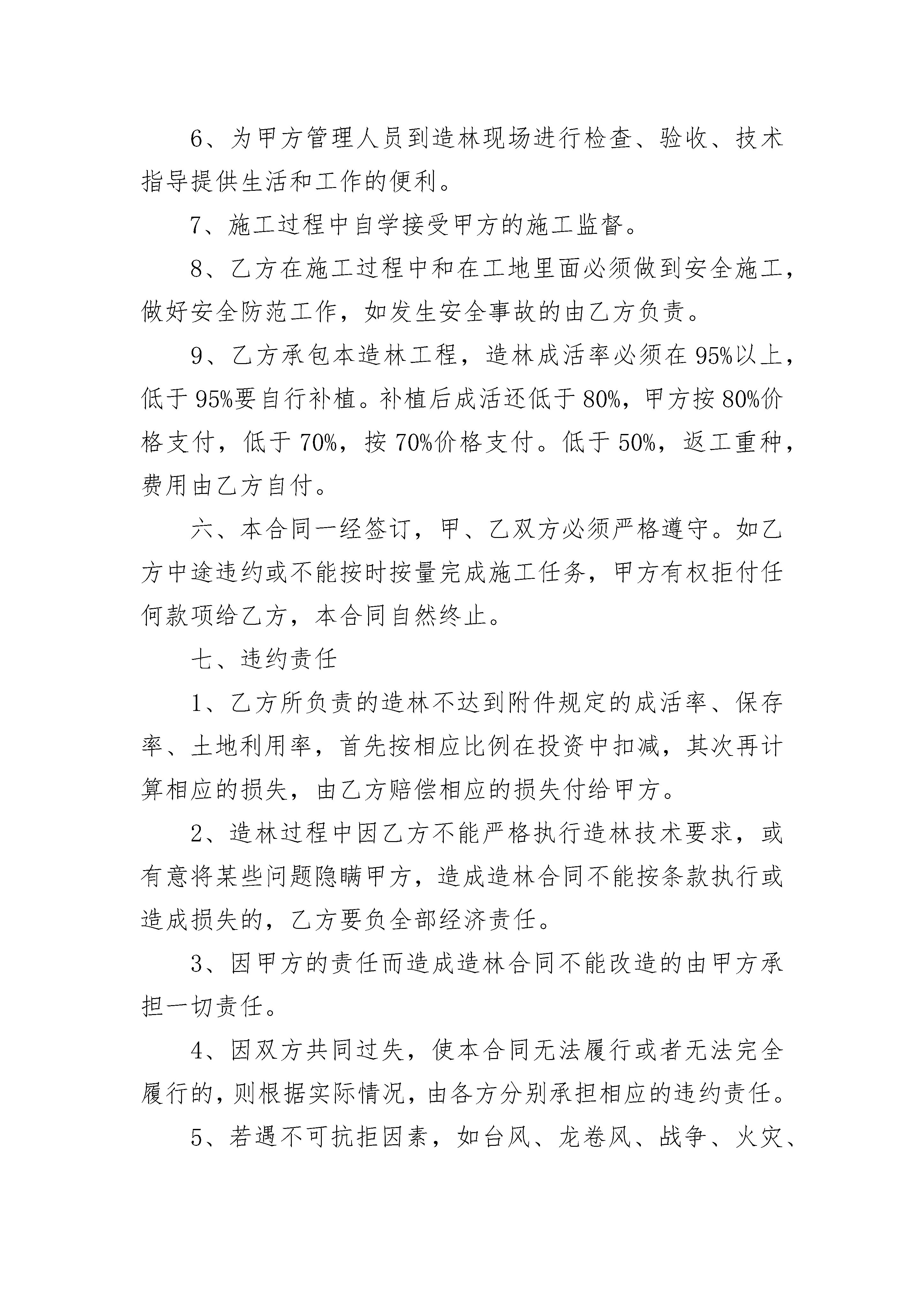 造林承包合同造林承包合同(精选13篇)造林承包合同篇1甲方(发包方):乙方(承包方):为了充分地利用县丰富的林业资源和乙方的技术、管理和劳动力优势,促进资源的开发利用,推动当地的经济发展。甲方决定将位于的人工整地造林任务交给乙方负责实施。此经甲乙双方平等协商,特签如下协议:一、造林面积、地点、树种和时间1、造林面积:约1:1万的地形图勾绘计算的造林面积为准。2、具体地点:。3、造林树种:优良速生桉树。4、造林时间期限:201年月日至201年月日。二、造林技术要求双方认可附件《甲方人工整地造林技术要求及施工投资单价、完成时间表》及《甲方造林技术规程》,并同意按此附件的规定和要求进行施工及管理。三、管理投资和造林资金支付办法1、双方接受附件《甲方人工整地造林技术要求及施工投资单价、完成时间表》的所有规定和要求。2、甲方不承认任何附件《甲方人工整地造林技术要求及施工投资单价、完成时间表》规定范围以外的费用开支。3、每一道工序完成先由乙方自行验收,并经甲方验收或抽样检查合格后才由甲方签字确认工程完成,按照验收结果支付工程款给乙方。每个单项工程完成后,经双方验收合格甲方才向乙方支付该单项工程款的80%,每个单项工程余下的20%,待到定植、补植工程完成后,甲方结清上个工程的余款10%,工程的10%待到整个造林承包任务完成,并经全面验收合格后才能统一结清。四、施工监理及验收1、甲乙双方将依据造林施工方案、附件《甲方造林技术规程》、附件《甲方人工整地造林技术要求及施工投资单价、完成时间表》和本合同对乙方各项工作进行施工监理及验收。2、乙方在对每一道工序自行验收后,甲方对乙方所完成的各项工序抽样验收,合同后同甲方出具工程验收单,乙方凭验收单结算工程款。五、甲、乙双方的责任(一)甲方责任1、负责办理造林项目所需的各种报批手续。2、将没有山权林权纠纷的可直接用于整地造林的林地发包给乙方。3、采购造林所需的苗木、肥料等由甲方负责运到造林所在地通车的山头。4、所租用的土地,在造林工作过程中若遇到人为的干扰和阻挠,必须无条件协助乙方解决。如因纠纷村民干扰等原因致使乙方不能继续施工造成乙方所有损失由甲方负责。5、在实施本造林项目过程中,有义务对从事造林施工人员进行造林技术培训和指导。6、按附件造林施工方案、附件《造林技术规程》、《甲方人工整地造林技术要求及施工投资单价、完成时间表》及本合同第三款的规定,及时足额支付各项工程款给乙方。7、按合同规定及时到造林现场进行技术指导、检查、验收。(二)乙方责任1、制定施工方案和资金使用计划,落实施工所需人员、组织实施造林。甲方发包造林工程后,最迟不超过15天即要进场施工。2、保证按照合同规定的技术标准施工,按时完成合同造林任务,并通过验收。有特殊情况的及时电话汇报并以书面形式通知甲方,以使甲方制定新的实施方案。3、乙方的管理人员及施工人员,要遵守当地政府的各种规章制度要尊重当地的风俗习惯,与当地群众搞好团结。不能在林区内进行违法活动。发生治安问题,要及时报告甲方及当地政府处理。4、有权支配使用甲方已核定范围的费用,实行费用包干,超支不补。5、乙方必须与所聘用的承包者和雇请的民工签订劳动合同,明确双方的责任和权利,负责支付他们的一切费用。6、为甲方管理人员到造林现场进行检查、验收、技术指导提供生活和工作的便利。7、施工过程中自学接受甲方的施工监督。8、乙方在施工过程中和在工地里面必须做到安全施工,做好安全防范工作,如发生安全事故的由乙方负责。9、乙方承包本造林工程,造林成活率必须在95%以上,低于95%要自行补植。补植后成活还低于80%,甲方按80%价格支付,低于70%,按70%价格支付。低于50%,返工重种,费用由乙方自付。六、本合同一经签订,甲、乙双方必须严格遵守。如乙方中途违约或不能按时按量完成施工任务,甲方有权拒付任何款项给乙方,本合同自然终止。七、违约责任1、乙方所负责的造林不达到附件规定的成活率、保存率、土地利用率,首先按相应比例在投资中扣减,其次再计算相应的损失,由乙方赔偿相应的损失付给甲方。2、造林过程中因乙方不能严格执行造林技术要求,或有意将某些问题隐瞒甲方,造成造林合同不能按条款执行或造成损失的,乙方要负全部经济责任。3、因甲方的责任而造成造林合同不能改造的由甲方承担一切责任。4、因双方共同过失,使本合同无法履行或者无法完全履行的,则根据实际情况,由各方分别承担相应的违约责任。5、若遇不可抗拒因素,如台风、龙卷风、战争、火灾、地震、山体滑坡、毁灭性病虫害、土地纠纷及恶坏人畜破坏活动等,致使承包造林人员所营造的林木不达标的,双方另行协商解决。八、本合同未尽事宜,双方共同协商一致后签订补充合同条款,补充合同条款与本合同具有同等的法律效力。九、本合同附有《甲方人工整地造林技术要求及施工投资单价、完成时