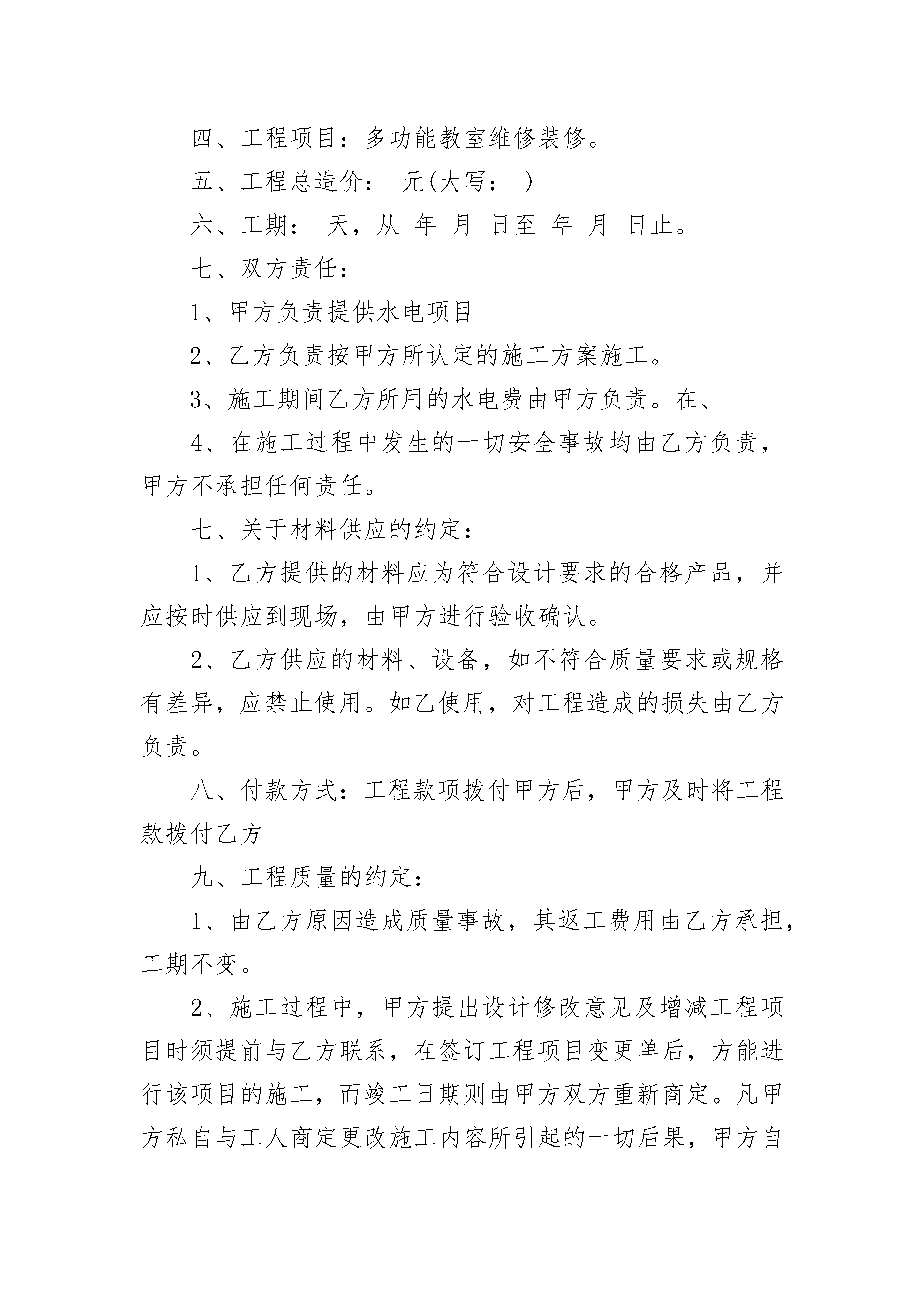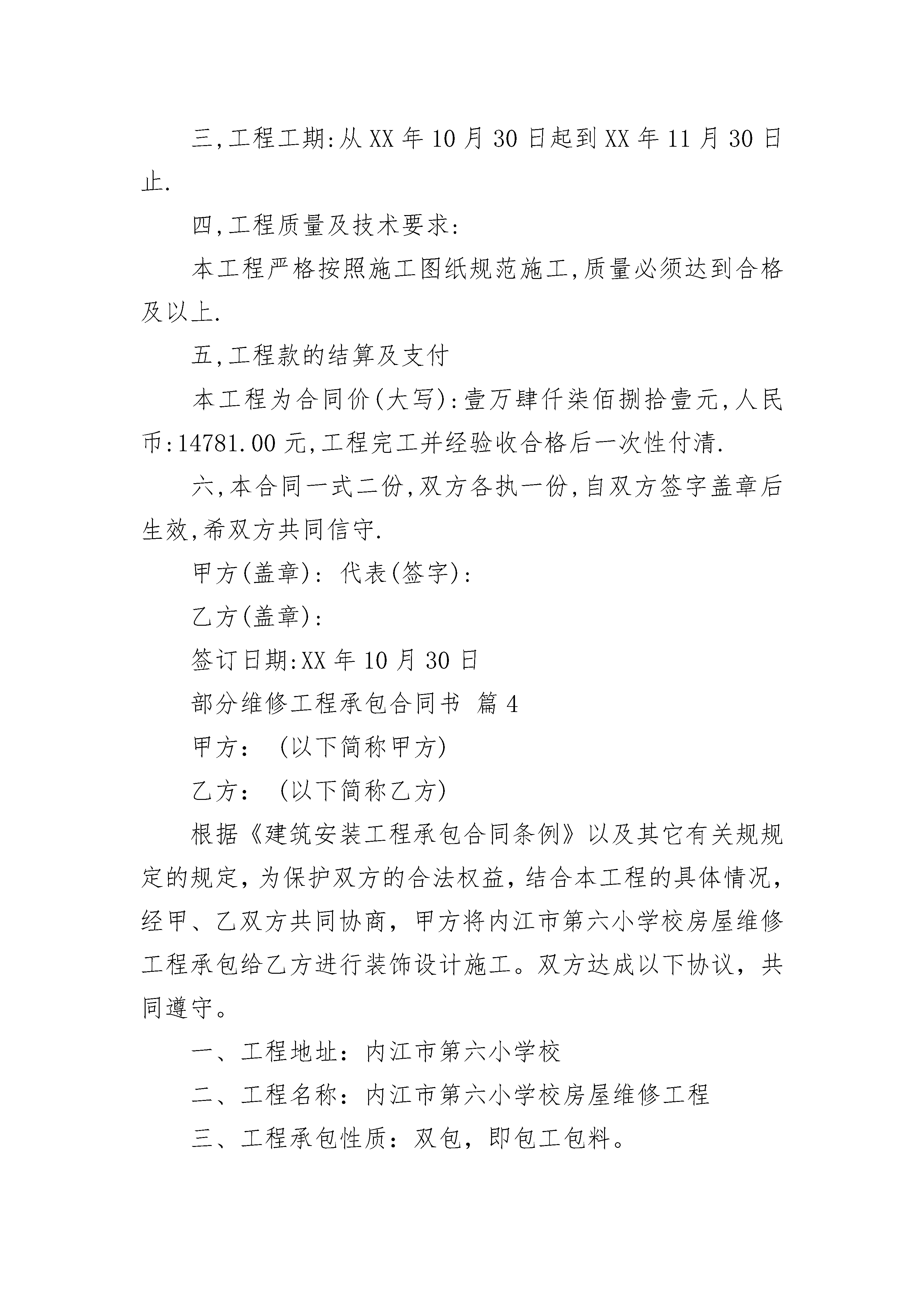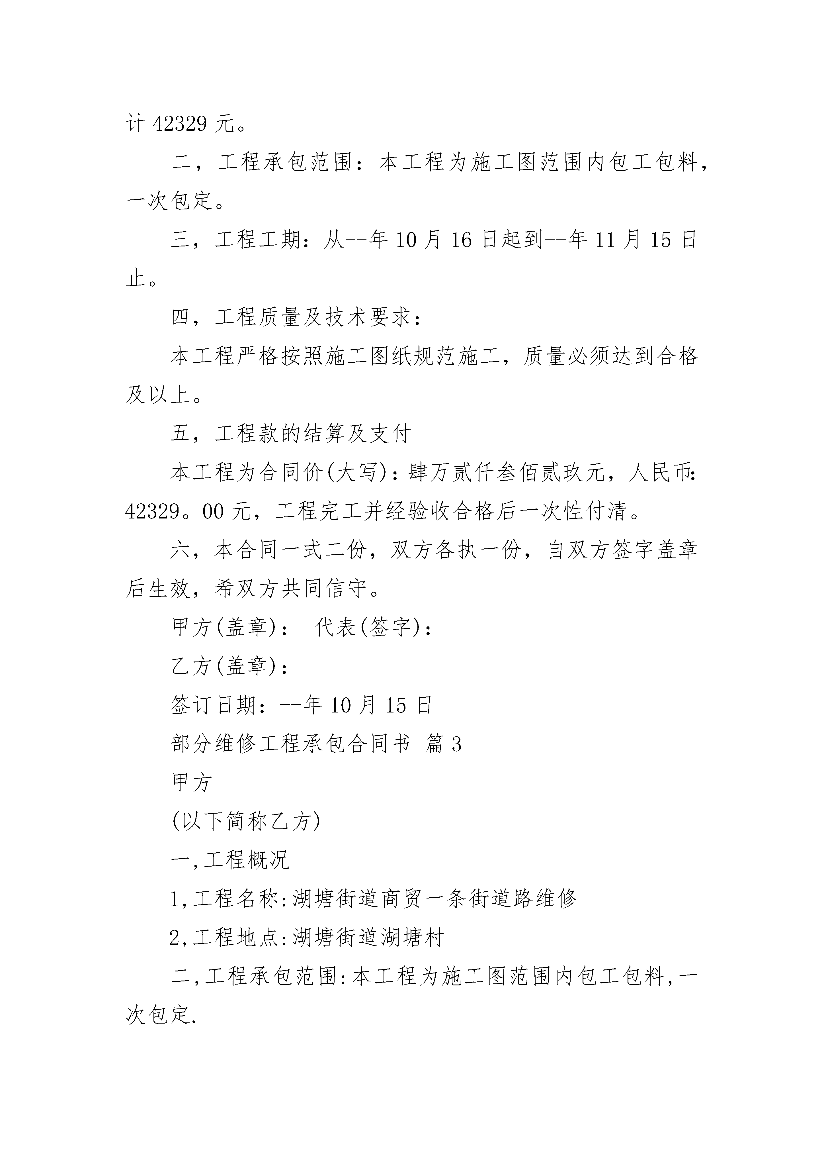 部分维修工程承包合同书部分维修工程承包合同书(精选20篇)部分维修工程承包合同书篇1甲方:乙方:甲方将年期间的部分维修工程(每次的预算工程造价在元以内)发包给乙方施工,经甲乙双方平等友好协商,签订以下合同:一、工程地点:随甲方指定的施工任务确定,在主城区范围。二、工程内容:三、工期:四、本合同有效期:在双方签字盖章之日起至年月日止。五、承包方式和质量标准:或包工包料,或单包工,质量合格。执行现行国家规范、标准。六、工程价款和结算方式:以派工单上的约定为准。七、付款方式:施工完毕经甲方验收合格后,凭发票一周内付清全款。双方责任:(一)、甲方责任:1、协调工作由甲方负责。2、按时支付工程款。(二)、乙方责任:1、按照双方确定的维修方案,按时完成施工任务;工程保修期1年(如法律法规规定保修期超过一年的执行法律法规的规定),保修期负责无偿保修。2、按规范要求组织施工;负责对施工人员进行安全教育和监督;采取安全措施,做到安全文明施工。现场若发生任何安全事故,概由乙方承担全部责任。3、乙方全权委托:履行本合同。八、违约责任:按《民法典》有关规定执行。九、本合同双方签字盖章生效,本合同一式肆份,甲方叁份乙方一份。甲方(公章):_________乙方(公章):_________法定代表人(签字):_________法定代表人(签字):__________________年____月____日_________年____月____日部分维修工程承包合同书篇2湖塘街道办事处(以下简称甲方)立协双方:朱炎林(以下简称乙方)一,工程概况1,工程名称:湖塘街道农贸市场钢棚2,工程地点:湖塘街道湖塘村3,工程内容:搭钢棚229。87平方,每平方160元,计36779。00元,搭铁架子4500元,浇水泥板1050元,合计42329元。二,工程承包范围:本工程为施工图范围内包工包料,一次包定。三,工程工期:从--年10月16日起到--年11月15日止。四,工程质量及技术要求:本工程严格按照施工图纸规范施工,质量必须达到合格及以上。五,工程款的结算及支付本工程为合同价(大写):肆万贰仟叁佰贰玖元,人民币:42329。00元,工程完工并经验收合格后一次性付清。六,本合同一式二份,双方各执一份,自双方签字盖章后生效,希双方共同信守。甲方(盖章):代表(签字):乙方(盖章):签订日期:--年10月15日部分维修工程承包合同书篇3甲方(以下简称乙方)一,工程概况1,工程名称:湖塘街道商贸一条街道路维修2,工程地点:湖塘街道湖塘村二,工程承包范围:本工程为施工图范围内包工包料,一次包定.三,工程工期:从XX年10月30日起到XX年11月30日止.四,工程质量及技术要求:本工程严格按照施工图纸规范施工,质量必须达到合格及以上.五,工程款的结算及支付本工程为合同价(大写):壹万肆仟柒佰捌拾壹元,人民币:14781.00元,工程完工并经验收合格后一次性付清.六,本合同一式二份,双方各执一份,自双方签字盖章后生效,希双方共同信守.甲方(盖章):代表(签字):乙方(盖章):签订日期:XX年10月30日部分维修工程承包合同书篇4甲方:(以下简称甲方)乙方:(以下简称乙方)根据《建筑安装工程承包合同条例》以及其它有关规规定的规定,为保护双方的合法权益,结合本工程的具体情况,经甲、乙双方共同协商,甲方将内江市第六小学校房屋维修工程承包给乙方进行装饰设计施工。双方达成以下协议,共同遵守。一、工程地址:内江市第六小学校二、工程名称:内江市第六小学校房屋维修工程三、工程承包性质:双包,即包工包料。四、工程项目:多功能教室维修装修。五、工程总造价:元(大写:)六、工期:天,从年月日至年月日止。七、双方责任:1、甲方负责提供水电项目2、乙方负责按甲方所认定的施工方案施工。3、施工期间乙方所用的水电费由甲方负责。在、4、在施工过程中发生的一切安全事故均由乙方负责,甲方不承担任何责任。七、关于材料供应的约定:1、乙方提供的材料应为符合设计要求的合格产品,并应按时供应到现场,由甲方进行验收确认。2、乙方供应的材料、设备,如不符合质量要求或规格有差异,应禁止使用。如乙使用,对工程造成的损失由乙方负责。八、付款方式:工程款项拨付甲方后,甲方及时将工程款拨付乙方九、工程质量的约定:1、由乙方原因造成质量事故,其返工费用由乙方承担,工期不变。2、施工过程中,甲方提出设计修改意见及增减工程项目时须提前与乙方联系,在签订工程项目变更单后,方能进行该项目的施工,而竣工日期则由甲方双方重新商定。凡甲方私自与工人商定更改施工内容所引起的一切后果,甲方自负。由此给乙方造成的损失,甲方应予赔偿。十、有关安全生产和防火约定:甲方提供的施工说明及施工场地应符合防火防事的要求,主要包括电气线路煤气管道,自来水和其它管道畅通合