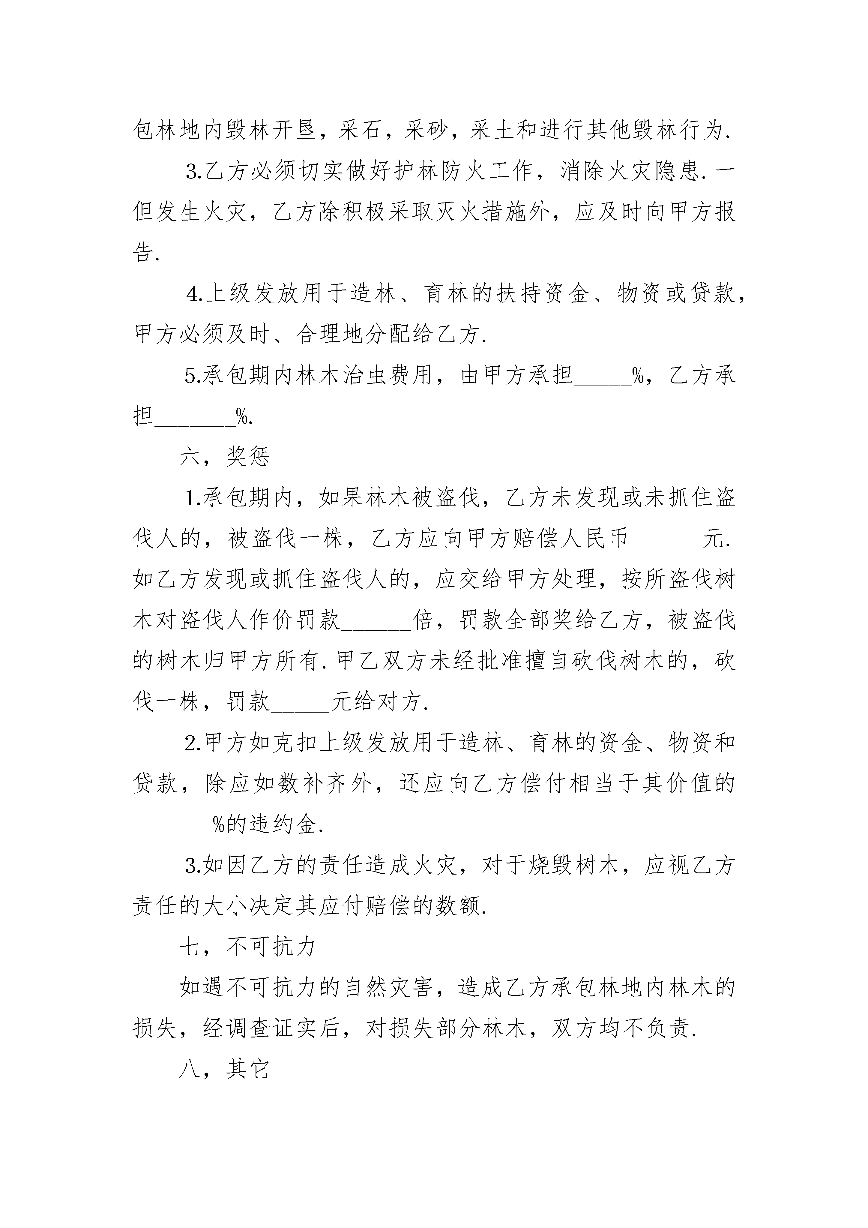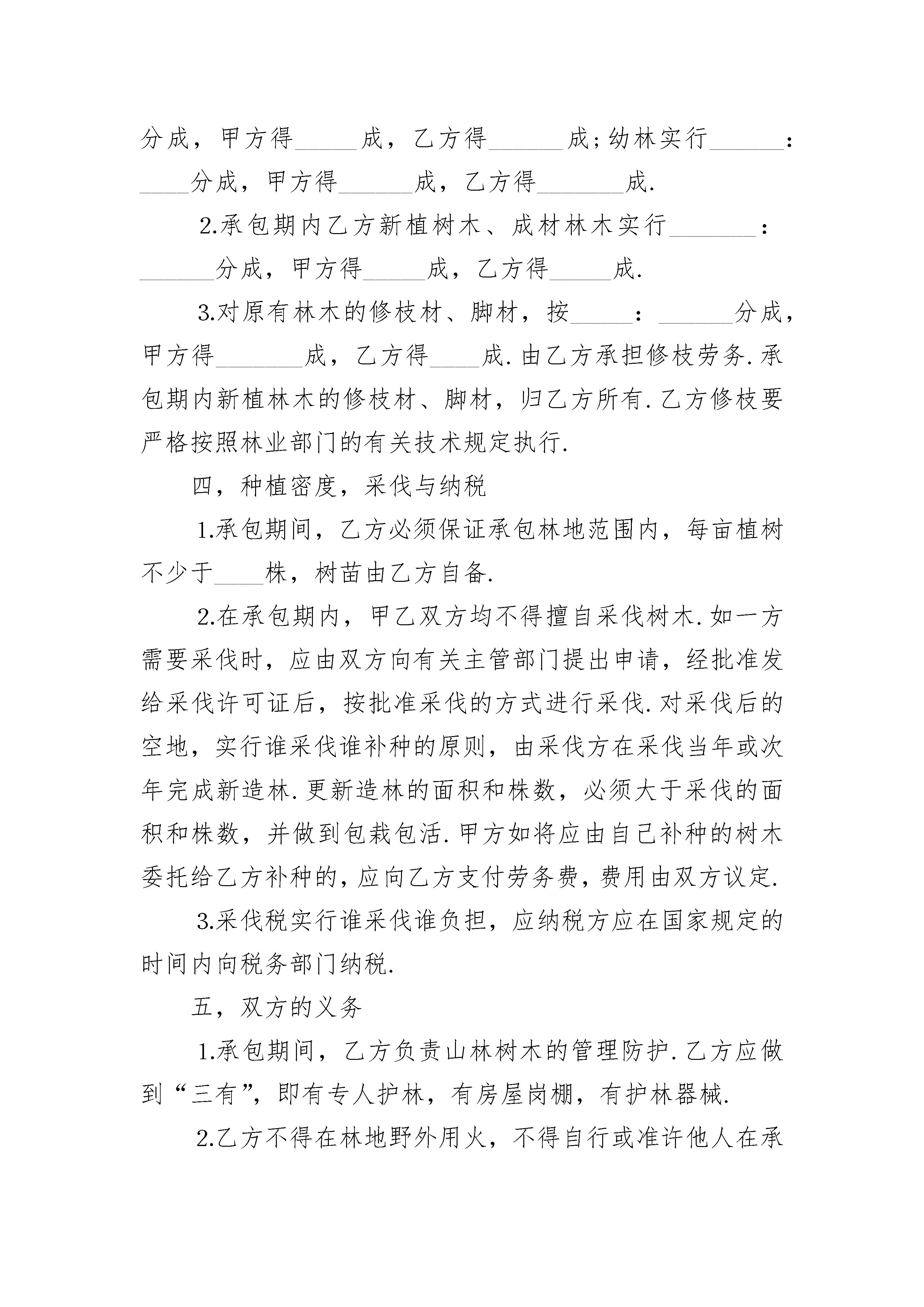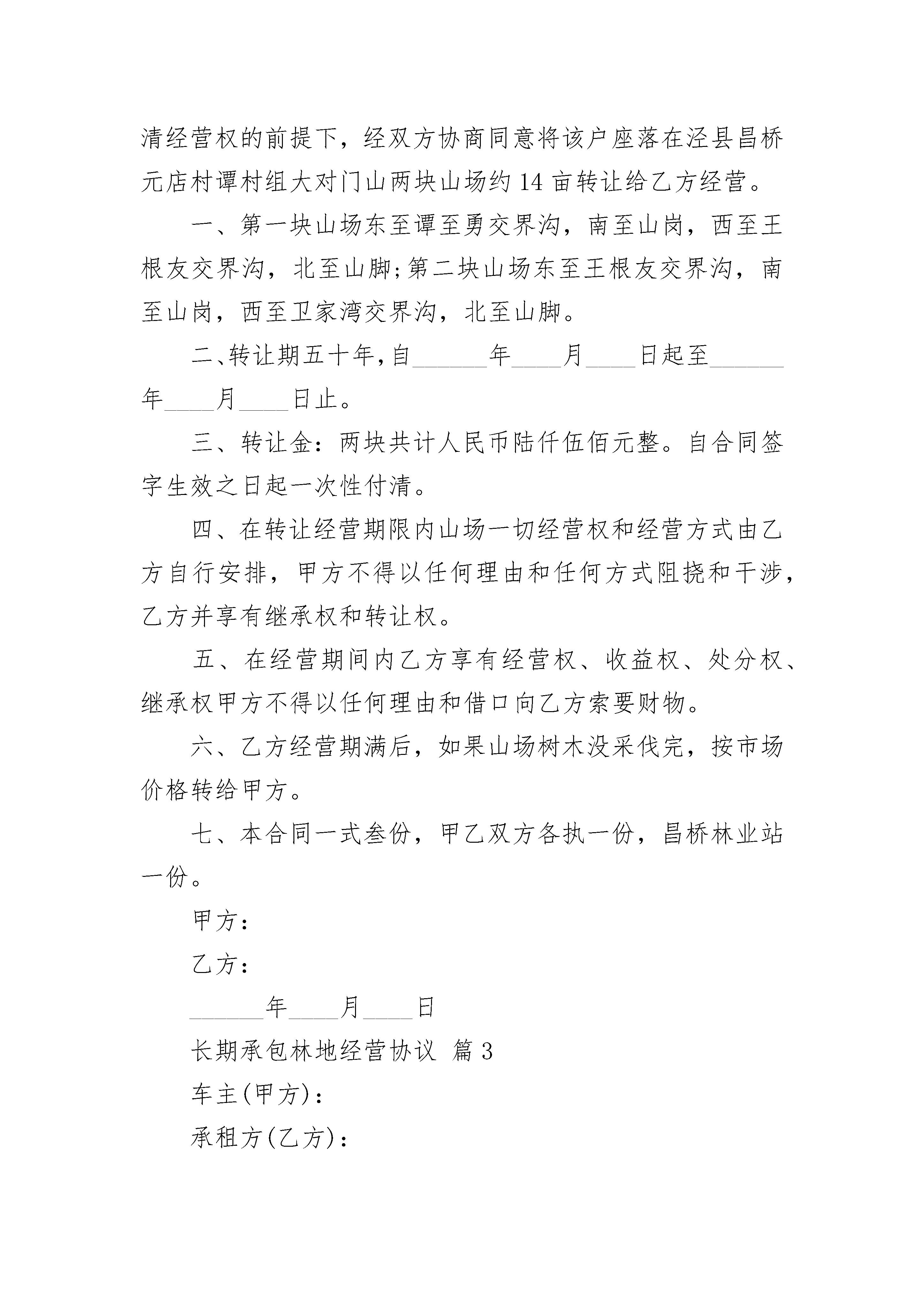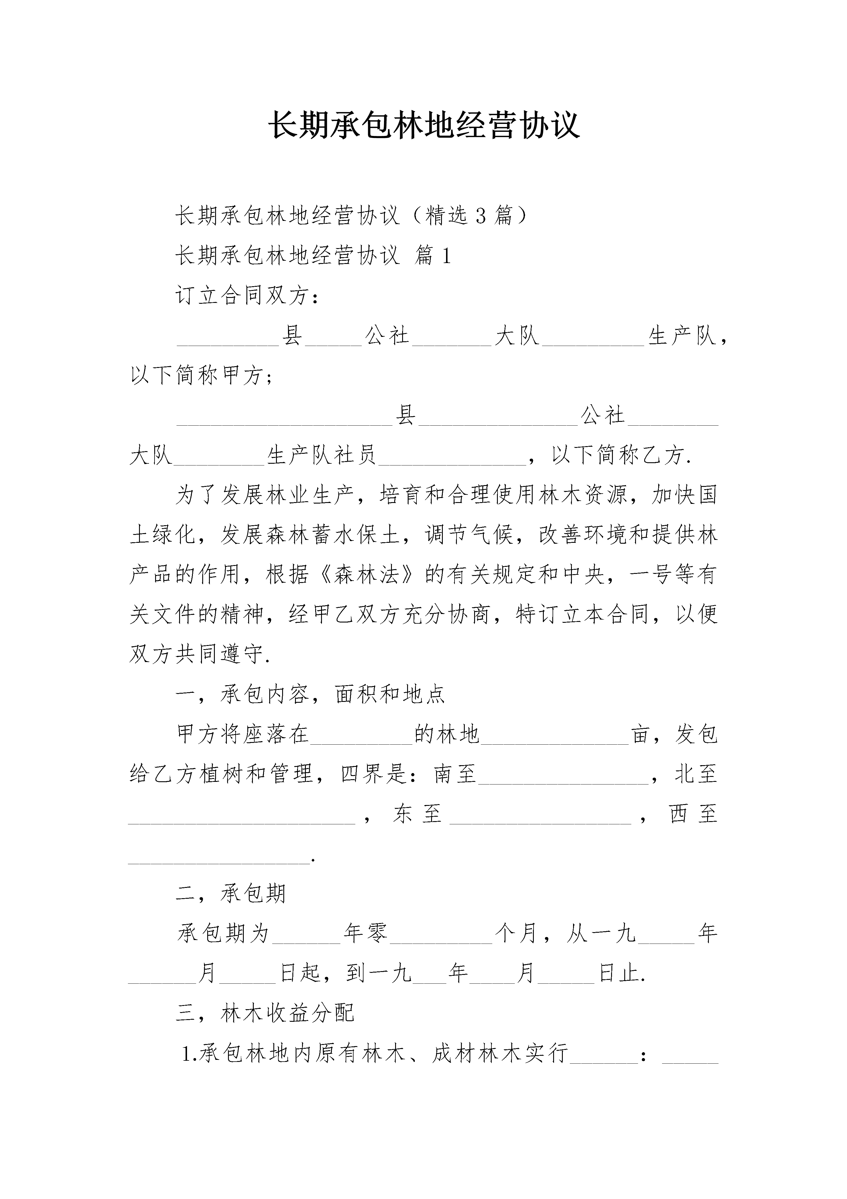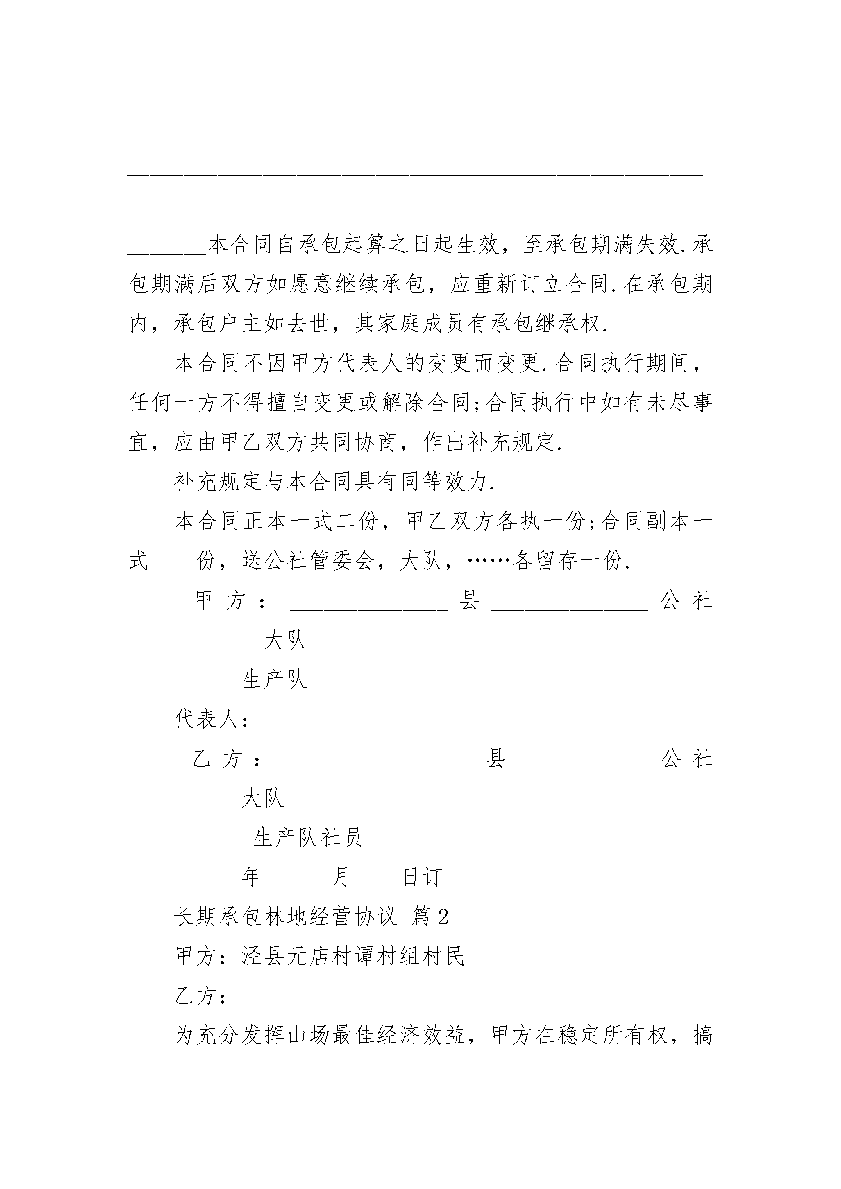 长期承包林地经营协议长期承包林地经营协议(精选3篇)长期承包林地经营协议篇1订立合同双方:_________县_____公社_______大队_________生产队,以下简称甲方;___________________县______________公社________大队________生产队社员_____________,以下简称乙方.为了发展林业生产,培育和合理使用林木资源,加快国土绿化,发展森林蓄水保土,调节气候,改善环境和提供林产品的作用,根据《森林法》的有关规定和中央,一号等有关文件的精神,经甲乙双方充分协商,特订立本合同,以便双方共同遵守.一,承包内容,面积和地点甲方将座落在_________的林地_____________亩,发包给乙方植树和管理,四界是:南至_______________,北至____________________,东至________________,西至________________.二,承包期承包期为______年零_________个月,从一九_____年______月_____日起,到一九___年____月_____日止.三,林木收益分配⒈承包林地内原有林木、成材林木实行______:_____分成,甲方得_____成,乙方得______成;幼林实行______:____分成,甲方得______成,乙方得_______成.⒉承包期内乙方新植树木、成材林木实行_______:______分成,甲方得_____成,乙方得_____成.⒊对原有林木的修枝材、脚材,按_____:______分成,甲方得_______成,乙方得____成.由乙方承担修枝劳务.承包期内新植林木的修枝材、脚材,归乙方所有.乙方修枝要严格按照林业部门的有关技术规定执行.四,种植密度,采伐与纳税⒈承包期间,乙方必须保证承包林地范围内,每亩植树不少于____株,树苗由乙方自备.⒉在承包期内,甲乙双方均不得擅自采伐树木.如一方需要采伐时,应由双方向有关主管部门提出申请,经批准发给采伐许可证后,按批准采伐的方式进行采伐.对采伐后的空地,实行谁采伐谁补种的原则,由采伐方在采伐当年或次年完成新造林.更新造林的面积和株数,必须大于采伐的面积和株数,并做到包栽包活.甲方如将应由自己补种的树木委托给乙方补种的,应向乙方支付劳务费,费用由双方议定.⒊采伐税实行谁采伐谁负担,应纳税方应在国家规定的时间内向税务部门纳税.五,双方的义务⒈承包期间,乙方负责山林树木的管理防护.乙方应做到“三有”,即有专人护林,有房屋岗棚,有护林器械.⒉乙方不得在林地野外用火,不得自行或准许他人在承包林地内毁林开垦,采石,采砂,采土和进行其他毁林行为.⒊乙方必须切实做好护林防火工作,消除火灾隐患.一但发生火灾,乙方除积极采取灭火措施外,应及时向甲方报告.⒋上级发放用于造林、育林的扶持资金、物资或贷款,甲方必须及时、合理地分配给乙方.⒌承包期内林木治虫费用,由甲方承担_____%,乙方承担_______%.六,奖惩⒈承包期内,如果林木被盗伐,乙方未发现或未抓住盗伐人的,被盗伐一株,乙方应向甲方赔偿人民币______元.如乙方发现或抓住盗伐人的,应交给甲方处理,按所盗伐树木对盗伐人作价罚款______倍,罚款全部奖给乙方,被盗伐的树木归甲方所有.甲乙双方未经批准擅自砍伐树木的,砍伐一株,罚款_____元给对方.⒉甲方如克扣上级发放用于造林、育林的资金、物资和贷款,除应如数补齐外,还应向乙方偿付相当于其价值的_______%的违约金.⒊如因乙方的责任造成火灾,对于烧毁树木,应视乙方责任的大小决定其应付赔偿的数额.七,不可抗力如遇不可抗力的自然灾害,造成乙方承包林地内林木的损失,经调查证实后,对损失部分林木,双方均不负责.八,其它_____________________________________________________________________________________________________________本合同自承包起算之日起生效,至承包期满失效.承包期满后双方如愿意继续承包,应重新订立合同.在承包期内,承包户主如去世,其家庭成员有承包继承权.本合同不因甲方代表人的变更而变更.合同执行期间,任何一方不得擅自变更或解除合同;合同执行中如有未尽事宜,应由甲乙双方共同协商,作出补充规定.补充规定与本合同具有同等效力.本合同正本一式二份,甲乙双方各执一份;合同副本一式____份,送公社管委会,大队,……各留存一份.甲方:______________县______________公社____________大队______生产队__________代表人:_______________乙方:_________________县__