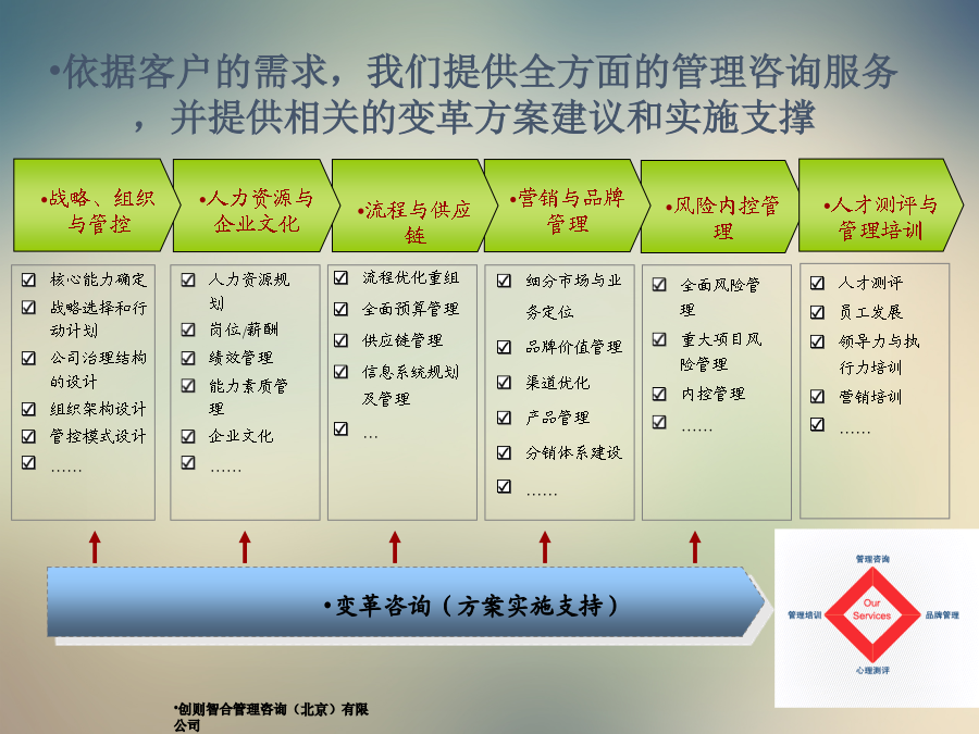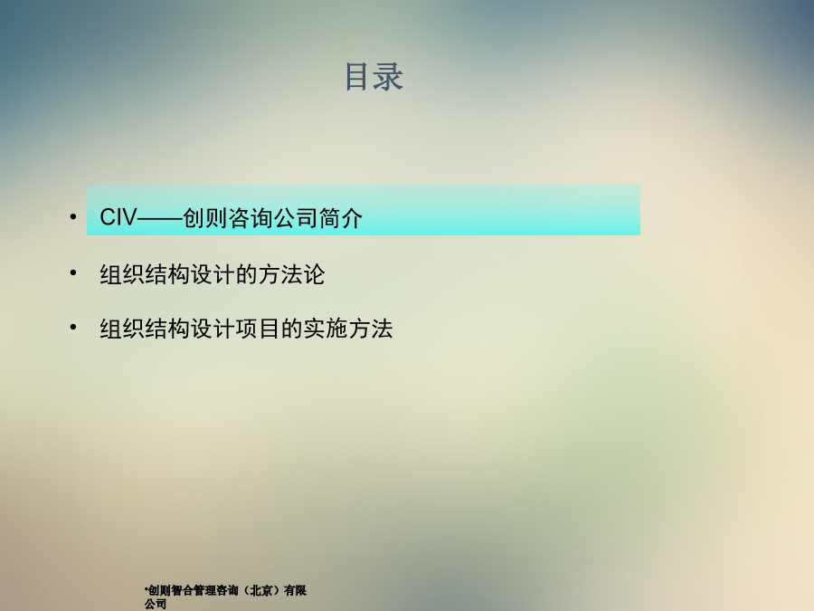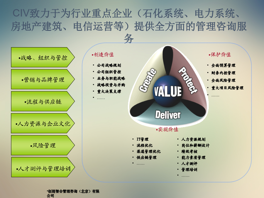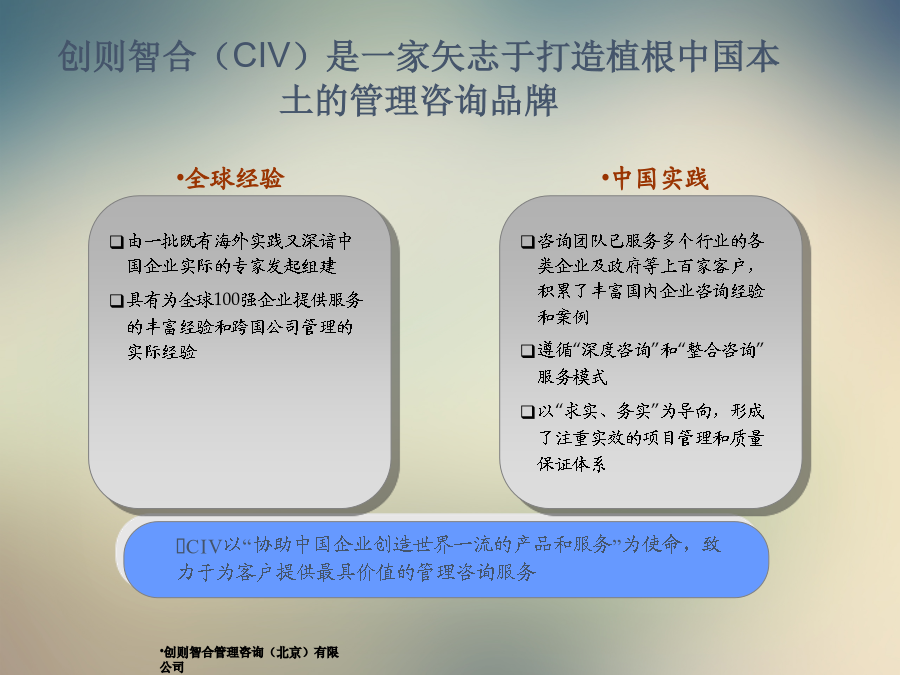 16十一月2024创则智合(CIV)是一家矢志于打造植根中国本土的管理咨询品牌CIV致力于为行业重点企业(石化系统、电力系统、房地产建筑、电信运营等)提供全方面的管理咨询服务依据客户的需求,我们提供全方面的管理咨询服务,并提供相关的变革方案建议和实施支撑CIV咨询服务–战略具体化CIV咨询服务–业务模型设计CIV咨询服务–人力资源管理CIV咨询服务–财务管理CIV咨询服务–信息战略和规划我们的服务–变革管理组织结构的设计受到目标、环境、人员多种权变因素的影响,不存在一种绝对“最佳”的组织结构模式组织结构设计工作和其他管理系统有着密切的逻辑关系,需要确保各模块相互匹配在组织结构设计中关键之一是需要理清母子公司之间的责权划分在职权划分中需要遵循的原则组织结构中的各种结构关系对企业的运营效率和目标控制有重要的影响适度的职能专业化分工和职能分解需要达到一个最优平衡点步骤二:对组织结构的现状将从六个主要方面进行评估步骤三:设计整体的组织架构,并在设计过程中考虑良好的过渡以保证可操作性步骤四:根据组织结构,明晰各个部门及各业务板块的功能职责步骤五:进行工作岗位分析,作为人员定编的基础步骤六:根据岗位分析的结果对公司总部的职能部门定岗定编