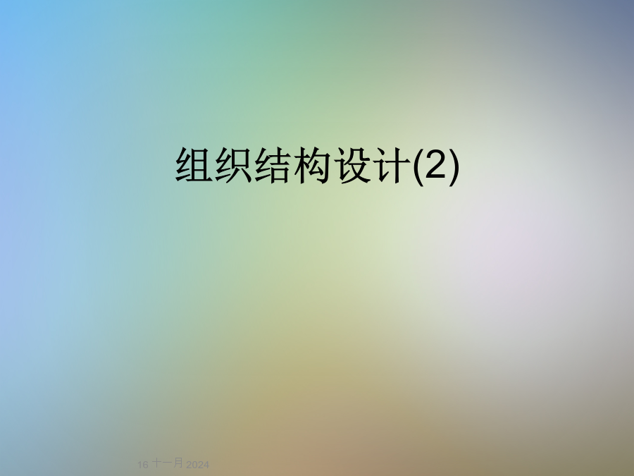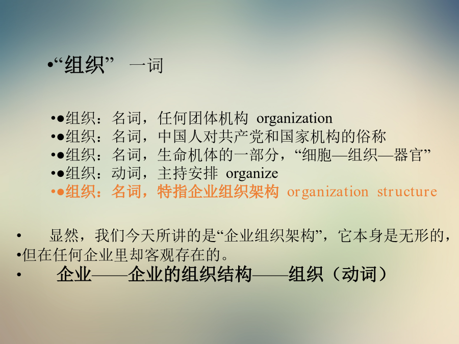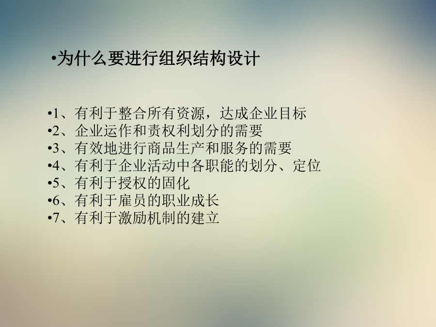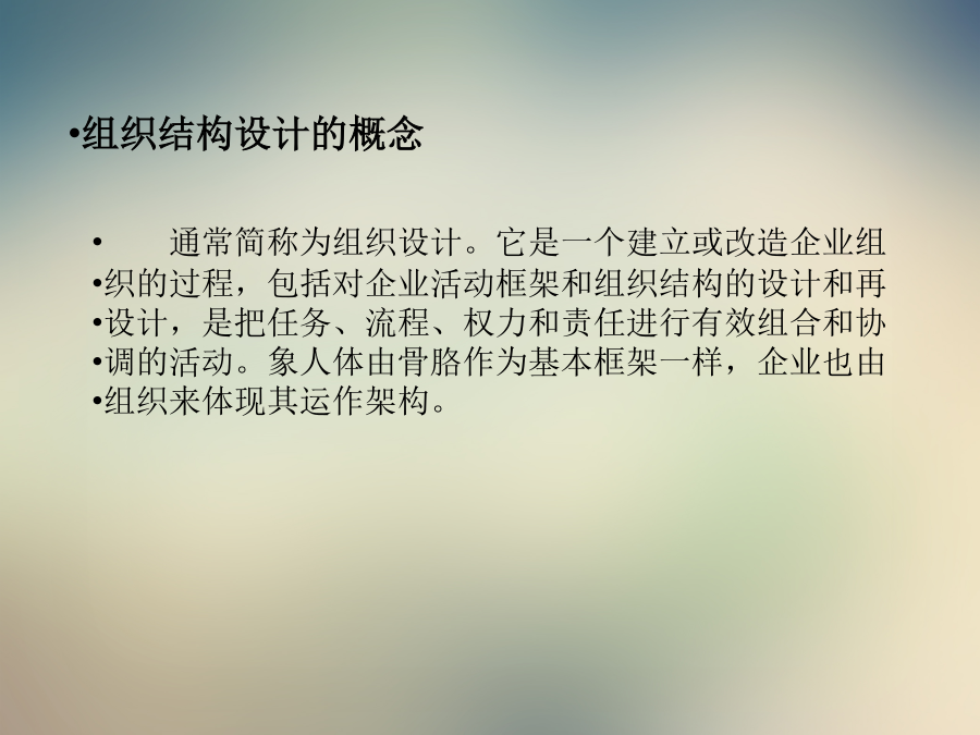 16十一月2024“组织”一词组织结构设计的概念为什么要进行组织结构设计影响组织生存的要素影响组织结构设计的因素组织设计的内容组织结构设计的原则●效率原则案例:深圳华为公司的组织设计●组织结构的建立原则●职务的设立原则在什么情况下进行组织架构设计透过公司的组织结构,可以分析出相关内容:高层的定义和主要职责中层的定义和职责基层的定义和职责计划、控制型职能部门支持、服务型职能部门组织设计的部门矛盾与冲突