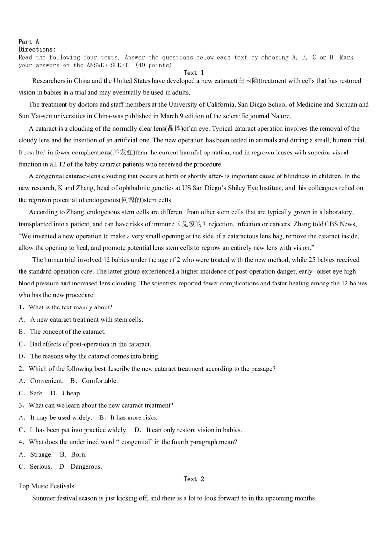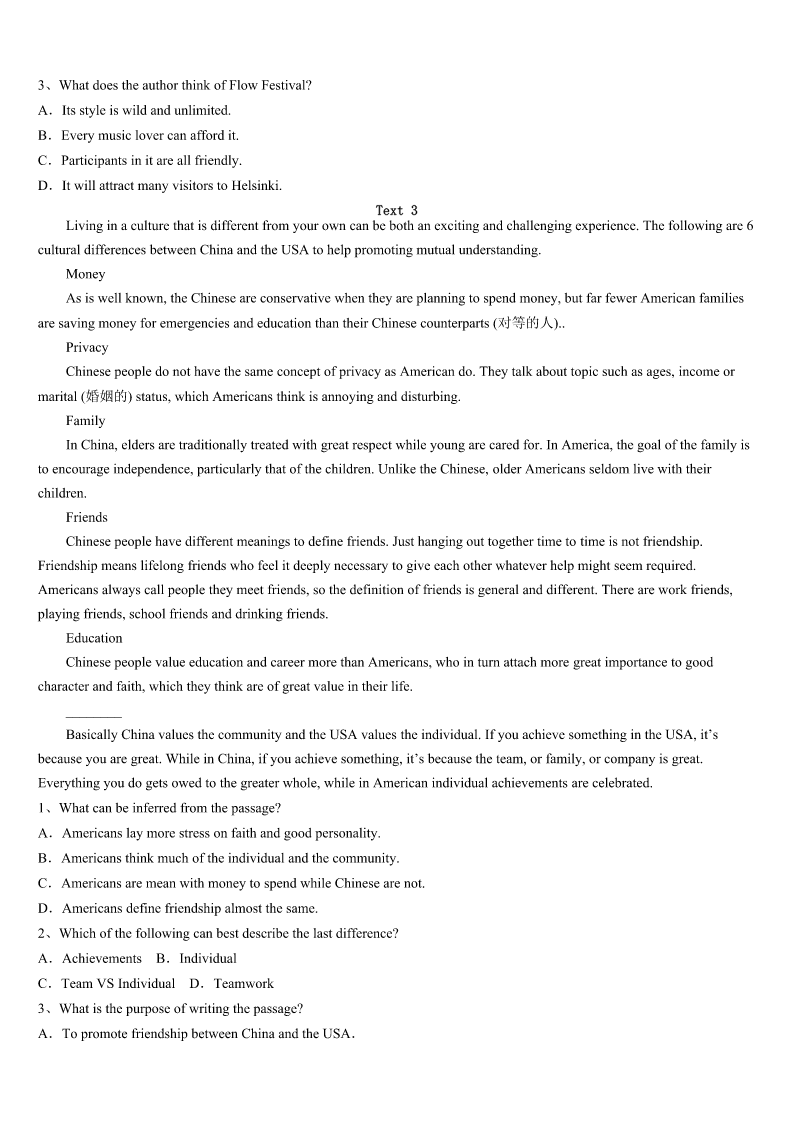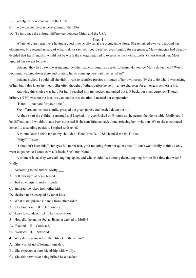 考研《英语一》哈尔滨市巴彦县2023年考前冲刺试卷 SectionIUseofEnglish Directions: Readthefollowingtext.Choosethebestword(s)foreachnumberedblankandmarkA,B,CorDonthe ANSWERSHEET.(10points) Rockywasa65-pounddog.Ritawashiseleven-year-old1.WhenRockywasgiventoher,Ritaimmediatelylikedhim. Whenevershewasnotinschool,thetwowere2togetherandwithintouchingdistance.Thefamilywouldoftenlovingly3 thepairas“RandR”. ButRockyhadone4—hefearedwaterverymuch,whichwasduetoanawfulexperiencehehadattheageofsevenweeks inhis5home.Hewasnearly6byanaughtyboywhohadbeenblamedbyhisfather. Onelateafternoon,Rita’smother7RandRtoashoppingareanearalake.Ritawasrunningalongtheboardwalkabove thesurfaceofthe8,enjoyingthebeautifulsceneryaround.Itwasthenthataboyonabicycle9Rita.Sheletoutacryof painandfellintothelake10there. Rita’smotherwasattheentranceofa11whichwasahundredfeetaway.Sherushedtothelakeshoutingforhelp.Rocky seemedto12hisfearandjumpedintothewatertosavehisowner.RockyimmediatelywenttoRitaand13herbythe shoulder’sclothes.Thiscausedherto14sothatherfacewasoutofthewaterandshecoughed.15,thewaterwascalm, theywerenotfarfrom16,andRockyquicklyreachedadepthwherehis17wereonsolidground.HedraggedRita18 herheadwascompletelyoutofthewater,andthenstood19her,licking(舔)herface. Ritaandherfamilybelievethatitwasonlythebigdog’s20forthelittlegirlthatcausedhimtotakeactionthatmightbe life-threatening. 1、A.friendB.guardC.ownerD.trainer 2、A.sometimesB.seldomC.oftenD.always 3、A.recognizeB.refertoC.considerD.laughat 4、A.shortcomingB.habitC.mistakeD.pain 5、A.comfortableB.poorC.previousD.new 6、A.killedB.drownedC.ruinedD.abandoned 7、A.tookB.accompaniedC.followedD.sent 8、A.iceB.snowC.waterD.frost 9、A.beatB.metC.hurtD.hit 10、A.lyingB.swimmingC.pushingD.floating 11、A.parkB.gardenC.storeD.theater 12、A.overcomeB.easeC.senseD.realize 13、A.comfortedB.seizedC.rescuedD.approached 14、A.rolloverB.showoffC.lookupD.turnaround 15、A.UnexpectedlyB.HopefullyC.FortunatelyD.Eventually 16、A.ashelterB.dangerC.arockD.shore 17、A.armsB.feetC.legsD.hands 18、A.untilB.beforeC.afterD.o