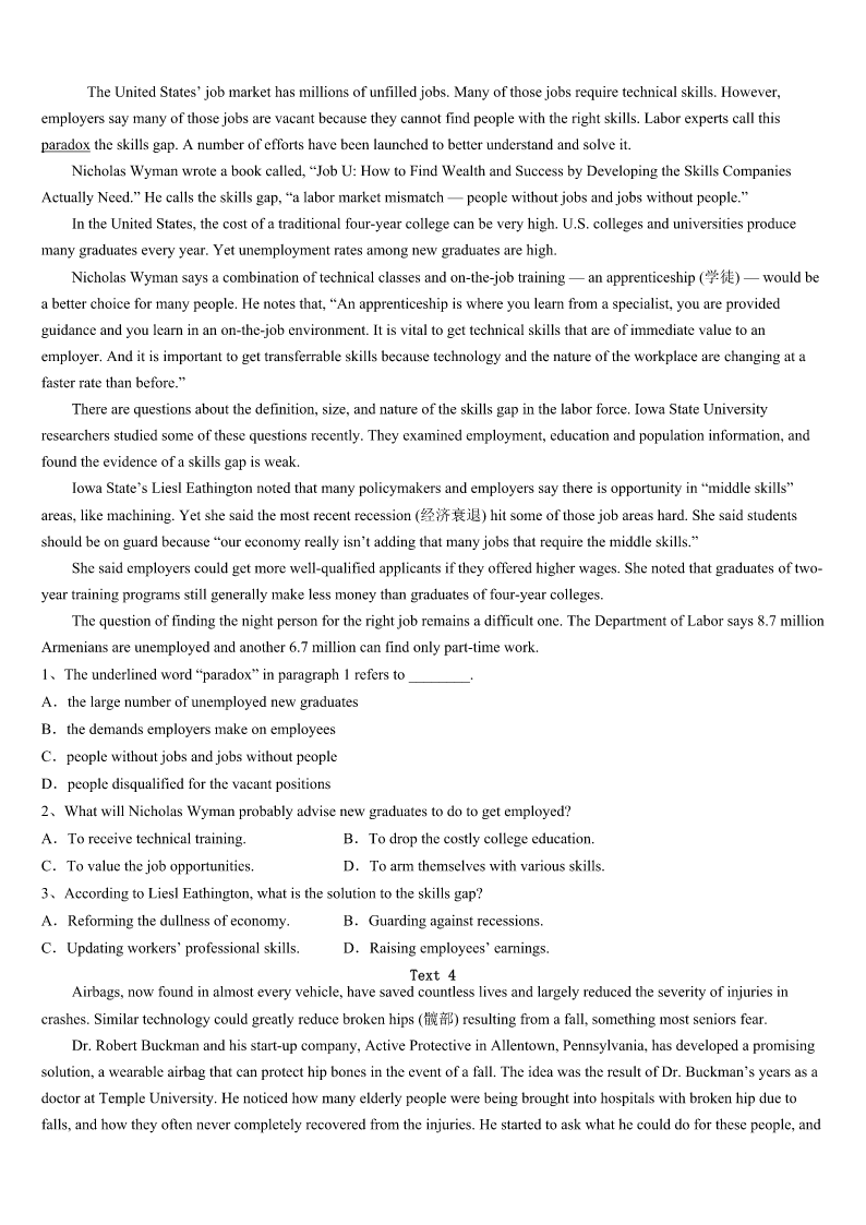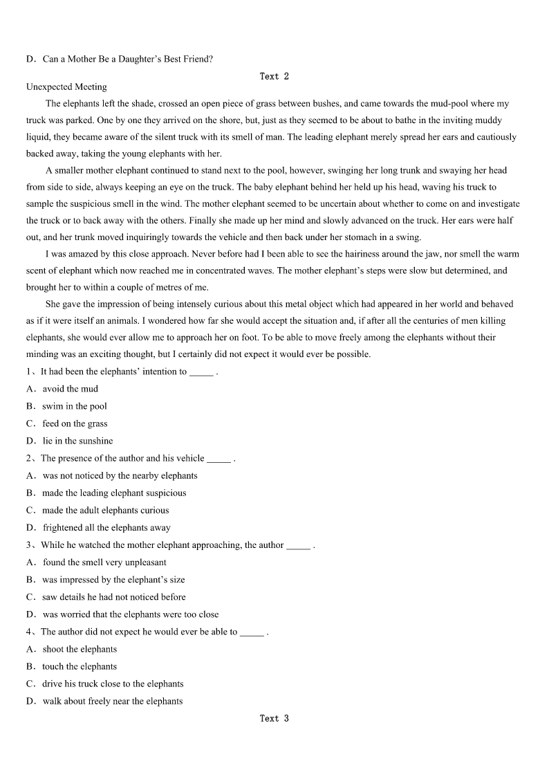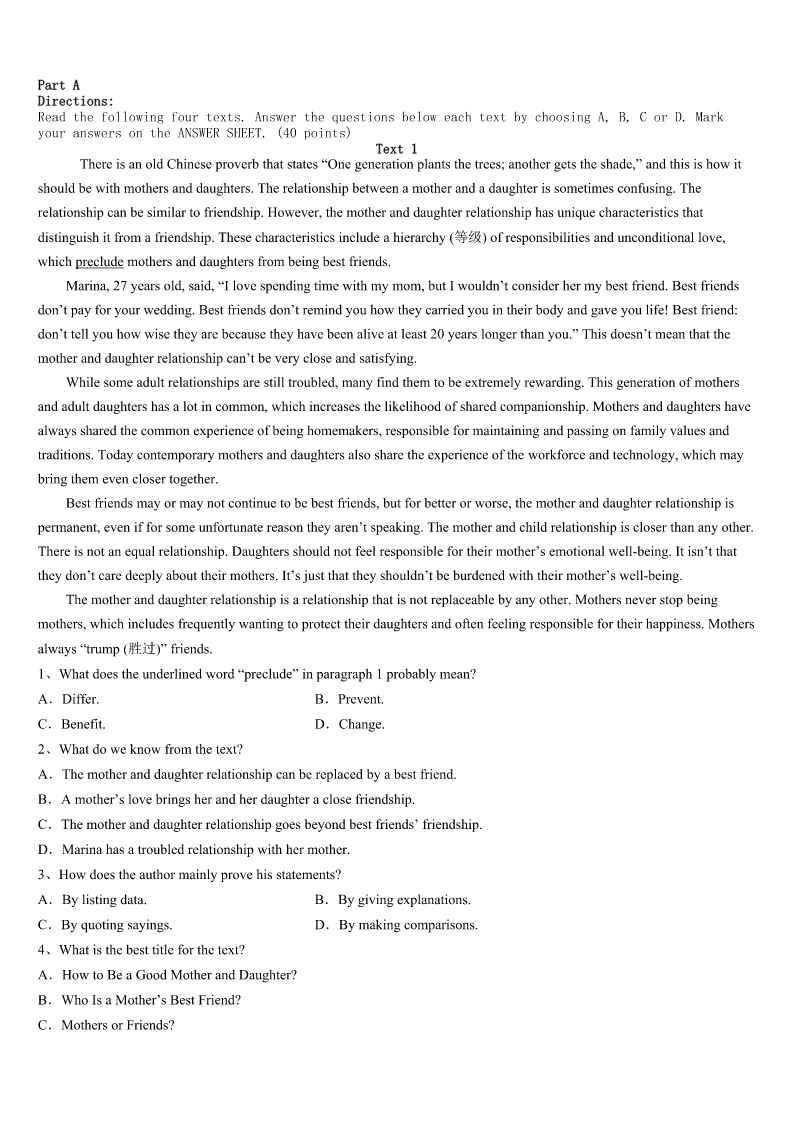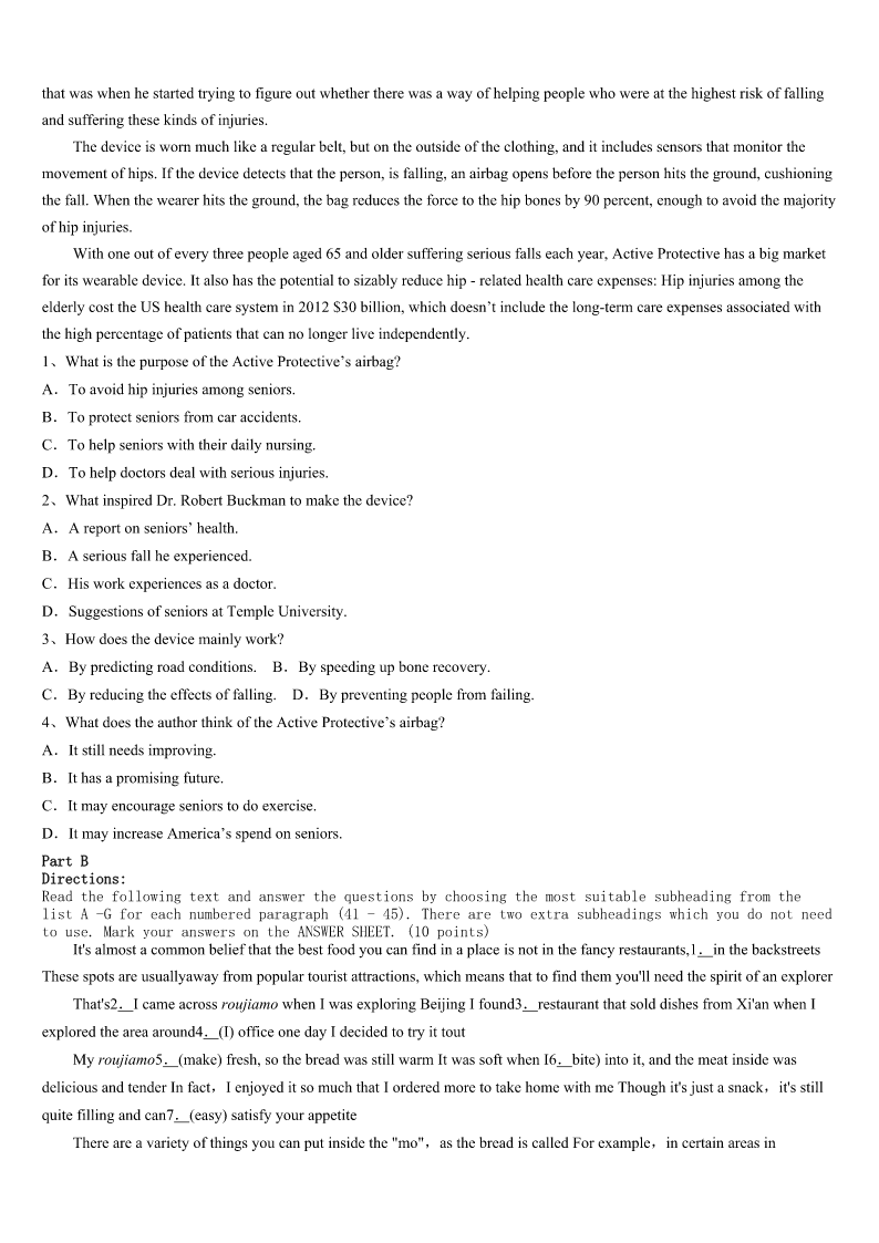 2023年山西省吕梁地区中阳县考研《英语一》预测试卷 SectionIUseofEnglish Directions: Readthefollowingtext.Choosethebestword(s)foreachnumberedblankandmarkA,B,CorDonthe ANSWERSHEET.(10points) Haveyouevernotwantedtodosomethingsobadly?Well,that’showI1aboutjoiningMadcaps,amothersanddaughters’ clubassistingphilanthropies(慈善事业).2,myfeelingchangedfinally.NowIbelieveifyouadoptan3attitude,you mightjust4enjoyingit. Sixmonthsago,mymomtoldmetheclubaskedustoworkas5atSaintVincentdePaulHomelessshelter.ThatmeantIhad to6inthedirtyhomelessshelterforatleast20hours. Thefirsttimewewentthere,aladyledustothekitchenwherewe7myfivefellowMadcapsclassmates—theyalsowore thesameexpression.SinceI’musuallysocially8,Ihadnevertalkedwithanyofthemearlier.Worsestill,mymomwas askedtohelpoutsidethekitchen,leavingmetotally9toservefoodwiththem.Soonlargenumbersofhomelessfamilies10 inlikerushingriver.Alittlegirl,around5yearsold,walkeduptome.I11heracoldsandwich.Shetookitandjoinedher familyquickly.Asshewalkedaway,I12shewaswearingacoat,clearlytoobigforher,hanging13onherthinbody,and couldn’thelpthinkinghowmuchIhad14withher.Itsuddenlystruckmethathow15Iam. AfterthatmomentIhada16ofheart.NowIloveMadcapsanddon’tmissonemeeting.Ihave17awkwardnesswhen communicatingandhavemanyfriends.AndthisyearIamsureIwilldomorethanthe1820hoursofphilanthropies. SothatishowIhavemadea19bydoingonethingIdon’twanttodo.Ifyouhaveanopen20aboutthingsyoucan accomplishmoreandbecomeawell-rounded(全面的)person. 1、A.feltB.worriedC.heardD.brought 2、A.OtherwiseB.BesidesC.ThereforeD.However 3、A.aggressiveB.ordinaryC.optimisticD.honest 4、A.endupB.giveupC.keeponD.insiston 5、A.membersB.clerksC.friendsD.volunteers 6、A.wanderB.serveC.teachD.walk 7、A.lookedforB.caredaboutC.ranintoD.passedby 8、A.excitedB.fragileC.scaredD.awkward 9、A.aloneB.doubtfulC.afraidD.patient 10、A.joinedB.brokeC.droppedD.poured 11、A.handedB.returnedC.awardedD.bought 12、A.thoughtB.guessedC.discoveredD.concluded 13、A.neatlyB.looselyC.constantlyD.carelessly 14、A.coveredB.connectedC.comparedD.competed 15、A.eagerB.strong