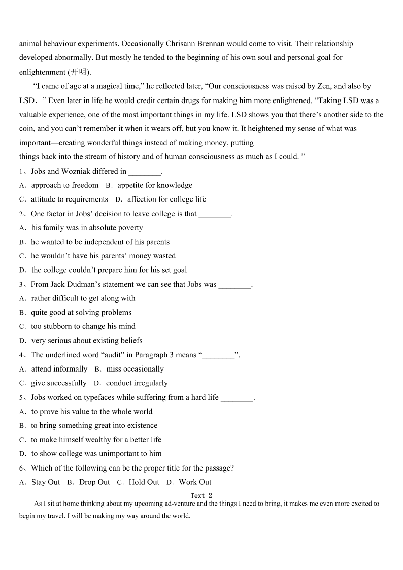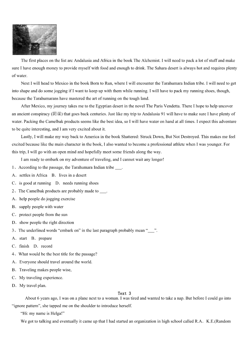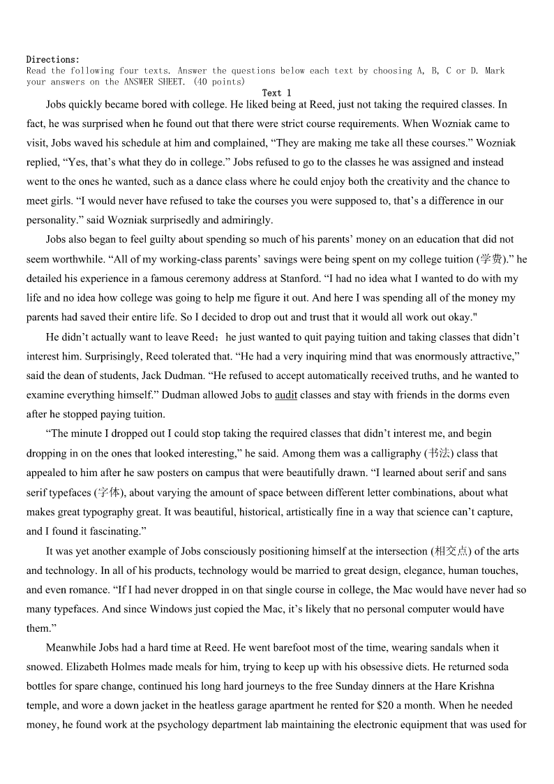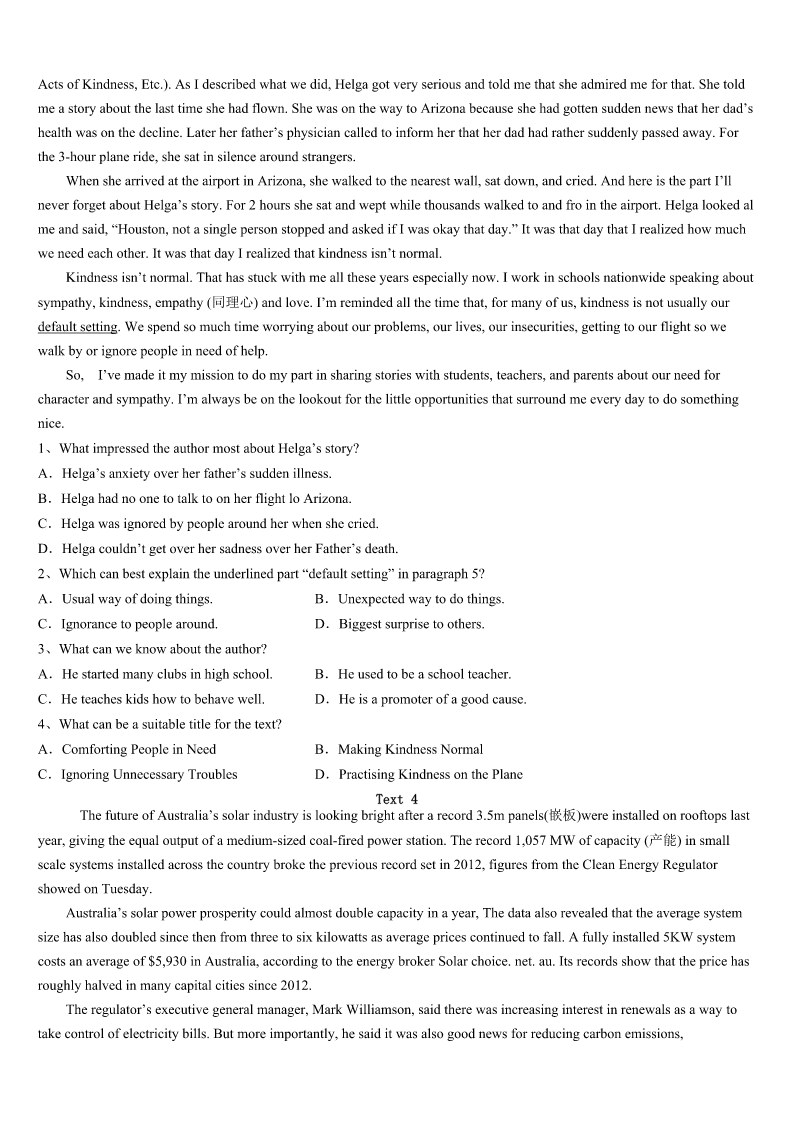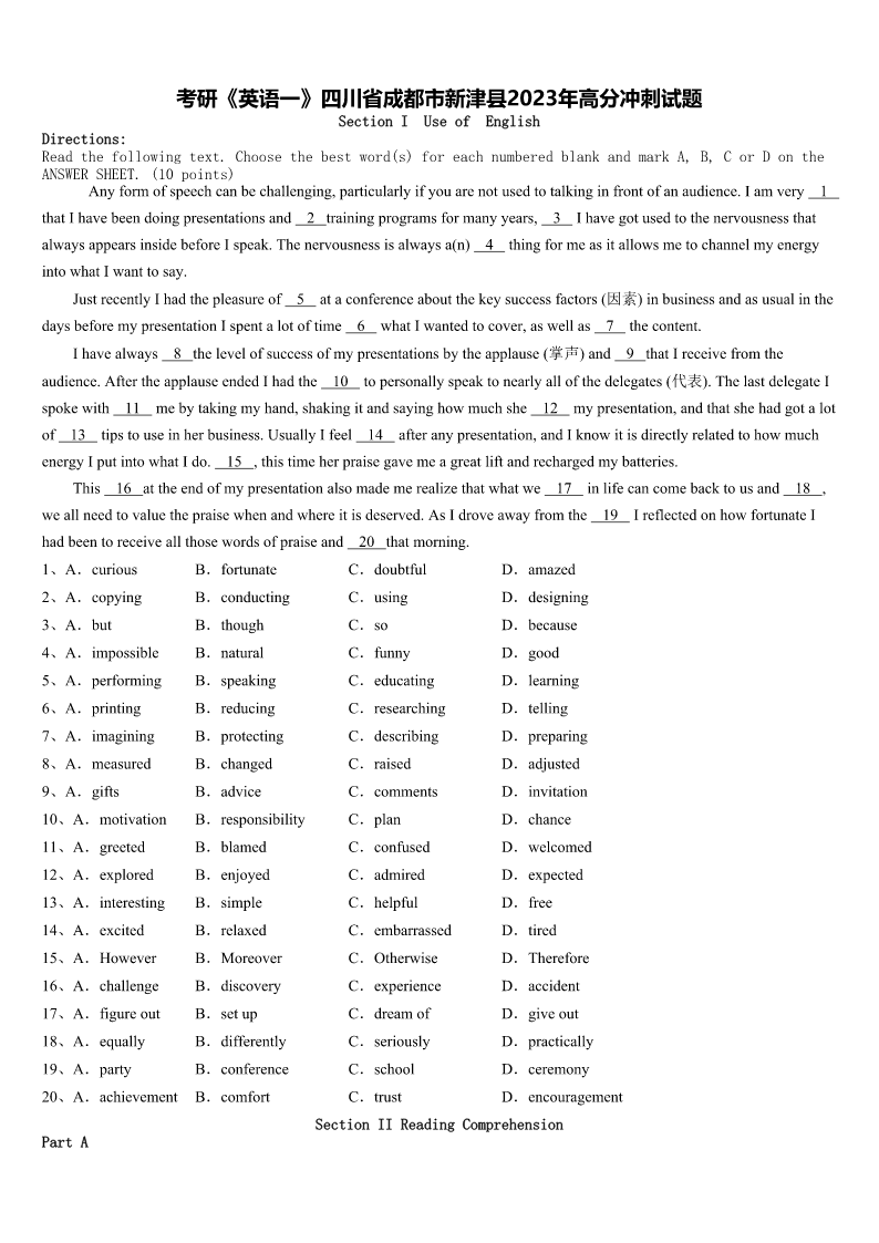 考研《英语一》四川省成都市新津县2023年高分冲刺试题 SectionIUseofEnglish Directions: Readthefollowingtext.Choosethebestword(s)foreachnumberedblankandmarkA,B,CorDonthe ANSWERSHEET.(10points) Anyformofspeechcanbechallenging,particularlyifyouarenotusedtotalkinginfrontofanaudience.Iamvery1 thatIhavebeendoingpresentationsand2trainingprogramsformanyyears,3Ihavegotusedtothenervousnessthat alwaysappearsinsidebeforeIspeak.Thenervousnessisalwaysa(n)4thingformeasitallowsmetochannelmyenergy intowhatIwanttosay. JustrecentlyIhadthepleasureof5ataconferenceaboutthekeysuccessfactors(因素)inbusinessandasusualinthe daysbeforemypresentationIspentalotoftime6whatIwantedtocover,aswellas7thecontent. Ihavealways8thelevelofsuccessofmypresentationsbytheapplause(掌声)and9thatIreceivefromthe audience.AftertheapplauseendedIhadthe10topersonallyspeaktonearlyallofthedelegates(代表).ThelastdelegateI spokewith11mebytakingmyhand,shakingitandsayinghowmuchshe12mypresentation,andthatshehadgotalot of13tipstouseinherbusiness.UsuallyIfeel14afteranypresentation,andIknowitisdirectlyrelatedtohowmuch energyIputintowhatIdo.15,thistimeherpraisegavemeagreatliftandrechargedmybatteries. This16attheendofmypresentationalsomademerealizethatwhatwe17inlifecancomebacktousand18, weallneedtovaluethepraisewhenandwhereitisdeserved.AsIdroveawayfromthe19IreflectedonhowfortunateI hadbeentoreceiveallthosewordsofpraiseand20thatmorning. 1、A.curiousB.fortunateC.doubtfulD.amazed 2、A.copyingB.conductingC.usingD.designing 3、A.butB.thoughC.soD.because 4、A.impossibleB.naturalC.funnyD.good 5、A.performingB.speakingC.educatingD.learning 6、A.printingB.reducingC.researchingD.telling 7、A.imaginingB.protectingC.describingD.preparing 8、A.measuredB.changedC.raisedD.adjusted 9、A.giftsB.adviceC.commentsD.invitation 10、A.motivationB.responsibilityC.planD.chance 11、A.greetedB.blamedC.confusedD.welcomed 12、A.exploredB.enjoyedC.admiredD.expected 13、A.interestingB.simpleC.helpfulD.free 14、A.excitedB.relaxedC.embarrassedD.tired 15、A.HoweverB.MoreoverC.OtherwiseD.Therefore 16、A.challe