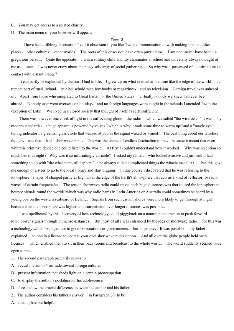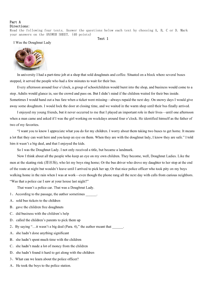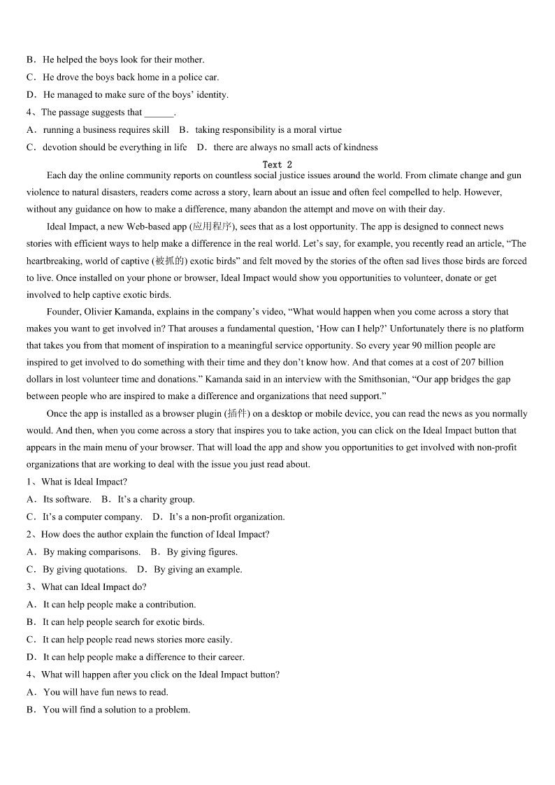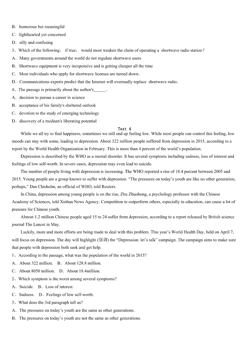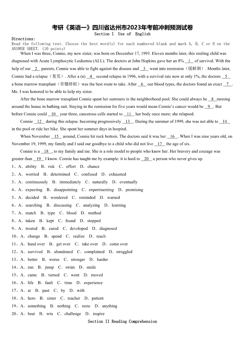 考研《英语一》四川省达州市2023年考前冲刺预测试卷 SectionIUseofEnglish Directions: Readthefollowingtext.Choosethebestword(s)foreachnumberedblankandmarkA,B,CorDonthe ANSWERSHEET.(10points) WhenIwasthree,Connie,mynewsister,wasbornonDecember17,1993.Elevenmonthslater,thissmilingchildwas diagnosedwithAcuteLymphocyticLeukemia(ALL).ThedoctorsatJohnHopkinsgaveheran8%1ofsurvival.Withthe helpofour2parents,Conniewasabletofightagainstthediseaseand3wentintoremission(缓解期).Monthslater, Conniehadarelapse(复发).Aftera(n)4secondrelapsein1996,withasurvivalratenowatonly1%,thedoctors5 abonemarrowtransplant(骨髓移植)wasthebestroutetotake.After6ourbloodtypes,thedoctorsfoundanexact7. Me.Iwashonoredtobeabletohelpmysister. AfterthebonemarrowtransplantConniespenthersummersintheneighborhoodpool.Shecouldalwaysbe8running aroundthehouseinbathingsuit.StayingintheremissionforfiveyearswouldmeanConnie’scancerwouldbe9.But beforeConniecould10yearthree,cancerouscellsstartedto11herbodyoncemore;sherelapsed. Connie12duringthisrelapse.becomingprogressively13.Duringthesummerof1999,shewasnotableto14 inthepoolorrideherbike.Shespenthersummerdaysinhospital. WhenNovember15around,Conniehitrockbottom.Thedoctorssaiditwasher16.WhenIwasnineyearsold,on November19,1999,myfamilyandIsaidourgoodbyetoachildwhodidnotlive17theageofsix. Connieisa18,tomyfamilyandme.Sheisarolemodeltopeoplewhoknewher.Herbraveryandcouragewas greaterthan19Iknow.Conniehastaughtmebyexample:itishardto20apersonwhonevergivesup. 1、A.abilityB.riskC.effortD.chance 2、A.worriedB.determinedC.confusedD.exhausted 3、A.continuouslyB.immediatelyC.naturallyD.eventually 4、A.expectingB.disappointingC.experimentingD.promising 5、A.decidedB.wonderedC.remindedD.warned 6、A.searchingB.discussingC.analyzingD.learning 7、A.matchB.typeC.bloodD.method 8、A.takenB.keptC.foundD.stopped 9、A.treatedB.curedC.developedD.diagnosed 10、A.changeB.spendC.realizeD.reach 11、A.handoverB.getoverC.takeoverD.comeover 12、A.survivedB.abandonedC.complainedD.struggled 13、A.betterB.worseC.strongerD.harder 14、A.runB.jumpC.swimD.s