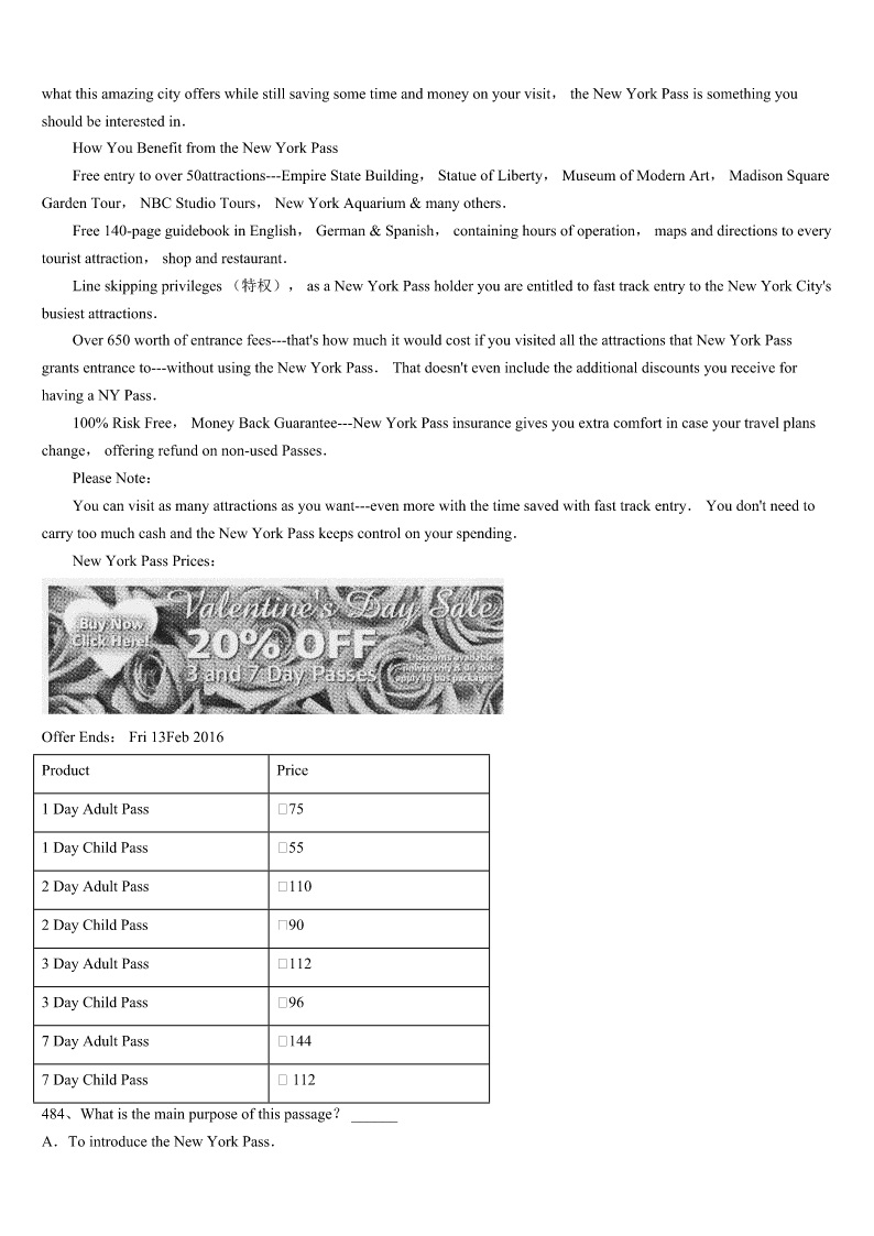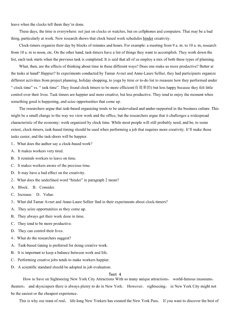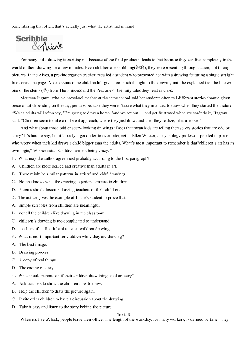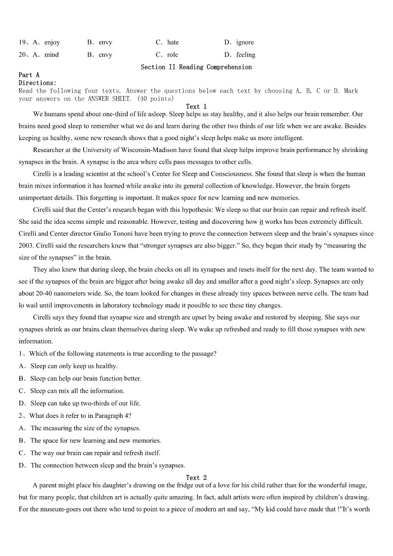 考研《英语一》大化瑶族自治县2023年全真模拟试卷 SectionIUseofEnglish Directions: Readthefollowingtext.Choosethebestword(s)foreachnumberedblankandmarkA,B,CorDonthe ANSWERSHEET.(10points) Theycallthemselves“TheSoulKnights(骑士)”andcomefromdifferentuniversitiesinGuangdongProvince. Duringtheirsummervacation,theteam,consistingoffivemaleandtwofemalestudents,1morethan3,000kilometersfrom GuangzhoutoBeijing.Ittookthem2daystocompletethejourney. TheSoulKnightshaveanoble3,whichistoadvocatecivilizedtravelbytakingphotosofgraffiti(涂鸦)4bytourists. “WhenweheardthataChinesetouristwrotehisnameonanEgyptiantemple,itmade5thinkalot.Wewantedtousephotos to6everyonehowimportantitistoprotecthistoricrelics,”saysZhangZhihao,22,theteam’scaptain. Ontheirtrip,theteamhadaclear7ofduty.Someprovidedmedicalcare,somewere8fund,andothersupdatedtheteam’s microblog. Cyclingisagreatwayofenjoyingthelandscape,butit’s9Onthewaytheypassedthroughmanycities10heatwaves withtemperatureswellabove40degrees.Theyrodeabout20kilometersperhour.Theygotupat6am,departedat7:30and 11atnoontocooldown.Sometimestheyborrowedsheetsofcardboardsfromrestaurantsandslept12trees. Aftercyclingforonemonth,theteam13arrivedinBeijing,theirdestination14itwasn’ttheendoftheirjourneyyet.The team15asmallexhibitionontheGreatWallofChina,oneofthecountry’smostvisitedattractions,toshoweveryonethe 16theyhadtakenofgraffitiinvariousplaces. Totheir17,manyvisitorsshowedtheirsupportfortheyoungteam’sprojectby18theirnamesonthebanner(横幅)they hadprepared. “Wedo19thisadventure,forsendingamessagetothepublicaboutprotectingourcountry’sculturalheritage(遗产)isavery rewarding20,”saidtheteam’scaptain. 1、A.walkedB.droveC.flewD.covered 2、A.fiftyB.fortyC.thirtyD.twenty 3、A.causeB.excuseC.suggestionD.view 4、A.brushedB.printedC.sentD.left 5、A.himB.usC.themD.you 6、A.amuseB.informC.urgeD.remind 7、A.divisionB.senseC.goalD.faith 8、A.inneedofB.inpossessionofC.inchargeofD.incaseof 9、A.shockingB.confusingC.amazingD.challenging 10、A.experiencingB.witnessingC.avoidingD.appreciating 11、A.bathedB.restedC.dancedD