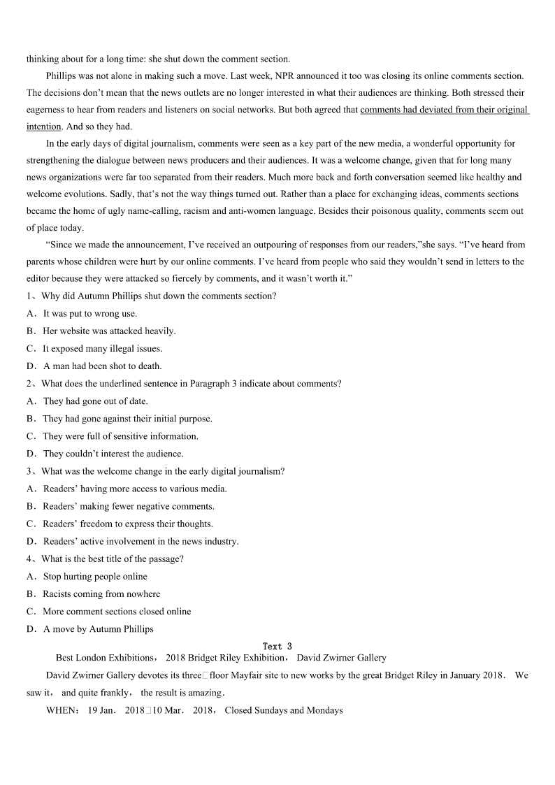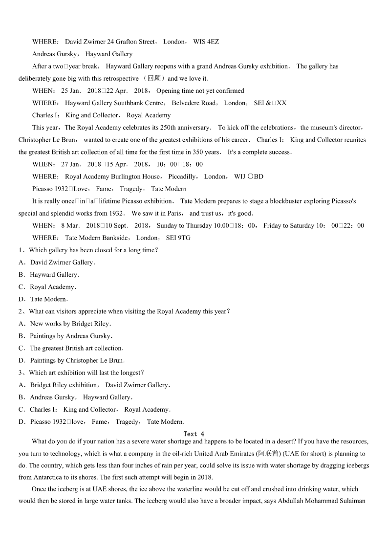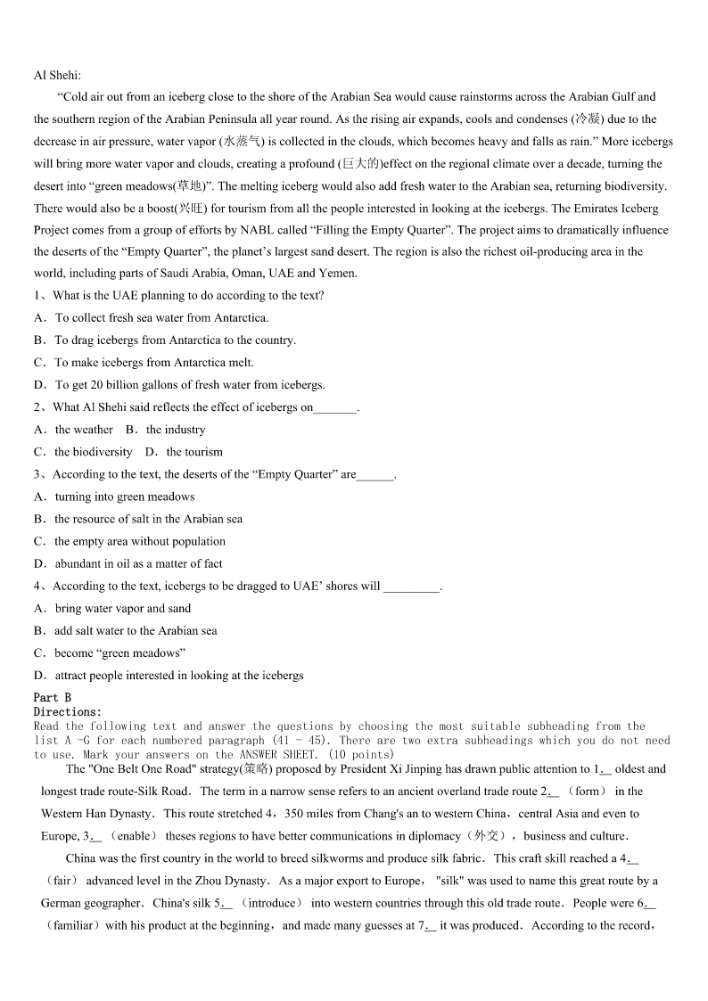 考研《英语一》四川省眉山市丹棱县2023年考前冲刺预测试卷 SectionIUseofEnglish Directions: Readthefollowingtext.Choosethebestword(s)foreachnumberedblankandmarkA,B,CorDonthe ANSWERSHEET.(10points) Iwasn’tpreparedforthewayIfeltwhenmy18-year-oldson,Dylan,leftforAsiaduringhiswinterbreak. Iwas1themomenthefirsttoldmyhusbandMichaelandmethathewantedtousesomeofhis2totravelaround China.Wewereexcitedforhimtoexploretheworld.Wetoldhimthat3wasoneofthebestwaystospendhismoneyand the4willlastalifetime. OnthemorningofDylan’sdeparture,he5afewmorethingsintohisbag.BeforeheandMichael6totheairport,I yelled,“Besafe,and7whenyouarriveinShanghai.” Thatnight8hewasflyingsomewhereoverthePacificOcean,ithitmethatDylanwasreallyonhis9.Iwoke hourly,eachtime10theclockandcountingthehoursbeforehewouldlandthefollowingmorning.11mydecisiontolet himgoalone,Iprayed,andthoughtaboutallthethingsthatcouldgo12.ThenIheardfromhim.Thefirsttextsaidhe’d arrived.Thesecondtextsaidhisluggagedidn’t13it. Feelinganxious,Imadlyattemptedto14downhisluggage.Tosearchforlostbaggage,Ipersuadedhimtogobackto the15andsuggestedhegototheairline’soffice.Myefforts16.AllthewhileDylanwastextingmehewasallright. Afterthat,therewasnomore17aboutlostluggage.Iknewthathe’dfigureitout,andthatthelifelessonswouldbe 18. Severaldaysintothetrip,DylansentaphotofromHongKong.“IthoughtIcouldneverstudyabroadanywherebut Europe,19Icoulddefinitelydoithere.”hisnoteread. AndIwas20. 1、A.thrilledB.worriedC.eagerD.upset 2、A.cautionB.savingsC.relationsD.friends 3、A.travelingB.learningC.drivingD.purchasing 4、A.costsB.virtueC.itemsD.memories 5、A.putB.stuckC.reachedD.knocked 6、A.tookoffB.sawoffC.pulledawayD.movedon 7、A.writeB.callC.textD.email 8、A.sinceB.thoughtC.afterD.while 9、A.behalfB.feetC.mindD.own 10、A.mendingB.checkingC.seeingD.winding 11、A.ConvincingB.DoubtingC.AdmittingD.Denying 12、A.wrongB.wildC.smoothD.bad 13、A.arriveB.makeC.manageD.deserve 14、A.bringB.turnC.settleD.track 15、A.homelandB.airportC.supermarketD.car 16、A.failedB.workedC.paidD.lost 17、A.presentationB.talkC.appearanceD.rumor