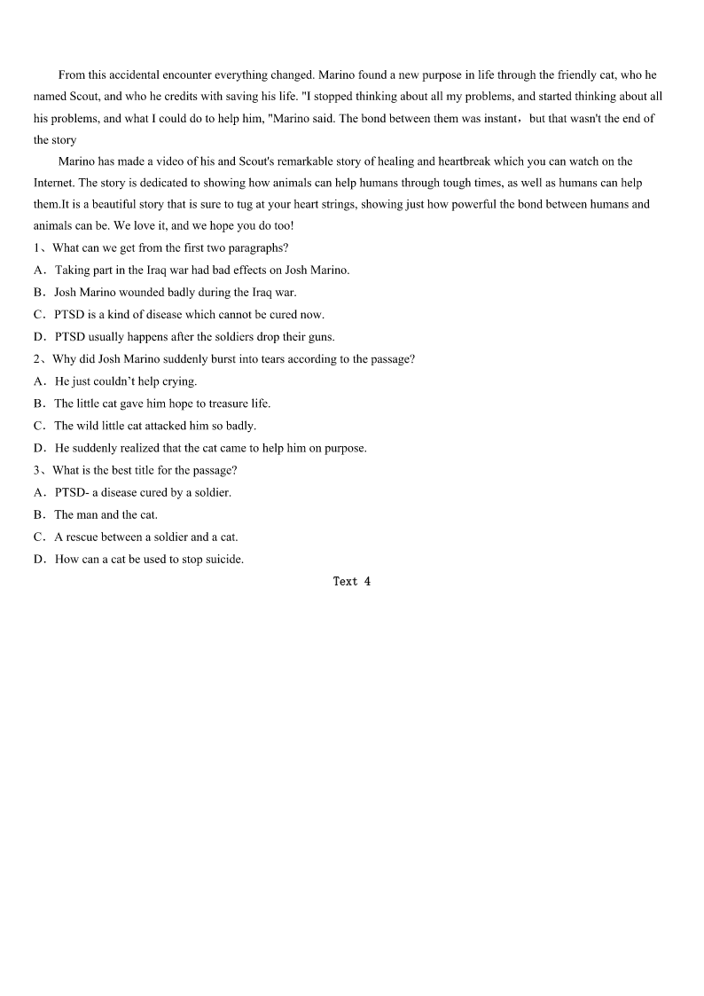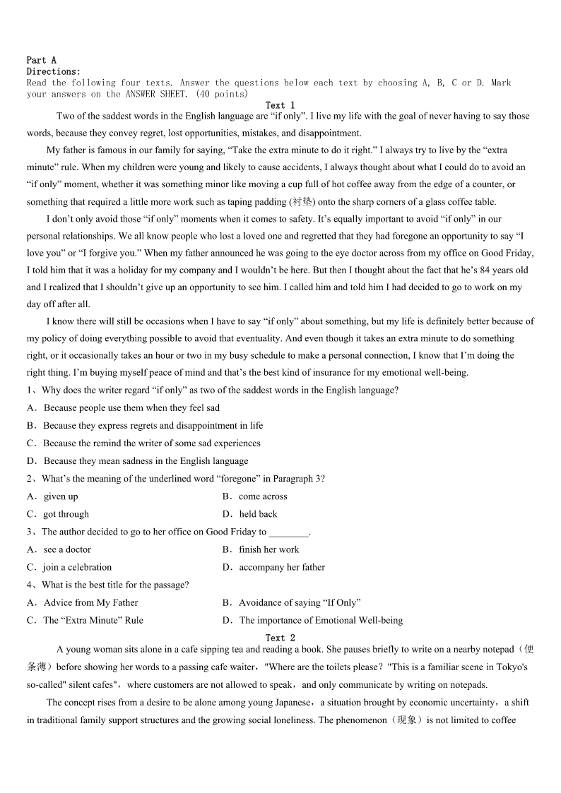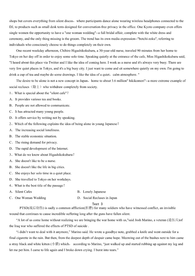 考研《英语一》天津市津南区2023年深度自测卷 SectionIUseofEnglish Directions: Readthefollowingtext.Choosethebestword(s)foreachnumberedblankandmarkA,B,CorDonthe ANSWERSHEET.(10points) Everyyearabout40,000peopleattempttoclimbKilimanjaro,thehighestmountaininAfrica.They1withthemlots ofwaste.The2mightdamagethebeautyoftheplace.Theglaciers(冰川)aredisappearing,changingthe3of Kilimanjaro. Hearingthesestories,I’m4abouttheplace—otherdestinationsaredescribedas“purer”naturalexperiences. However,Isoon5thatmuchhaschangedsincethedaysofdisturbingreportsof6amongtonsofrubbish.Ifinda 7mountain,withtoiletsatcampsandalongthepaths.Theenvironmentalchallengesare8buttheeffortsmadebythe TanzaniaNationalParkAuthorityseemtobe9. ThebestofaKilimanjaro10,inmyopinion,isn’treachingthetop.Mountainsare11asspiritualplacesbymany cultures.This12isespeciallyevidentonKilimanjaroas13gothroughfiveecosystems(生态系统)inthespaceofafew kilometers.Atthebaseisarainforest.Itendsabruptlyat3,000meters,14landsoflowgrowingplants.Furtherup,the weather15—lowcloudsenvelopethemountainsides,whicharecoveredwiththickgrass.I16twelveshadesofgreen fromwhereIstand.Above4,000metersisthehighland17:gravel(砾石),stonesandrocks.18youclimbintoanarctic- likezonewith19snowandtheglaciersthatmaysoondisappear. DoesKilimanjaro20itsreputationasacrowdedmountainwithlinesoftouristsruiningtheatmosphereofpeace?I foundtheoppositetobetrue. 1、A.keepB.mixC.connectD.bring 2、A.storiesB.buildingsC.crowdsD.reporters 3、A.positionB.ageC.faceD.name 4、A.silentB.skepticalC.seriousD.crazy 5、A.discoverB.argueC.decideD.advocate 6、A.equipmentB.grassC.campsD.stones 7、A.remoteB.quietC.tallD.clean 8、A.newB.specialC.significantD.necessary 9、A.payingoffB.spreadingoutC.blowingupD.fadingaway 10、A.atmosphereB.experienceC.experimentD.sight 11、A.studiedB.observedC.exploredD.regarded 12、A.viewB.qualityC.reasonD.purpose 13、A.scientistsB.climbersC.localsD.officials 14、A.holdingontoB.goingbacktoC.livinguptoD.givingwayto 15、A.changesB.clearsC.improvesD.permits 16、A.matchB.imagineC.countD.add 17、A.villageB