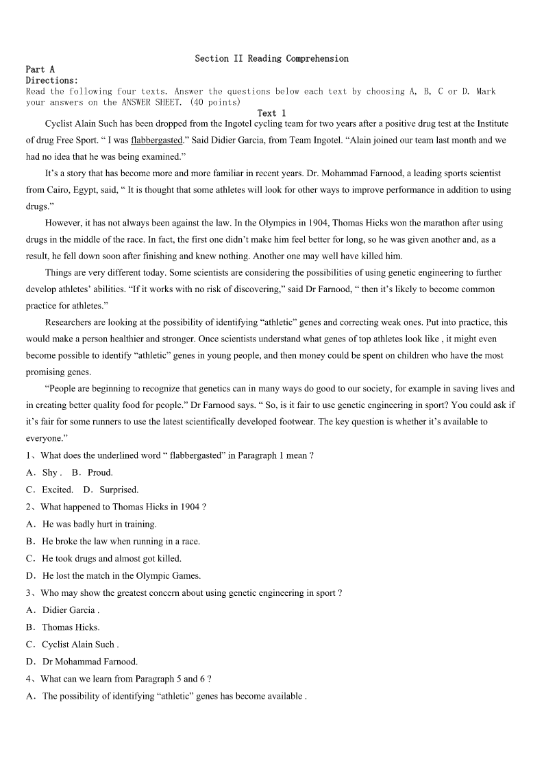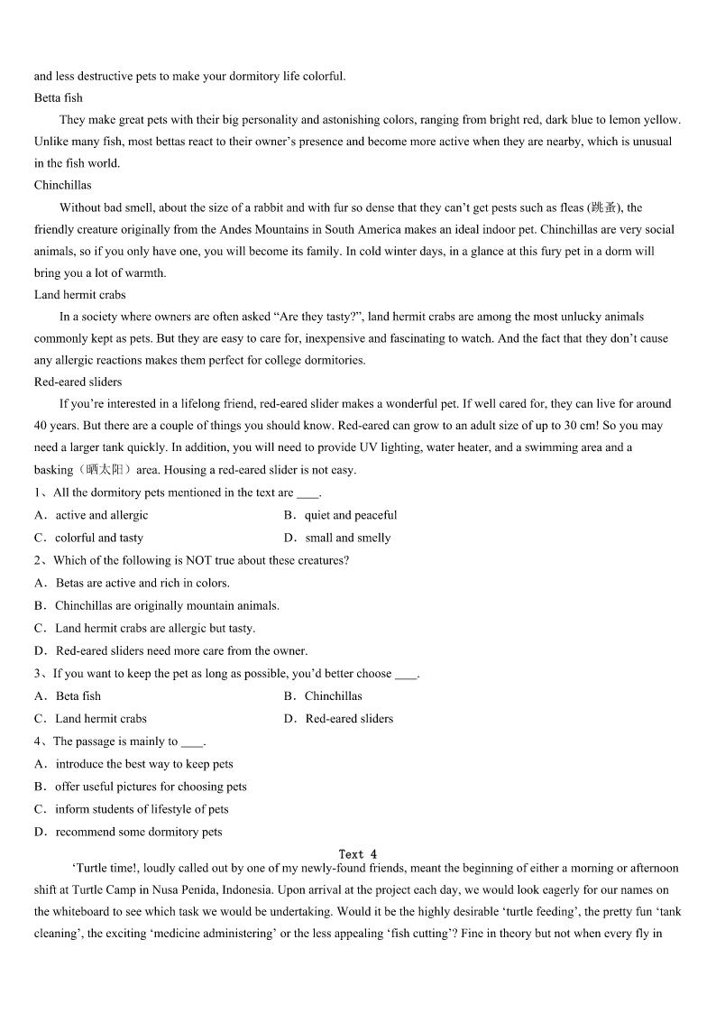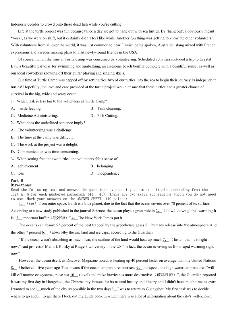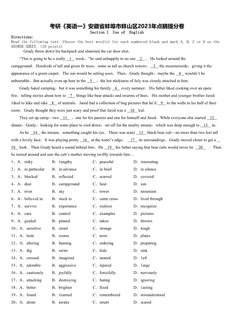 考研《英语一》安徽省蚌埠市蚌山区2023年点睛提分卷 SectionIUseofEnglish Directions: Readthefollowingtext.Choosethebestword(s)foreachnumberedblankandmarkA,B,CorDonthe ANSWERSHEET.(10points) Gradythrewdownhisbackpackandslammedthecardoorshut. “Thisisgoingtobeareally1week,”hesaidunhappilytonoone2.Helookedaroundthe campground.Hundredsoftallandgreenfirtrees,someastallaschurchtowers,3themountainside,givingitthe appearanceofagreencarpet.Thesunwouldbesettingsoon.Then,Gradythought,maybethe4wouldn’tbe unbearable,Butactuallyevenuphereinthe5,thehotstickinessofJulywascloselyattachedtohim. Gradyhatedcamping,butitwassomethinghisfamily6everysummer.Hisfatherlikedcookingoveranopen fire,tellingstoriesabouthowto7thingslikebearattacksandswarmsofbees.HismotherandyoungerbrotherJared 1ikedtohikeandtake8ofanimals.Jaredhadacollectionofbugpicturesthathe’d9tothewallsinhishalfoftheir room.GradythoughttheywerejustscaryandproofthatJaredwasa10kid. Theysetupcamp—two11,oneforhisparentsandoneforhimselfandJared.Whileeveryoneelsestarted12 dinner,Grady,lookingforsomeplacetocooldown,setoffforthenearbystream,whichwasdeepenoughto13in. Ashe14thestream,somethingcaughthiseye.Therewasa(an)15blackbearcub—nomorethantwofeettall withalovelyface.Itwasplayingpretty16atthewater’sedge,17itssurroundings.Gradymovedclosertogeta 18look.ThenGradyheardasoundbehindhim.He19hisfathersayingthatbearcubswouldneverbe20.Then heturnedaroundandsawthecub’smothermovingswiftlytowardshim… 1、A.riskyB.1engthyC.peacefulD.interesting 2、A.inparticularB.inadvanceC.inbriefD.insilence 3、A.blockedB.reflectedC.scarredD.covered 4、A.dustB.campgroundC.heatD.sun 5、A.riverB.skyC.towerD.mountain 6、A.believedinB.stucktoC.camecrossD.livedthrough 7、A.surviveB.experienceC.exploreD.recognize 8、A.careB.controlC.examplesD.pictures 9、A.guidedB.pinnedC.takenD.thrown 10、A.sensitiveB.smartC.strangeD.tough 11、A.bedsB.roomsC.tentsD.plates 12、A.alteringB.huntingC.orderingD.preparing 13、A.digB.swimC.hideD.sink 14、A.crossedB.imaginedC.nearedD.1eft 15、A.adorableB.aggressiveC.injuredD.1arge 16、A