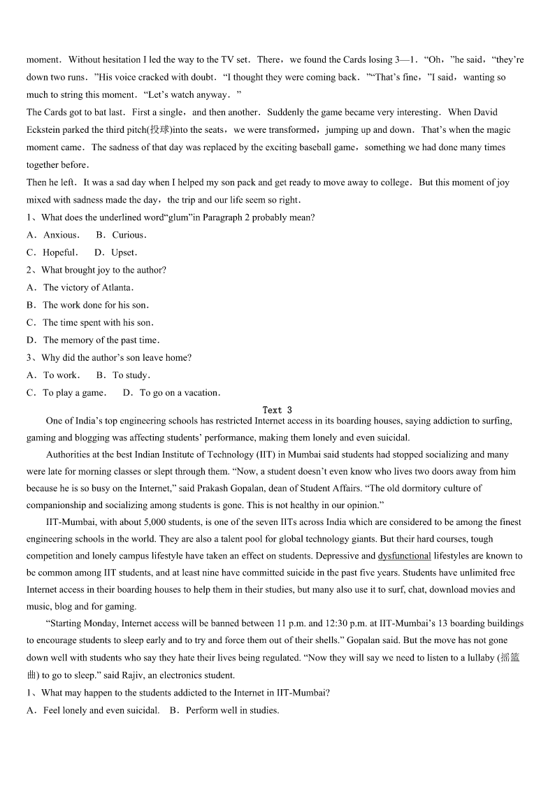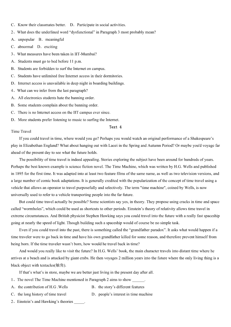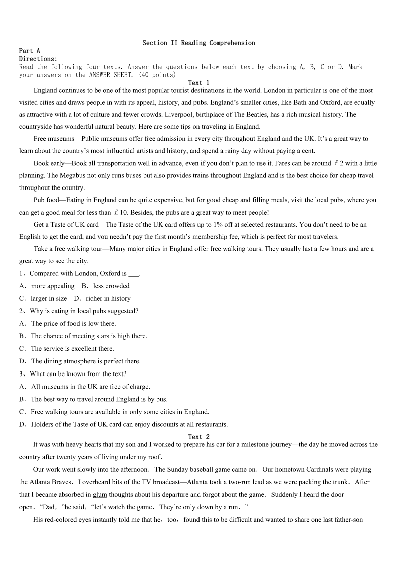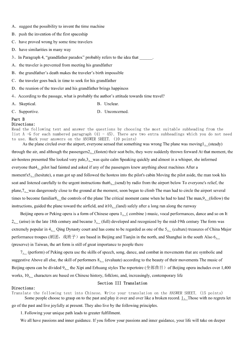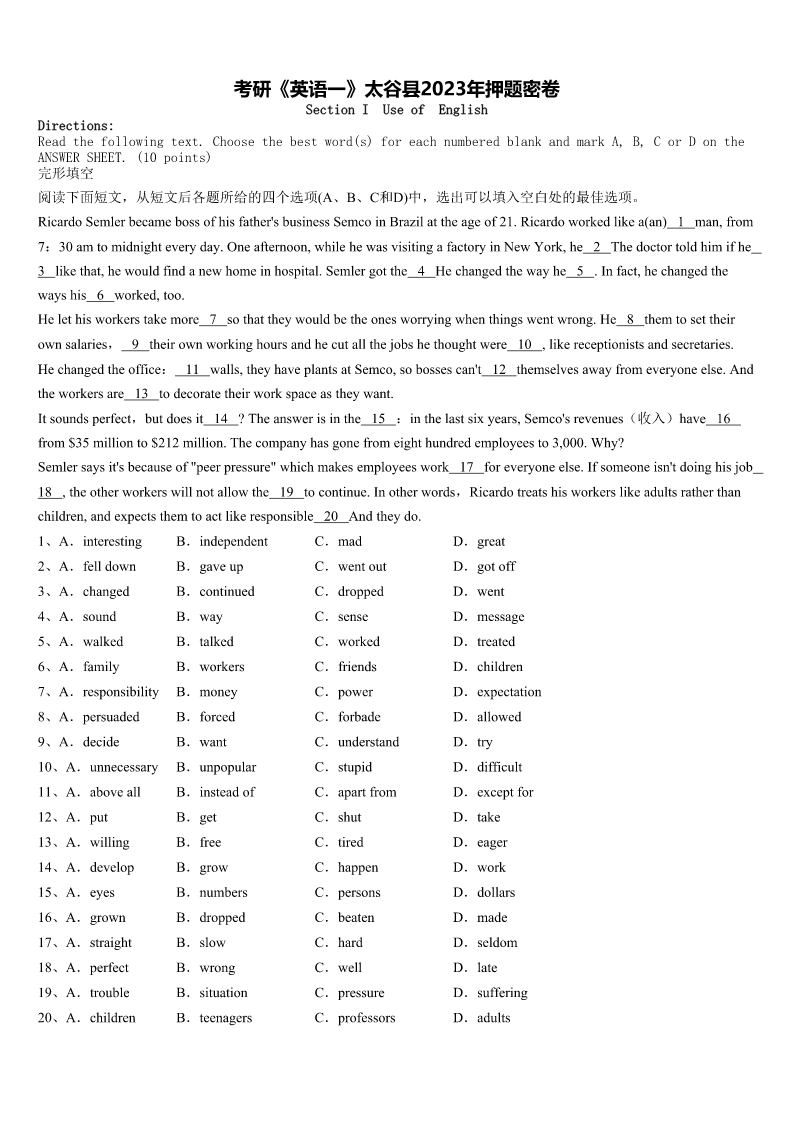 考研《英语一》太谷县2023年押题密卷 SectionIUseofEnglish Directions: Readthefollowingtext.Choosethebestword(s)foreachnumberedblankandmarkA,B,CorDonthe ANSWERSHEET.(10points) 完形填空 阅读下面短文,从短文后各题所给的四个选项(A、B、C和D)中,选出可以填入空白处的最佳选项。 RicardoSemlerbecamebossofhisfather'sbusinessSemcoinBrazilattheageof21.Ricardoworkedlikea(an)1man,from 7:30amtomidnighteveryday.Oneafternoon,whilehewasvisitingafactoryinNewYork,he2Thedoctortoldhimifhe 3likethat,hewouldfindanewhomeinhospital.Semlergotthe4Hechangedthewayhe5.Infact,hechangedthe wayshis6worked,too. Helethisworkerstakemore7sothattheywouldbetheonesworryingwhenthingswentwrong.He8themtosettheir ownsalaries,9theirownworkinghoursandhecutallthejobshethoughtwere10,likereceptionistsandsecretaries. Hechangedtheoffice:11walls,theyhaveplantsatSemco,sobossescan't12themselvesawayfromeveryoneelse.And theworkersare13todecoratetheirworkspaceastheywant. Itsoundsperfect,butdoesit14?Theanswerisinthe15:inthelastsixyears,Semco'srevenues(收入)have16 from$35millionto$212million.Thecompanyhasgonefromeighthundredemployeesto3,000.Why? Semlersaysit'sbecauseof"peerpressure"whichmakesemployeeswork17foreveryoneelse.Ifsomeoneisn'tdoinghisjob 18,theotherworkerswillnotallowthe19tocontinue.Inotherwords,Ricardotreatshisworkerslikeadultsratherthan children,andexpectsthemtoactlikeresponsible20Andtheydo. 1、A.interestingB.independentC.madD.great 2、A.felldownB.gaveupC.wentoutD.gotoff 3、A.changedB.continuedC.droppedD.went 4、A.soundB.wayC.senseD.message 5、A.walkedB.talkedC.workedD.treated 6、A.familyB.workersC.friendsD.children 7、A.responsibilityB.moneyC.powerD.expectation 8、A.persuadedB.forcedC.forbadeD.allowed 9、A.decideB.wantC.understandD.try 10、A.unnecessaryB.unpopularC.stupidD.difficult 11、A.aboveallB.insteadofC.apartfromD.exceptfor 12、A.putB.getC.shutD.take 13、A.willingB.freeC.tiredD.eager 14、A.developB.growC.happenD.work 15、A.eyesB.numbersC.personsD.dollars 16、A.grownB.droppedC.beatenD.made 17、A.straightB.slowC.hardD.seldom 18、A.perfectB.wrongC.wellD.late 19、A.troubleB.situationC.pressu