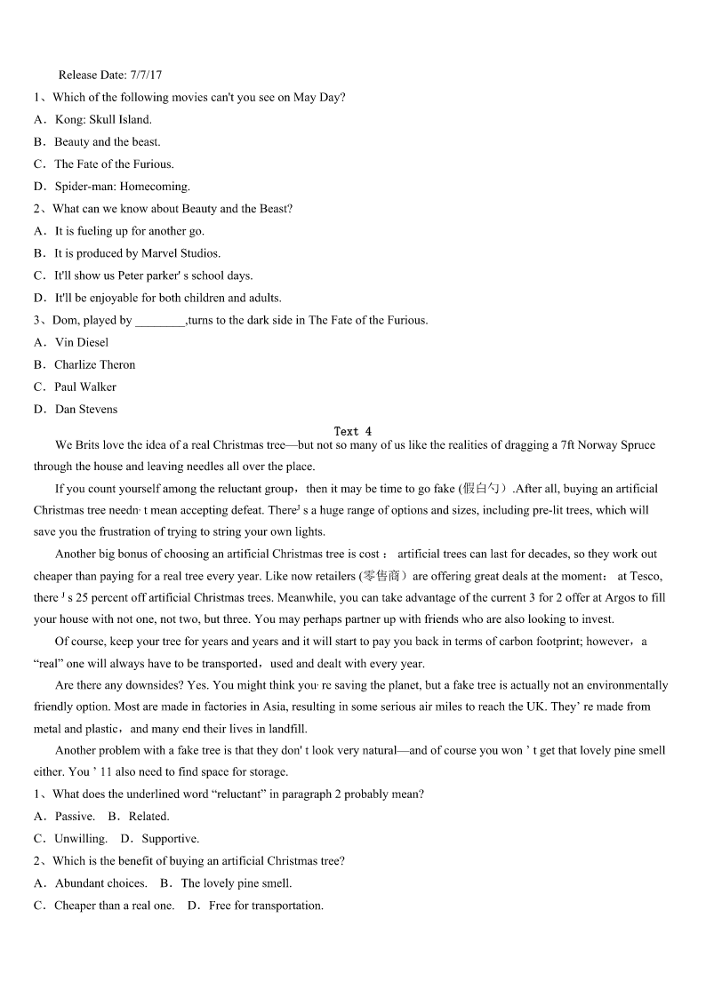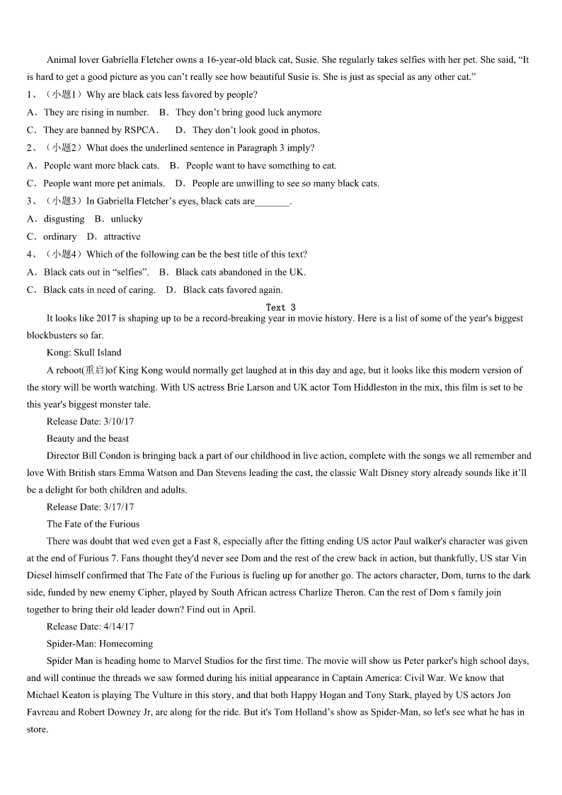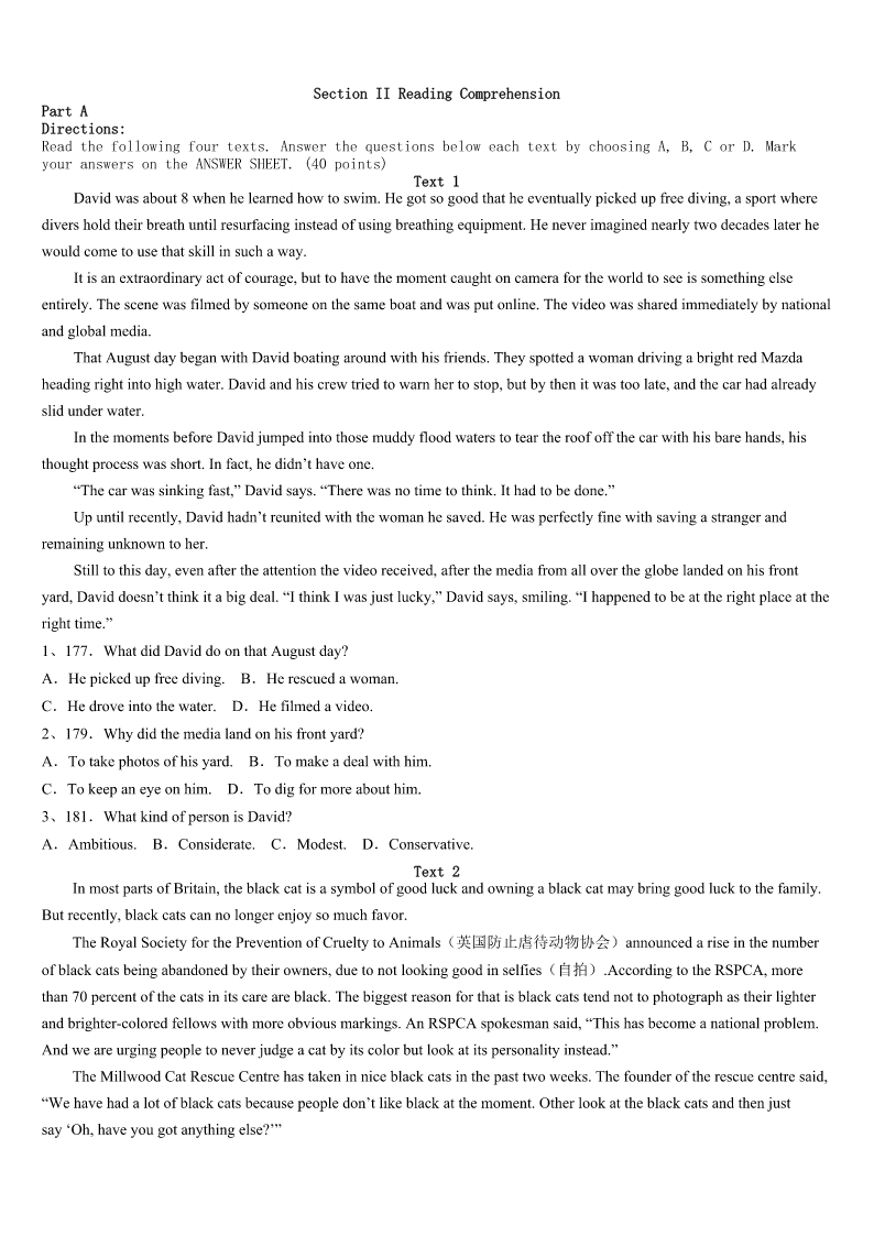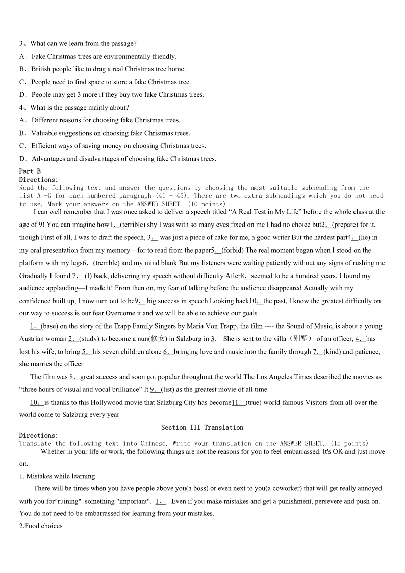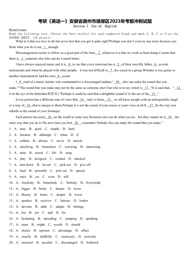 考研《英语一》安徽省滁州市琅琊区2023年考前冲刺试题 SectionIUseofEnglish Directions: Readthefollowingtext.Choosethebestword(s)foreachnumberedblankandmarkA,B,CorDonthe ANSWERSHEET.(10points) Whatisitthatyoulovetodobutneverfeelthatyougetitquiteright?Perhapsyoudon’teventryanymorebecauseyou thinkwhatyoudoisnot1enough. Discouragementseemstofollowusagoodpartofthetime,2whateveritisthatweworksoharddoing.itseemsthat thereis3someoneelsewhocandoitmuchbetter. Ihavealwaysenjoyedmusicanditis4tomethateverymusicianhasa5oftheirown.Myfather6several instrumentsandwhenheplayedwithotherpeople,itwasnotdifficultto7hissoundinagroup.Whetheritwasguitaror anotherinstrument,hehadhisown8sound. I9readofamusicteacherwhocommentedtoadiscouragedstudent,“10elsecanmakethesoundthatyou make.”“Thesoundthatyoumakemaynotbethesameassomeoneelse'sbutwhoistosaywhichis11?Itissaidthat,“12 isintheeyeofthebeholder(观看者).”Perhapsitcouldbesaidthatadelightfulsoundis“intheearofthe13”. Everypersonhasadifferenttoneofvoicethat14onlytothem,15weallknowpeoplewithanunforgettablelaugh orawayof16thatisuniquetothem.Perhapsitisnotthesoundofyourmusicoryourvoiceatall.It17bethewayyou whistleorthesoundofyourfootsteps. Eachpersonhasa(an)18ontheworldinsomeway.Someoneelsecandowhatyoudo,buttheycannotdoit19the samewaythatyoudoit.Thenexttimeyoufeel20,rememberNobodyelsecanmakethesoundthatyoumake.” 1、A.easyB.goodC.simpleD.hard 2、A.becauseB.althoughC.whenD.if 3、A.seldomB.alwaysC.neverD.merely 4、A.satisfyingB.frustrationC.worryingD.interesting 5、A.tasteB.soundC.lifeD.song 6、A.playB.designedC.createdD.checked 7、A.turndownB.letoutC.pickoutD.giveoff 8、A.loudB.powerfulC.pickoutD.special 9、A.onceB.yetC.evenD.still 10、A.AnybodyB.SomebodyC.NobodyD.Everybody 11、A.biggerB.betterC.deeperD.lower 12、A.BeautyB.betterC.deeperD.lower 13、A.speakerB.receiverC.listenerD.looker 14、A.devotesB.addsC.adaptsD.belongs 15、A.butB.yetC.andD.for 16、A.hesitatingB.spreadingC.jumpingD.speaking 17、A.mustB.mightC.wouldD.should 18、A.choiceB.opinionC.advantageD.effect 19、A.exactlyB.skillfullyC.cautiou