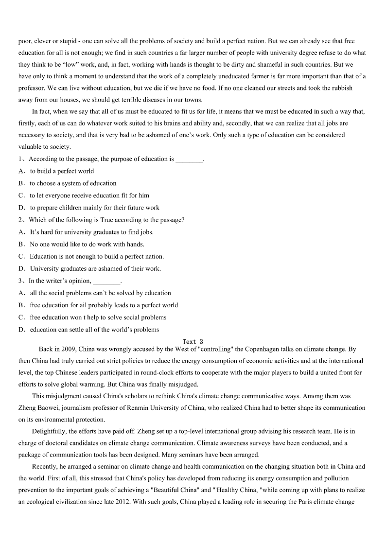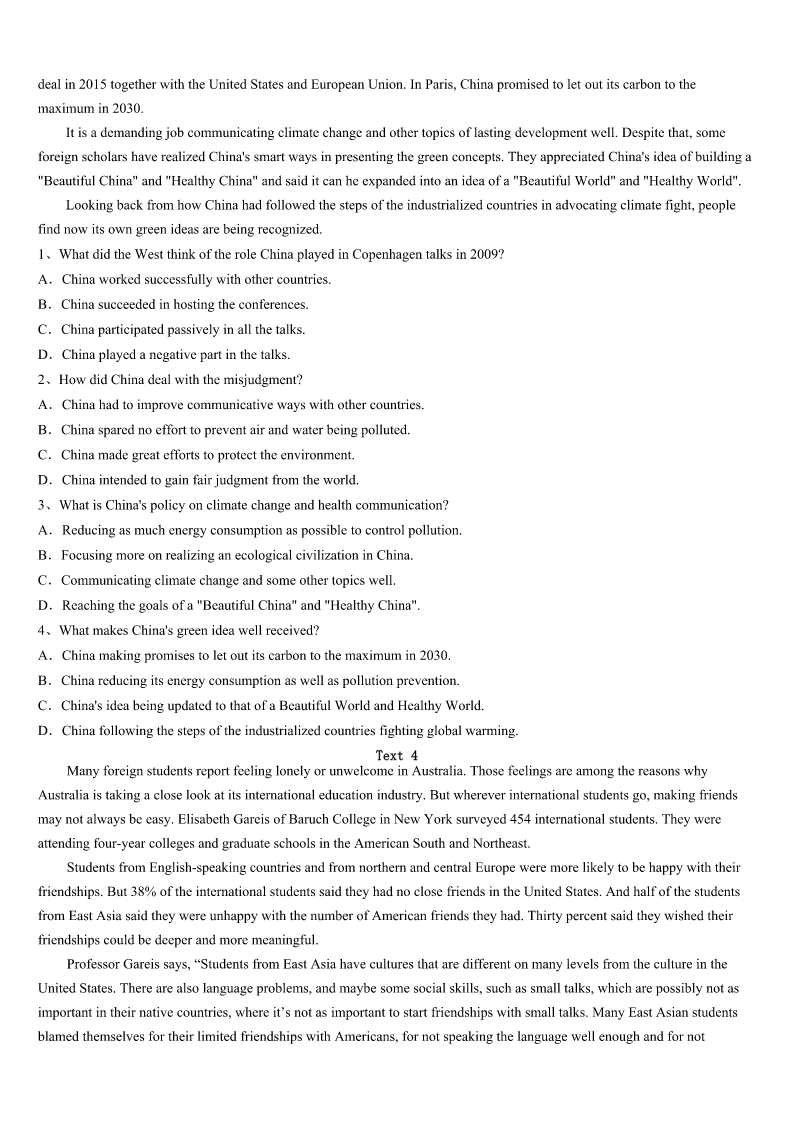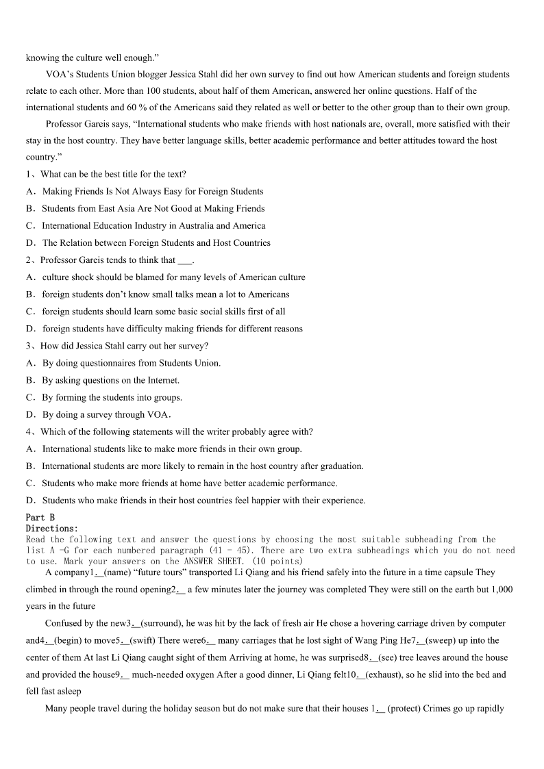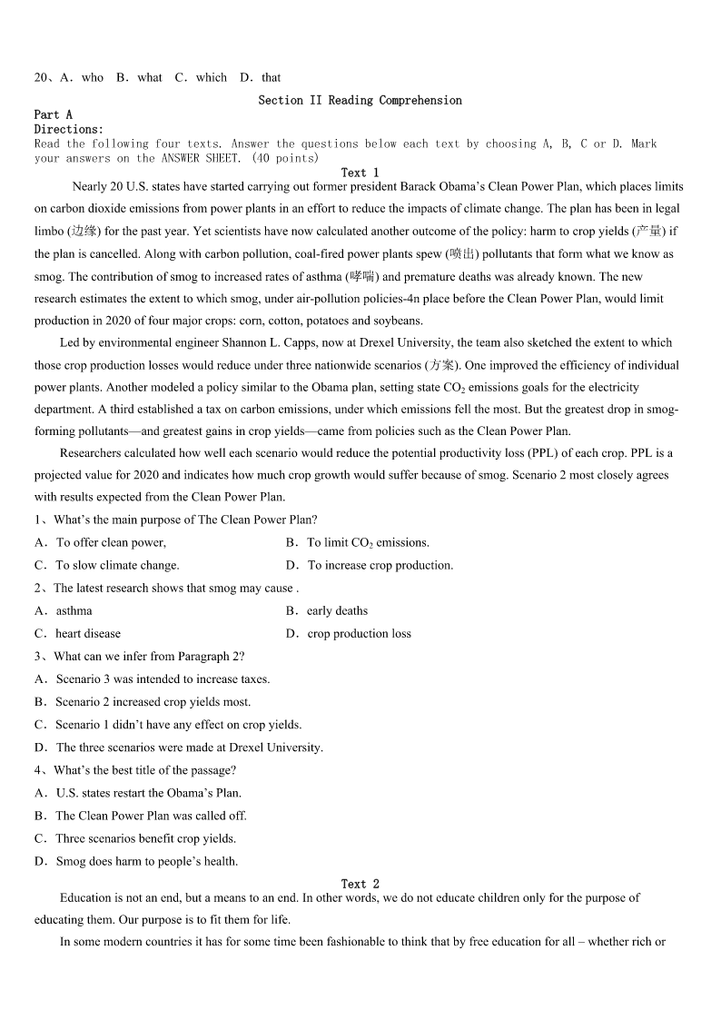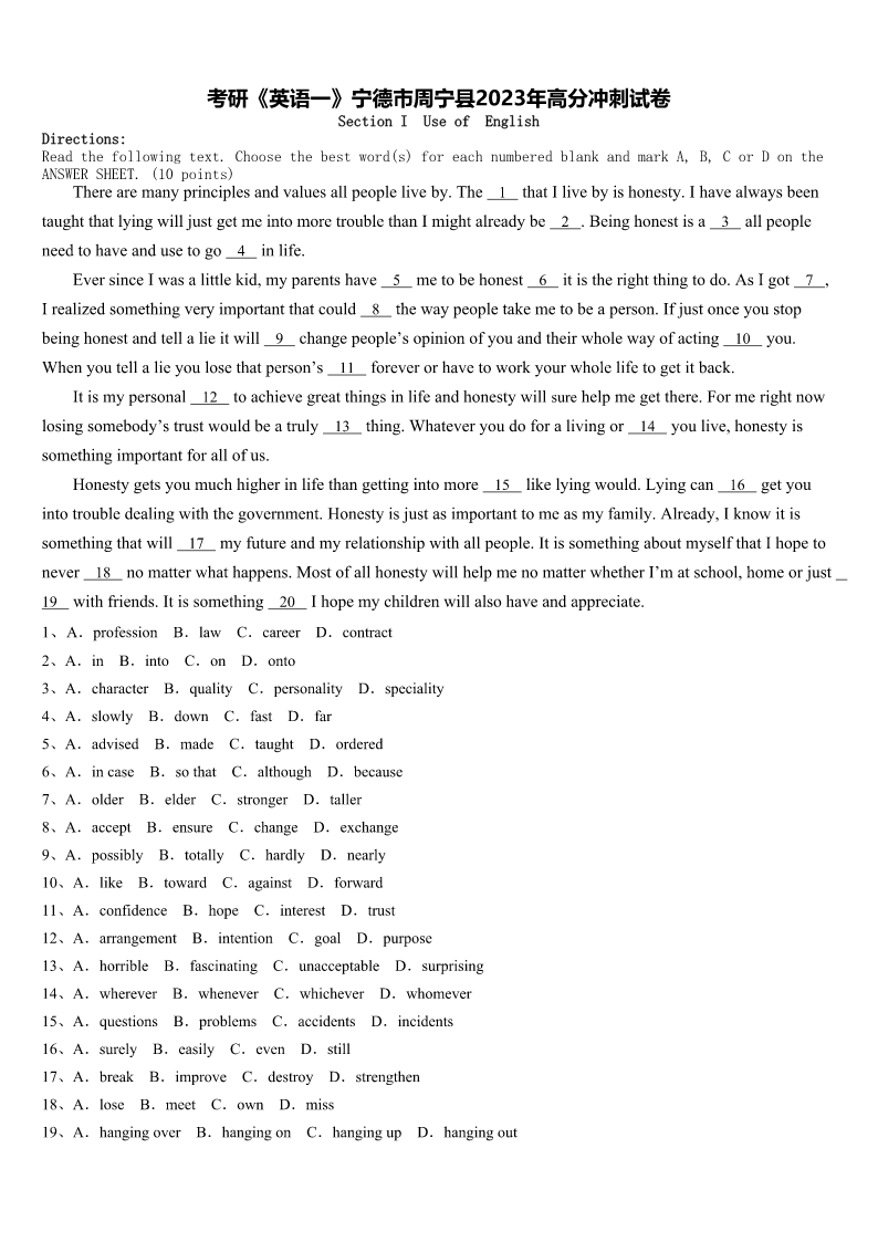 考研《英语一》宁德市周宁县2023年高分冲刺试卷 SectionIUseofEnglish Directions: Readthefollowingtext.Choosethebestword(s)foreachnumberedblankandmarkA,B,CorDonthe ANSWERSHEET.(10points) Therearemanyprinciplesandvaluesallpeopleliveby.The1thatIlivebyishonesty.Ihavealwaysbeen taughtthatlyingwilljustgetmeintomoretroublethanImightalreadybe2.Beinghonestisa3allpeople needtohaveandusetogo4inlife. EversinceIwasalittlekid,myparentshave5metobehonest6itistherightthingtodo.AsIgot7, Irealizedsomethingveryimportantthatcould8thewaypeopletakemetobeaperson.Ifjustonceyoustop beinghonestandtellalieitwill9changepeople’sopinionofyouandtheirwholewayofacting10you. Whenyoutellalieyoulosethatperson’s11foreverorhavetoworkyourwholelifetogetitback. Itismypersonal12toachievegreatthingsinlifeandhonestywillsurehelpmegetthere.Formerightnow losingsomebody’strustwouldbeatruly13thing.Whateveryoudoforalivingor14youlive,honestyis somethingimportantforallofus. Honestygetsyoumuchhigherinlifethangettingintomore15likelyingwould.Lyingcan16getyou intotroubledealingwiththegovernment.Honestyisjustasimportanttomeasmyfamily.Already,Iknowitis somethingthatwill17myfutureandmyrelationshipwithallpeople.ItissomethingaboutmyselfthatIhopeto never18nomatterwhathappens.MostofallhonestywillhelpmenomatterwhetherI’matschool,homeorjust 19withfriends.Itissomething20Ihopemychildrenwillalsohaveandappreciate. 1、A.professionB.lawC.careerD.contract 2、A.inB.intoC.onD.onto 3、A.characterB.qualityC.personalityD.speciality 4、A.slowlyB.downC.fastD.far 5、A.advisedB.madeC.taughtD.ordered 6、A.incaseB.sothatC.althoughD.because 7、A.olderB.elderC.strongerD.taller 8、A.acceptB.ensureC.changeD.exchange 9、A.possiblyB.totallyC.hardlyD.nearly 10、A.likeB.towardC.againstD.forward 11、A.confidenceB.hopeC.interestD.trust 12、A.arrangementB.intentionC.goalD.purpose 13、A.horribleB.fascinatingC.unacceptableD.surprising 14、A.whereverB.wheneverC.whicheverD.whomever 15、A.questionsB.problemsC.accidentsD.incidents 16、A.surelyB.easilyC.evenD.still 17、A.breakB.improveC.destroyD.strengthe
