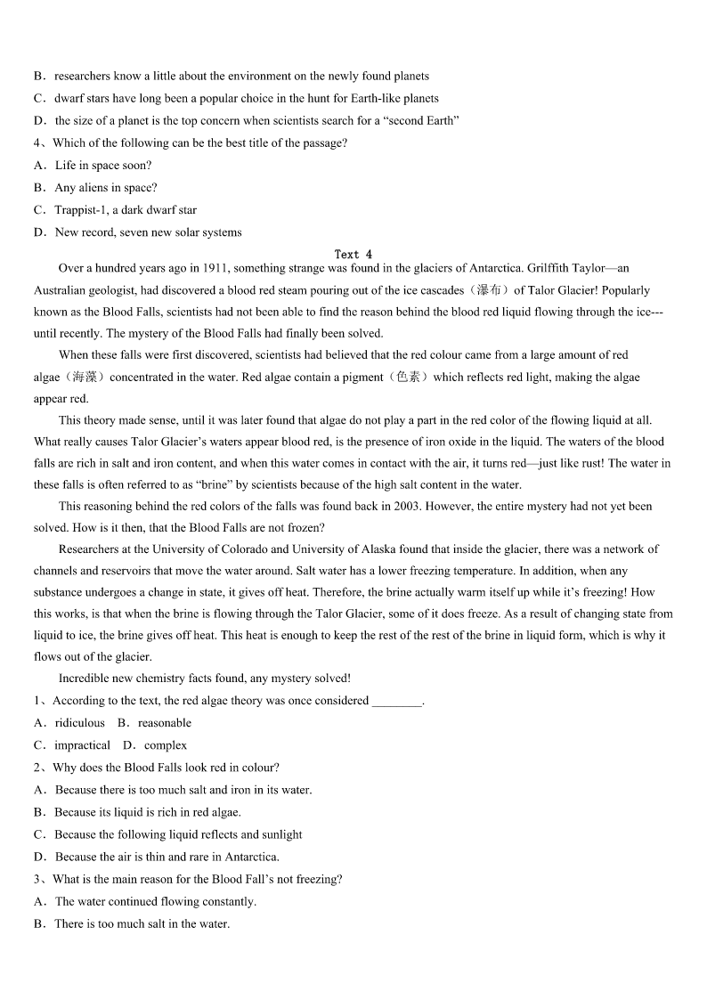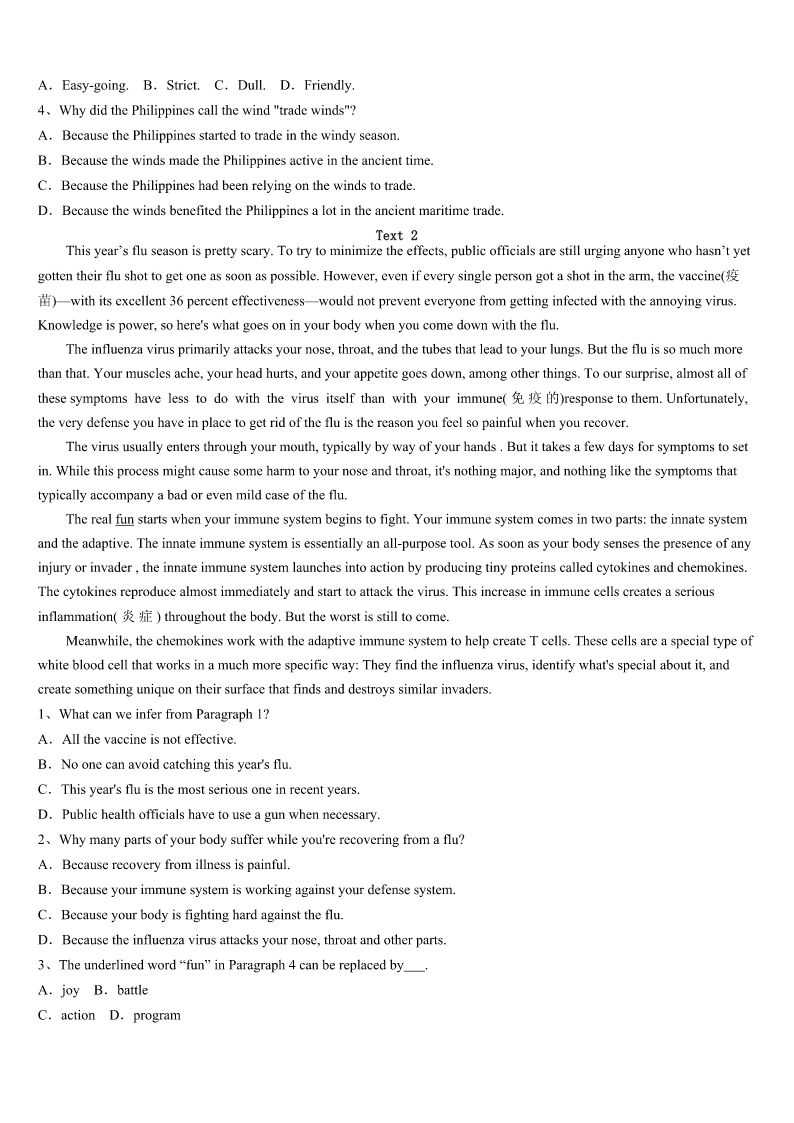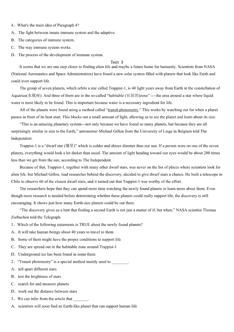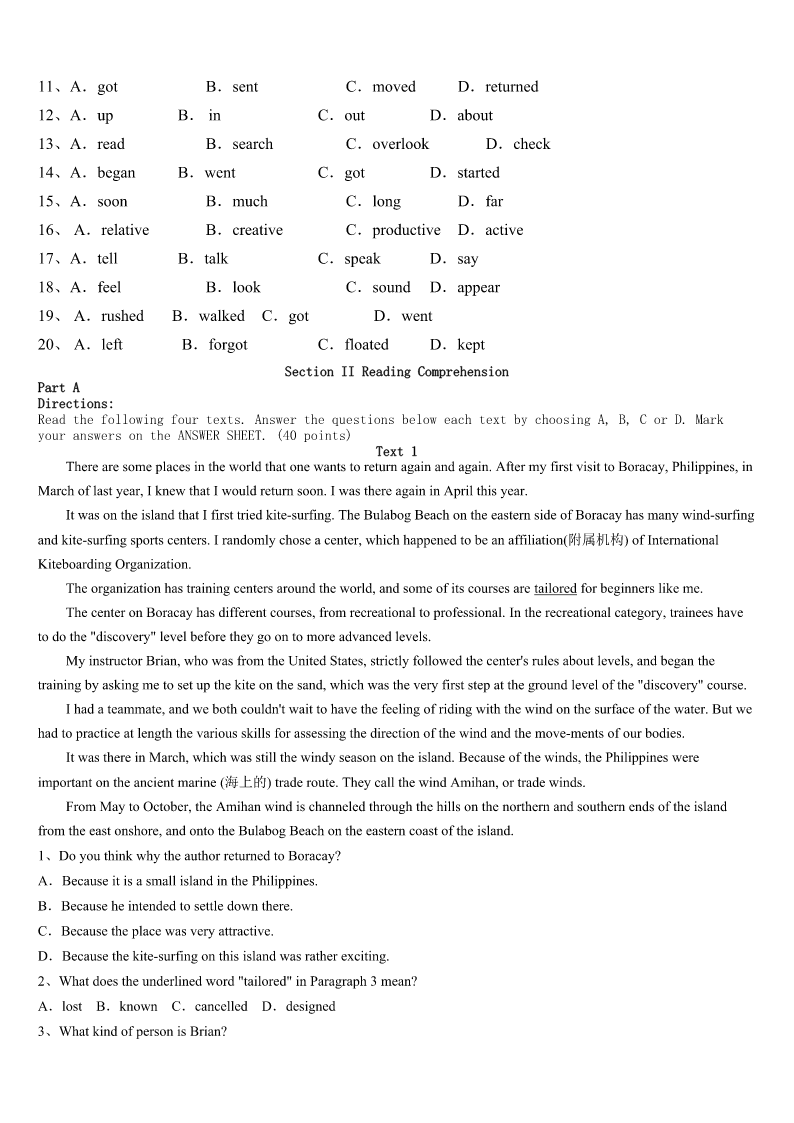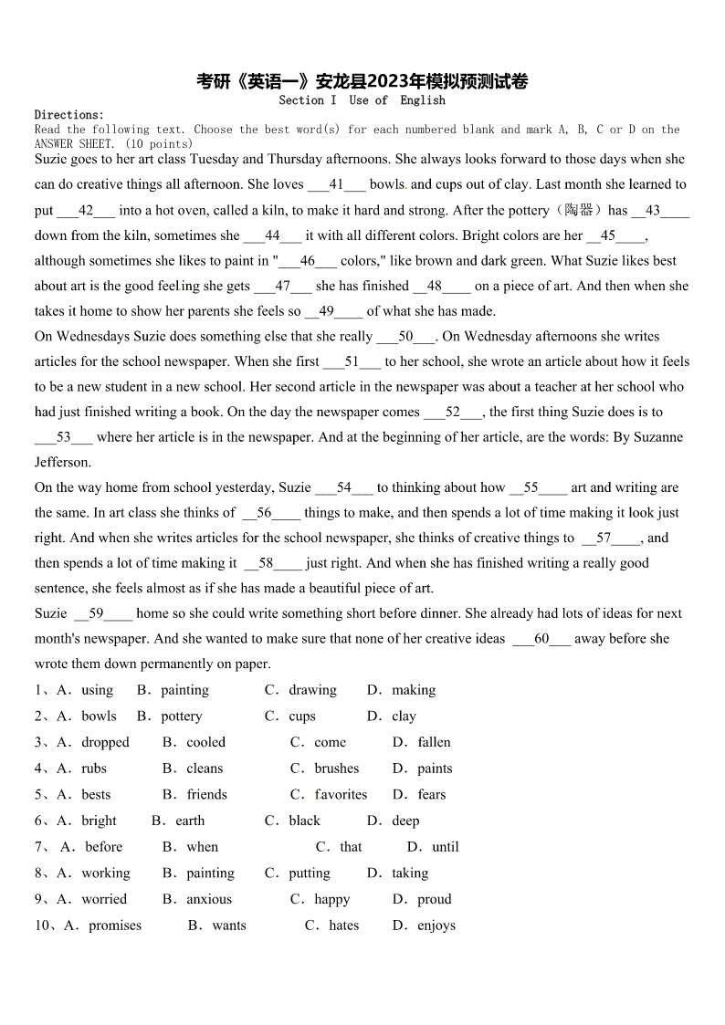 考研《英语一》安龙县2023年模拟预测试卷 SectionIUseofEnglish Directions: Readthefollowingtext.Choosethebestword(s)foreachnumberedblankandmarkA,B,CorDonthe ANSWERSHEET.(10points) SuziegoestoherartclassTuesdayandThursdayafternoons.Shealwayslooksforwardtothosedayswhenshe candocreativethingsallafternoon.Sheloves___41___bowlsandcupsoutofclay.Lastmonthshelearnedto put___42___intoahotoven,calledakiln,tomakeithardandstrong.Afterthepottery(陶器)has__43____ downfromthekiln,sometimesshe___44___itwithalldifferentcolors.Brightcolorsareher__45____, althoughsometimesshelikestopaintin"___46___colors,"likebrownanddarkgreen.WhatSuzielikesbest aboutartisthegoodfeelingshegets___47___shehasfinished__48____onapieceofart.Andthenwhenshe takesithometoshowherparentsshefeelsso__49____ofwhatshehasmade. OnWednesdaysSuziedoessomethingelsethatshereally___50___.OnWednesdayafternoonsshewrites articlesfortheschoolnewspaper.Whenshefirst___51___toherschool,shewroteanarticleabouthowitfeels tobeanewstudentinanewschool.Hersecondarticleinthenewspaperwasaboutateacheratherschoolwho hadjustfinishedwritingabook.Onthedaythenewspapercomes___52___,thefirstthingSuziedoesisto ___53___whereherarticleisinthenewspaper.Andatthebeginningofherarticle,arethewords:BySuzanne Jefferson. Onthewayhomefromschoolyesterday,Suzie___54___tothinkingabouthow__55____artandwritingare thesame.Inartclassshethinksof__56____thingstomake,andthenspendsalotoftimemakingitlookjust right.Andwhenshewritesarticlesfortheschoolnewspaper,shethinksofcreativethingsto__57____,and thenspendsalotoftimemakingit__58____justright.Andwhenshehasfinishedwritingareallygood sentence,shefeelsalmostasifshehasmadeabeautifulpieceofart. Suzie__59____homesoshecouldwritesomethingshortbeforedinner.Shealreadyhadlotsofideasfornext month'snewspaper.Andshewantedtomakesurethatnoneofhercreativeideas___60___awaybeforeshe wrotethemdownpermanentlyonpaper. 1、A.usingB.paintingC.drawingD.making 2、A.bowlsB.potteryC.cupsD.clay 3、A.droppedB.cooledC.comeD.fallen 4、A.rubsB.cleansC.brushesD.paints 5、A.bests