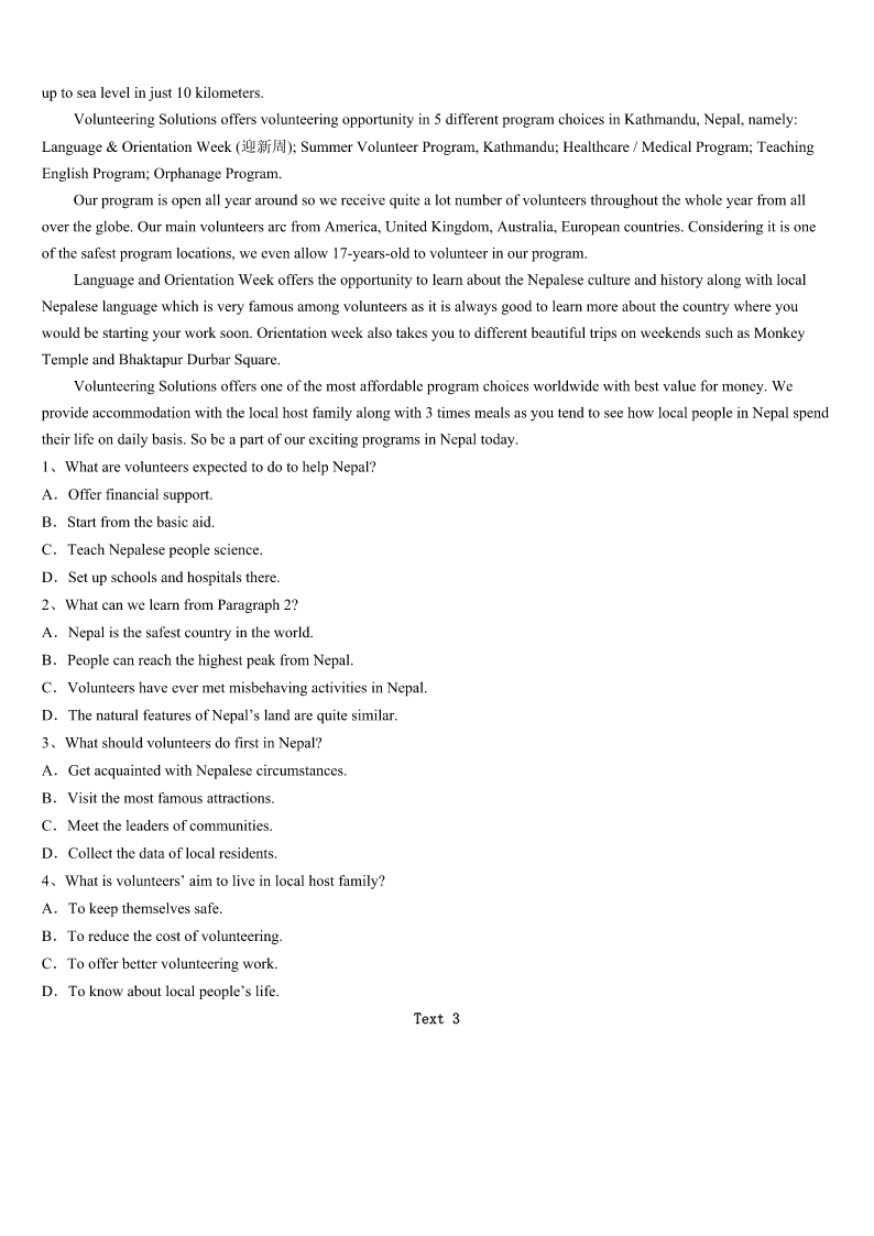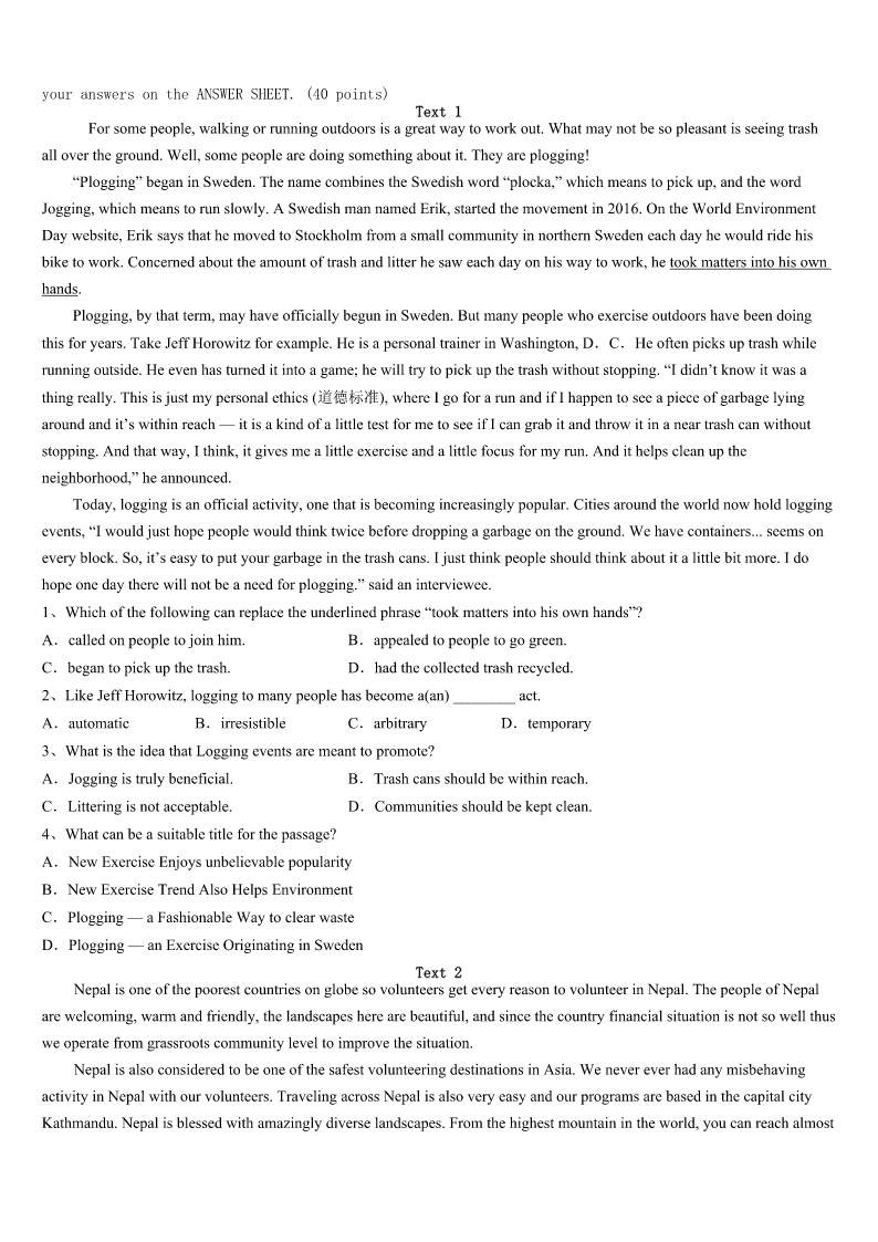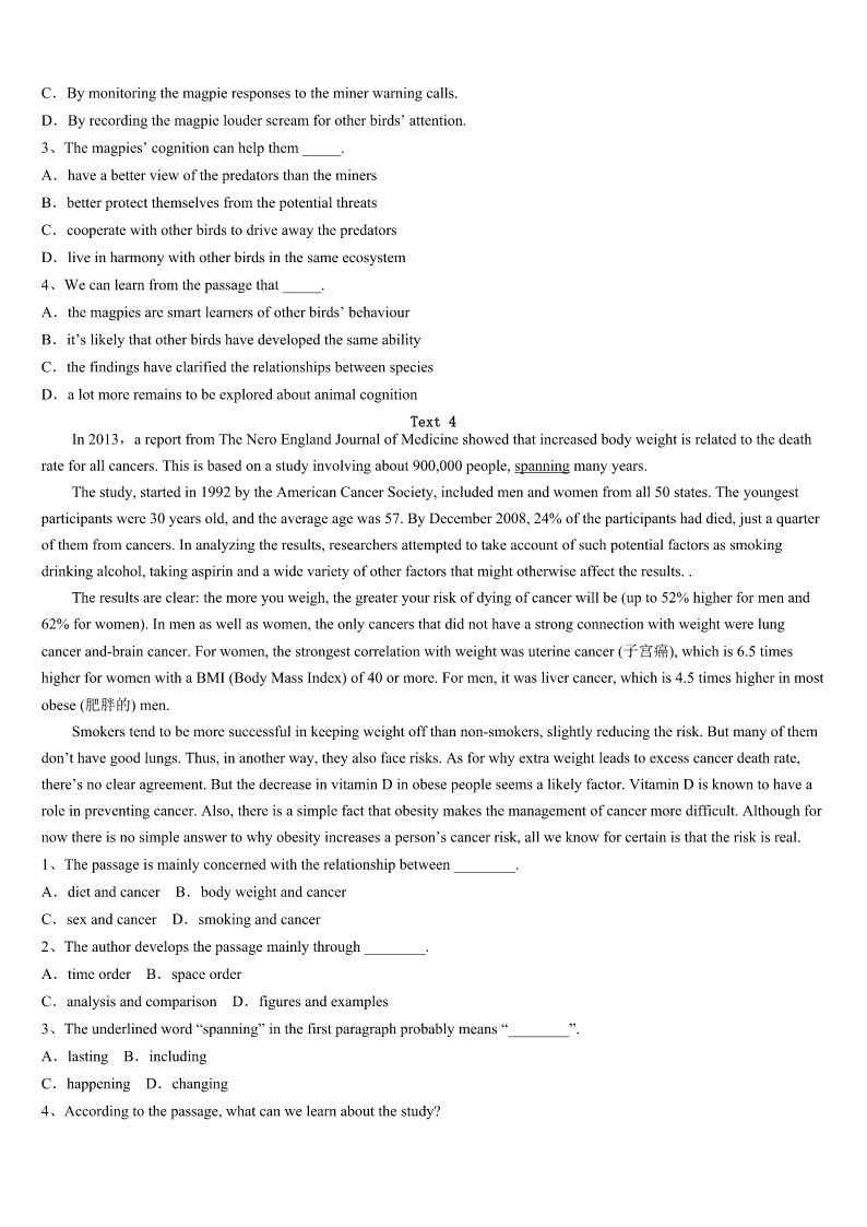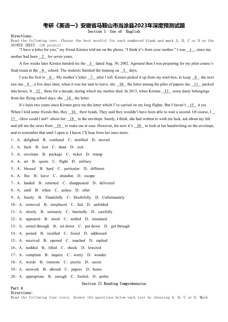 考研《英语一》安徽省马鞍山市当涂县2023年深度预测试题 SectionIUseofEnglish Directions: Readthefollowingtext.Choosethebestword(s)foreachnumberedblankandmarkA,B,CorDonthe ANSWERSHEET.(10points) “Ihavealetterforyou,”myfriendKirstentoldmeonthephone.“Ithinkit’sfromyourmother.”Iwas1,sincemy motherhadbeen2forsevenyears. AfewweekslaterKirstenhandedmethe3datedAug.30,2002.AgroundthenIwaspreparingformypilotcourse’s finalexamatthe4school.Thestudentsfinishedthetrainingon5days. Iwasthefirstto6.Mymother’sletter7afterIleft.Kirstenpickeditupfrommymail-box,tokeep8shenext sawme.9,afewdayslater,whenitwasherturntoleave,she10theletteramongthepilesofpapersshe11packed intoboxes.It12thereforadecade,duringwhichmymotherdied.In2013,whenKirsten13somedustybelongings fromherflyingschooldays,she14theletter. It’sbeentwoyearssinceKirstengavemetheletterwhichI’vecarriedonmylongflights.ButIhaven’t15ityet. WhenItoldsomefriendsthis,they16theirheads.Theysaidtheywouldn’thavebeenabletowaitasecond.Ofcourse,I 17-HowcouldInot?-abouther18intheenvelope.Surely,Ithink,shehadwrittentowishmeluck,askaboutmylife andtellmethenewsfrom19tomakemeatcase.However,fornowit’s20tolookatherhandwritingontheenvelope, andtorememberthatuntilIopenit,IknowI’llhearfromheroncemore. 1、A.delightedB.confusedC.terrifiedD.moved 2、A.backB.lostC.deadD.sick 3、A.envelopeB.packageC.ticketD.stamp 4、A.artB.sportsC.flightD.military 5、A.blessedB.hardC.particularD.different 6、A.fleeB.leaveC.abandonD.escape 7、A.landedB.returnedC.disappearedD.delivered 8、A.untilB.whenC.unlessD.after 9、A.SurelyB.ThankfullyC.DoubtfullyD.Unfortunately 10、A.removedB.misplacedC.hidD.unfolded 11、A.slowlyB.seriouslyC.hurriedlyD.carefully 12、A.appearedB.stoodC.settledD.remained 13、A.sortedthroughB.setdownC.putdownD.gotthrough 14、A.postedB.recalledC.foundD.addressed 15、A.receivedB.openedC.touchedD.replied 16、A.noddedB.liftedC.shookD.lowered 17、A.complainB.inquireC.worryD.wonder 18、A.wordsB.interestsC.puzzleD.secret 19、A.networkB.abroadC.papersD.home 20、A.appropriateB.enoughC.foolishD.polite SectionIIRea