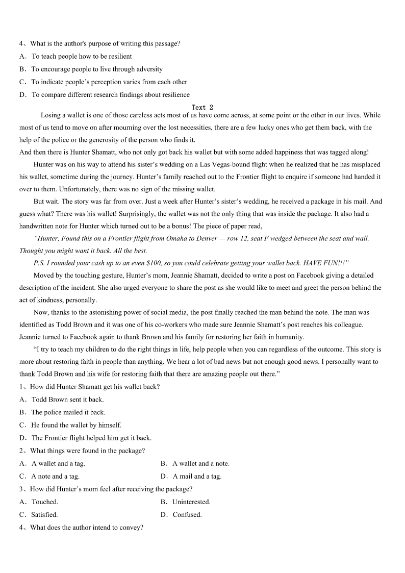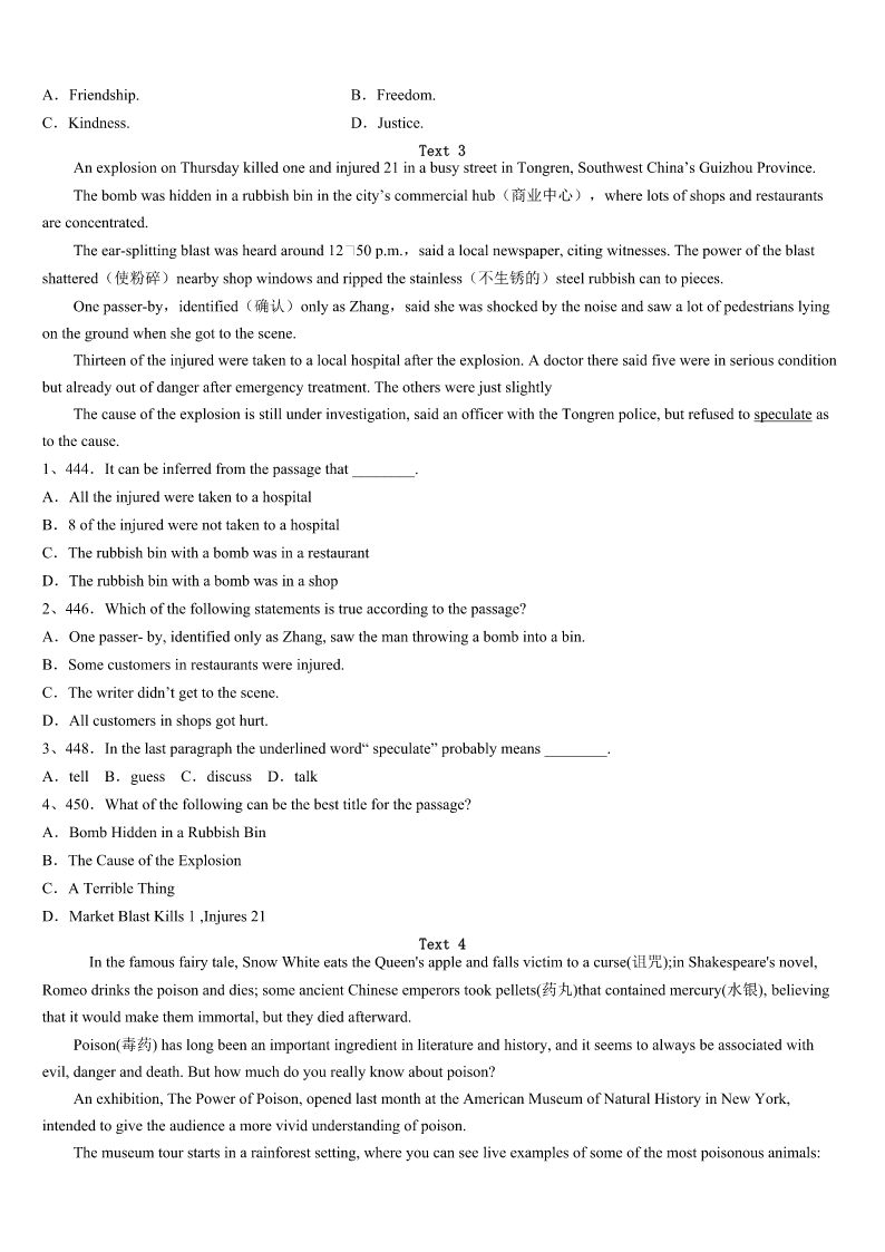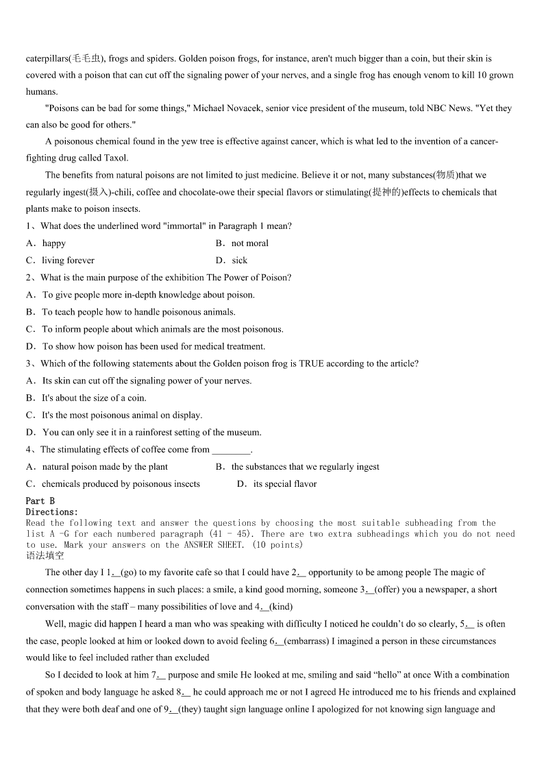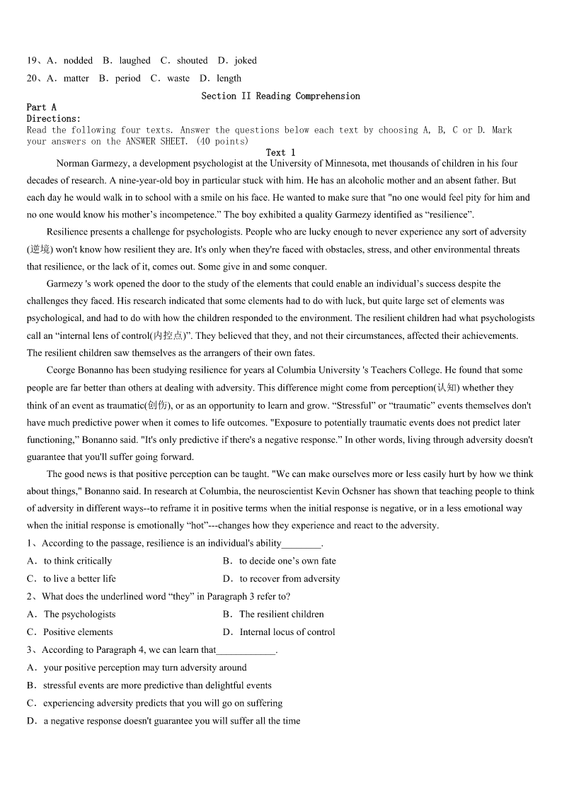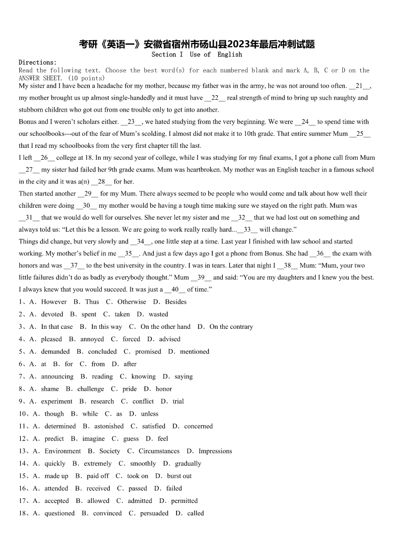 考研《英语一》安徽省宿州市砀山县2023年最后冲刺试题 SectionIUseofEnglish Directions: Readthefollowingtext.Choosethebestword(s)foreachnumberedblankandmarkA,B,CorDonthe ANSWERSHEET.(10points) MysisterandIhavebeenaheadacheformymother,becausemyfatherwasinthearmy,hewasnotaroundtoooften.__21__, mymotherbroughtusupalmostsingle-handedlyanditmusthave__22__realstrengthofmindtobringupsuchnaughtyand stubbornchildrenwhogotoutfromonetroubleonlytogetintoanother. BonusandIweren’tscholarseither.__23__,wehatedstudyingfromtheverybeginning.Wewere__24__tospendtimewith ourschoolbooks---outofthefearofMum’sscolding.Ialmostdidnotmakeitto10thgrade.ThatentiresummerMum__25__ thatIreadmyschoolbooksfromtheveryfirstchaptertillthelast. Ileft__26__collegeat18.Inmysecondyearofcollege,whileIwasstudyingformyfinalexams,IgotaphonecallfromMum __27__mysisterhadfailedher9thgradeexams.Mumwasheartbroken.MymotherwasanEnglishteacherinafamousschool inthecityanditwasa(n)__28__forher. Thenstartedanother__29__formyMum.Therealwaysseemedtobepeoplewhowouldcomeandtalkabouthowwelltheir childrenweredoing__30__mymotherwouldbehavingatoughtimemakingsurewestayedontherightpath.Mumwas __31__thatwewoulddowellforourselves.Sheneverletmysisterandme__32__thatwehadlostoutonsomethingand alwaystoldus:“Letthisbealesson.Wearegoingtoworkreallyreallyhard...__33__willchange.” Thingsdidchange,butveryslowlyand__34__,onelittlestepatatime.LastyearIfinishedwithlawschoolandstarted working.Mymother’sbeliefinme__35__.AndjustafewdaysagoIgotaphonefromBonus.Shehad__36__theexamwith honorsandwas__37__tothebestuniversityinthecountry.Iwasintears.LaterthatnightI__38__Mum:“Mum,yourtwo littlefailuresdidn’tdoasbadlyaseverybodythought.”Mum__39__andsaid:“YouaremydaughtersandIknewyouthebest. Ialwaysknewthatyouwouldsucceed.Itwasjusta__40__oftime.” 1、A.HoweverB.ThusC.OtherwiseD.Besides 2、A.devotedB.spentC.takenD.wasted 3、A.InthatcaseB.InthiswayC.OntheotherhandD.Onthecontrary 4、A.pleasedB.annoyedC.forcedD.advised 5、A.demandedB.concludedC.promisedD.mentioned 6、A.atB.forC.fromD.after 7、A.
