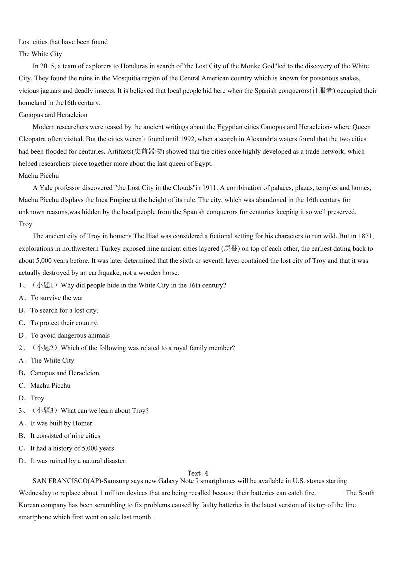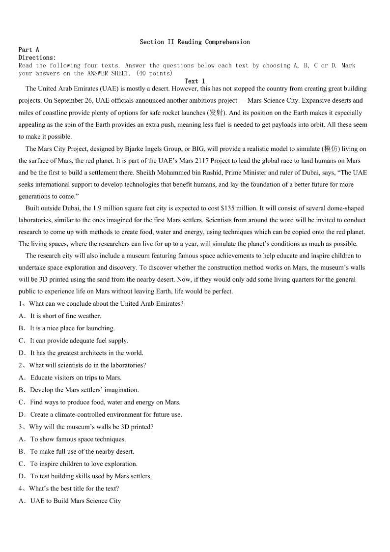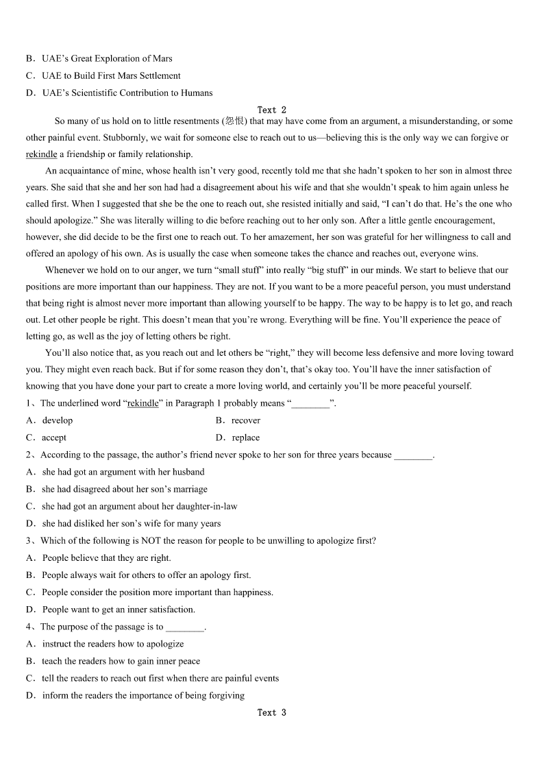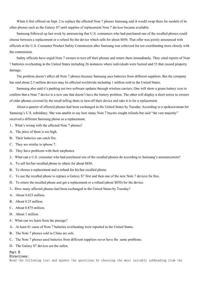 考研《英语一》宜宾市长宁县2023年模拟试题 SectionIUseofEnglish Directions: Readthefollowingtext.Choosethebestword(s)foreachnumberedblankandmarkA,B,CorDonthe ANSWERSHEET.(10points) ItwasonasunnySaturdayafternooninthespringof1949thatIlearnedanimportantlifelessonaboutjudgingothersby theirphysicalappearance. Asasenioratahighschool,Iworkedparttimeasasalesmanina1center.Thejobprovidedapleasantworking environmentandamodest2.Myweeklypaycheck3abasesalaryandcommissions(佣金)earnedonthe4of radiosandmusic-relatedaccessories(配件). Formaximum5atacquiringcommissions,especiallyonsalesofhigher-priceditems,twootherteenagesalesmenandI usedthe“up”system,takingturnsgreeting6enteringtheshop. Onthat7afternoon,atall,unshavenmanwalkedinwearingclothingmore8foryardworkthanforshopping. Thisslim,9fellowwasmy“up”,butafterglancingathis10,Iquicklyconcludedmy11wouldbemore profitablyspentwithanotherapparently12customer,soIlookedatmyco-workerNormanandsignaledthatIwasgiving upmy13tohim. Norman14asthisunseemlylookingfellowwalkedtotheradiodisplay,pointedattheTrans-Oceanicandasked whetherhehadsixin15.Normanlooked16atme,thenturnedandwentintothestoreroom.Heimmediately17and saidthatthereweresix.ThenthebuyeropenedhischeckbookandwaitedforNormantowritethe18.AndIwasaskedto helpcarrythesixTrans-Oceanicboxestothebackseatofthebuyer’scar19nearby. Eversincethatnotableafternoonsome68yearsago,Ihavecarefully20judgingothersonlyontheirappearance. 1、A.sportsB.musicC.drawingD.dancing 2、A.incomeB.productC.pensionD.profit 3、A.determinedB.adjustedC.combinedD.contributed 4、A.spreadB.focusC.saleD.record 5、A.freedomB.purposeC.expectationD.fairness 6、A.farmersB.customersC.workersD.educators 7、A.unbearableB.uncomfortableC.unreasonableD.unforgettable 8、A.suitableB.coolC.responsibleD.available 9、A.politeB.crazyC.proudD.ragged 10、A.statusB.appearanceC.expressionD.movement 11、A.effortsB.rewardsC.trendD.safety 12、A.wealthyB.busyC.plainD.common 13、A.causeB.turnC.bondD.plan 14、A.approachedB.compromisedC.pretendedD.apologized 15、A.demandB.exchangeC.advanceD.sto