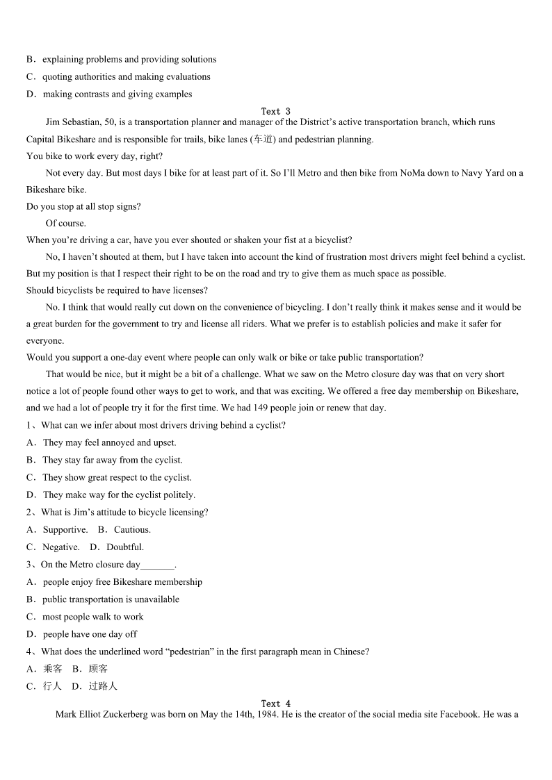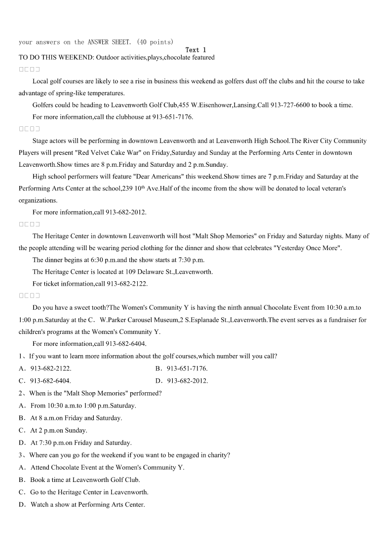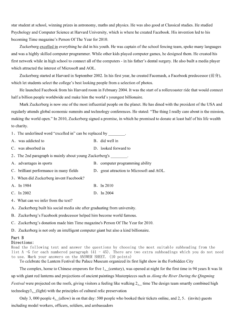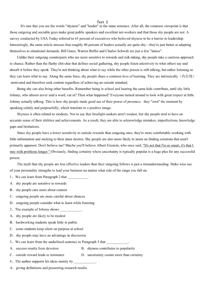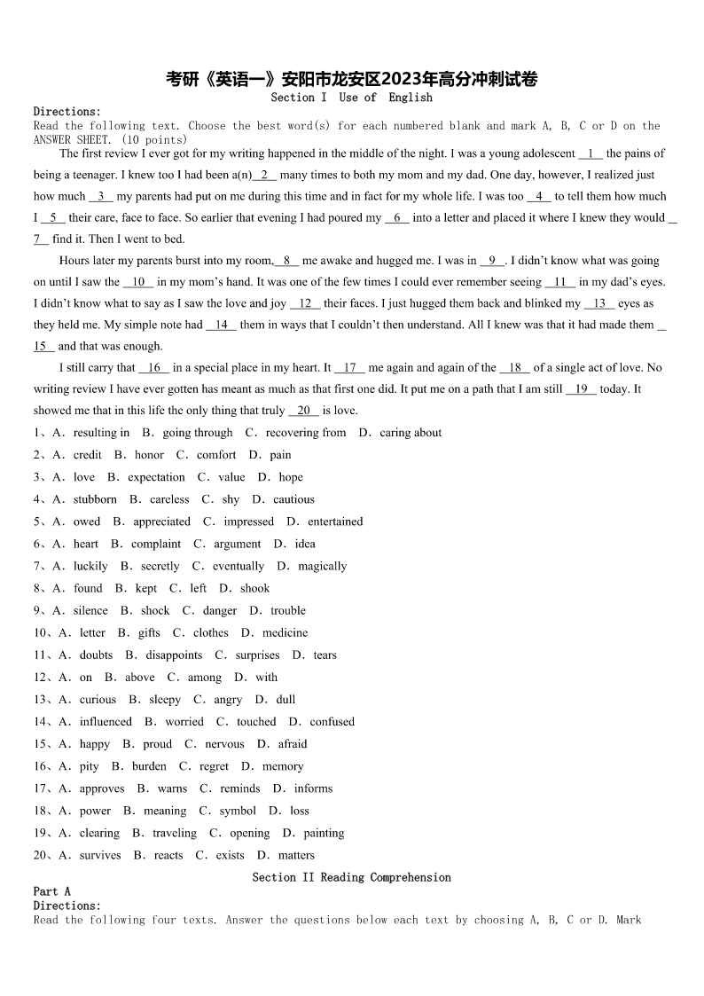 考研《英语一》安阳市龙安区2023年高分冲刺试卷 SectionIUseofEnglish Directions: Readthefollowingtext.Choosethebestword(s)foreachnumberedblankandmarkA,B,CorDonthe ANSWERSHEET.(10points) ThefirstreviewIevergotformywritinghappenedinthemiddleofthenight.Iwasayoungadolescent1thepainsof beingateenager.IknewtooIhadbeena(n)2manytimestobothmymomandmydad.Oneday,however,Irealizedjust howmuch3myparentshadputonmeduringthistimeandinfactformywholelife.Iwastoo4totellthemhowmuch I5theircare,facetoface.SoearlierthateveningIhadpouredmy6intoaletterandplaceditwhereIknewtheywould 7findit.ThenIwenttobed. Hourslatermyparentsburstintomyroom,8meawakeandhuggedme.Iwasin9.Ididn’tknowwhatwasgoing onuntilIsawthe10inmymom’shand.ItwasoneofthefewtimesIcouldeverrememberseeing11inmydad’seyes. Ididn’tknowwhattosayasIsawtheloveandjoy12theirfaces.Ijusthuggedthembackandblinkedmy13eyesas theyheldme.Mysimplenotehad14theminwaysthatIcouldn’tthenunderstand.AllIknewwasthatithadmadethem 15andthatwasenough. Istillcarrythat16inaspecialplaceinmyheart.It17meagainandagainofthe18ofasingleactoflove.No writingreviewIhaveevergottenhasmeantasmuchasthatfirstonedid.ItputmeonapaththatIamstill19today.It showedmethatinthislifetheonlythingthattruly20islove. 1、A.resultinginB.goingthroughC.recoveringfromD.caringabout 2、A.creditB.honorC.comfortD.pain 3、A.loveB.expectationC.valueD.hope 4、A.stubbornB.carelessC.shyD.cautious 5、A.owedB.appreciatedC.impressedD.entertained 6、A.heartB.complaintC.argumentD.idea 7、A.luckilyB.secretlyC.eventuallyD.magically 8、A.foundB.keptC.leftD.shook 9、A.silenceB.shockC.dangerD.trouble 10、A.letterB.giftsC.clothesD.medicine 11、A.doubtsB.disappointsC.surprisesD.tears 12、A.onB.aboveC.amongD.with 13、A.curiousB.sleepyC.angryD.dull 14、A.influencedB.worriedC.touchedD.confused 15、A.happyB.proudC.nervousD.afraid 16、A.pityB.burdenC.regretD.memory 17、A.approvesB.warnsC.remindsD.informs 18、A.powerB.meaningC.symbolD.loss 19、A.clearingB.travelingC.openingD.painting 20、A.survivesB.reactsC.existsD.matters SectionIIReadingComprehension PartA Di