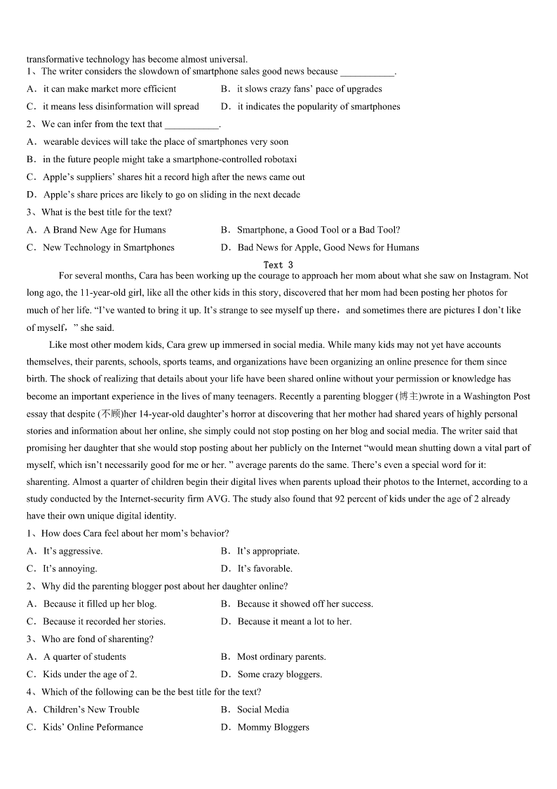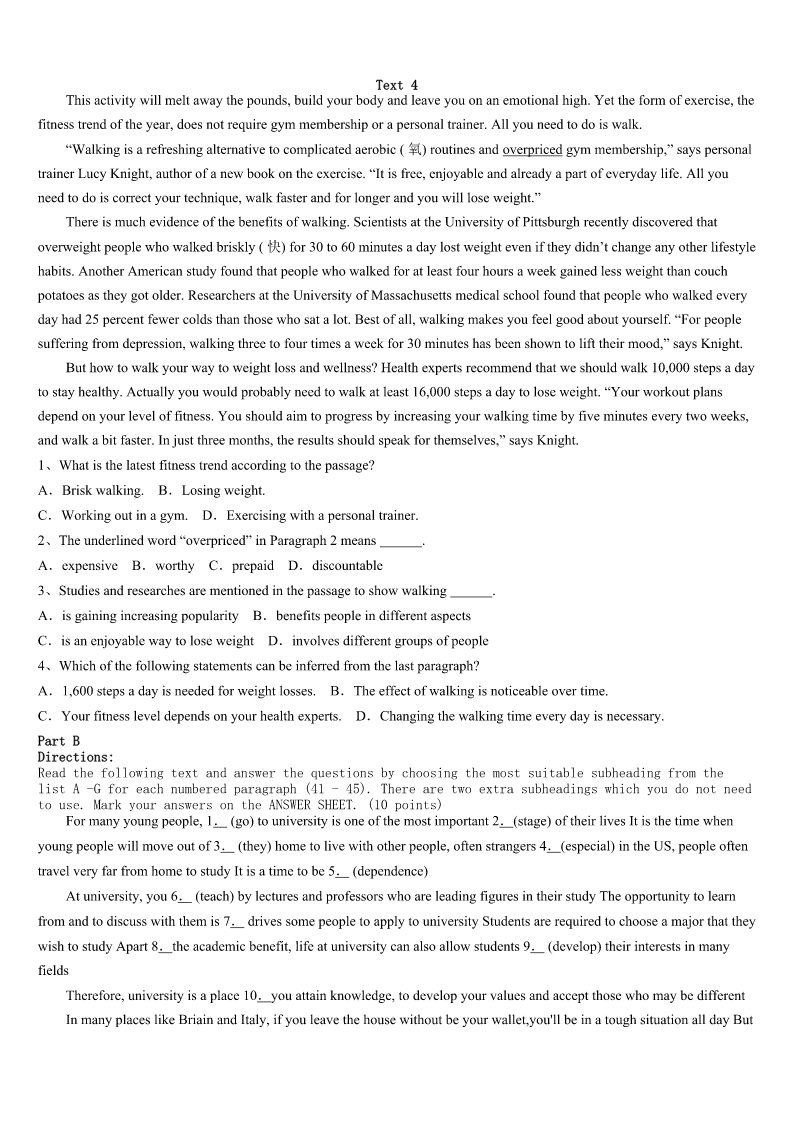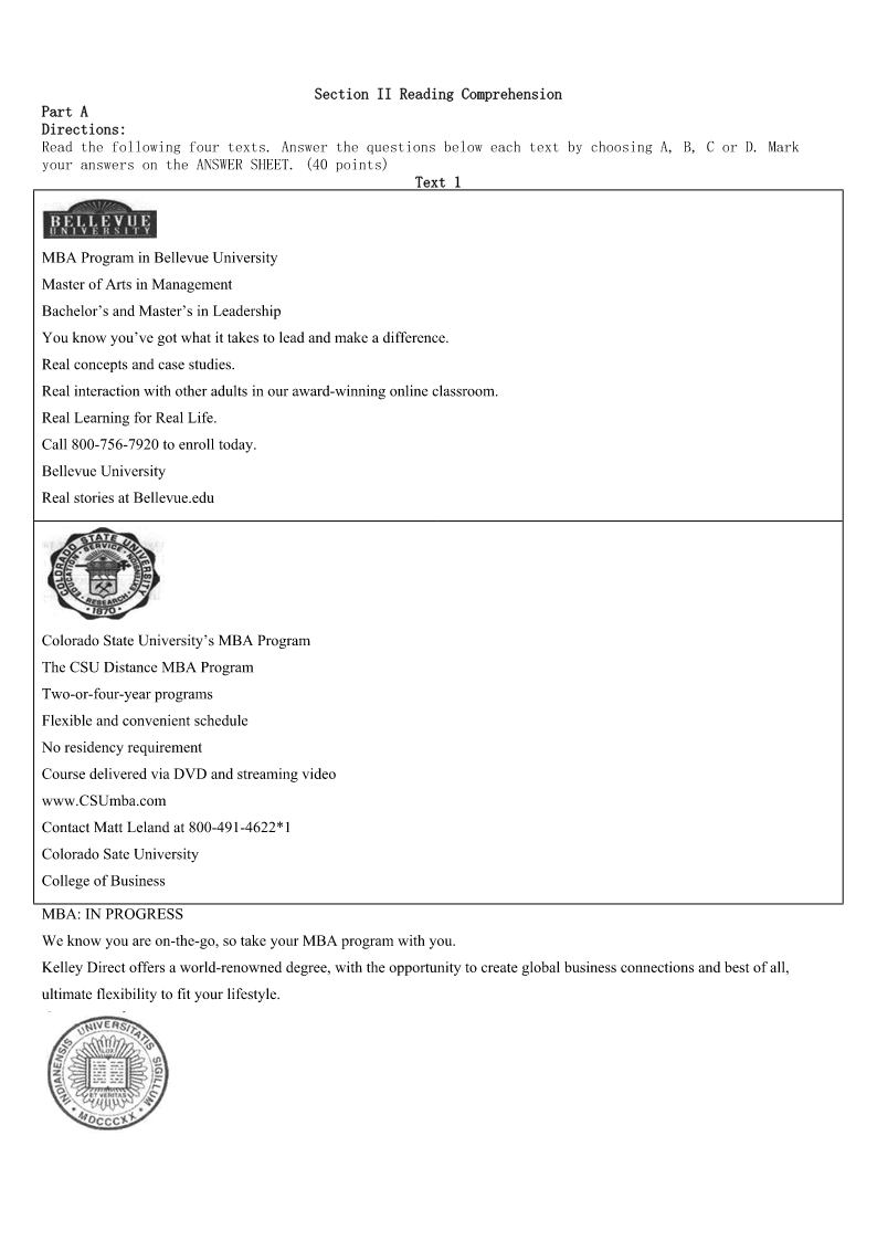 考研《英语一》山东省临沂市苍山县2023年全真模拟试卷 SectionIUseofEnglish Directions: Readthefollowingtext.Choosethebestword(s)foreachnumberedblankandmarkA,B,CorDonthe ANSWERSHEET.(10points) AsRyanLeeCoxwaswaitingtopayforhiscoffeeorderatanIndiana,USfastfooddrive-through,hedecidedtotry somethinghe’dseenonaTVnewsshow-hepaidforthecoffeeorderofthedriverinthecarbehind.Thesmall1madethe youngbusinesspersonfeel2,sohesharedhisexperienceonFacebook.Anoldfriendsuggestedthat3payingfor people’scoffee,Ryanputthatmoneytowardshelpingschoolstudentspayofftheirdelinquent(拖欠税款的)schoollunch accounts.Sometimesbecauseof4hardship,theaccountsfallinto5balanceandthekidssuffer.Shegottheideaafter hearingthataUtahstudentwas6lunch. SothefollowingweekRyanvisitedhisnephew’sschool7andaskedifhecouldgivesomehelp,and8$100. Impressedbyhis9,thesupervisorbegan10finesbeforeRyanaskedwhattheentireschool’sbalanceforluncheswas.It was$1261.98.“I’llseeyounextFriday,”hetoldthesupervisor. Whenhegothome,Ryansharedwhathehaddoneonsocial11,andthathe12tohelpLakesideElementaryhave nolunchaccountsinthenegative.Hesetupabankaccountandencouragedpeopleto13.Theirtargetwas14ina matterofdays.WithmorethanenoughmoneytopayforLakeside,Ryan15anotherschool. Withintwoweekstheyhad16$4142.82andwereabletohelpfourschools.Inspiredbypeople’s17,Ryan organizedanon-profitcalledFeedtheKids,Inc.,which18awebsite,www.kidslunches.org,forpeopletostart19for specificschoolsortosetuprepeatedpaymentsto20astudent.Today,this“payingitforward”organizationisontoitsfifth school. 1、A.gestureB.reactionC.proposalD.request 2、A.awkwardB.annoyedC.greatD.inspired 3、A.ratherthanB.duetoC.apartfromD.alongwith 4、A.artificialB.economicC.unconsciousD.controversial 5、A.negativeB.beneficialC.transparentD.delicate 6、A.awardedB.paidC.requiredD.denied 7、A.cafeteriaB.facilityC.dormitoryD.website 8、A.handedoutB.handedinC.handedoverD.handedon 9、A.curiosityB.generosityC.purityD.reliability 10、A.takingoffB.puttingoffC.payingoffD.lettingoff 11、A.contextB.clubC.systemD.media 12、A.endedB.pretendedC.extendedD.i