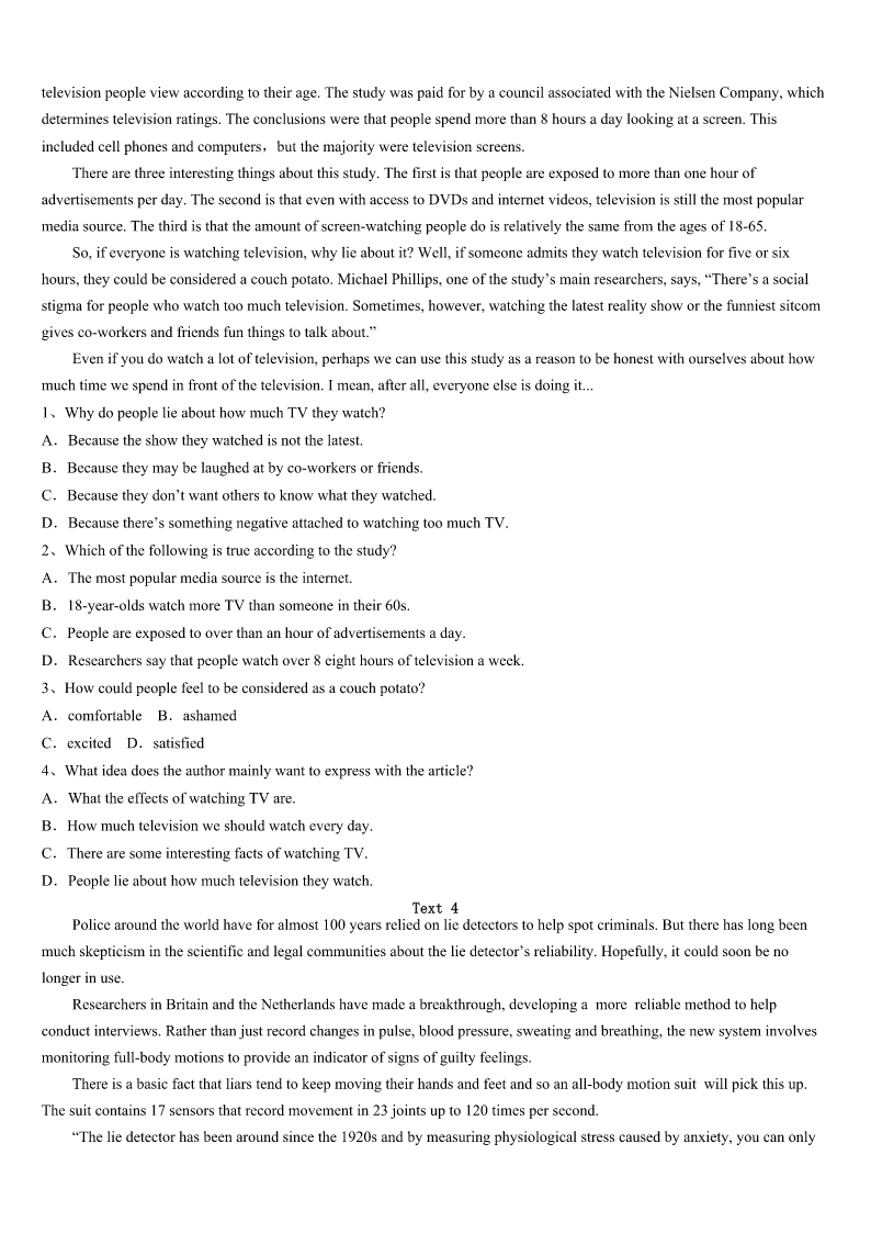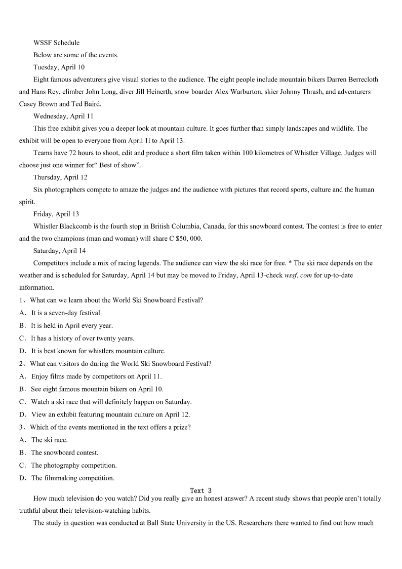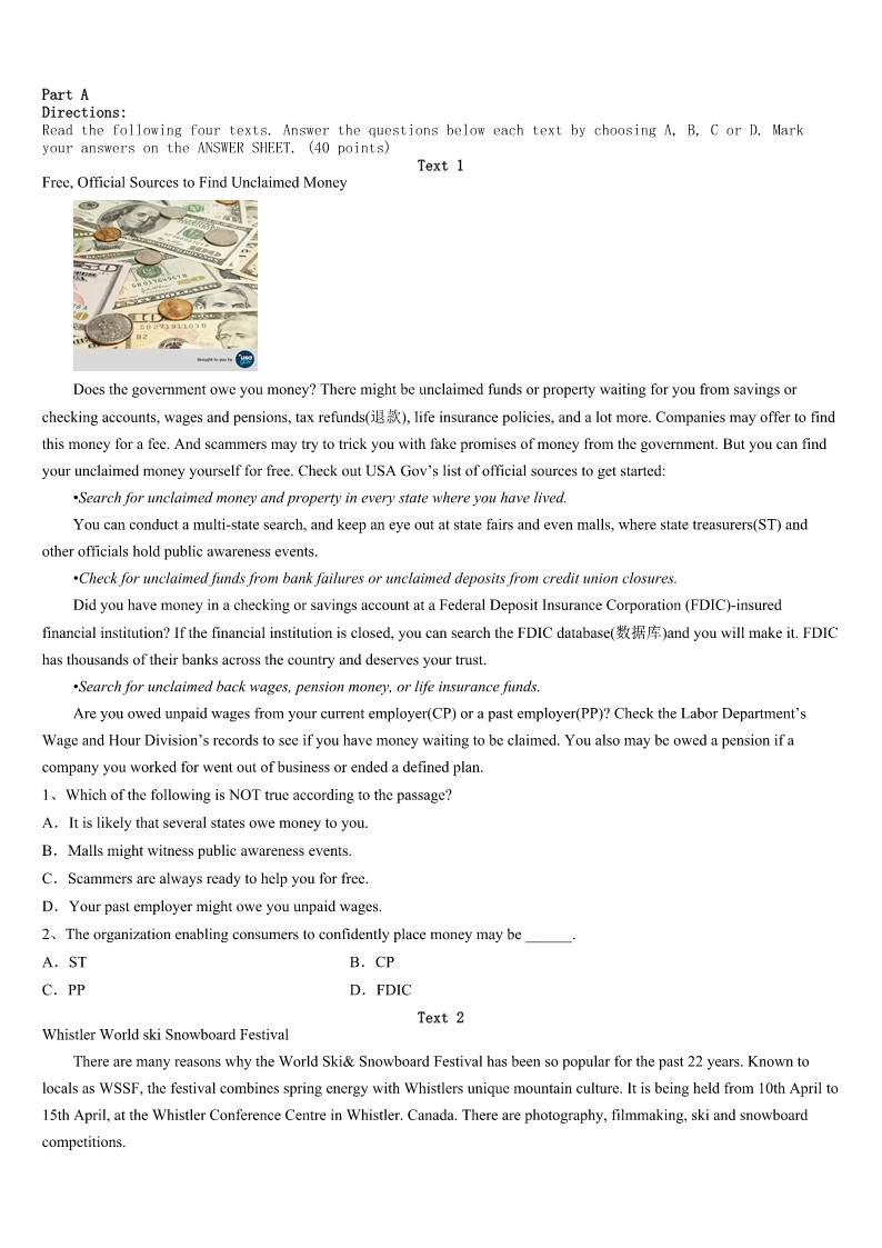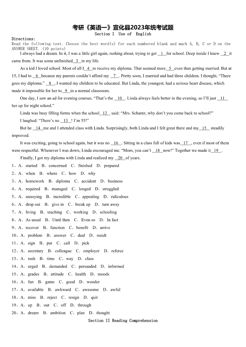 考研《英语一》宣化县2023年统考试题 SectionIUseofEnglish Directions: Readthefollowingtext.Choosethebestword(s)foreachnumberedblankandmarkA,B,CorDonthe ANSWERSHEET.(10points) Ialwayshadadream.Init,Iwasalittlegirlagain,rushingabout,tryingtoget1forschool.DeepinsideIknew2it camefrom.Itwassomeunfinished3inmylife. AsakidIlovedschool.MostofallI4toreceivemydiploma.Thatseemedmore5eventhangettingmarried.Butat 15,Ihadto6becausemyparentscouldn’taffordmy7.Prettysoon,Imarriedandhadthreechildren.Ithought,“There goesmydiploma.”8,Iwantedmychildrentobeeducated.ButLinda,theyoungest,hadaseriousheartdisease,which madeitimpossibleforherto9inanormalclassroom. Oneday,Isawanadforeveningcourses.“That’sthe10.Lindaalwaysfeelsbetterintheevening,soI’lljust11 herupfornightschool.” Lindawasbusyfillingformswhentheschool12said:“Mrs.Schantz,whydon’tyoucomebacktoschool?” Ilaughed:“There’sno13!I’m55!” Buthe14meandIattendedclasswithLinda.Surprisingly,bothLindaandIfeltgreatthereandmy15steadily improved. Itwasexciting,goingtoschoolagain,butitwasno16.Sittinginaclassfullofkidswas17,evenifmostofthem wererespectful.WheneverIwasdown,Lindaencouragedme.“Mom,youcan’t18now!”Togetherwemadeit19. Finally,IgotmydiplomawithLindaandrealizedmy20ofyears. 1、A.startedB.concernedC.finishedD.prepared 2、A.whenB.whereC.howD.why 3、A.homeworkB.diplomaC.accidentD.business 4、A.requiredB.managedC.longedD.struggled 5、A.annoyingB.incredibleC.appealingD.ridiculous 6、A.dropoutB.giveinC.breakupD.turnaway 7、A.livingB.teachingC.workingD.schooling 8、A.AsusualB.UntilthenC.EvensoD.Infact 9、A.recoverB.functionC.benefitD.arrive 10、A.problemB.answerC.dealD.result 11、A.signB.putC.callD.pick 12、A.secretaryB.colleagueC.employerD.referee 13、A.rushB.timeC.wayD.class 14、A.urgedB.demandedC.persuadedD.informed 15、A.gradesB.attitudeC.healthD.moods 16、A.funB.gameC.goodD.wonder 17、A.availableB.awkwardC.awesomeD.awful 18、A.missB.rejectC.resignD.quit 19、A.upB.outC.offD.through 20、A.dreamB.ambitionC.planD.thought SectionIIReadingComprehension PartA Directions: Readthefollow