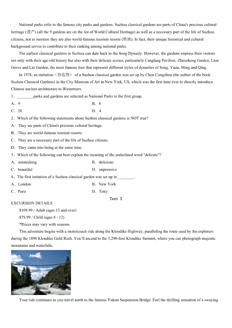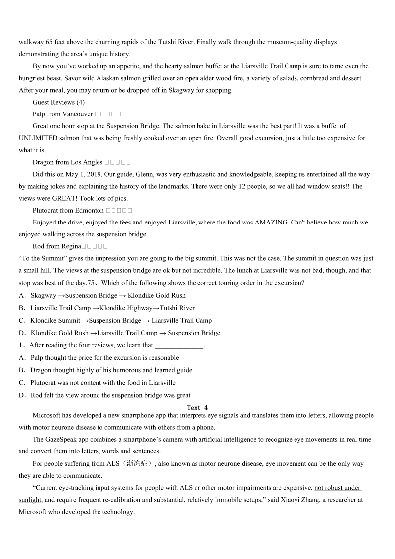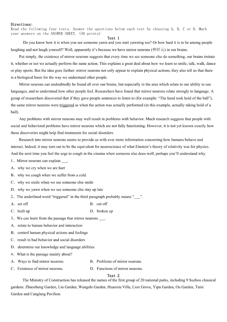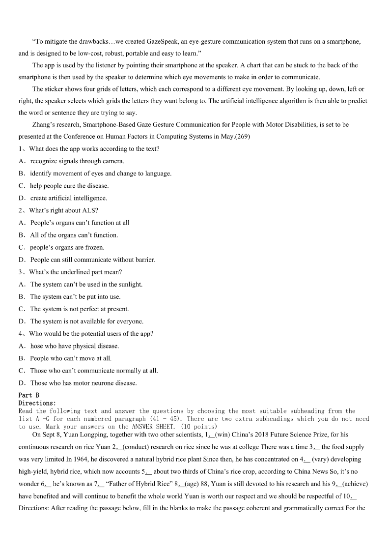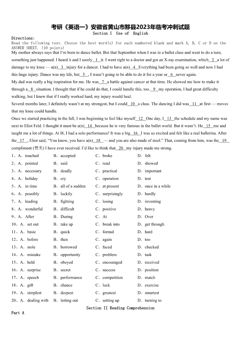考研《英语一》安徽省黄山市黟县2023年临考冲刺试题 SectionIUseofEnglish Directions: Readthefollowingtext.Choosethebestword(s)foreachnumberedblankandmarkA,B,CorDonthe ANSWERSHEET.(10points) MymotheralwayssaysthatI’mborntodanceballet.ButthatSeptemberwhenIwasinaballetclassandwenttodoaturn, somethingjusthappened.IhearditandIsurely1it.IwentrighttoadoctorandgotanX-rayexamination,which2alotof damagetomyknee—a(n)3injuryforadancer.Ihadtohavea(n)4EverythinghadbeengoingsowellandnowIhad thishugeinjury.Dancewasmylife,but5,Iwasn’tgoingtobeabletodoitforayearor6neveragain. Mydadwasreallyabiginspirationforme.Hewas7abattleagainstcanceratthattime.Heshowedmehowtomakeit througha8situation.Ithoughtthatifhecoulddothat,Icouldhandlethis,too.9myoperation,Ihadgreatdifficulty walking,butIknewthatifIreallyworkedhard,myinjurywouldheal. Severalmonthslater,Idefinitelywasn’tatmystrongest,butIcould10aclass.ThedancingIdidwas11atfirst—moves thatmykneecouldhandle. Oncewestartedpracticinginthefall,Iwasbeginningtofeellikemyself12Oneday,I13thescheduleandmynamewas nexttoEliotFeld.Ithoughtitmustbea(n)14becauseheisveryfamousintheballetworld.Butitwasn’t.He15meand taughtmealotofthings.Atl8,Ihadasoloperformance!Itwasabig16Iwassoexcitedandfeltlikearealballerina.After the17,Eliotsaid,“Youknow,youhavea(n)18—andyouarealsomadeofsteel.”That,comingfromhim,wasthe19 compliment(赞美)Ihaveeverreceived.I’dliketothinkthat20myinjurymademestrong. 1、A.touchedB.acceptedC.brokeD.felt 2、A.pointedB.saidC.readD.showed 3、A.necessaryB.deadlyC.practicalD.important 4、A.holidayB.cryC.operationD.test 5、A.intimeB.allofasuddenC.atpresentD.onceinawhile 6、A.possiblyB.luckilyC.surprisinglyD.hardly 7、A.leadingB.fightingC.losingD.inventing 8、A.wonderfulB.difficultC.positiveD.heavy 9、A.AfterB.DuringC.AtD.Over 10、A.setoutB.takeupC.breakintoD.getthrough 11、A.basicB.quickC.formalD.hard 12、A.beforeB.thenC.againD.too 13、A.stoleB.borrowedC.facedD.checked 14、A.mistakeB.opportunityC.problemD.task 15、A.heldB.obeyedC.encouragedD.received 16、A.surpriseB.secretC.successD.position 17