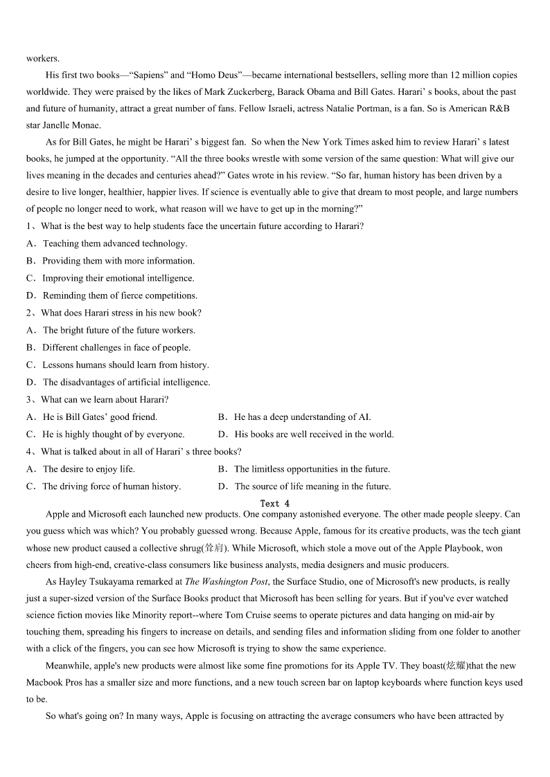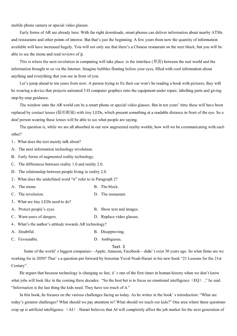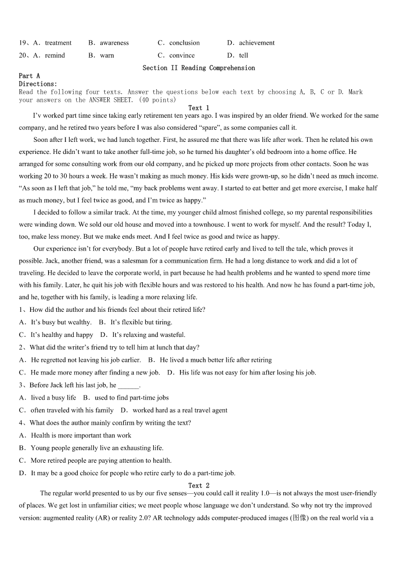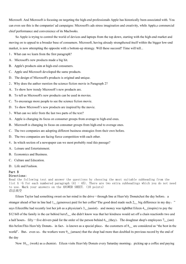 考研《英语一》山东省聊城市东阿县2023年全真模拟试题 SectionIUseofEnglish Directions: Readthefollowingtext.Choosethebestword(s)foreachnumberedblankandmarkA,B,CorDonthe ANSWERSHEET.(10points) Iwasatthepostofficeearlythatmorning,hopingtobeinandoutinashortwhile.Yet,I1myselfstandinginaqueuethat wentallthewayintothehallway.Ihadneverseensomanypeoplethereonaweekday.Itseemedsomeonemighthavemade anannouncement,2customerstocarryasmanypackagesastheycould.Ialsoneededtohavemyownpackage3The queuemovedveryslowly.Mypatience4andIgotannoyed.Thelongerittook,theangrierIbecame.WhenIgottothe counterfinally,Ifinishedmy5quicklyandbriefly,andthenwalkedpastthequeuethatwasnowextendingpastthefront door. “Excuseme,”Isaid,tryingnottobetoopushy.Severalpeoplehadtomove6tomakeroomformetogettothe7. Isteppedout,8abouttheserviceconditions.ThinkingIwasgoingtobelateformydentistappointment,I9intothe parkinglot. Awomanwascomingacrossthelotinmy10Shewaswalkingwithdetermination,andeachstepsoundedvery11I noticedthatshelookedasifshecouldbreathefire.Itstoppedmeinmytracks.HadIlookedlikethat?Herbodylanguagesaid thatshewashavinga12day.Myangermeltedaway.IwishedIcouldwrapherina13butIwasastranger.SoIdidwhat Icouldinaminute14shehurriedpastme-Ismiled.Inasecondeverythingchanged.Shewasastonished,thensomewhat 15Thenherfacesoftenedandhershoulders16Isawhertakeadeepbreath.Herpaceslowedandshesmiledbackatmeas wepassedeachother. Icontinuedtosmileallthewaytomycar.Wow,it’samazing17asimplesmilecando. Fromthenon,Ibecameawareofpeople’s18andmyown,thewayweshowourfeelings.NowIusethat19everydayto letit20methatwhenfacingtheworld,Icantryasmile. 1、A.foundB.dislikedC.keptD.avoided 2、A.hopingB.welcomingC.requiringD.ordering 3、A.paidB.receivedC.weighedD.bought 4、A.diedoutB.fadedoutC.burstoutD.ranout 5、A.businessB.dutyC.turnD.part 6、A.onB.aboutC.inD.aside 7、A.counterB.officeC.exitD.car 8、A.talkingB.complainingC.worryingD.hearing 9、A.headedB.lookedC.pulledD.turned 10、A.wayB.timeC.directionD.course 11、A.slowB.stableC.lightD.heavy 12、A.roughB.dullC.smoothD.bright 13、A.smi
