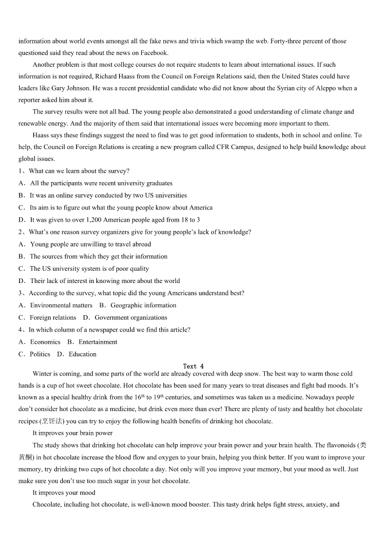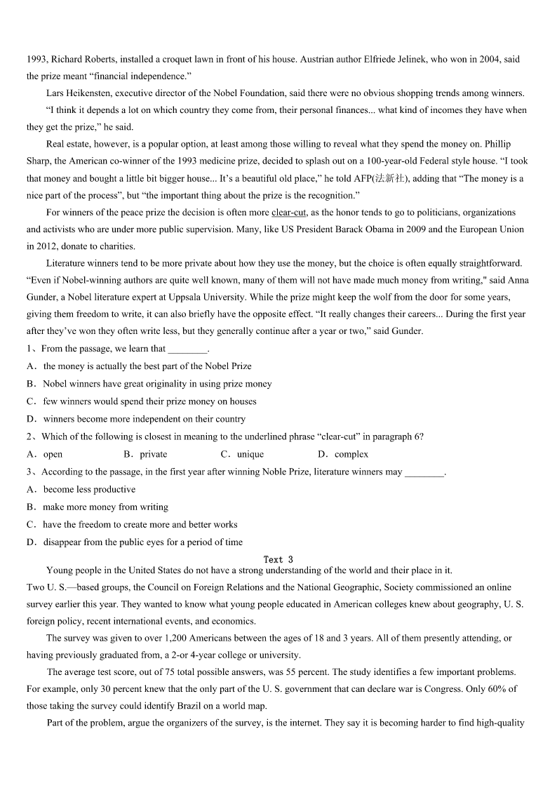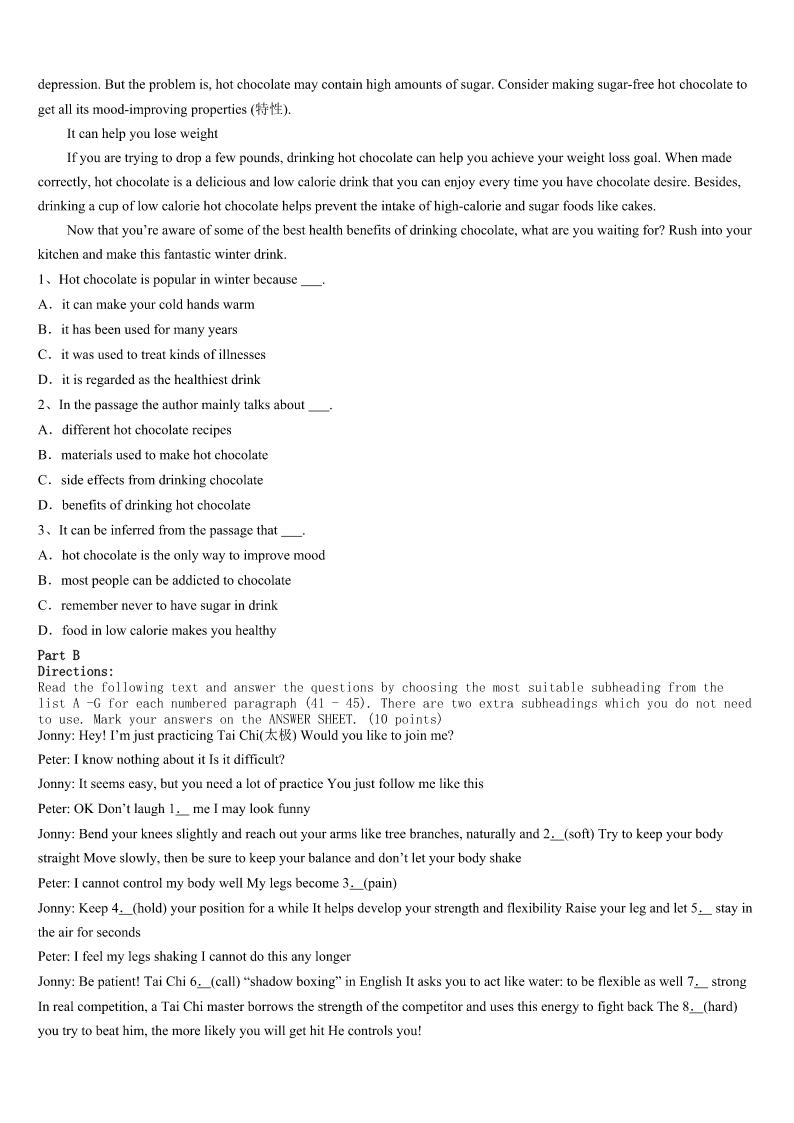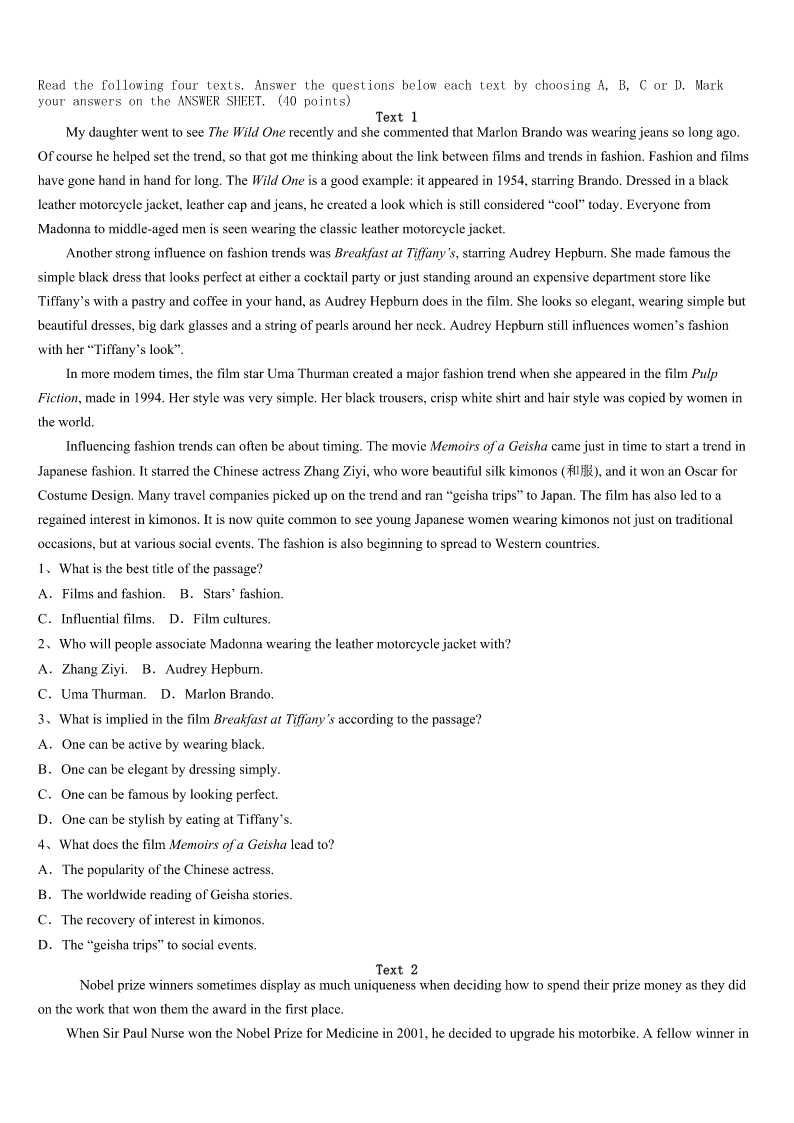 考研《英语一》山东省潍坊市临朐县2023年高分冲刺试卷 SectionIUseofEnglish Directions: Readthefollowingtext.Choosethebestword(s)foreachnumberedblankandmarkA,B,CorDonthe ANSWERSHEET.(10points) Footracing(竞走)isapopularactivityintheUnitedStates.Itisnotonlyseenasacompetitivesport,butalsoasa1to exercise.Though2runnersmayspendmonthstrainingtocompete,otherrunnersandwalkersmightnottrainatal1.3 notcompetingtowinmightruninaneffortto4theirowntime,or5toenjoythefunandexercise.Peopleofall6 ,fromthoselessthanoneyearoldtothoseintheir80s,7intothissport.Theracesareheldoncitystreets,oncollege campuses,8parks,andinsuburbanareas,andcommonly5to10kilometersin9. Thelargestfootraceintheworldisthe12-kilometerBaytoBreakers10thatisheldinSanFranciscoeveryspring.Thisrace 11ontheeastsideofthecitynearSanFranciscoBayandendsonthe12sideatthePacificOcean.In1993therewere 80,000people13inthisracethroughthestreetsandhillsofSanFrancisco.Inthe14aretheseriousrunnerswho competetowin,and15mightfinishinaslittleas34minutes.Behindthem16thethousandswhotakeseveralhoursto finish.Inthebackoftheracearethosewhowearvariousclothingjustfor17.Therewasagroupoffirefighterswhowere all18inalonglineandwerecarryingafire-hose(消防水龙带).Oneyeartherewasawedding19.inwhichthebride dressedinalongwhitedressandthegroomworeatuxedo(晚礼服).They20flowerstoby-standers,andwereactually marriedatsomepointalongtheroute. 1、A.planB.designC.sportD.way 2、A.seriousB.amateurC.famousD.ordinary 3、A.OthersB.TheseC.ThoseD.Ones 4、A.saveB.beatC.wasteD.value 5、A.finallyB.simplyC.partlyD.certainly 6、A.agesB.walksC.sortsD.nations 7、A.turnB.1ookC.breakD.enter 8、A.acrossB.overC.throughD.on 9、A.sizeB.1engthC.depthD.height 10、A.raceB.cityC.groundD.ceremony 11、A.holdsB.goesC.beginsD.carries 12、A.northB.southC.eastD.west 13、A.signingB.helpingC.watchingD.running 14、A.beginningB.frontC.courseD.process 15、A.whoB.whatC.whichD.As 16、A.stayB.fallC.areD.stand 17、A.funB.medalC.winD.prize 18、A.wrappedB.followedC.separatedD.tied 19、A.dinnerB.partyC.dayD.invitation 20、A.soldB.presentedC.threwD.Donated Sect
