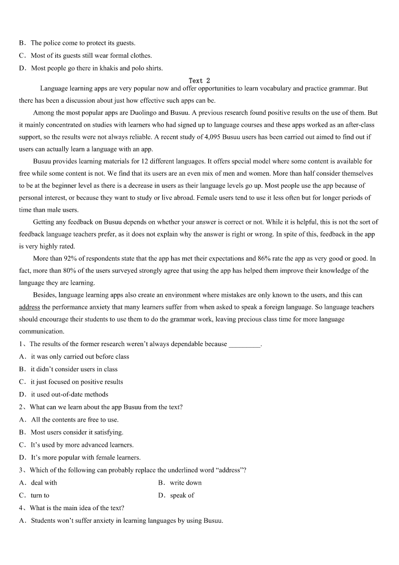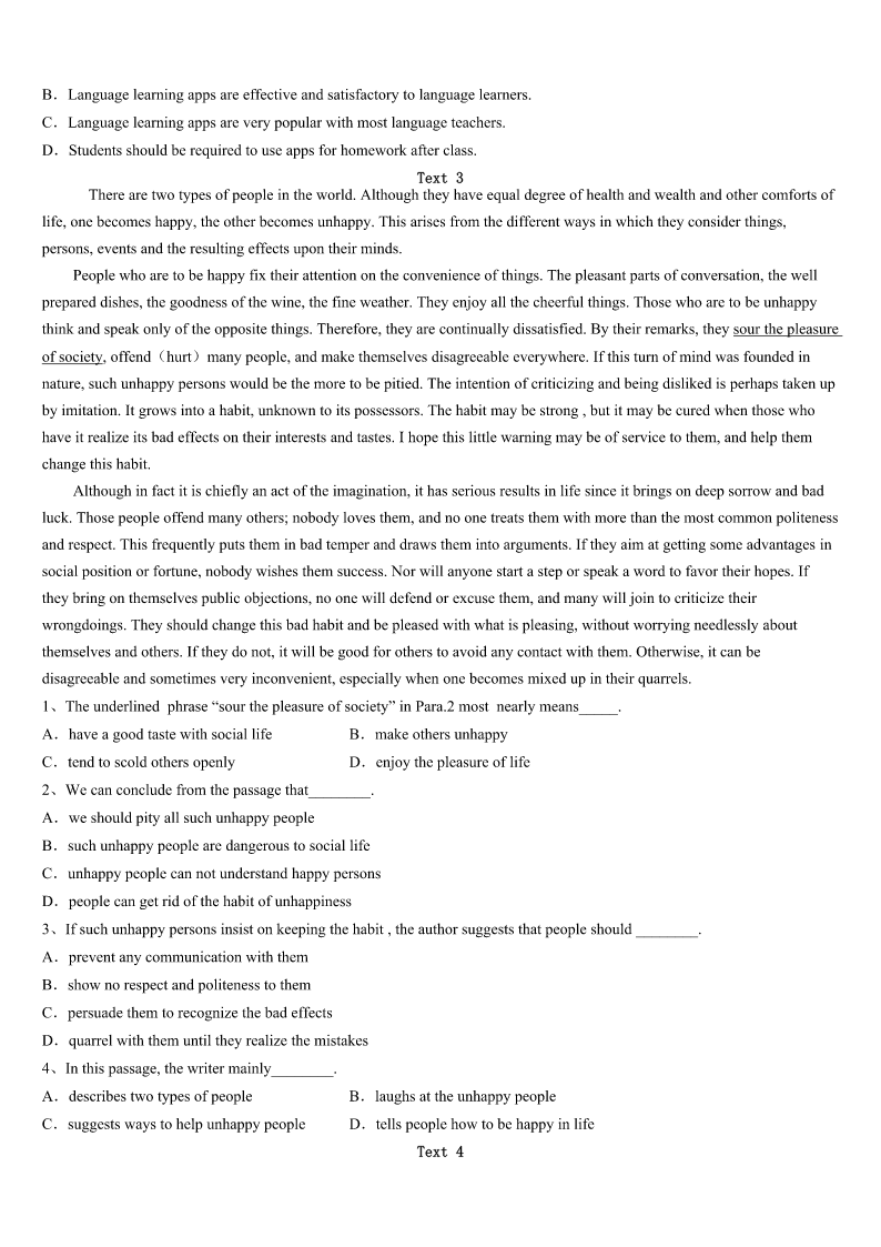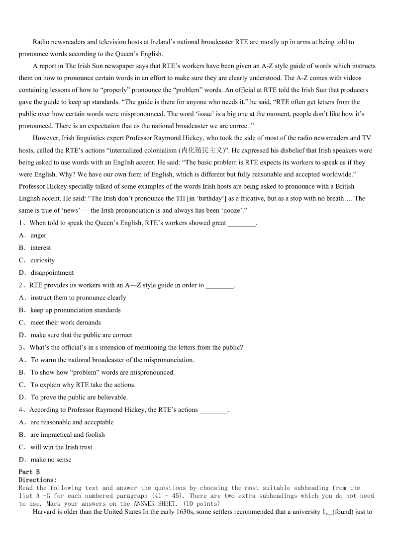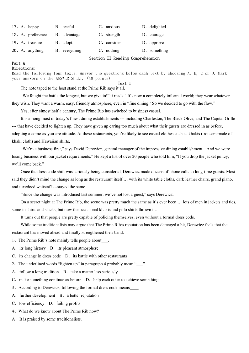 考研《英语一》富源县2023年巅峰冲刺试卷 SectionIUseofEnglish Directions: Readthefollowingtext.Choosethebestword(s)foreachnumberedblankandmarkA,B,CorDonthe ANSWERSHEET.(10points) Myfatherwasaself-taughtmandolin(曼陀林琴)player.Hecouldnotread,butifheheardatuneseveraltimes,hecould playit.Occasionally,he______playforthelocalradiostation. Dadlovedplayingthemandolinforhisfamily.Heknewweenjoyedhisplaying.Ifhecouldgive______toothers,hewould, especiallyforhisfamily.Hewasalways______histimeandeffortstomakingsurehisfamilyhadenoughintheirlife. Later,Imaturedintoamanandhadmyownchildren.Whenevercominghome,IwouldaskDadtoplaythemandolin,for nobodyplayedthemandolinlikehim.Hecould______yoursoulwithtunescomingoutofthatoldmandolin.Heseemedto ______whenplaying,takingprideinhisabilitytoplaysowell. Unfortunately,in1977.Dadwas______inanaccident,leavinghisthirdfingerofhislefthandwoundedseriously.______he didn’tloseenoughofthefingerwhereitwouldstophimpickingupanything,itdidaffecthis______toplaythemandolin. Aftertheaccident,hewas______toplayandfeltunabletoplayaswellasbefore.Everytimeweaskedhimtoplay,hewould makeexcuses.______,wecouldpersuadehimandhewouldsay“Okay.ButIcan’tholddownonthestringsandplayaswell asbefore.”Forthefamilyitmadeno______.Whenheplayedtheoldmandolin,itwouldcarryusbacktoacheerful,happier time. InAugust1993,Dadwas______withseriousdisease.Hechosenottoreceiveanychemotherapy(化疗)treatments______ hecouldliveouthisrestlifeindignity(尊严).Aweekbeforehisdeath,weaskedDadifhewouldplaythemandolinforhis family.Firsthemadetheusual______againbutlatersaid“Okay.”,______itwaslikelytobethelastchanceforustohear himplaying.Hetuneduptheoldmandolinandplayed.______,Ifoundeveryoneinthefamily______.Wesawbeforeusa quiethumblemanwithaninner______thatliveswithhiminhislife. Dadwouldneverplaythemandolinforusagain,butwestill______themostvaluablegiftwegainedfromhim,______hehad doneallhislife,giving. 1、A.mightB.shouldC.wouldD.must 2、A.pleasureB.adviceC.helpD.favor 3、A.applyingB.payingC.attachingD.devoting 4、A.touchB.discoverC.delive