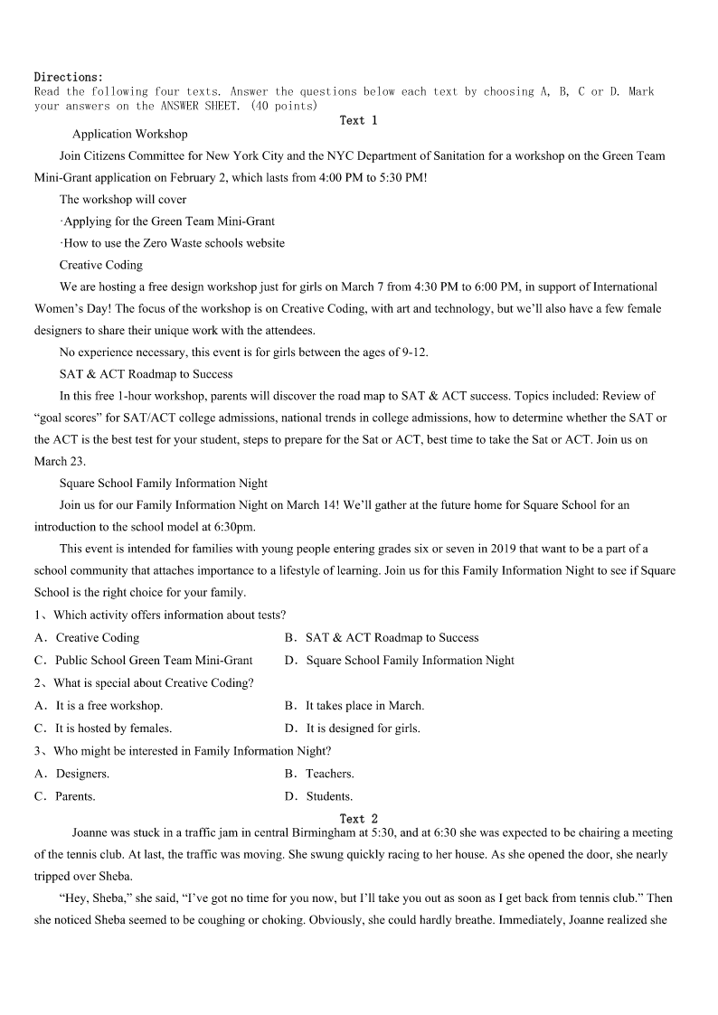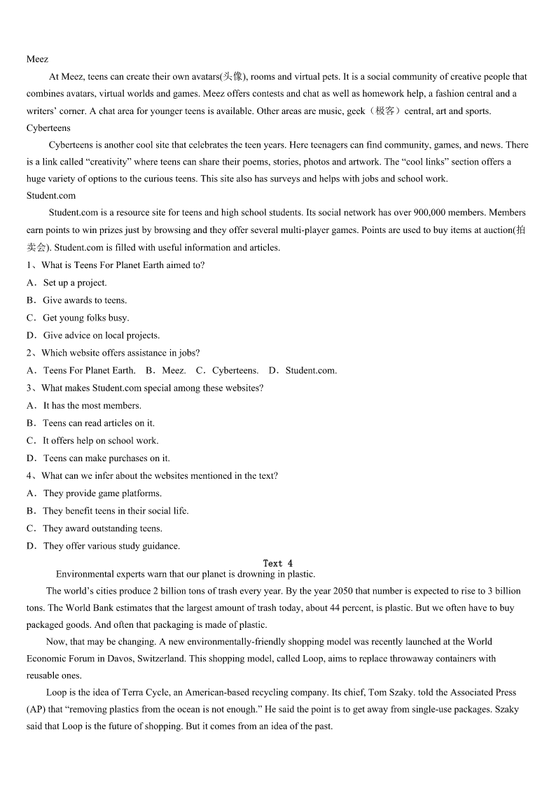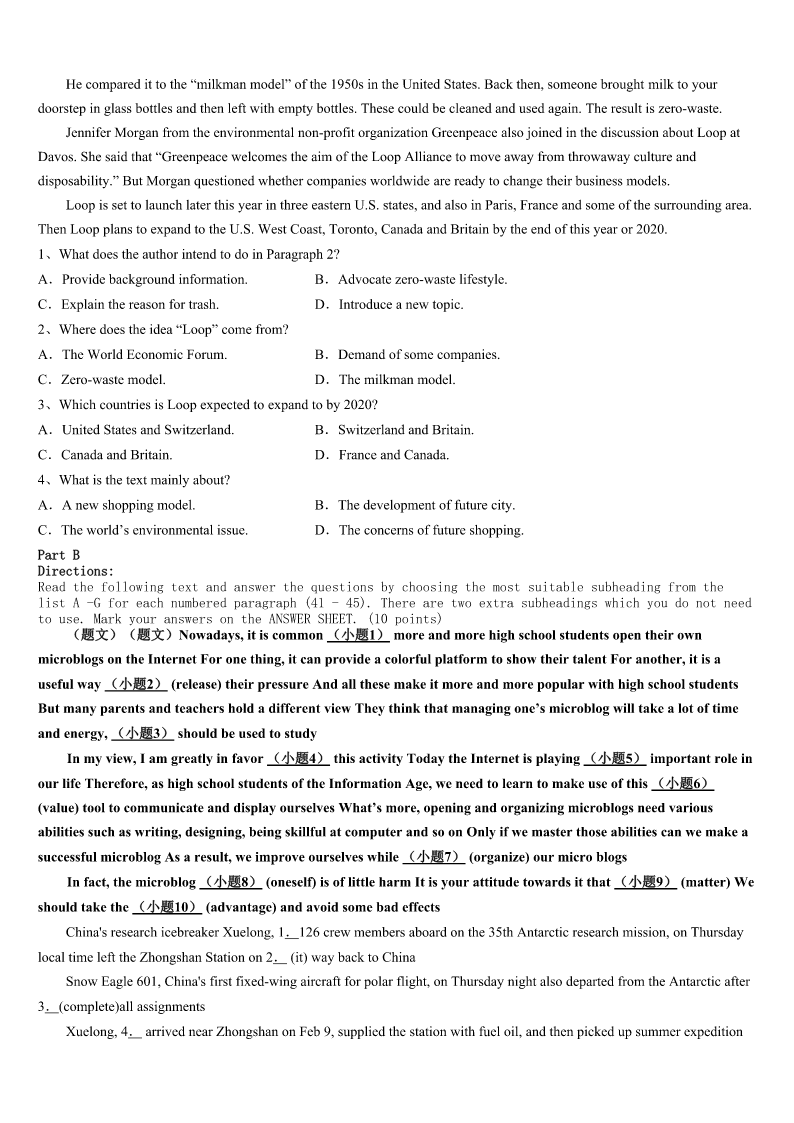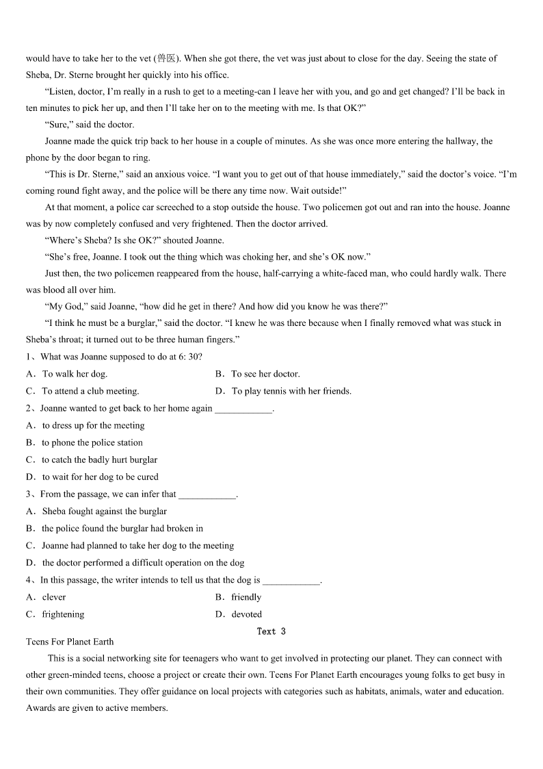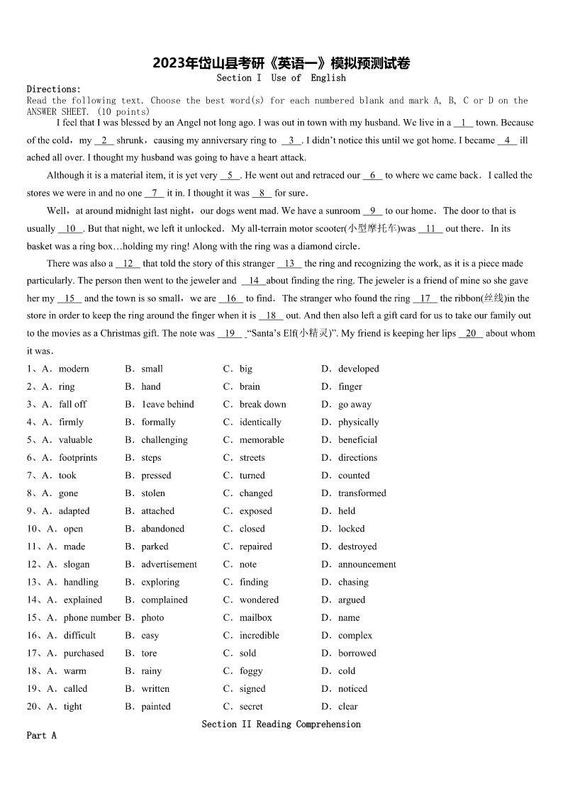 2023年岱山县考研《英语一》模拟预测试卷 SectionIUseofEnglish Directions: Readthefollowingtext.Choosethebestword(s)foreachnumberedblankandmarkA,B,CorDonthe ANSWERSHEET.(10points) IfeelthatIwasblessedbyanAngelnotlongago.Iwasoutintownwithmyhusband.Weliveina1town.Because ofthecold,my2shrunk,causingmyanniversaryringto3.Ididn’tnoticethisuntilwegothome.Ibecame4ill achedallover.Ithoughtmyhusbandwasgoingtohaveaheartattack. Althoughitisamaterialitem,itisyetvery5.Hewentoutandretracedour6towherewecameback.Icalledthe storeswewereinandnoone7itin.Ithoughtitwas8forsure. Well,ataroundmidnightlastnight,ourdogswentmad.Wehaveasunroom9toourhome.Thedoortothatis usually10.Butthatnight,weleftitunlocked.Myall-terrainmotorscooter(小型摩托车)was11outthere.Inits basketwasaringbox…holdingmyring!Alongwiththeringwasadiamondcircle. Therewasalsoa12thattoldthestoryofthisstranger13theringandrecognizingthework,asitisapiecemade particularly.Thepersonthenwenttothejewelerand14aboutfindingthering.Thejewelerisafriendofminesoshegave hermy15andthetownissosmall,weare16tofind.Thestrangerwhofoundthering17theribbon(丝线)inthe storeinordertokeeptheringaroundthefingerwhenitis18out.Andthenalsoleftagiftcardforustotakeourfamilyout tothemoviesasaChristmasgift.Thenotewas19“Santa’sElf(小精灵)”.Myfriendiskeepingherlips20aboutwhom itwas. 1、A.modernB.smallC.bigD.developed 2、A.ringB.handC.brainD.finger 3、A.falloffB.1eavebehindC.breakdownD.goaway 4、A.firmlyB.formallyC.identicallyD.physically 5、A.valuableB.challengingC.memorableD.beneficial 6、A.footprintsB.stepsC.streetsD.directions 7、A.tookB.pressedC.turnedD.counted 8、A.goneB.stolenC.changedD.transformed 9、A.adaptedB.attachedC.exposedD.held 10、A.openB.abandonedC.closedD.locked 11、A.madeB.parkedC.repairedD.destroyed 12、A.sloganB.advertisementC.noteD.announcement 13、A.handlingB.exploringC.findingD.chasing 14、A.explainedB.complainedC.wonderedD.argued 15、A.phonenumberB.photoC.mailboxD.name 16、A.difficultB.easyC.incredibleD.complex 17、A.purchasedB.toreC.soldD.borrowed 18、A.warmB.rainyC.foggyD.cold 19、A.call