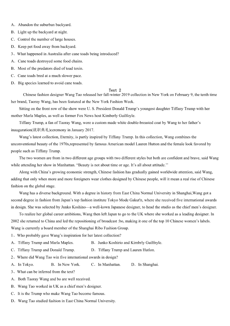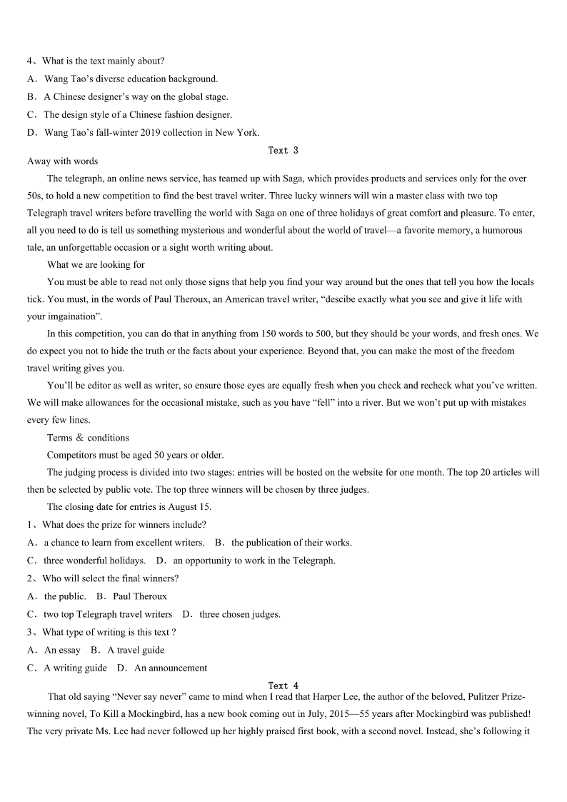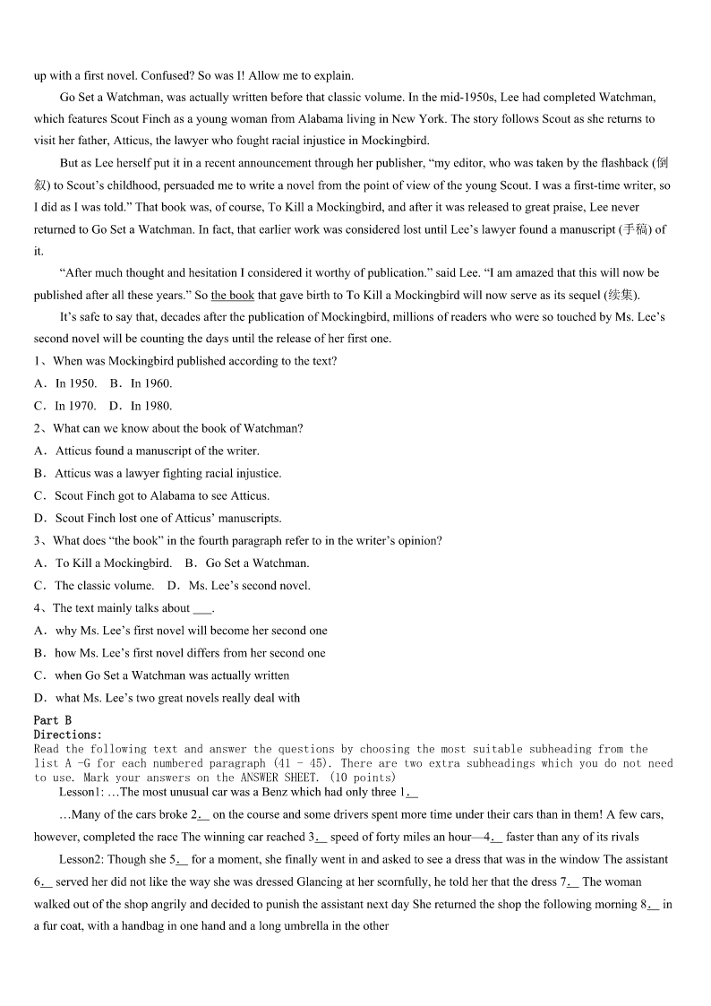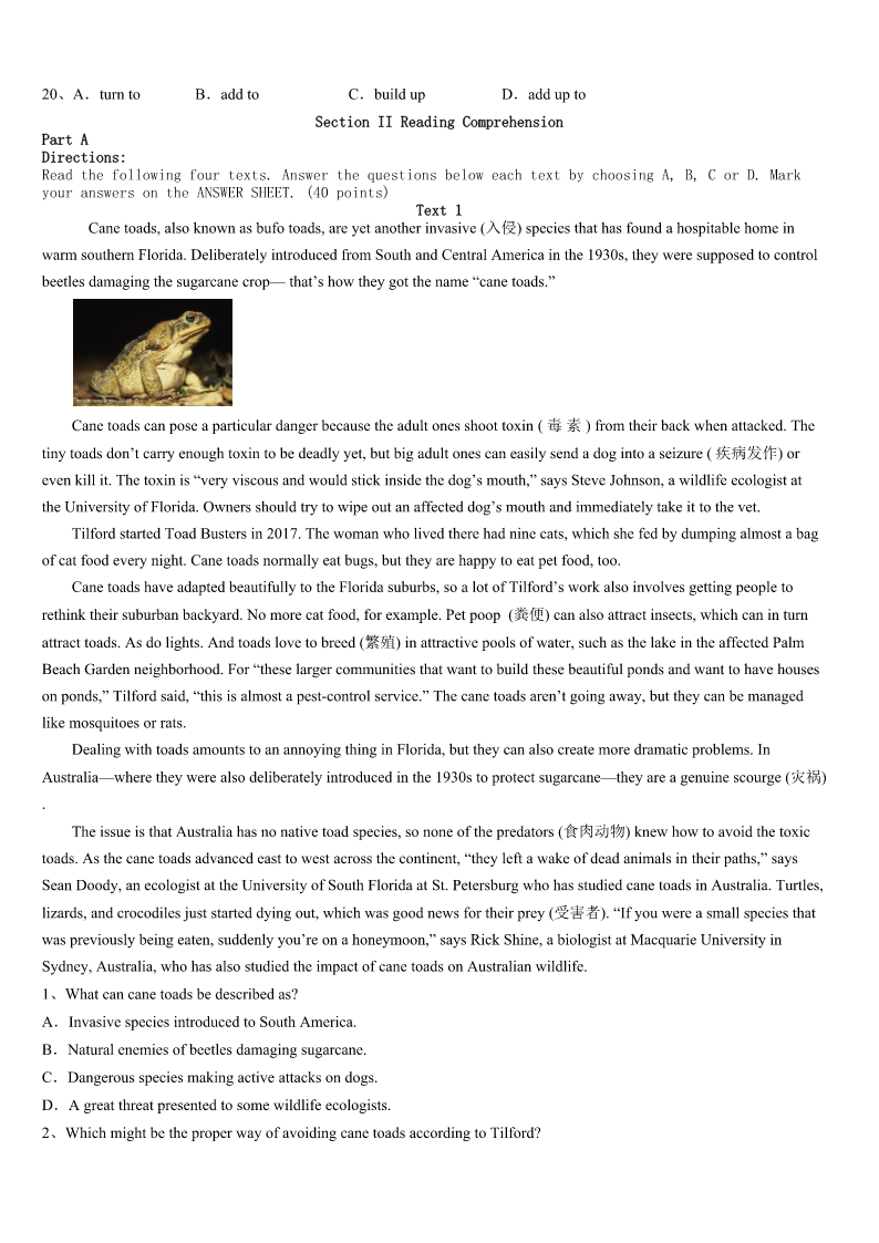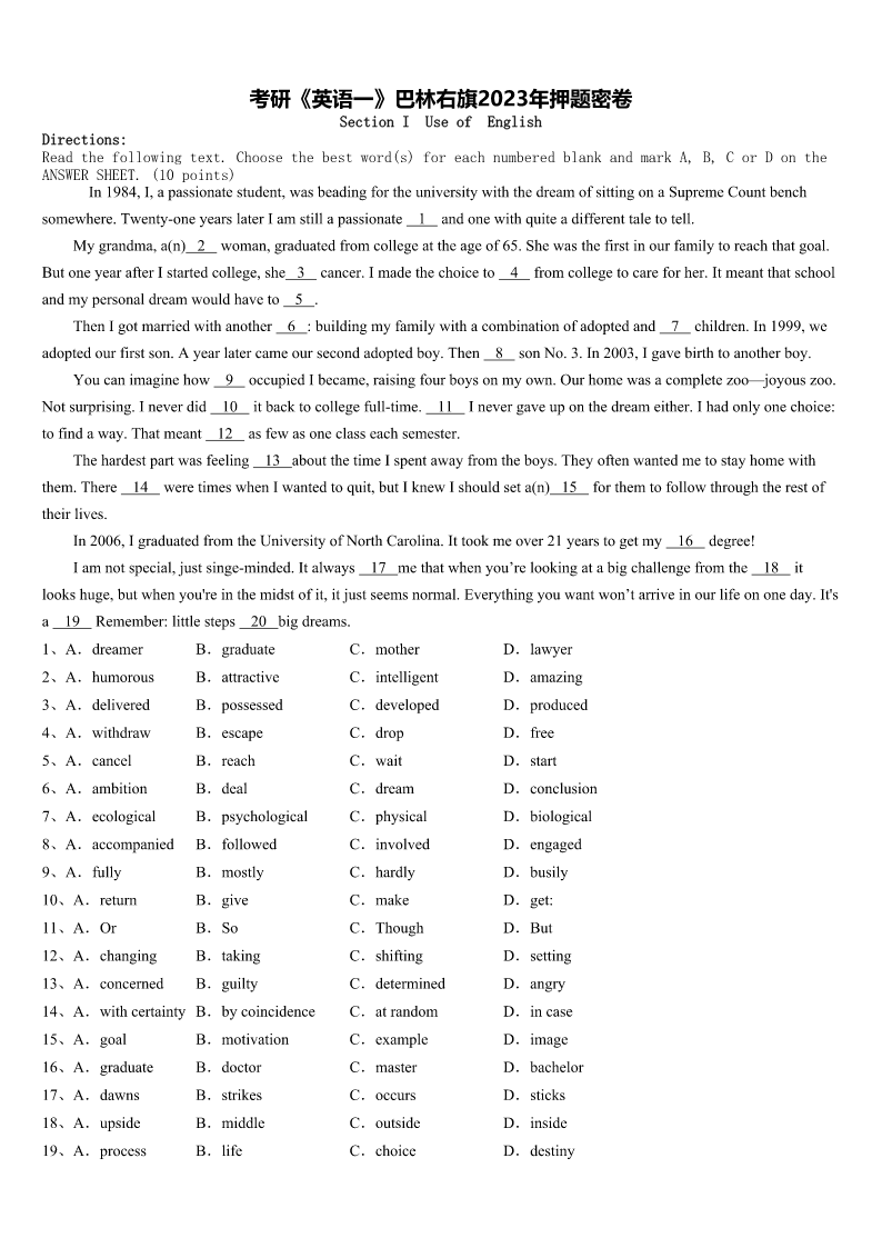 考研《英语一》巴林右旗2023年押题密卷 SectionIUseofEnglish Directions: Readthefollowingtext.Choosethebestword(s)foreachnumberedblankandmarkA,B,CorDonthe ANSWERSHEET.(10points) In1984,I,apassionatestudent,wasbeadingfortheuniversitywiththedreamofsittingonaSupremeCountbench somewhere.Twenty-oneyearslaterIamstillapassionate1andonewithquiteadifferenttaletotell. Mygrandma,a(n)2woman,graduatedfromcollegeattheageof65.Shewasthefirstinourfamilytoreachthatgoal. ButoneyearafterIstartedcollege,she3cancer.Imadethechoiceto4fromcollegetocareforher.Itmeantthatschool andmypersonaldreamwouldhaveto5. ThenIgotmarriedwithanother6:buildingmyfamilywithacombinationofadoptedand7children.In1999,we adoptedourfirstson.Ayearlatercameoursecondadoptedboy.Then8sonNo.3.In2003,Igavebirthtoanotherboy. Youcanimaginehow9occupiedIbecame,raisingfourboysonmyown.Ourhomewasacompletezoo—joyouszoo. Notsurprising.Ineverdid10itbacktocollegefull-time.11Inevergaveuponthedreameither.Ihadonlyonechoice: tofindaway.Thatmeant12asfewasoneclasseachsemester. Thehardestpartwasfeeling13aboutthetimeIspentawayfromtheboys.Theyoftenwantedmetostayhomewith them.There14weretimeswhenIwantedtoquit,butIknewIshouldseta(n)15forthemtofollowthroughtherestof theirlives. In2006,IgraduatedfromtheUniversityofNorthCarolina.Ittookmeover21yearstogetmy16degree! Iamnotspecial,justsinge-minded.Italways17methatwhenyou’relookingatabigchallengefromthe18it lookshuge,butwhenyou'reinthemidstofit,itjustseemsnormal.Everythingyouwantwon’tarriveinourlifeononeday.It's a19Remember:littlesteps20bigdreams. 1、A.dreamerB.graduateC.motherD.lawyer 2、A.humorousB.attractiveC.intelligentD.amazing 3、A.deliveredB.possessedC.developedD.produced 4、A.withdrawB.escapeC.dropD.free 5、A.cancelB.reachC.waitD.start 6、A.ambitionB.dealC.dreamD.conclusion 7、A.ecologicalB.psychologicalC.physicalD.biological 8、A.accompaniedB.followedC.involvedD.engaged 9、A.fullyB.mostlyC.hardlyD.busily 10、A.returnB.giveC.makeD.get: 11、A.OrB.SoC.ThoughD.But 12、A.changingB.takingC.shiftingD.setting 13、A.concernedB.guil