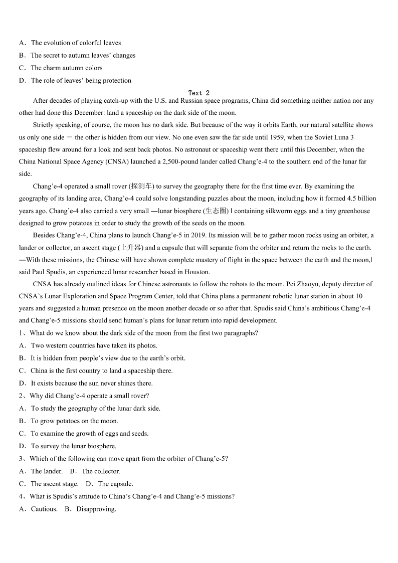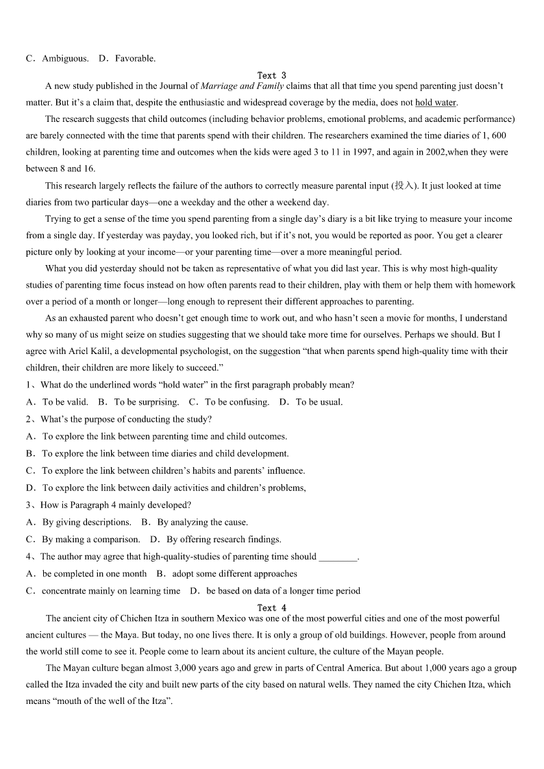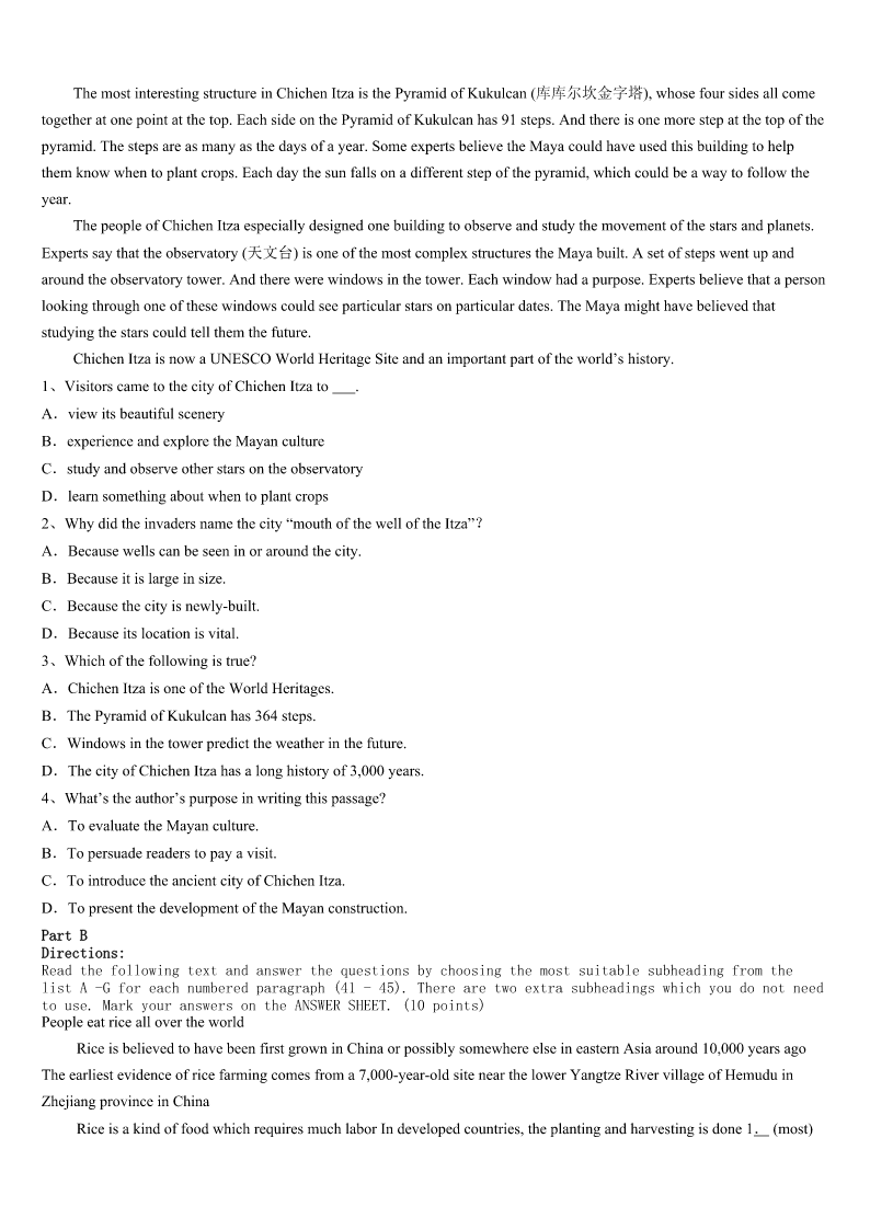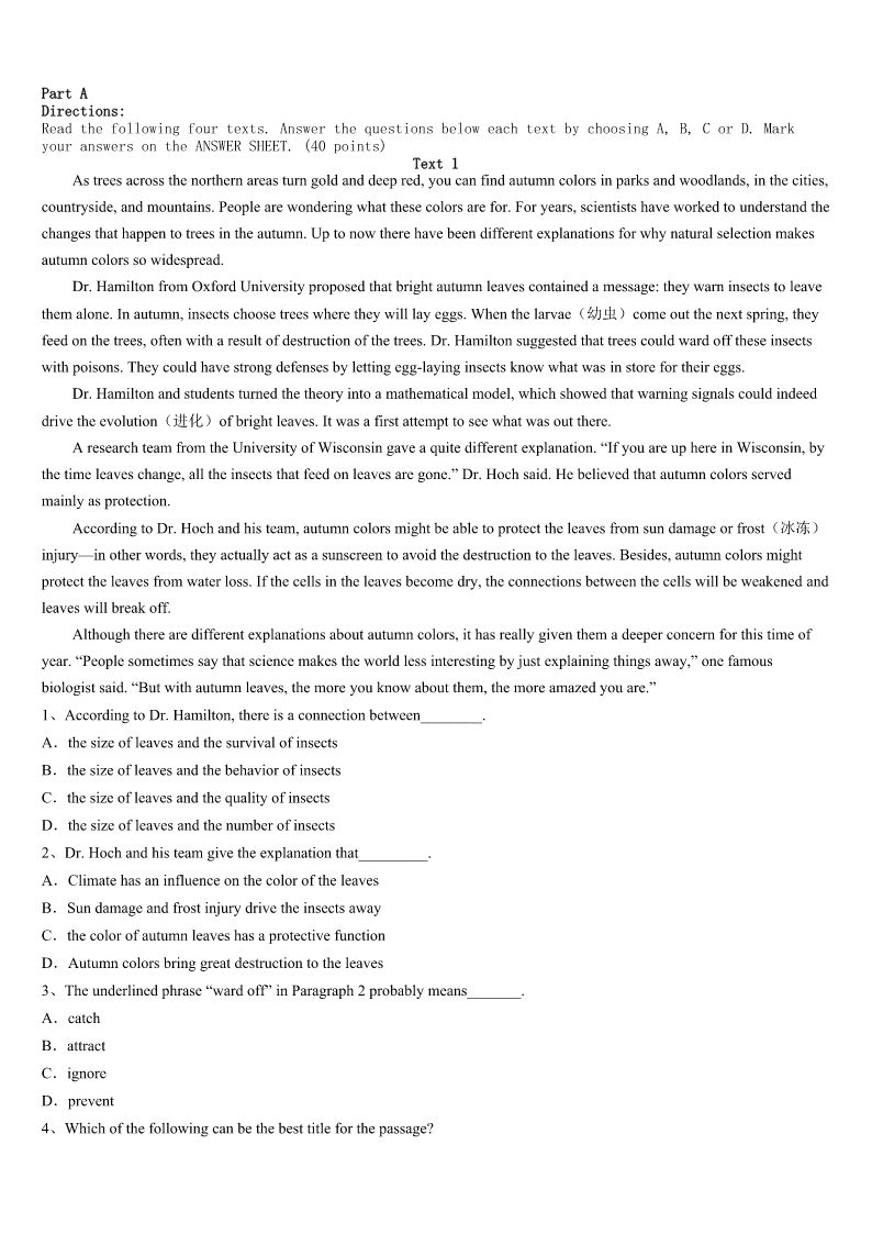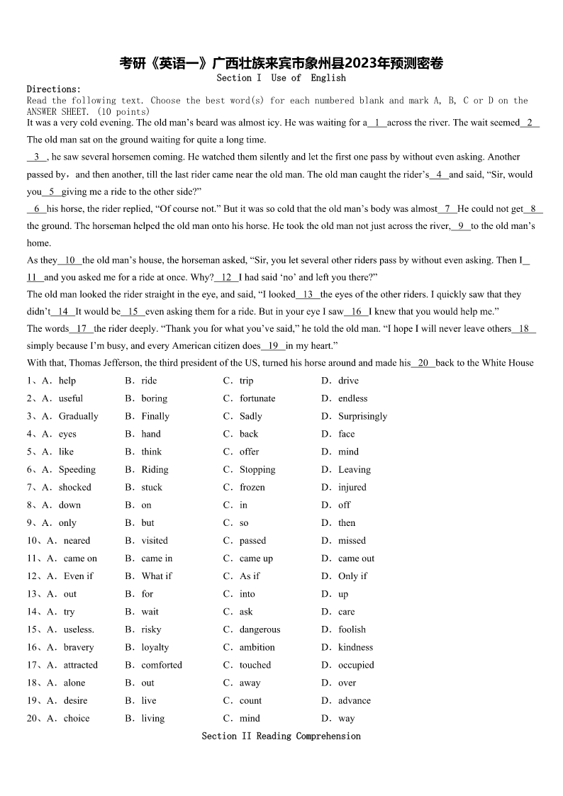 考研《英语一》广西壮族来宾市象州县2023年预测密卷 SectionIUseofEnglish Directions: Readthefollowingtext.Choosethebestword(s)foreachnumberedblankandmarkA,B,CorDonthe ANSWERSHEET.(10points) Itwasaverycoldevening.Theoldman’sbeardwasalmosticy.Hewaswaitingfora1acrosstheriver.Thewaitseemed2 Theoldmansatonthegroundwaitingforquitealongtime. 3,hesawseveralhorsemencoming.Hewatchedthemsilentlyandletthefirstonepassbywithoutevenasking.Another passedby,andthenanother,tillthelastridercameneartheoldman.Theoldmancaughttherider’s4andsaid,“Sir,would you5givingmearidetotheotherside?” 6hishorse,theriderreplied,“Ofcoursenot.”Butitwassocoldthattheoldman’sbodywasalmost7Hecouldnotget8 theground.Thehorsemanhelpedtheoldmanontohishorse.Hetooktheoldmannotjustacrosstheriver,9totheoldman’s home. Asthey10theoldman’shouse,thehorsemanasked,“Sir,youletseveralotherriderspassbywithoutevenasking.ThenI 11andyouaskedmeforarideatonce.Why?12Ihadsaid‘no’andleftyouthere?” Theoldmanlookedtheriderstraightintheeye,andsaid,“Ilooked13theeyesoftheotherriders.Iquicklysawthatthey didn’t14Itwouldbe15evenaskingthemforaride.ButinyoureyeIsaw16Iknewthatyouwouldhelpme.” Thewords17theriderdeeply.“Thankyouforwhatyou’vesaid,”hetoldtheoldman.“IhopeIwillneverleaveothers18 simplybecauseI’mbusy,andeveryAmericancitizendoes19inmyheart.” Withthat,ThomasJefferson,thethirdpresidentoftheUS,turnedhishorsearoundandmadehis20backtotheWhiteHouse 1、A.helpB.rideC.tripD.drive 2、A.usefulB.boringC.fortunateD.endless 3、A.GraduallyB.FinallyC.SadlyD.Surprisingly 4、A.eyesB.handC.backD.face 5、A.likeB.thinkC.offerD.mind 6、A.SpeedingB.RidingC.StoppingD.Leaving 7、A.shockedB.stuckC.frozenD.injured 8、A.downB.onC.inD.off 9、A.onlyB.butC.soD.then 10、A.nearedB.visitedC.passedD.missed 11、A.cameonB.cameinC.cameupD.cameout 12、A.EvenifB.WhatifC.AsifD.Onlyif 13、A.outB.forC.intoD.up 14、A.tryB.waitC.askD.care 15、A.useless.B.riskyC.dangerousD.foolish 16、A.braveryB.loyaltyC.ambitionD.kindness 17、A.attractedB.comfortedC.touchedD.occupied 18、A.aloneB.outC.awayD.over 19、A.desireB.liveC.countD.