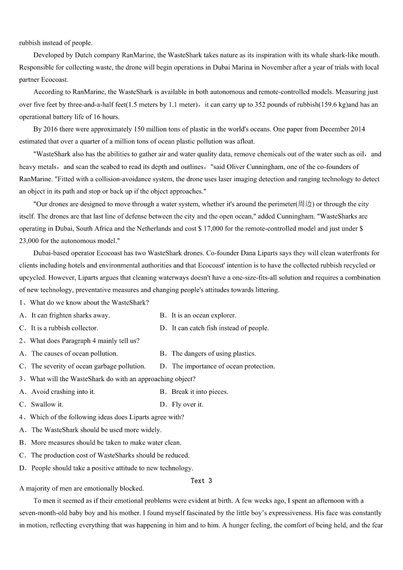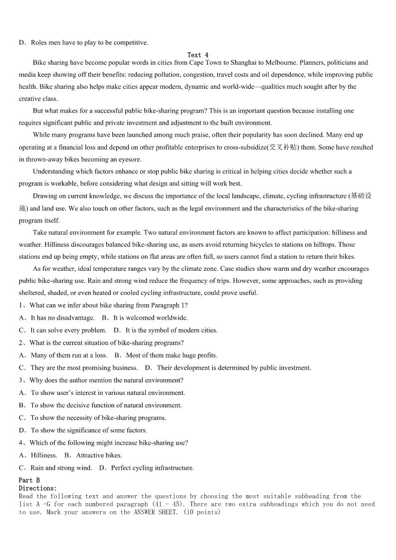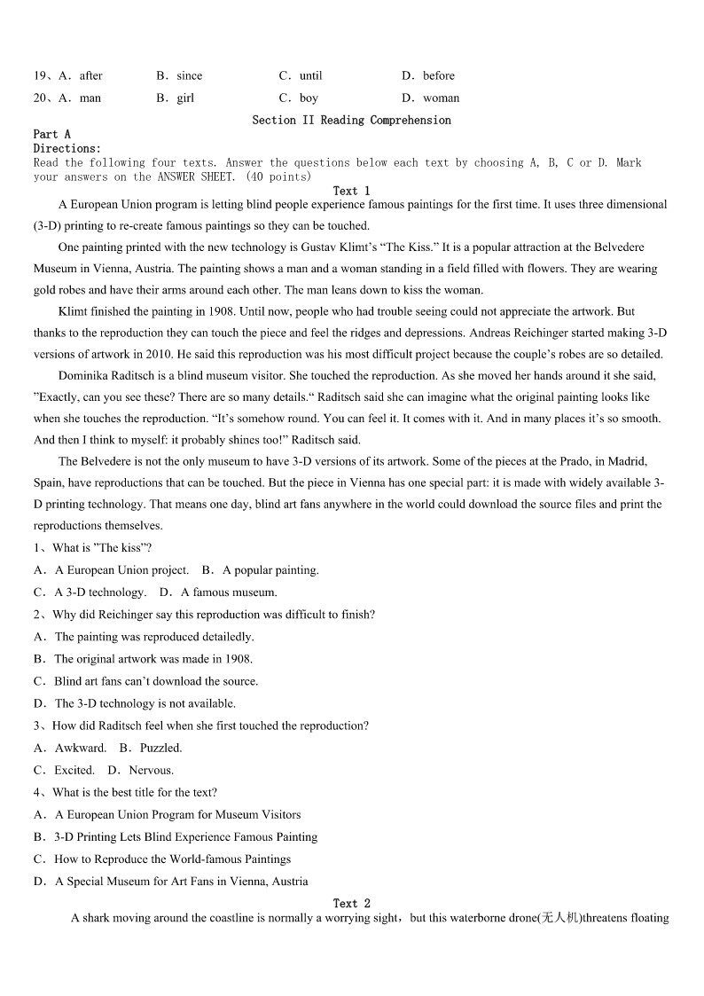 考研《英语一》巴音郭楞蒙古自治州轮台县2023年高分通关卷 SectionIUseofEnglish Directions: Readthefollowingtext.Choosethebestword(s)foreachnumberedblankandmarkA,B,CorDonthe ANSWERSHEET.(10points) Thelittleboyturnedtotheoldwomannexttohim,‘‘Granny,areyousureIdon’thaveenoughmoney?’’Shenodded.Thelittle boywasstill1thedoll(洋娃娃)inhishand. Iwalkedtowardhim,2whohewishedtogivethisdollto.“Sister.ShewassurethatSantaClauswouldbringadolltoher.”I toldhimthatmaybeSantaClauswoulddoso.Butherepliedtome3.“No,SantaClaus(圣诞老人)can’tbringittoher4 sheisnow.Ihavetogivethedolltomymommysothatshecangiveittomysisterwhenshe5there.Mysisterhasgoneto bewithGod.DaddysaysthatMommyisgoingtoseeGodverysoontoo,6Ithoughtshecouldtakethedollwithhertogive ittomysister.’’ Thelittleboylooked7atme,“ItoldDaddytotellMommynottogoyet.IneedhertowaituntilIcomebackfromthemall. I8shedidn’thavetoleaveme,butDaddysaysthatshehastogotobewithmylittlesister.”Thenhelooked9atthedoll withsadeyes. Iquickly10formywallet.“Let’scheckagain,justincaseyoudohaveenoughmoneyforthedoll!”“OK.IhopeIdohave enough.”Iaddedsomeofmymoneyto11withouthimseeingandwestartedtocountit.Therewasenoughforthedolland 12somesparemoney.“ThankyouGodforgivingmeenoughmoney!”Helookedatmeand13,“Iwantedtohaveenough moneytobuyawhiteroseformyMommy,butIdidn’tdaretoaskGod14toomuch.ButHegavemeenoughtobuythedoll andawhiterose.Mymommyloveswhiteroses.” 15Irememberedalocalnewspaperarticletwodaysago,mentioningadrunkmaninatruckhitacar16byayoung womanandalittlegirl.Thelittlegirl17rightawayandthemotherwas18 Twodays19thisencounter(偶然相遇)withthelittleboy,Ireadinthenewspaperthattheyoung20hadpassedaway. 1、A.raisingB.holdingC.hidingD.tearing 2、A.consideringB.understandingC.watchingD.asking 3、A.proudlyB.hurriedlyC.sadlyD.angrily 4、A.whereB.whatC.whoD.when 5、A.comesB.findsC.goesD.leaves 6、A.soB.forC.butD.as 7、A.downB.onC.toD.up 8、A.thinkB.wishC.imagineD.find 9、A.thenB.sadlyC.againD.now 10、A.reachedB.lookedC.searchedD.charged 11、A.myselfB.himC.hisD.them 12、A.stillB.yetC.alsoD.even 13、A.noddedB.addedC.laughedD.showe