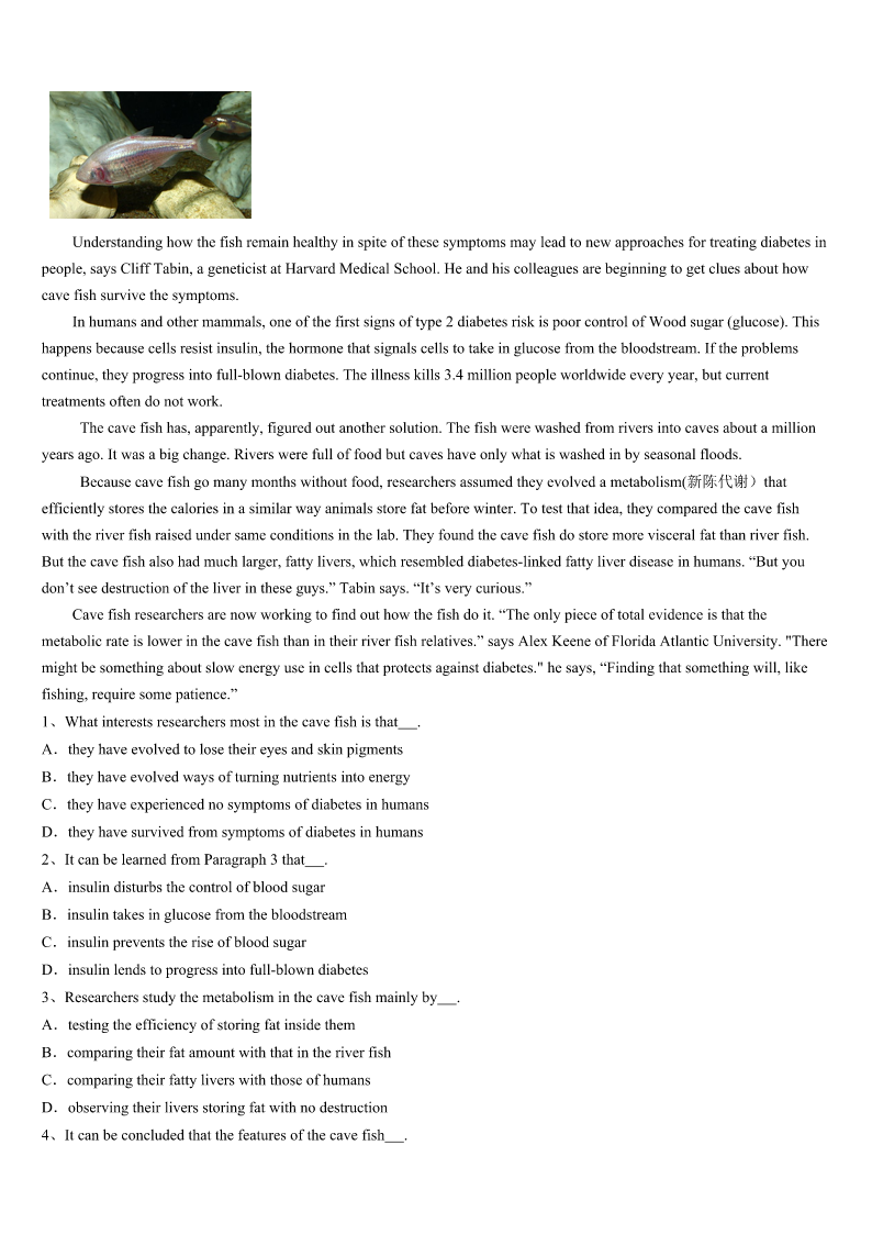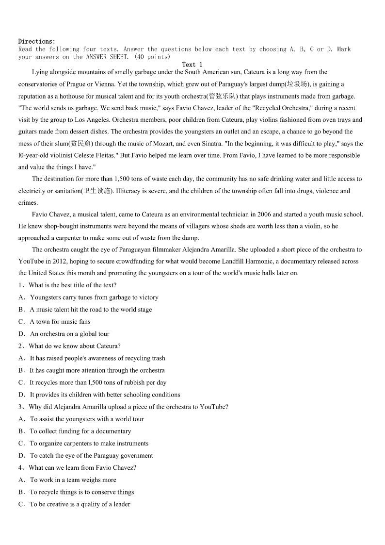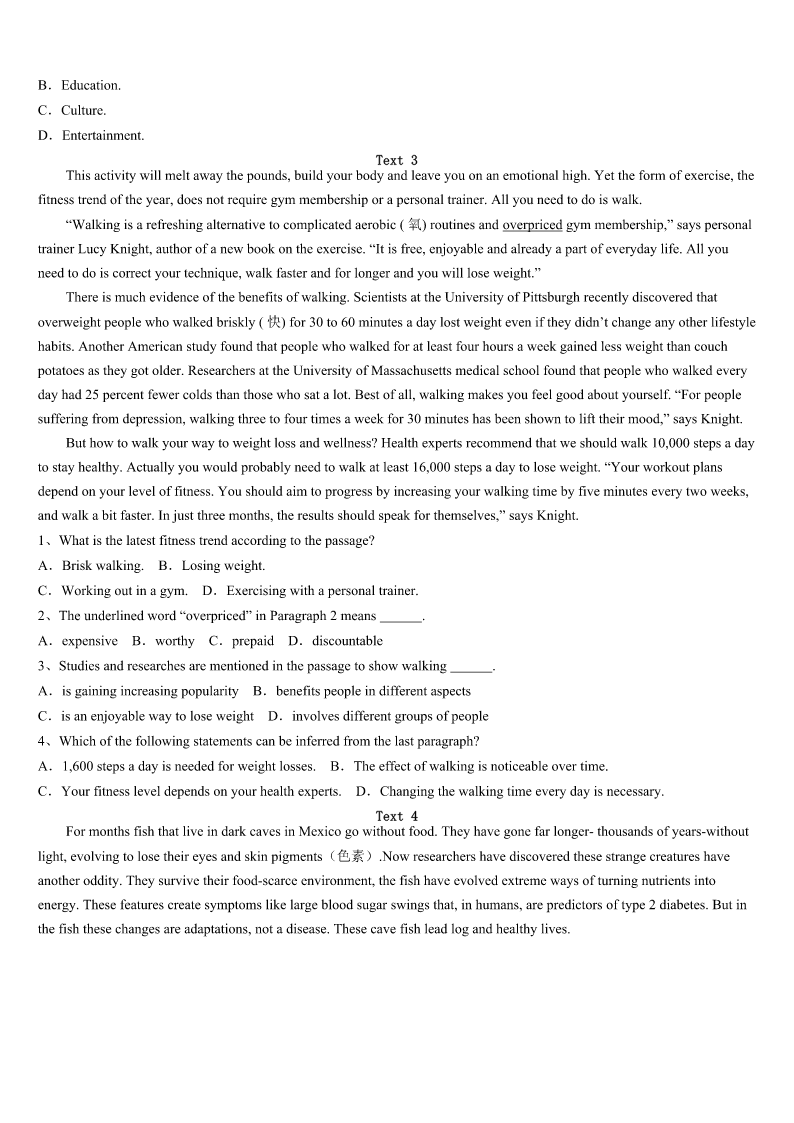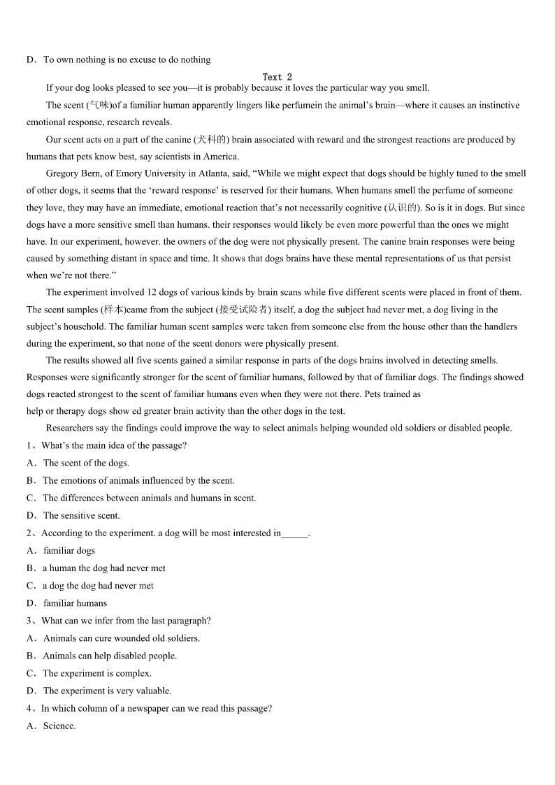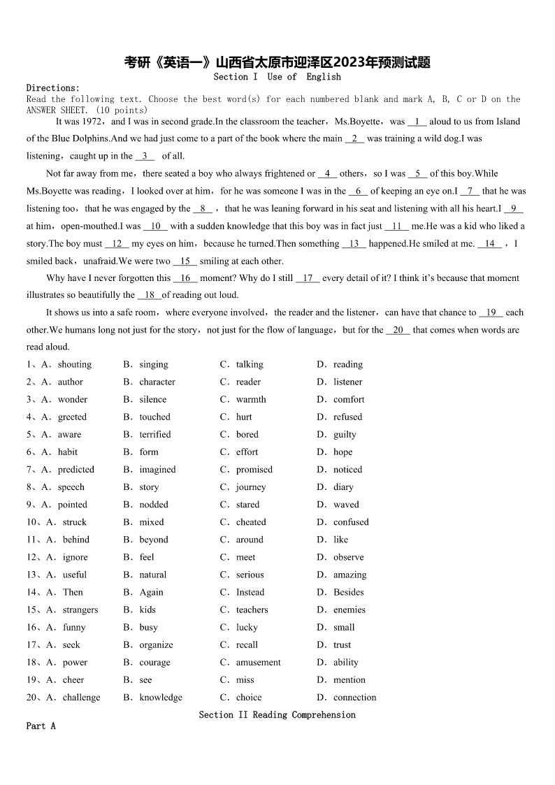 考研《英语一》山西省太原市迎泽区2023年预测试题 SectionIUseofEnglish Directions: Readthefollowingtext.Choosethebestword(s)foreachnumberedblankandmarkA,B,CorDonthe ANSWERSHEET.(10points) Itwas1972,andIwasinsecondgrade.Intheclassroomtheteacher,Ms.Boyette,was1aloudtousfromIsland oftheBlueDolphins.Andwehadjustcometoapartofthebookwherethemain2wastrainingawilddog.Iwas listening,caughtupinthe3ofall. Notfarawayfromme,thereseatedaboywhoalwaysfrightenedor4others,soIwas5ofthisboy.While Ms.Boyettewasreading,Ilookedoverathim,forhewassomeoneIwasinthe6ofkeepinganeyeon.I7thathewas listeningtoo,thathewasengagedbythe8,thathewasleaningforwardinhisseatandlisteningwithallhisheart.I9 athim,open-mouthed.Iwas10withasuddenknowledgethatthisboywasinfactjust11me.Hewasakidwholikeda story.Theboymust12myeyesonhim,becauseheturned.Thensomething13happened.Hesmiledatme.14,I smiledback,unafraid.Weweretwo15smilingateachother. WhyhaveIneverforgottenthis16moment?WhydoIstill17everydetailofit?Ithinkit’sbecausethatmoment illustratessobeautifullythe18ofreadingoutloud. Itshowsusintoasaferoom,whereeveryoneinvolved,thereaderandthelistener,canhavethatchanceto19each other.Wehumanslongnotjustforthestory,notjustfortheflowoflanguage,butforthe20thatcomeswhenwordsare readaloud. 1、A.shoutingB.singingC.talkingD.reading 2、A.authorB.characterC.readerD.listener 3、A.wonderB.silenceC.warmthD.comfort 4、A.greetedB.touchedC.hurtD.refused 5、A.awareB.terrifiedC.boredD.guilty 6、A.habitB.formC.effortD.hope 7、A.predictedB.imaginedC.promisedD.noticed 8、A.speechB.storyC.journeyD.diary 9、A.pointedB.noddedC.staredD.waved 10、A.struckB.mixedC.cheatedD.confused 11、A.behindB.beyondC.aroundD.like 12、A.ignoreB.feelC.meetD.observe 13、A.usefulB.naturalC.seriousD.amazing 14、A.ThenB.AgainC.InsteadD.Besides 15、A.strangersB.kidsC.teachersD.enemies 16、A.funnyB.busyC.luckyD.small 17、A.seekB.organizeC.recallD.trust 18、A.powerB.courageC.amusementD.ability 19、A.cheerB.seeC.missD.mention 20、A.challengeB.knowledgeC.choiceD.connection SectionIIReadingComprehension PartA Direct
