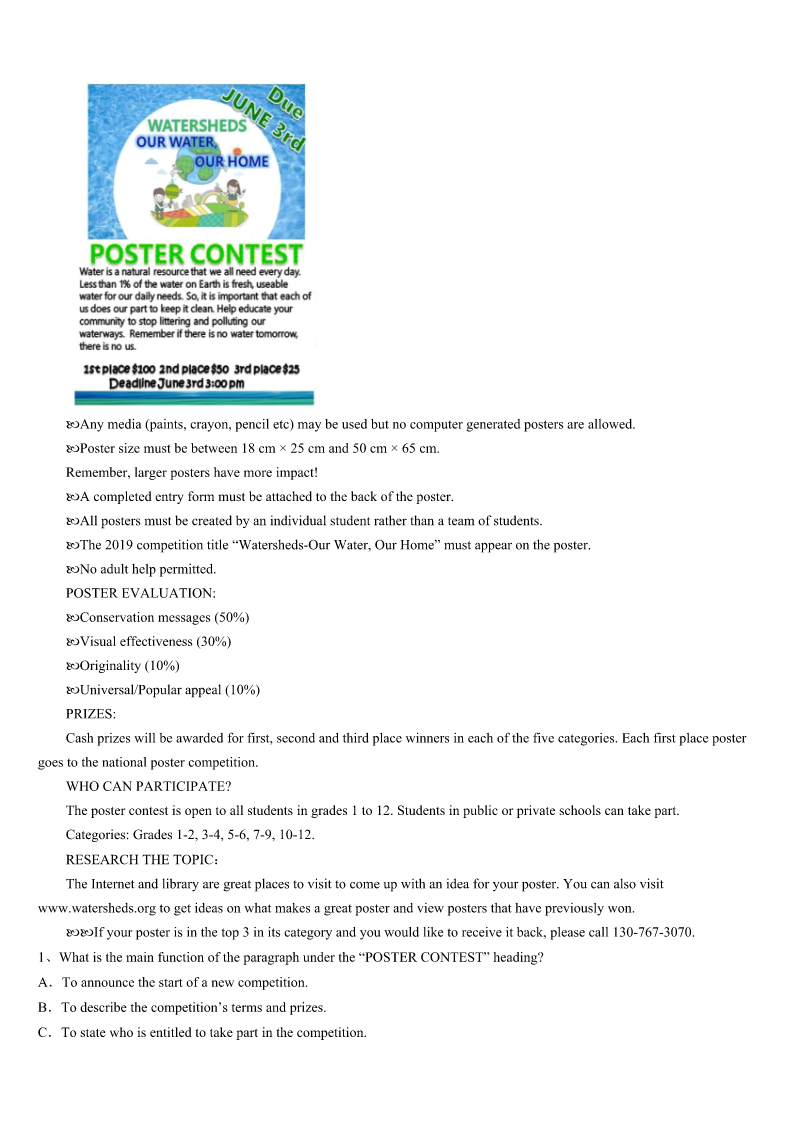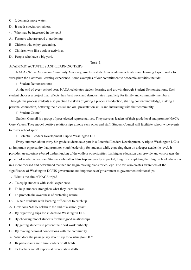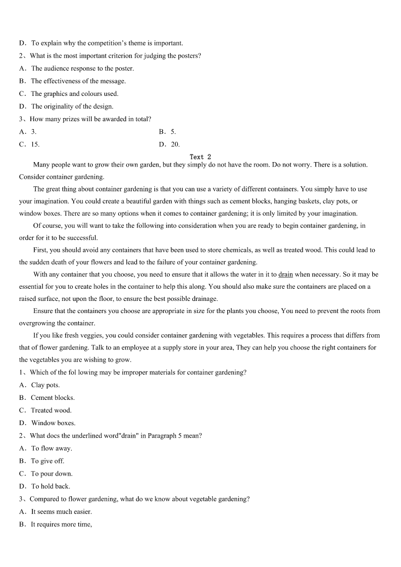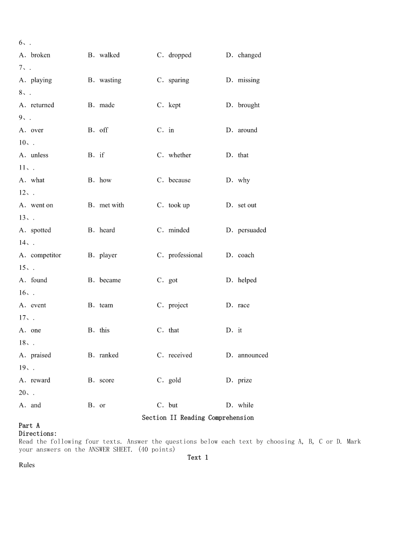 考研《英语一》广西壮族梧州市岑溪市2023年高分冲刺试题 SectionIUseofEnglish Directions: Readthefollowingtext.Choosethebestword(s)foreachnumberedblankandmarkA,B,CorDonthe ANSWERSHEET.(10points) Chinesetennisisenteringagoldentime.Inrecentyearstherehasbeenanexplosionof1femaletennisplayersburstingonto theglobalscene.Andthiscouldn’thavecomeata2timewiththe2008BeijingOlympics. Theseyounggirlshave3strongwillandtalent.4thewayisLiNa,whomayhavethe5nameinwomen’stennis,but shehasabigreputation.LiNaisChina’stoprankedplayerandthefirsttohave6intotheworld’stop20. After7nearlysixmonthsoftheseasonwithaseriousinjury,the25yearold8animpressivecomebackbywinningthe AustralianWomen’sHardcourtTennisChampionships. Intheworldofprofessionaltennis,Li’srefreshingsenseofhumorprovedtobeahitbothonand9thecourt. “Myhusbandsaidhehadaspecialgiftforme10Iwon,”LiNasaidafterliftingtheprizecup.“That’s11Itriedsohard today.Iwantedaspecialgift.” TheWuhangirl12tennisattheageofeightafterbeingdiscoveredbyacoachwhohad13herplayingbadminton.After yearsofhardtraining,LiNaturned14in1999andhasbecomeoneofthemostsuccessfulChinesetennisplayers. Withhersolidgroundstrokeandaggressivemindset,she15thefirstChinesetennisplayertowinaWTATour16Then twoyearslater,shewasthefirstChinesetomake17intothelast16ofWimbledon,whichledtoherbeing18number16 intheworldlastJanuary. Liisnowlookingforwardtowinninga19attheOlympics.“TheOlympicsareveryimportantforus,”shesaid.“Iammore motivatedaftermyrecovery20IfeelmydesirefortheOlympicsisbiggerthaneverbefore.” 1、. A.pleasedB.talentedC.excitedD.interested 2、. 20080801 20080801 20080505 20080505 A.goodB.betterC.bestD.well 3、. A.muchB.eitherC.bothD.some 4、. A.KnowingB.LeadingC.ShowingD.Finding 5、. A.biggestB.longestC.smallestD.shortest 6、. A.brokenB.walkedC.droppedD.changed 7、. A.playingB.wastingC.sparingD.missing 8、. A.returnedB.madeC.keptD.brought 9、. A.overB.offC.inD.around 10、. A.unlessB.ifC.whetherD.that 11、. A.whatB.howC.becauseD.why 12、. A.wentonB.metwithC.tookupD.setout 13、. A.spottedB.heardC.mindedD.persuaded