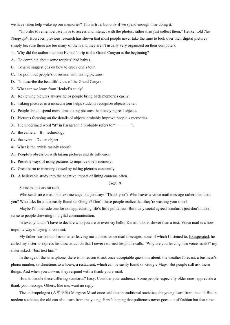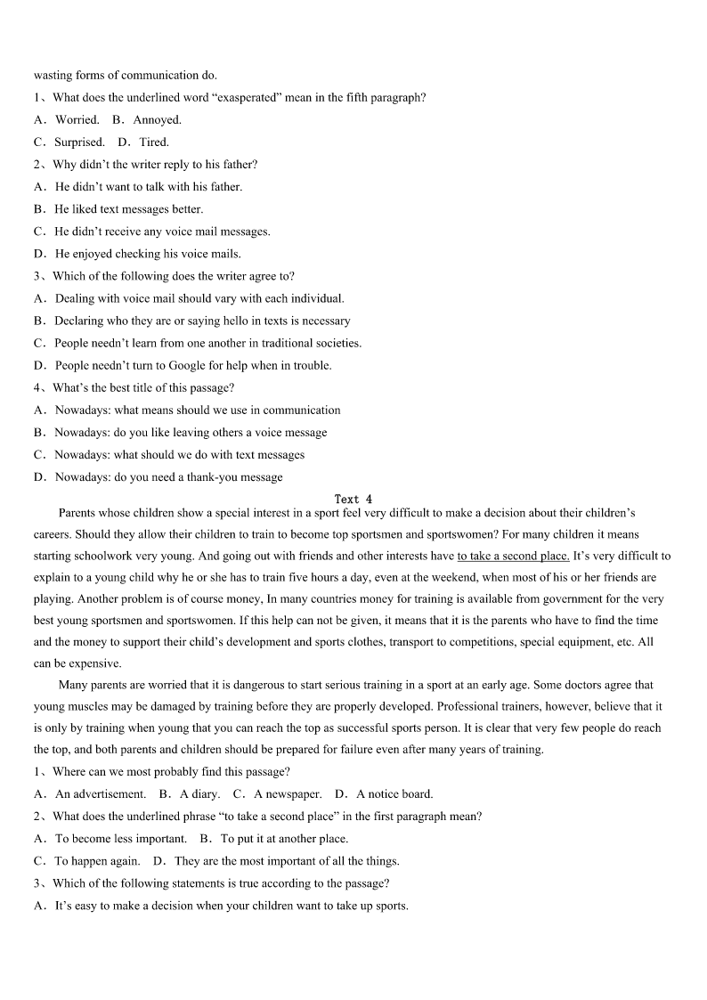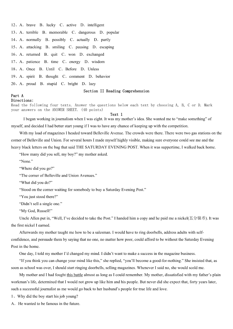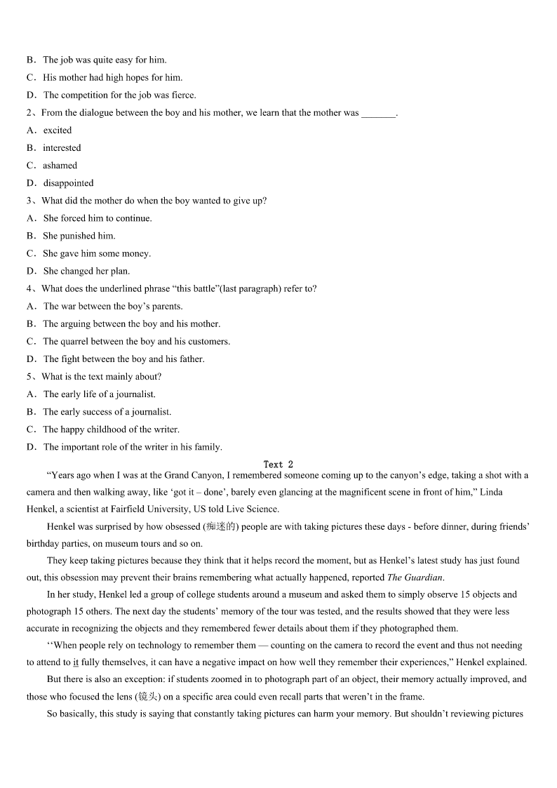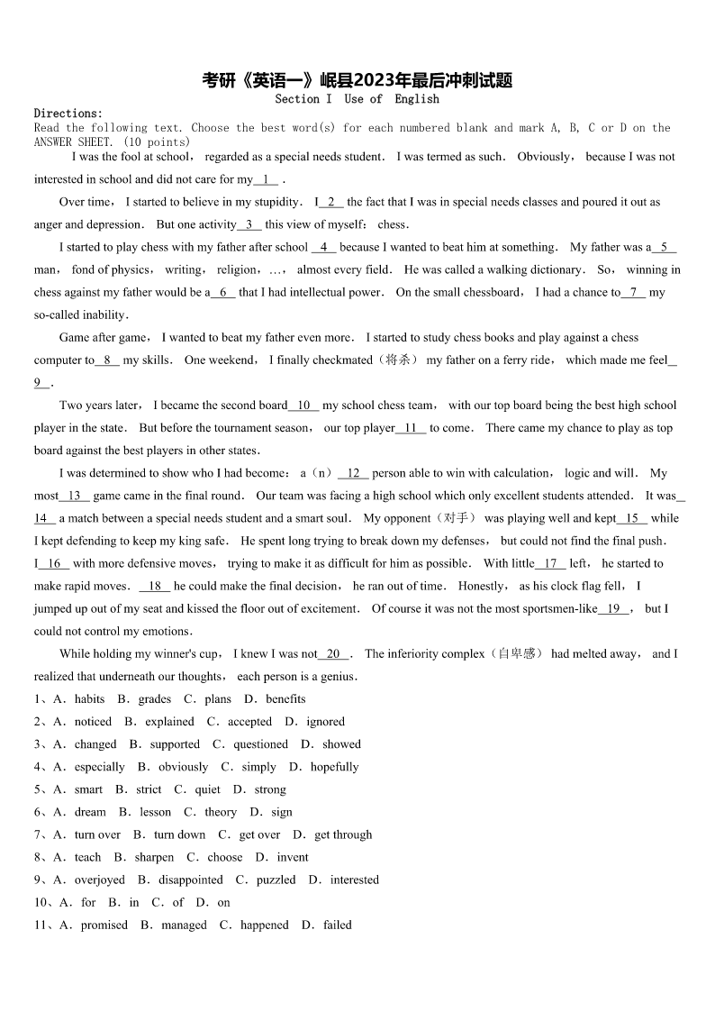 考研《英语一》岷县2023年最后冲刺试题 SectionIUseofEnglish Directions: Readthefollowingtext.Choosethebestword(s)foreachnumberedblankandmarkA,B,CorDonthe ANSWERSHEET.(10points) Iwasthefoolatschool,regardedasaspecialneedsstudent.Iwastermedassuch.Obviously,becauseIwasnot interestedinschoolanddidnotcareformy1. Overtime,Istartedtobelieveinmystupidity.I2thefactthatIwasinspecialneedsclassesandpoureditoutas angeranddepression.Butoneactivity3thisviewofmyself:chess. Istartedtoplaychesswithmyfatherafterschool4becauseIwantedtobeathimatsomething.Myfatherwasa5 man,fondofphysics,writing,religion,…,almosteveryfield.Hewascalledawalkingdictionary.So,winningin chessagainstmyfatherwouldbea6thatIhadintellectualpower.Onthesmallchessboard,Ihadachanceto7my so-calledinability. Gameaftergame,Iwantedtobeatmyfatherevenmore.Istartedtostudychessbooksandplayagainstachess computerto8myskills.Oneweekend,Ifinallycheckmated(将杀)myfatheronaferryride,whichmademefeel 9. Twoyearslater,Ibecamethesecondboard10myschoolchessteam,withourtopboardbeingthebesthighschool playerinthestate.Butbeforethetournamentseason,ourtopplayer11tocome.Therecamemychancetoplayastop boardagainstthebestplayersinotherstates. IwasdeterminedtoshowwhoIhadbecome:a(n)12personabletowinwithcalculation,logicandwill.My most13gamecameinthefinalround.Ourteamwasfacingahighschoolwhichonlyexcellentstudentsattended.Itwas 14amatchbetweenaspecialneedsstudentandasmartsoul.Myopponent(对手)wasplayingwellandkept15while Ikeptdefendingtokeepmykingsafe.Hespentlongtryingtobreakdownmydefenses,butcouldnotfindthefinalpush. I16withmoredefensivemoves,tryingtomakeitasdifficultforhimaspossible.Withlittle17left,hestartedto makerapidmoves.18hecouldmakethefinaldecision,heranoutoftime.Honestly,ashisclockflagfell,I jumpedupoutofmyseatandkissedtheflooroutofexcitement.Ofcourseitwasnotthemostsportsmen-like19,butI couldnotcontrolmyemotions. Whileholdingmywinner'scup,IknewIwasnot20.Theinferioritycomplex(自卑感)hadmeltedaway,andI realizedthatunderneathourthoughts,eachpersonisagenius. 1、A.habitsB.g