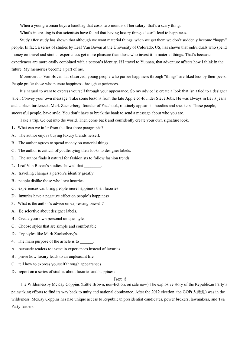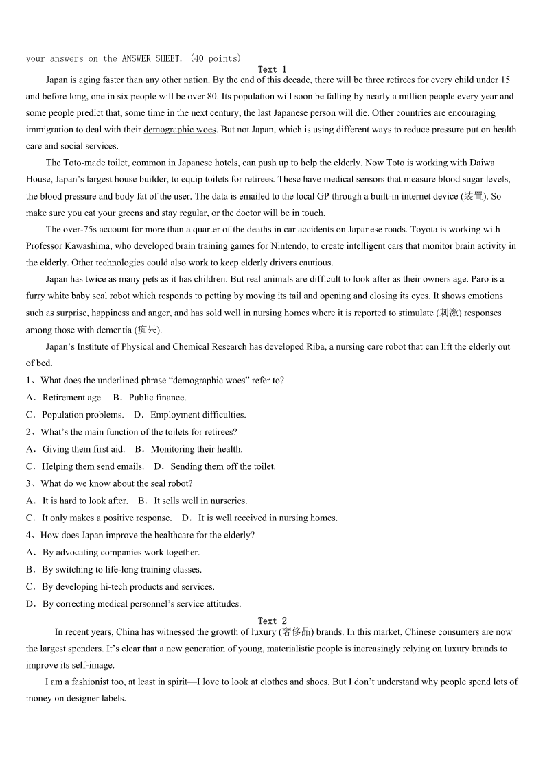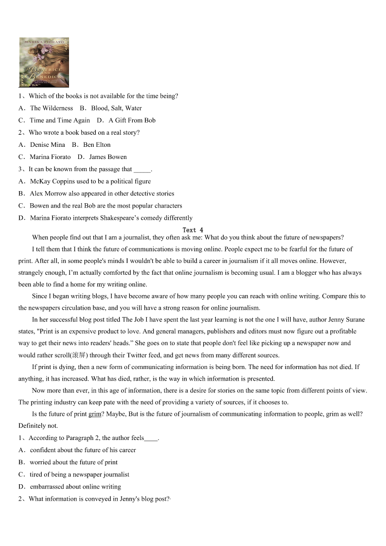 考研《英语一》平顶山市叶县2023年深度自测卷 SectionIUseofEnglish Directions: Readthefollowingtext.Choosethebestword(s)foreachnumberedblankandmarkA,B,CorDonthe ANSWERSHEET.(10points) It’s27yearssincemylastconversationwithmymother,whodidn’tfinishschoollikemanyofhercontemporarygirls. Sheoftentoldme,“Inevergotmy1butonedayyouwill.” Pointingtoatreeorcow,sheaskedmeto2theirEnglishnamesafterher.Feeling3,Iasked,“Mama,whydoIhave tolearnthese4phrases?”Sheheldherpenrightbeforemyeyes.“Holditfirmly,”she5me,“forthispenandthenew foreignlanguagewillbeyourcompassto6aroundtheworld.”Sadly,mymotherdiedofbreastcancerwhenIwassix. Turningseven,Itraveled30milestoliveclosertomyschool.But“closer”isa7terminUganda,which8Ihadto getupasthe9sunroseandthenran8.8milesbarefoottoschool.Also,Ineededtocarryastickin10ofsnakesand dogs.Duringthe11season,thepathtoschoolwas12dailyandI’dswimwithonehand,usingtheotherhandto13 thebookbagonmyhead. Researchshows70percentofpoorchildrendon’t14primaryschoolinUganda.Reasonsforthis15dropoutrate includesthelong16somechildrenmust17amongmanyotherreasons. Fortunately,I’vemadeit.WheneverIseethesunrise,Iam18ofthewisdomofmymother,who19metodream bigandtousethe20ofthepentomakemydreamcometrue. 1、A.degreeB.scholarshipC.recommendationD.admission 2、A.reciteB.useC.repeatD.guess 3、A.anxiousB.curiousC.disappointedD.annoyed 4、A.toughB.newC.foreignD.old 5、A.encouragedB.consultedC.blamedD.frightened 6、A.flyB.turnC.walkD.sail 7、A.relativeB.realC.simpleD.technical 8、A.showsB.meansC.provesD.states 9、A.warmB.earlyC.brightD.hot 10、A.searchB.possessionC.spiteD.case 11、A.summerB.coldC.rainyD.dry 12、A.damagedB.repairedC.blockedD.flooded 13、A.dragB.holdC.putD.seize 14、A.attendB.enterC.completeD.continue 15、A.constantB.steadyC.lowD.high 16、A.distancesB.periodsC.listsD.stories 17、A.coverB.considerC.judgeD.measure 18、A.informedB.warnedC.remindedD.told 19、A.enabledB.inspiredC.expectedD.intended 20、A.valueB.powerC.symbolD.length SectionIIReadingComprehension PartA Directions: Readthefollowingfourtexts.Answerthequestionsbe